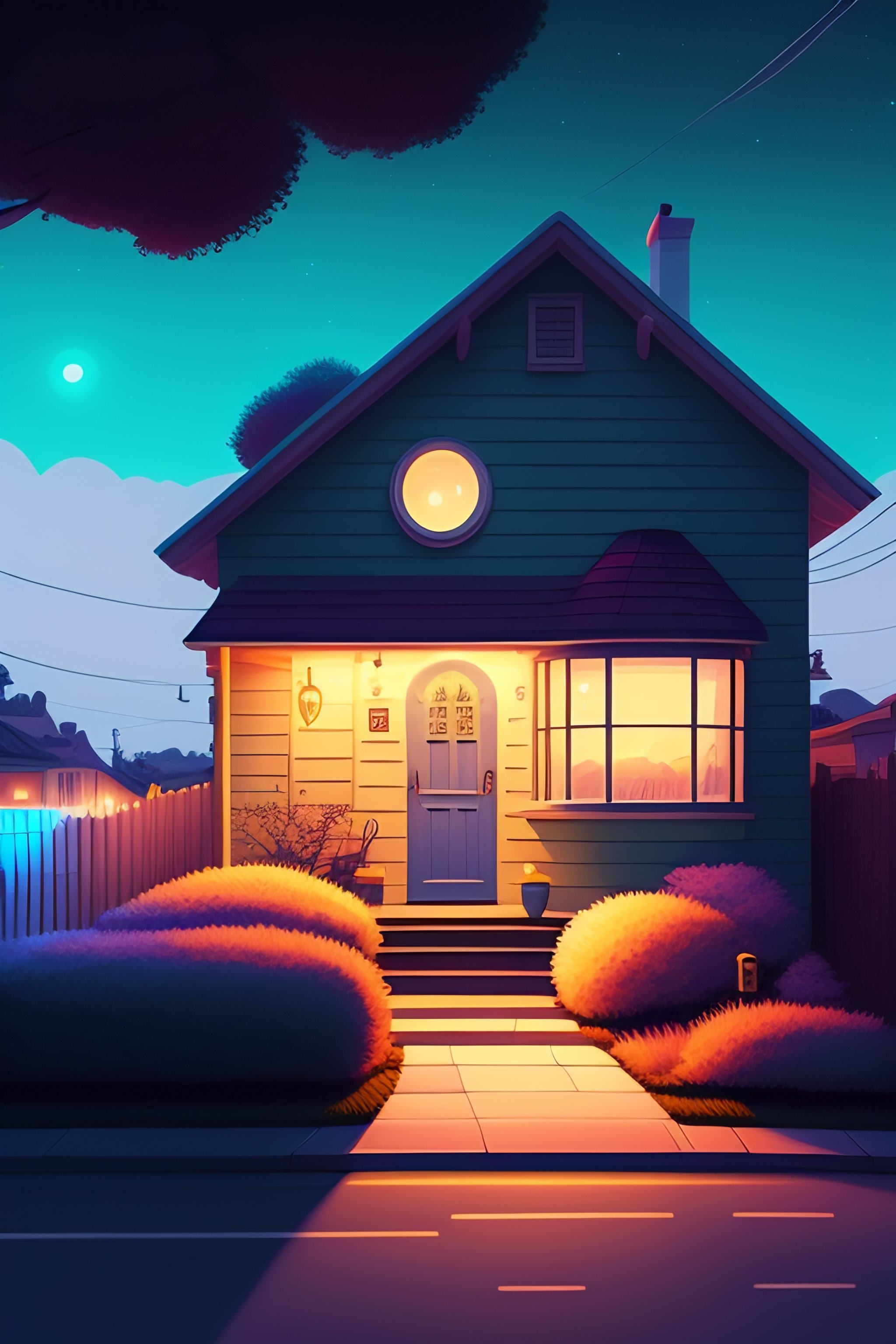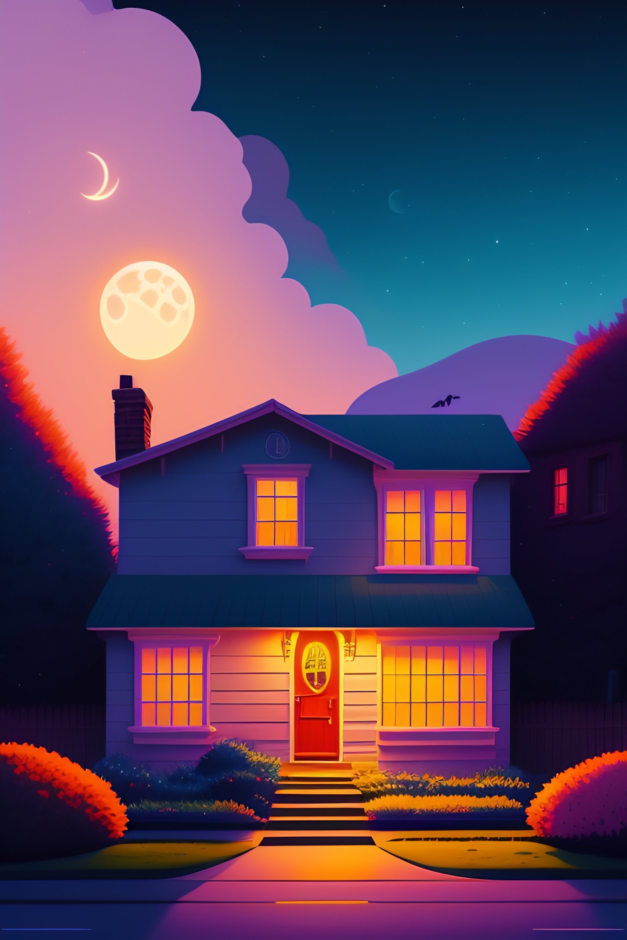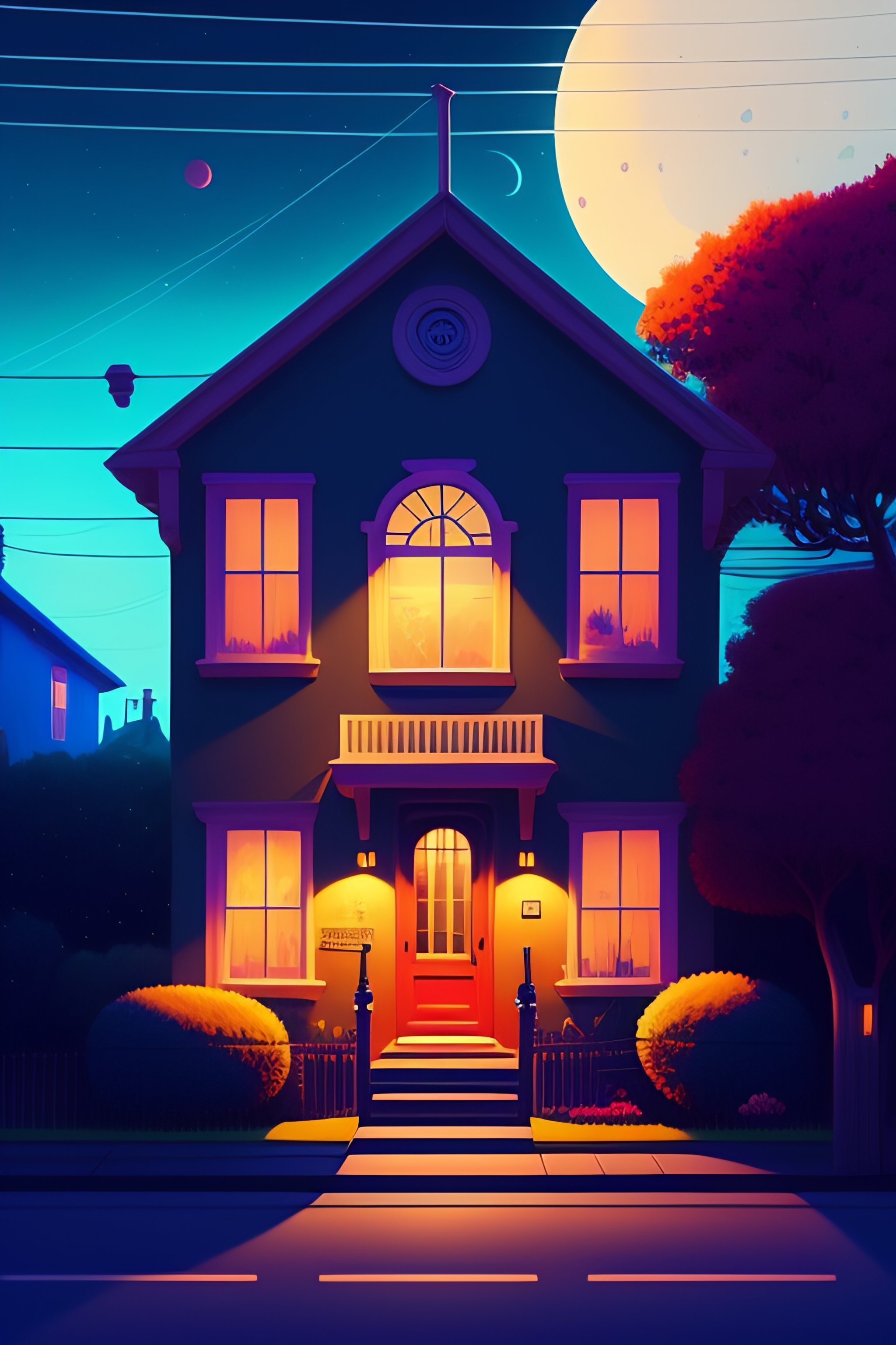 The small house on a street in san francisco, dark night, moon starry sky, gibli, james gilleard, atey ghailan, lois van baarle, pop art patterns, exquisite lighting, clear focus, very coherent, plain background, very detailed, vibrant, digital painting