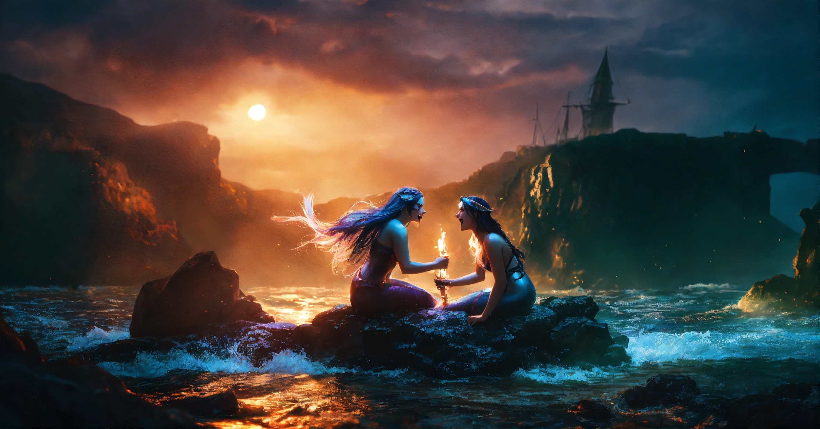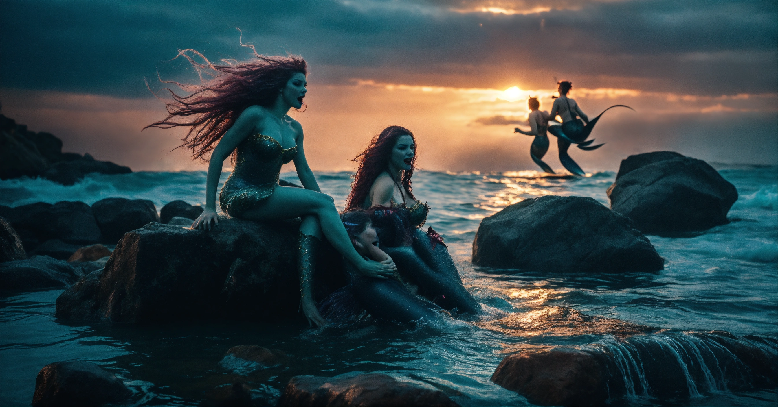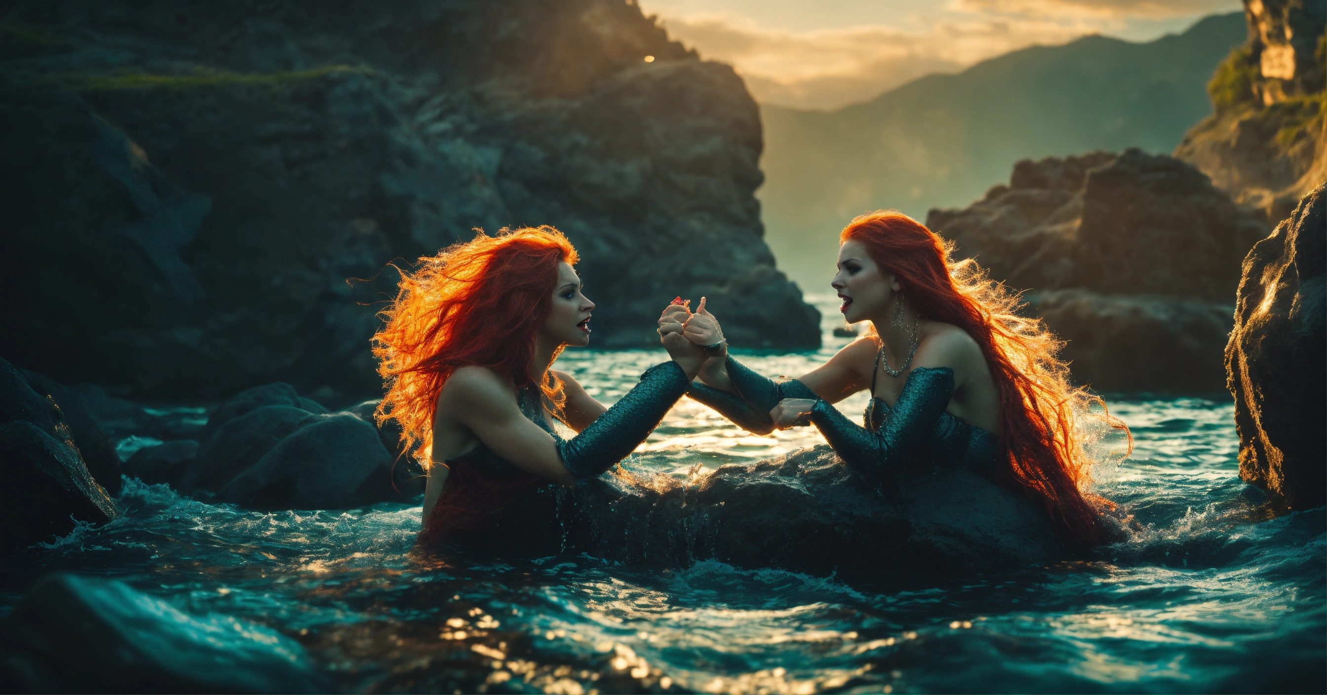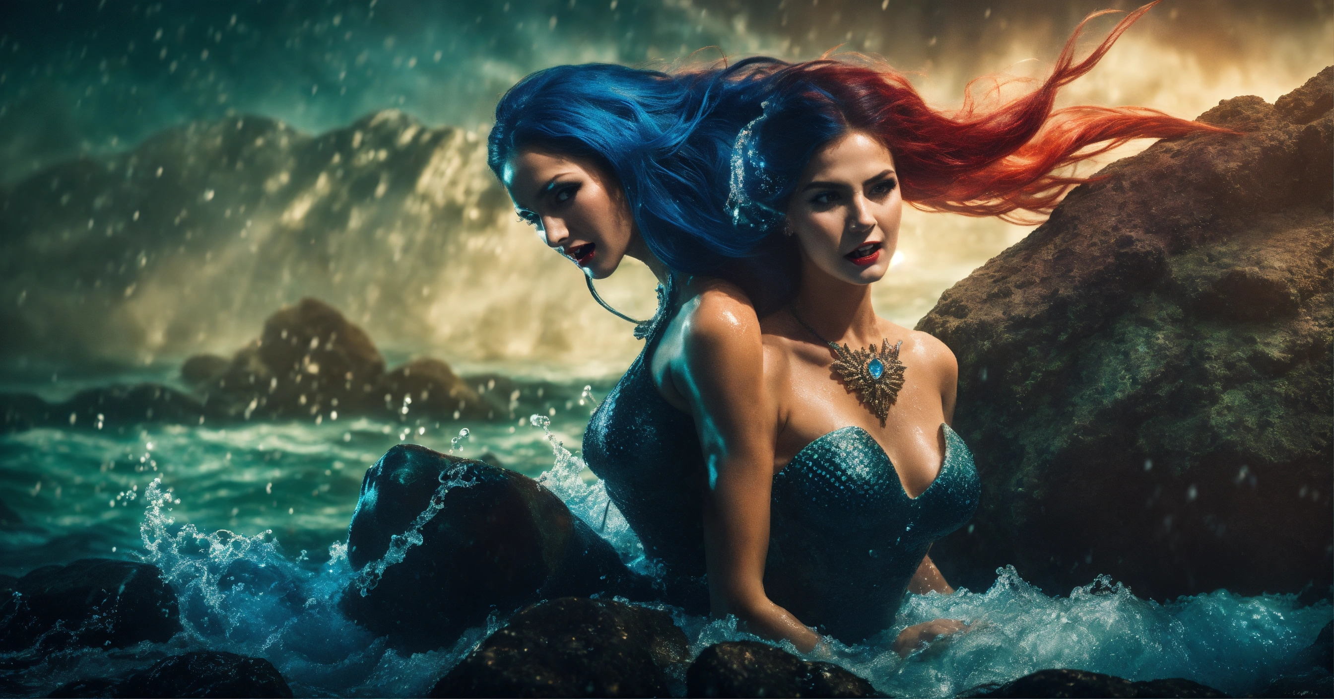 Create a 4k detailed photo of two evil mermaids fighting each other diving from water, vampire fangs, sitting on rocks, dramatic lighting, facing viewer