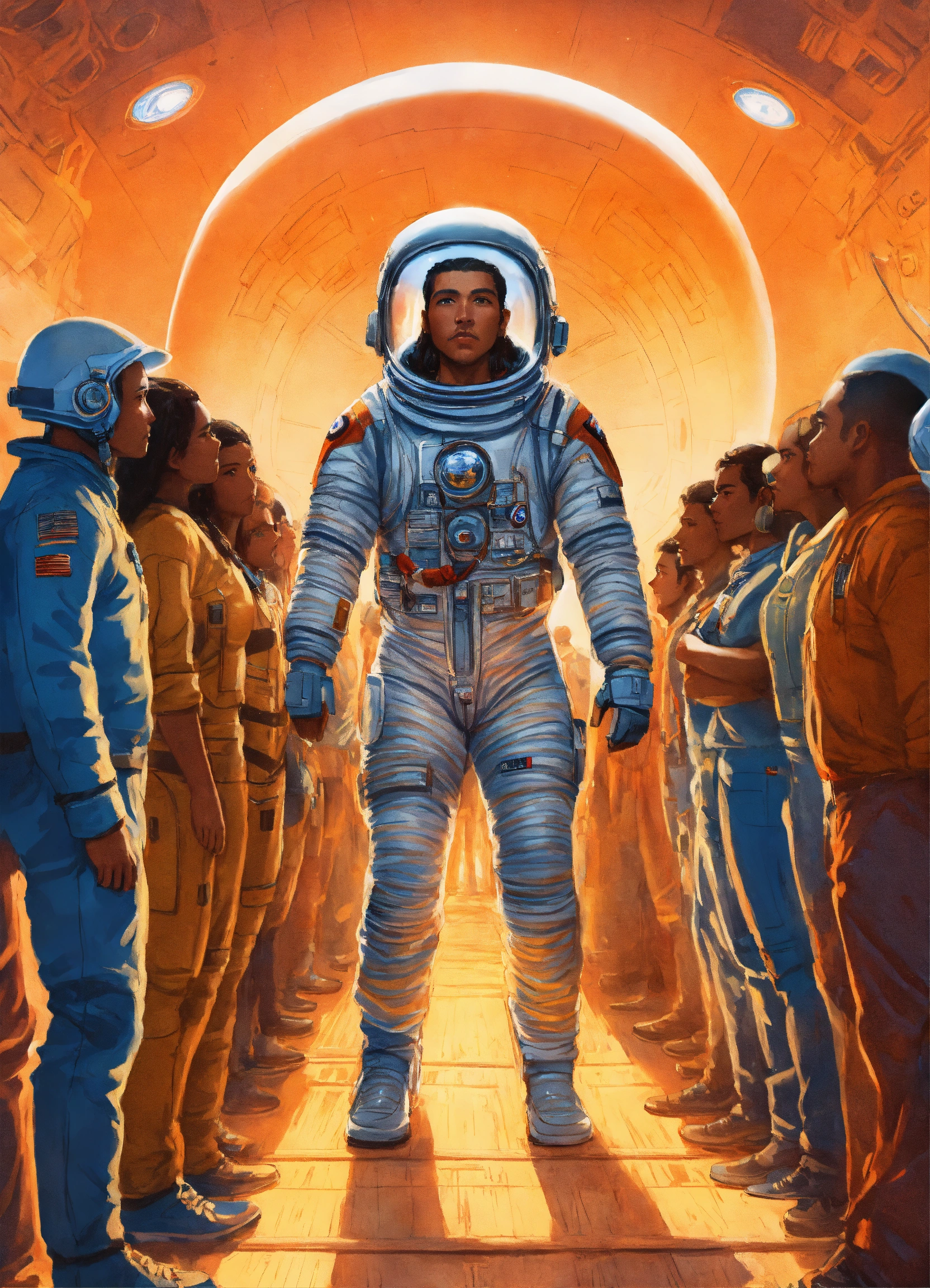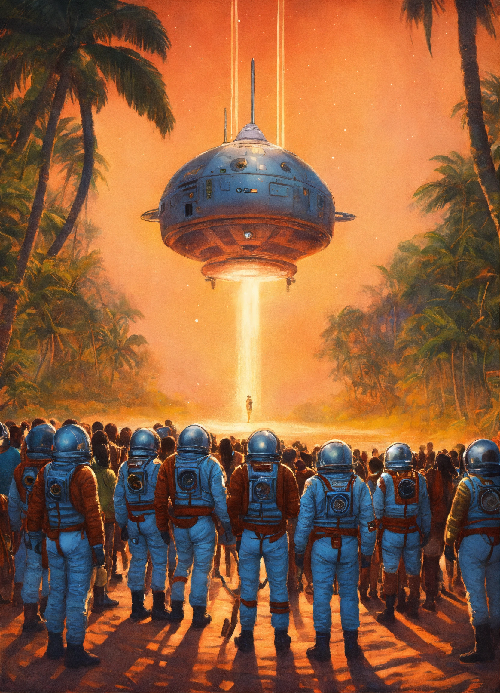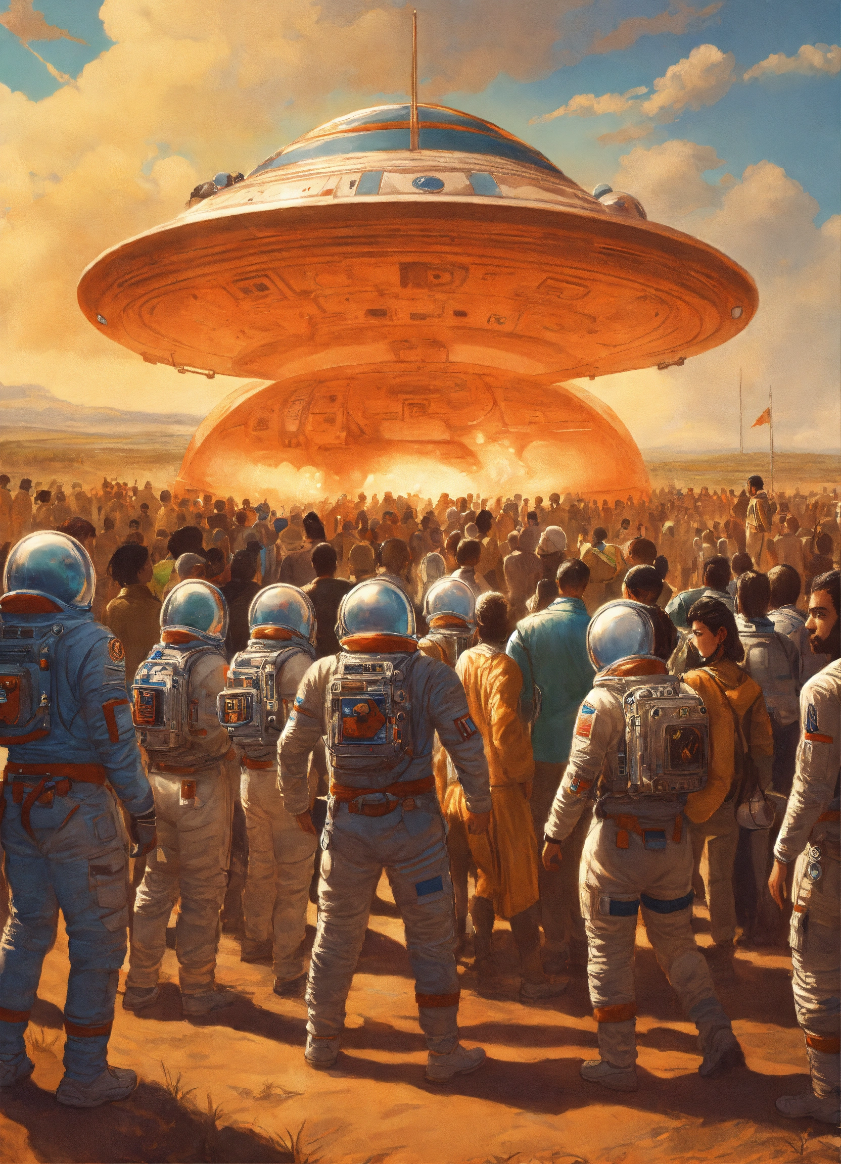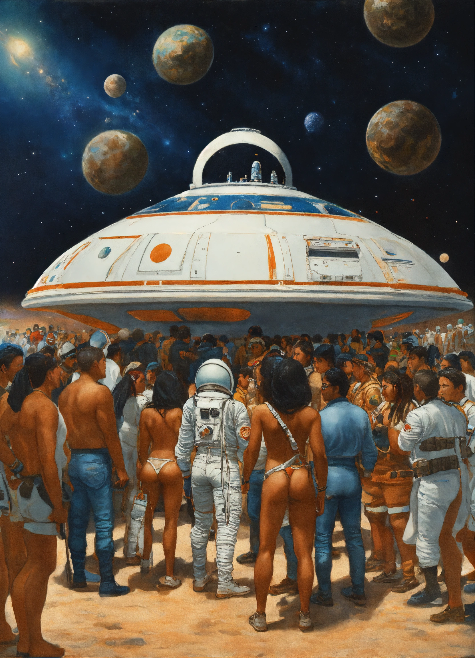 A crowd of taino people standing with their back to the viewer and as an other group of humans with spacesuit getting out of a spaceship in front