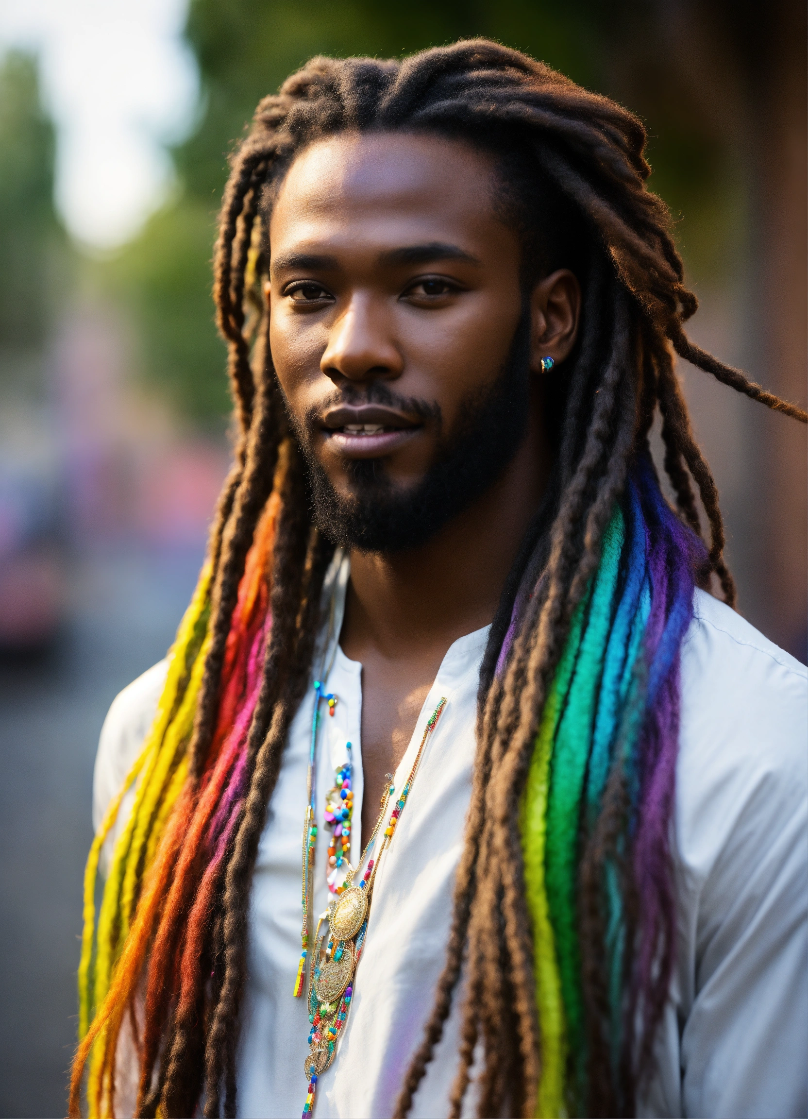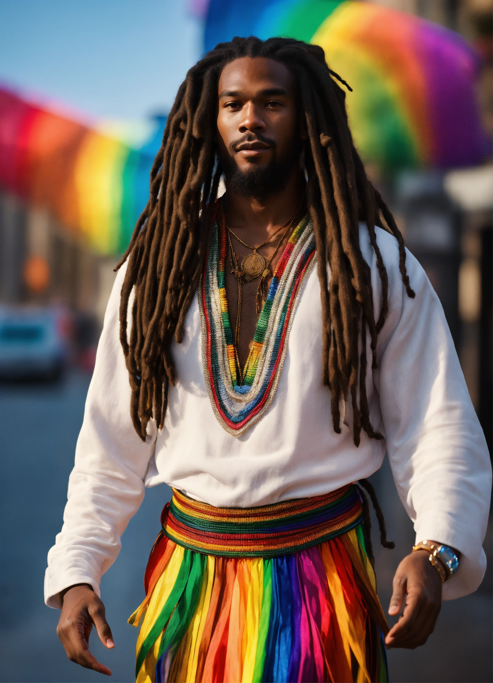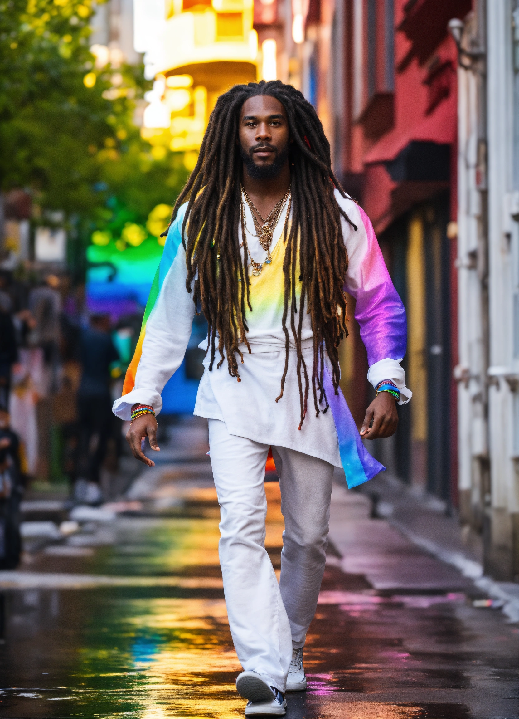 Black man with long flowing dreadlocks, well-built, 6' 5" tall, he has iridescent black skin that reflects all the colors of the rainbow, full body shot, striding up the street confidently, arms outstretched to the sides ready to hug someone, looking directly into camera, wearing all white iridescent clothing, african style white iridescent clothing that reflects all the colors of the rainbow, 3d render