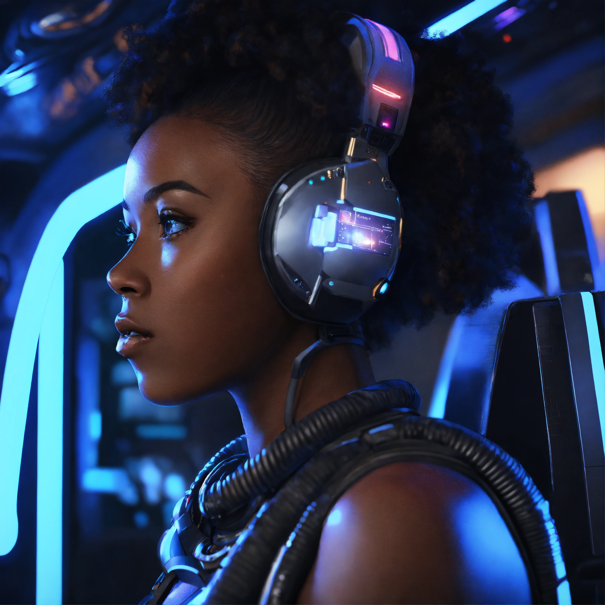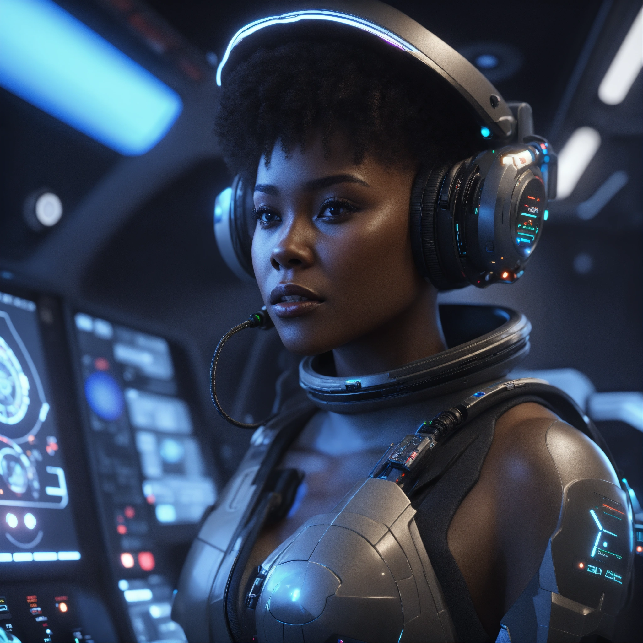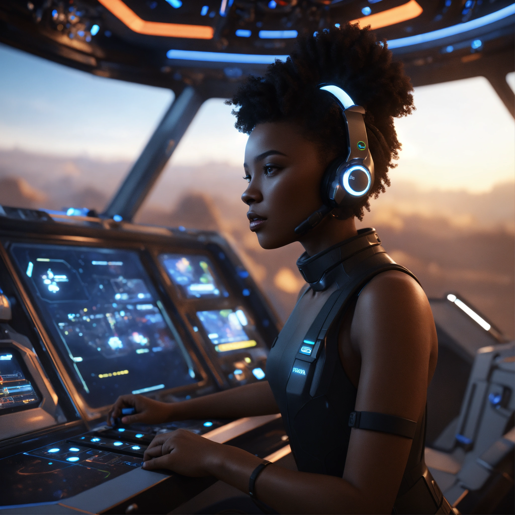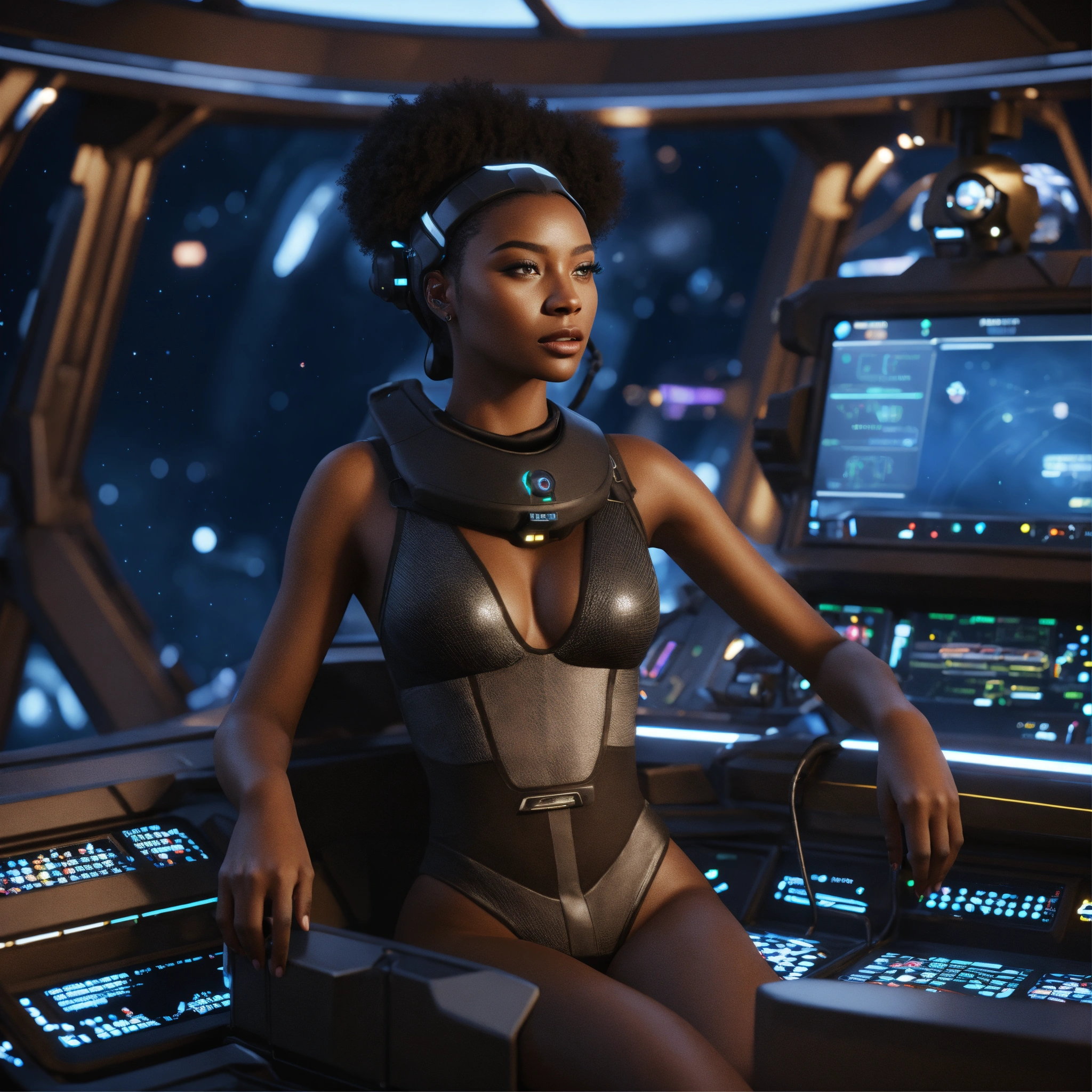 A black babe on a control system of a space yacht, realistic, futuristic, sci-fi, 8k, unreal engine, pixar