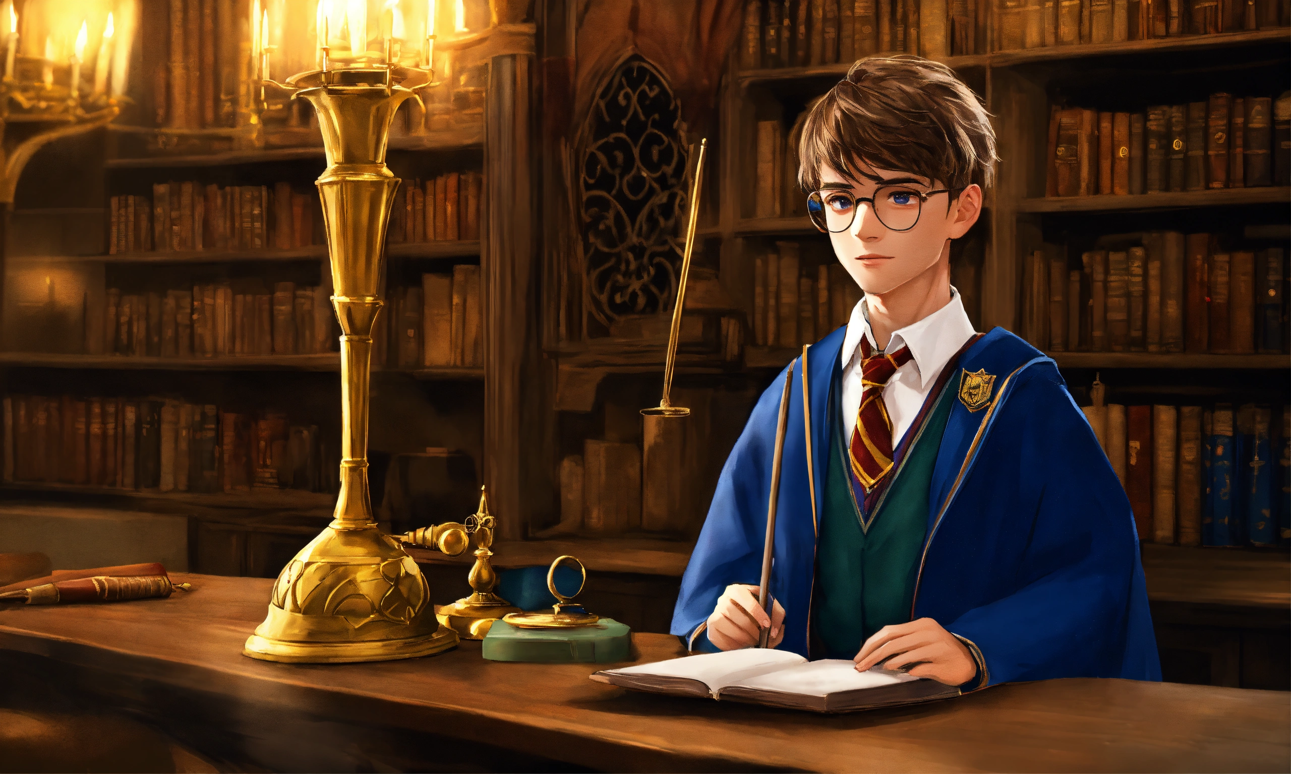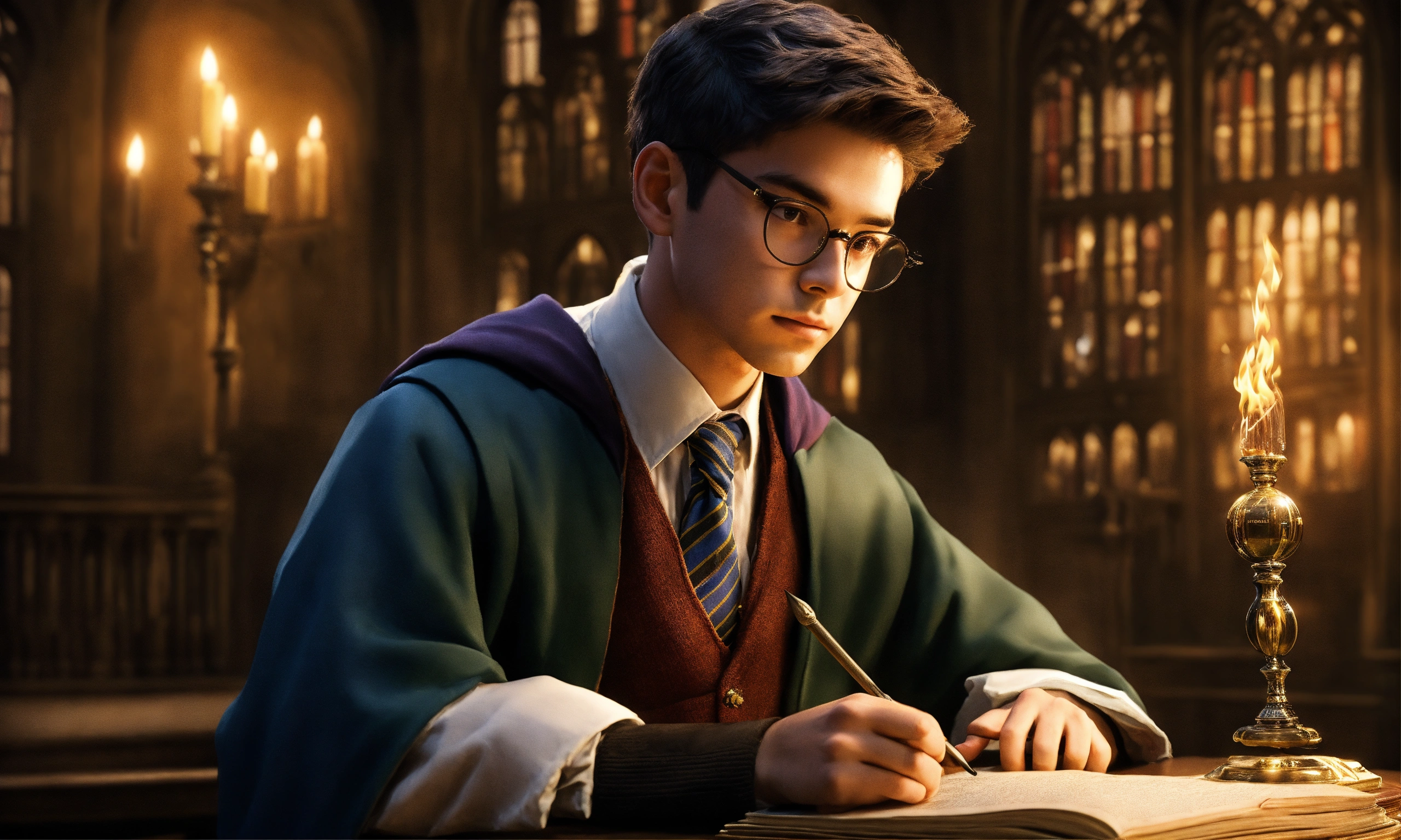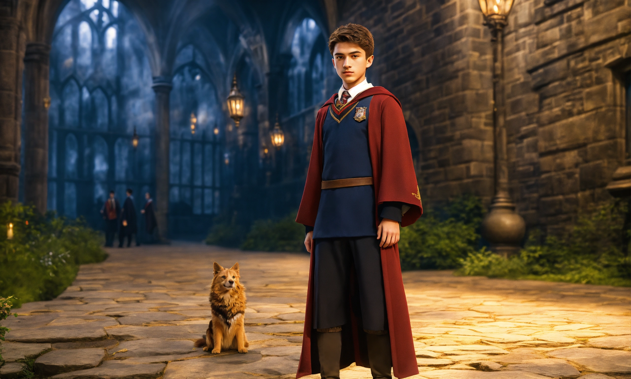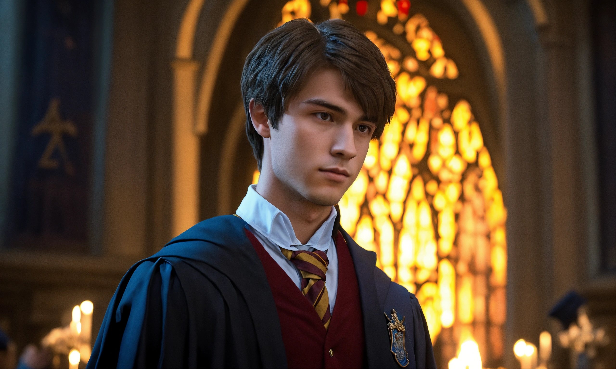 Create a description of a senior student attending hogwarts, the school of witchcraft and wizardry. portray him as a charismatic and talented young wizard with a sophisticated sense of humor. focus on his appearance, including a confident and perceptive gaze that reflects his deep knowledge of magic and experience. highlight his choice of attire, combining the hogwarts school uniform with individual details that reflect his strengths and personality. describe his influential friends and achievements in magical competitions and academic subjects.