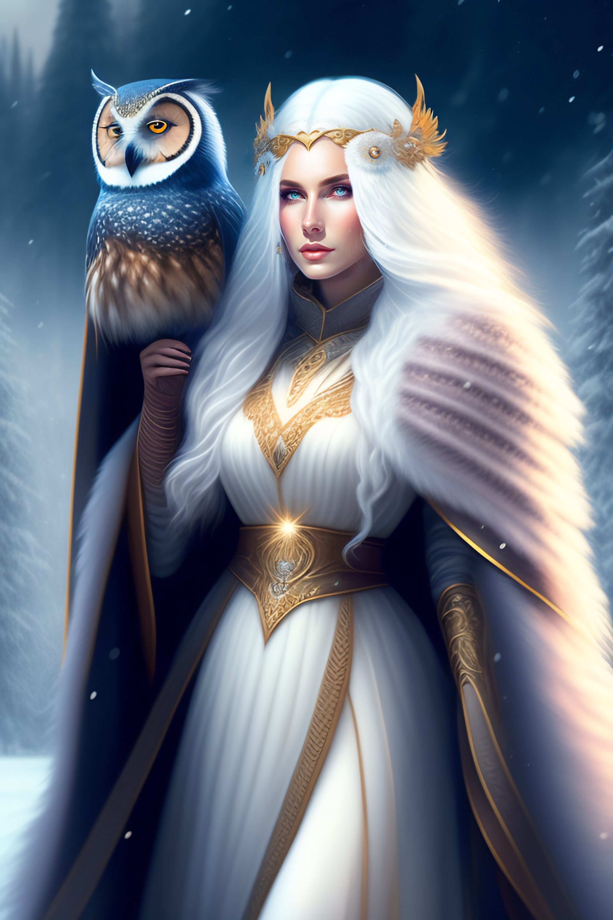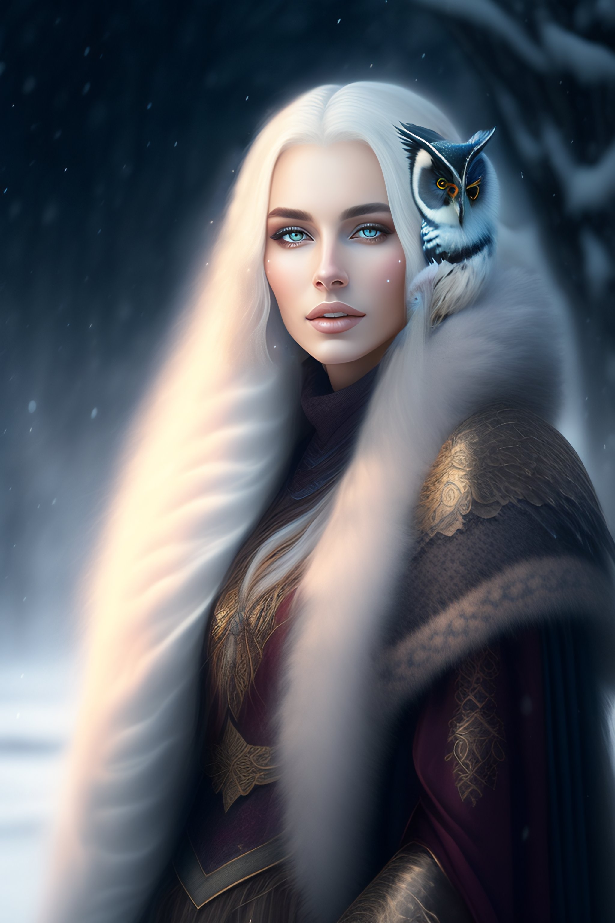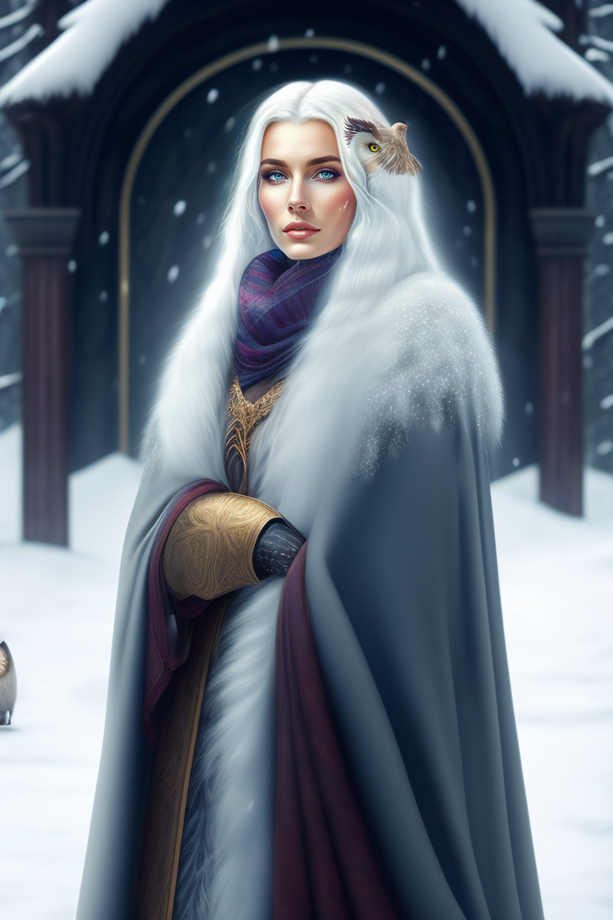 A beautiful fantasy woman with long white hair wearing in cloak with owl-feathers in winter fantasy city