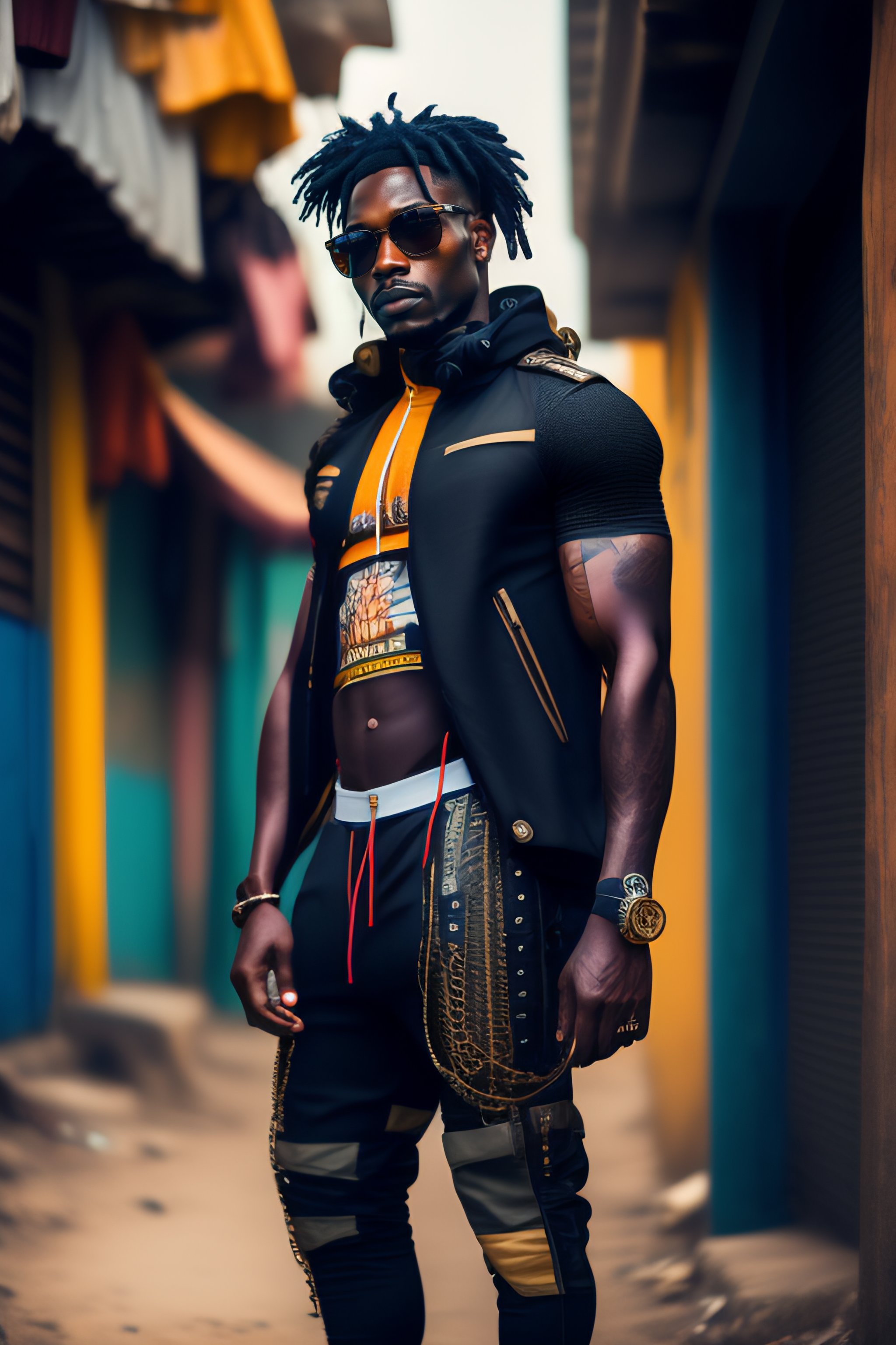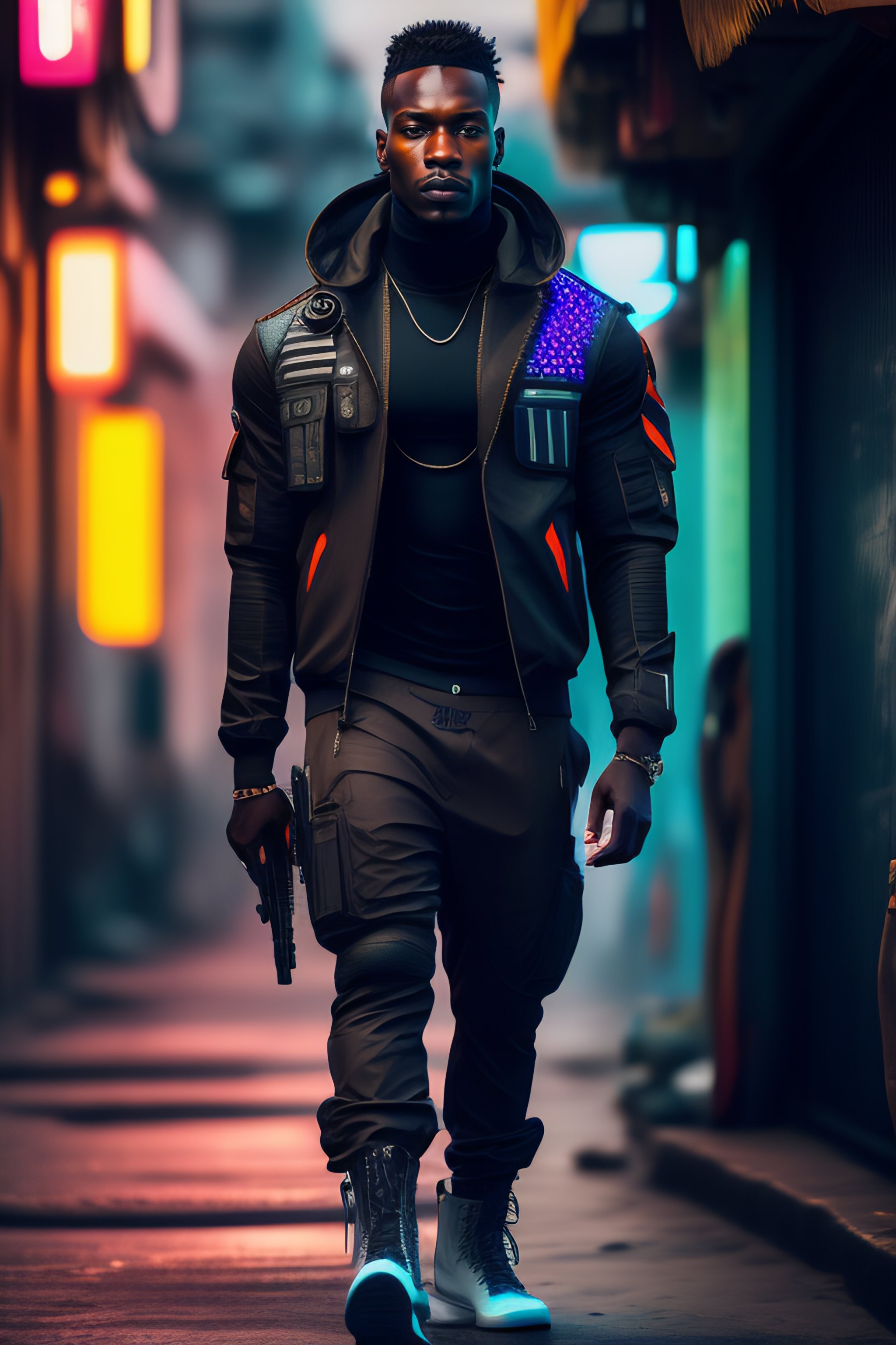 Slum cyberpunk nigerian black man, holding a gun, futuristic clothes, cyberpunk slum rio de janeiro, summer clothes for men, cyberpunk style, 8k