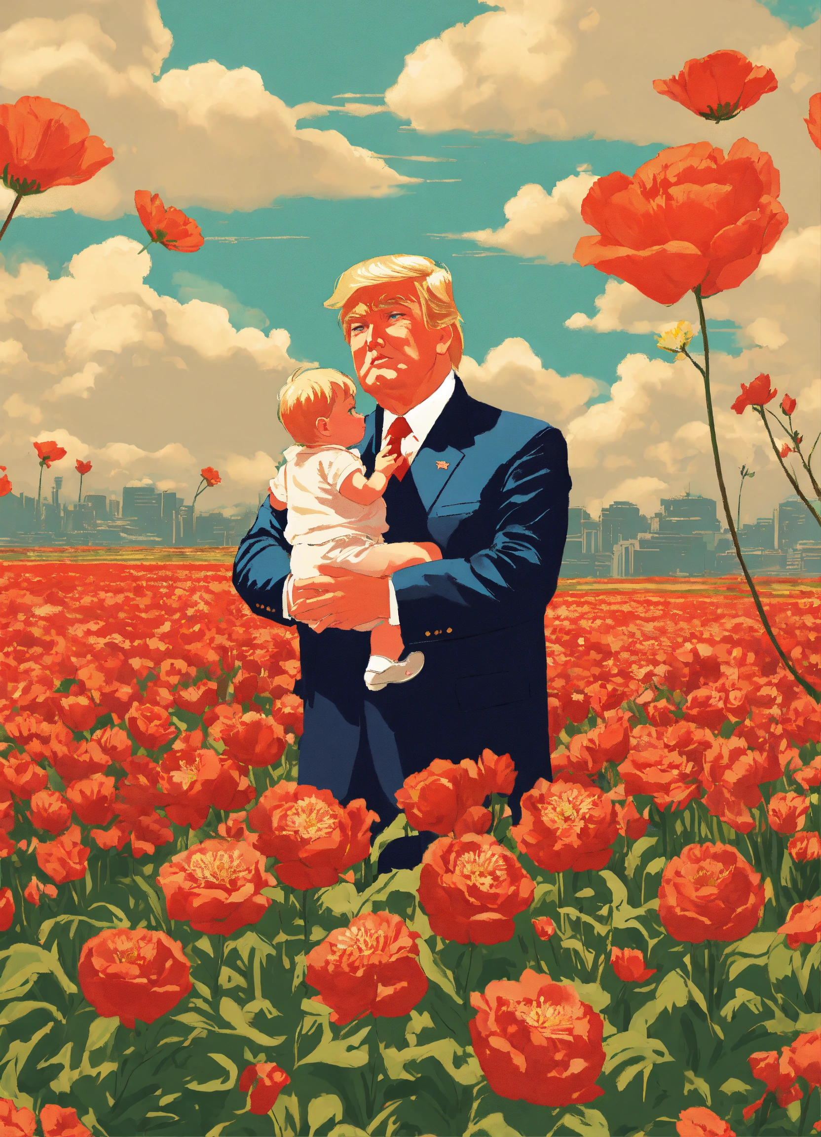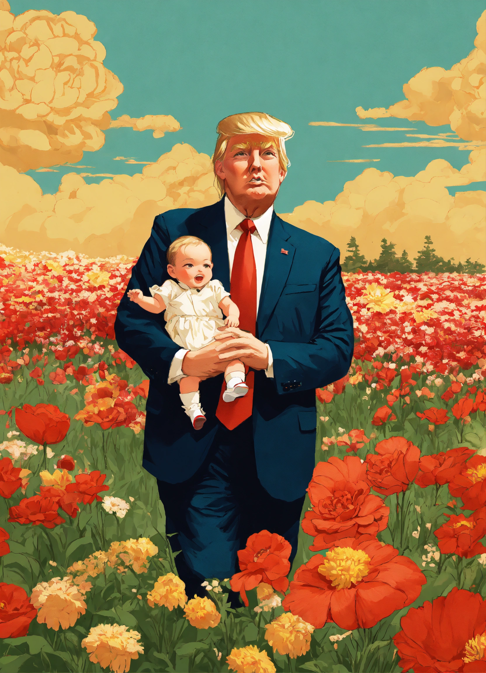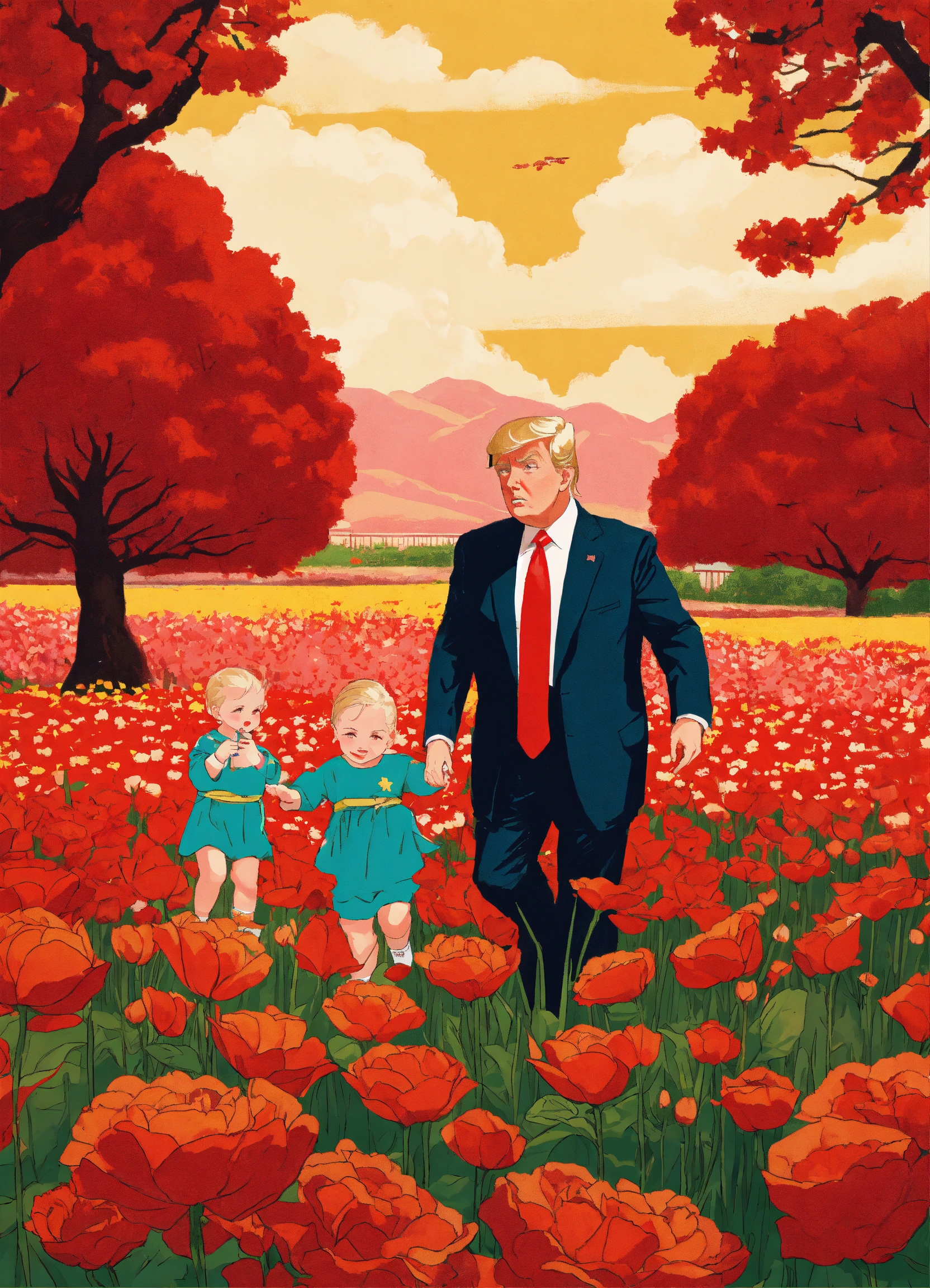 Trump standing in field of flowers playing with babies in the style of 1950s communist china propaganda poster