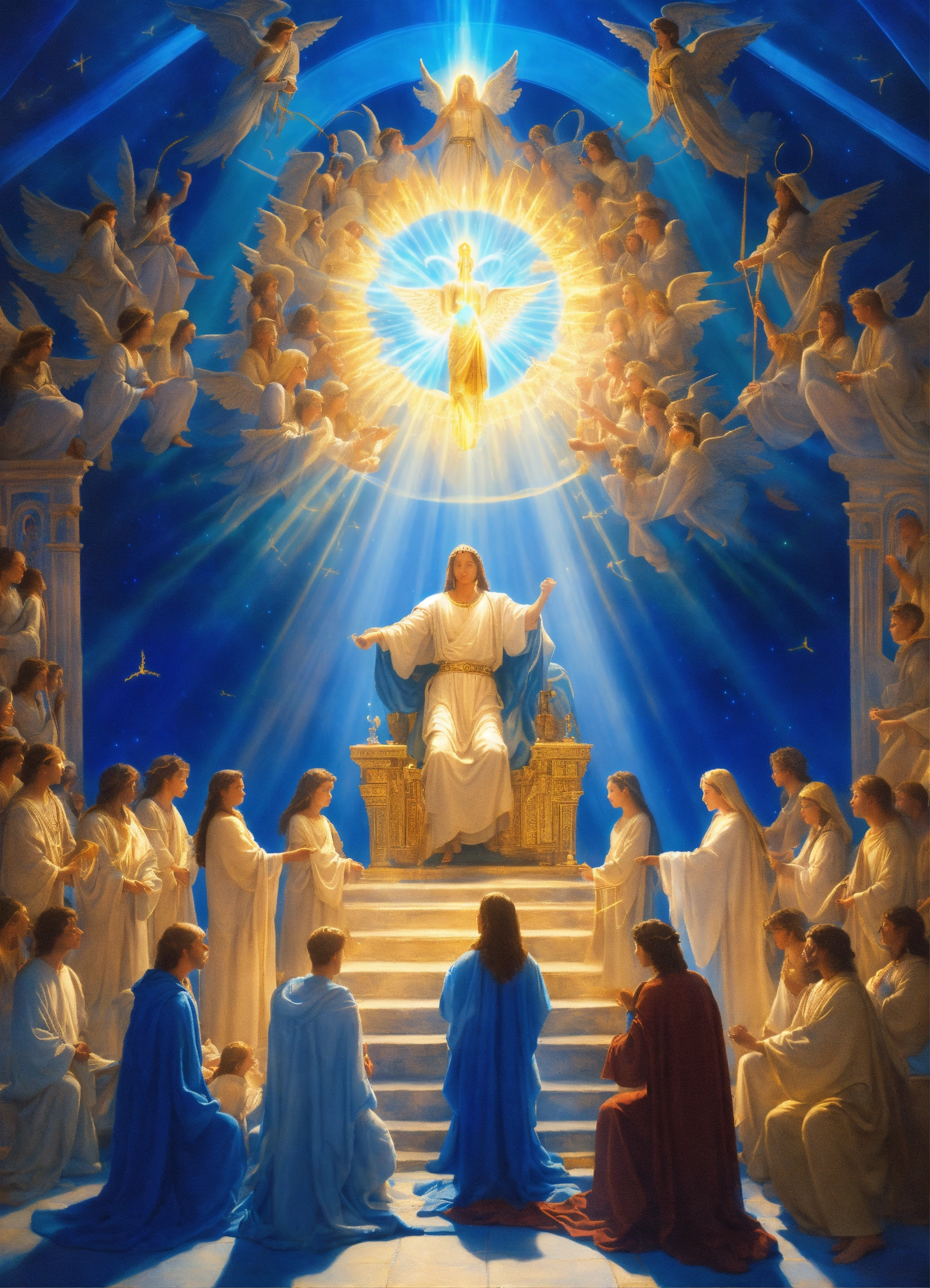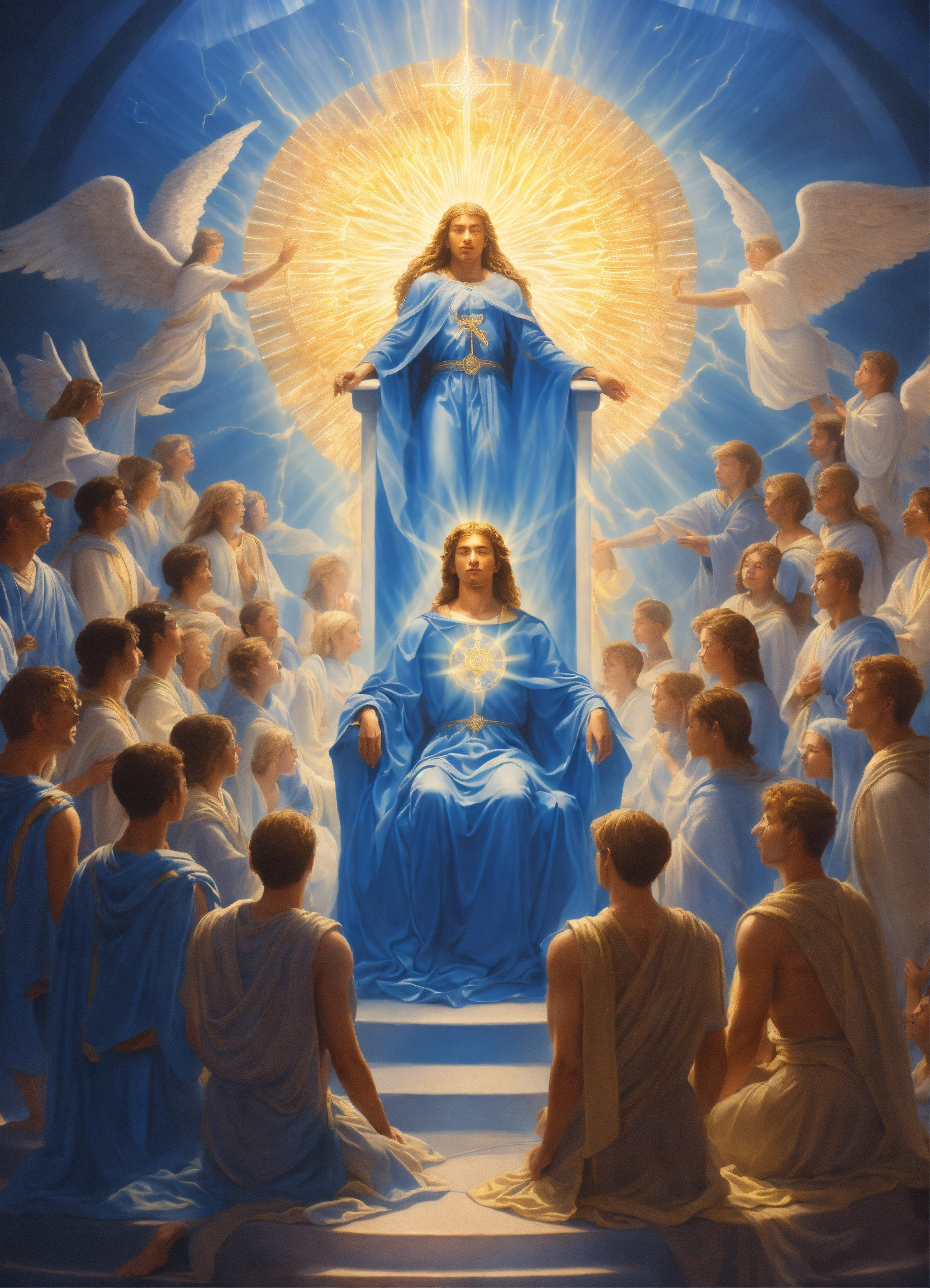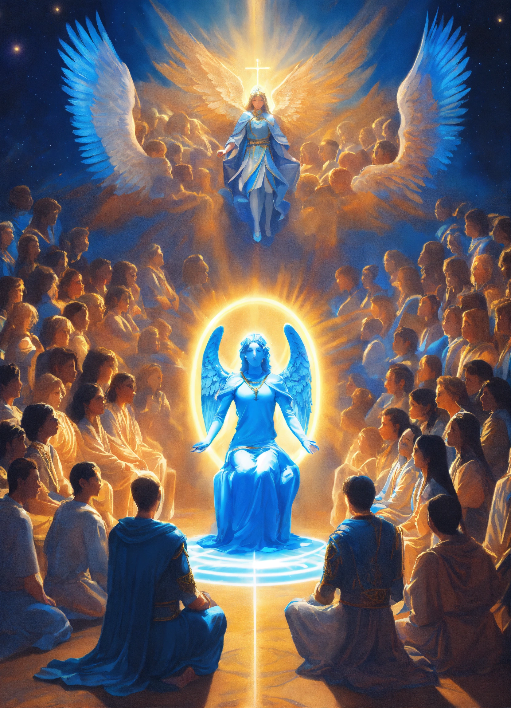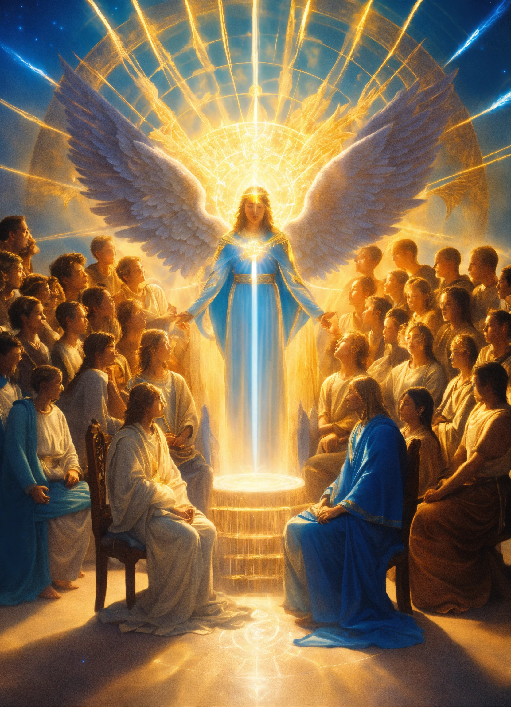 Many people siting on a chair in a circle, archangel michael as man surrend an touch her with blue light, blue rays of light, inner transformation, sacred symbols. spiritual awekening, mystic symbols