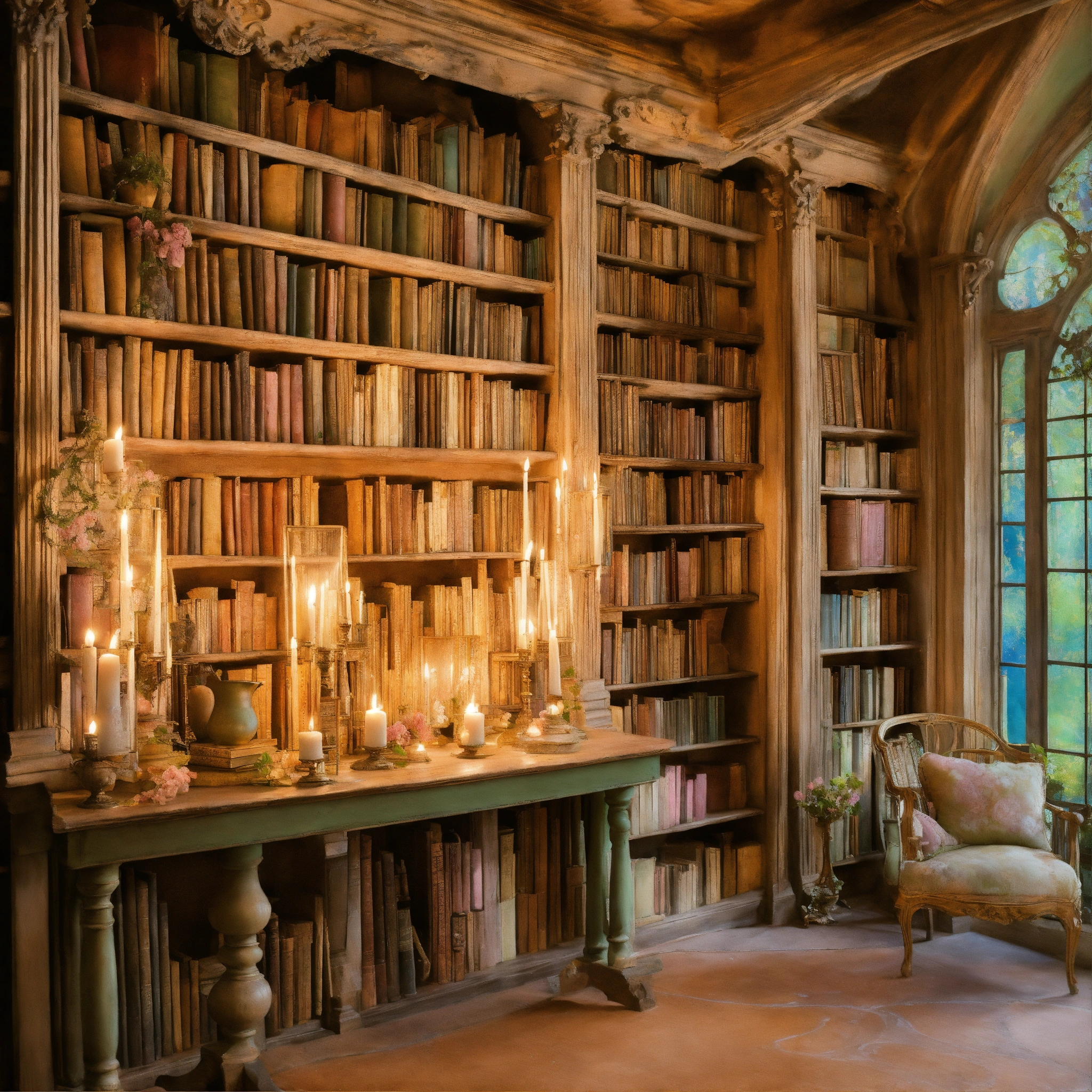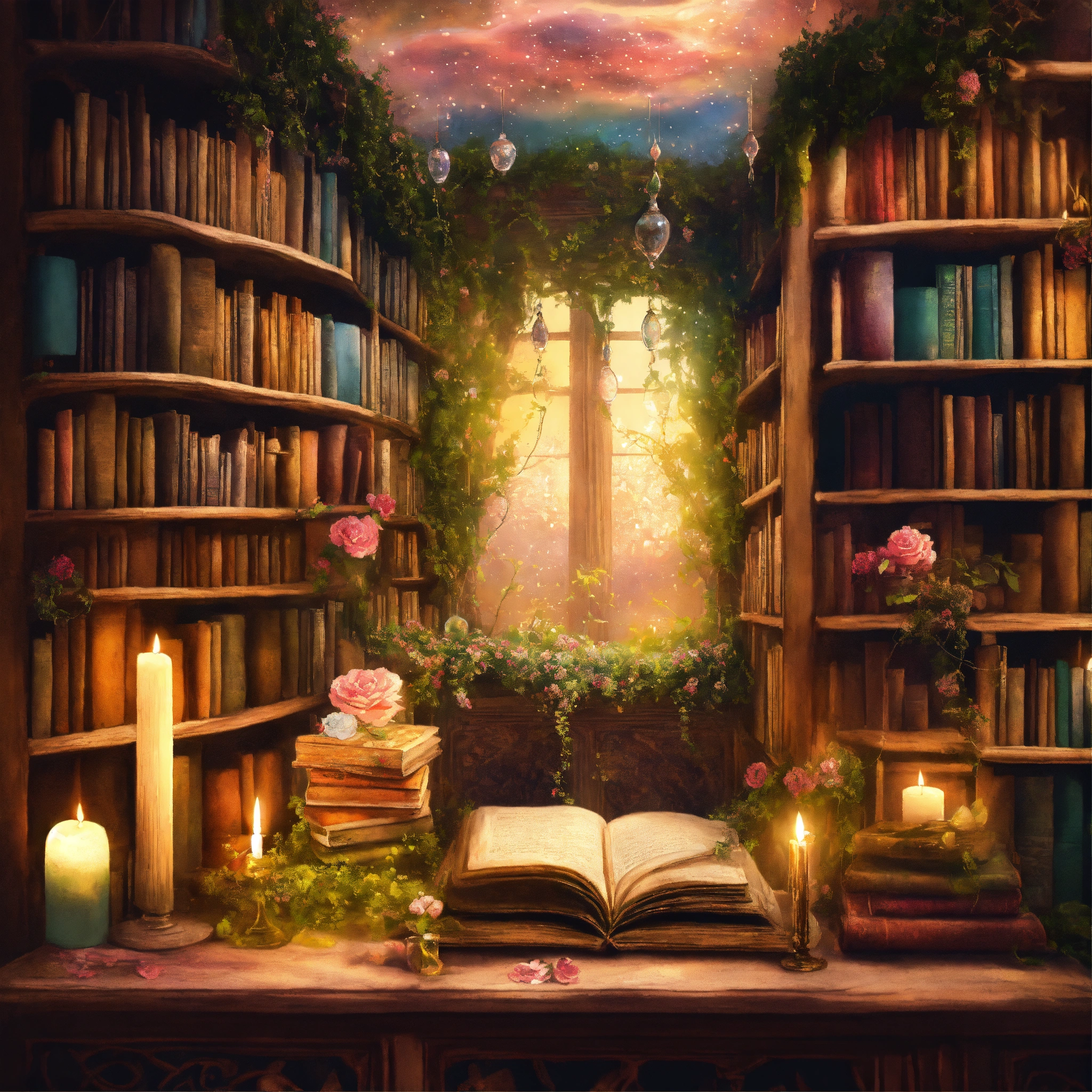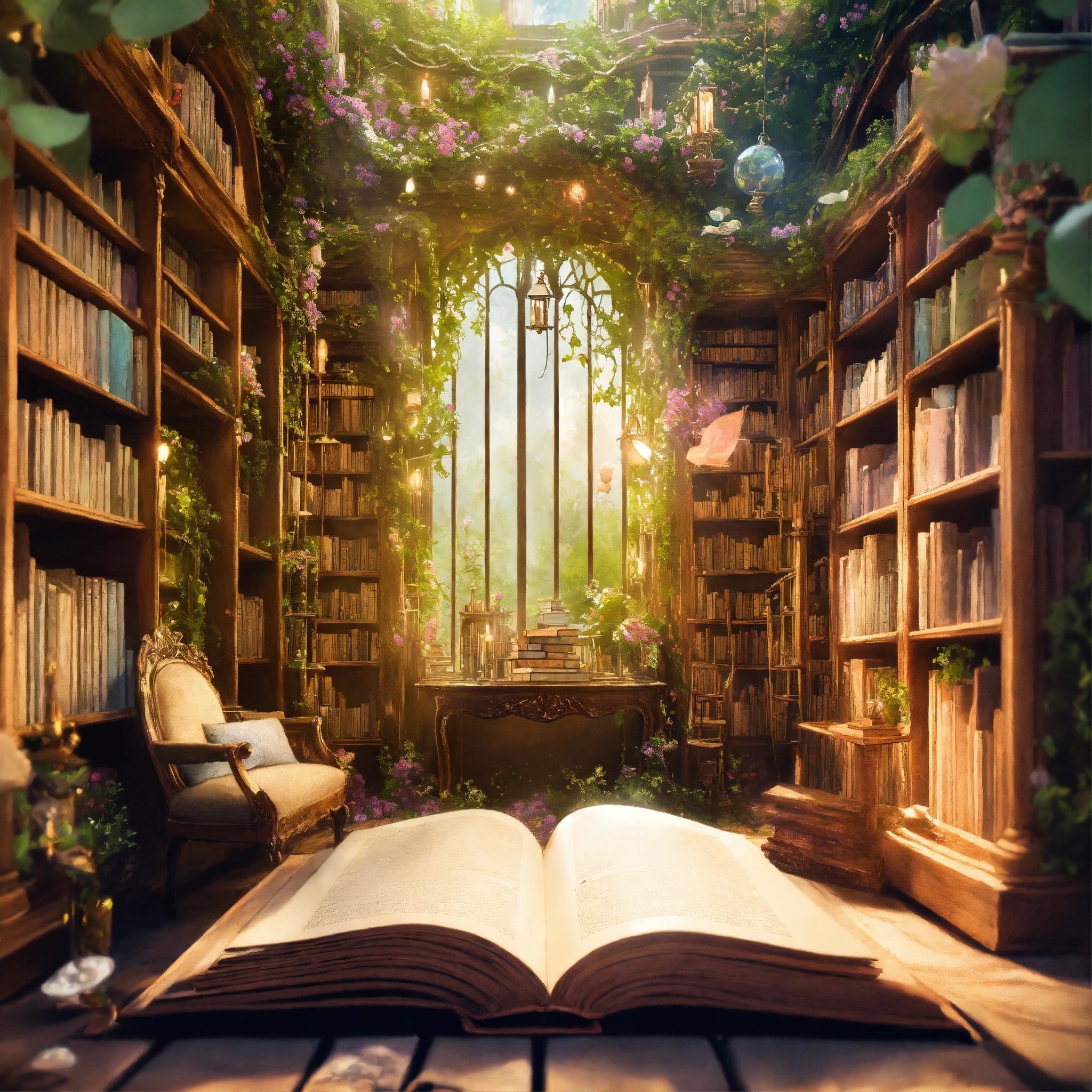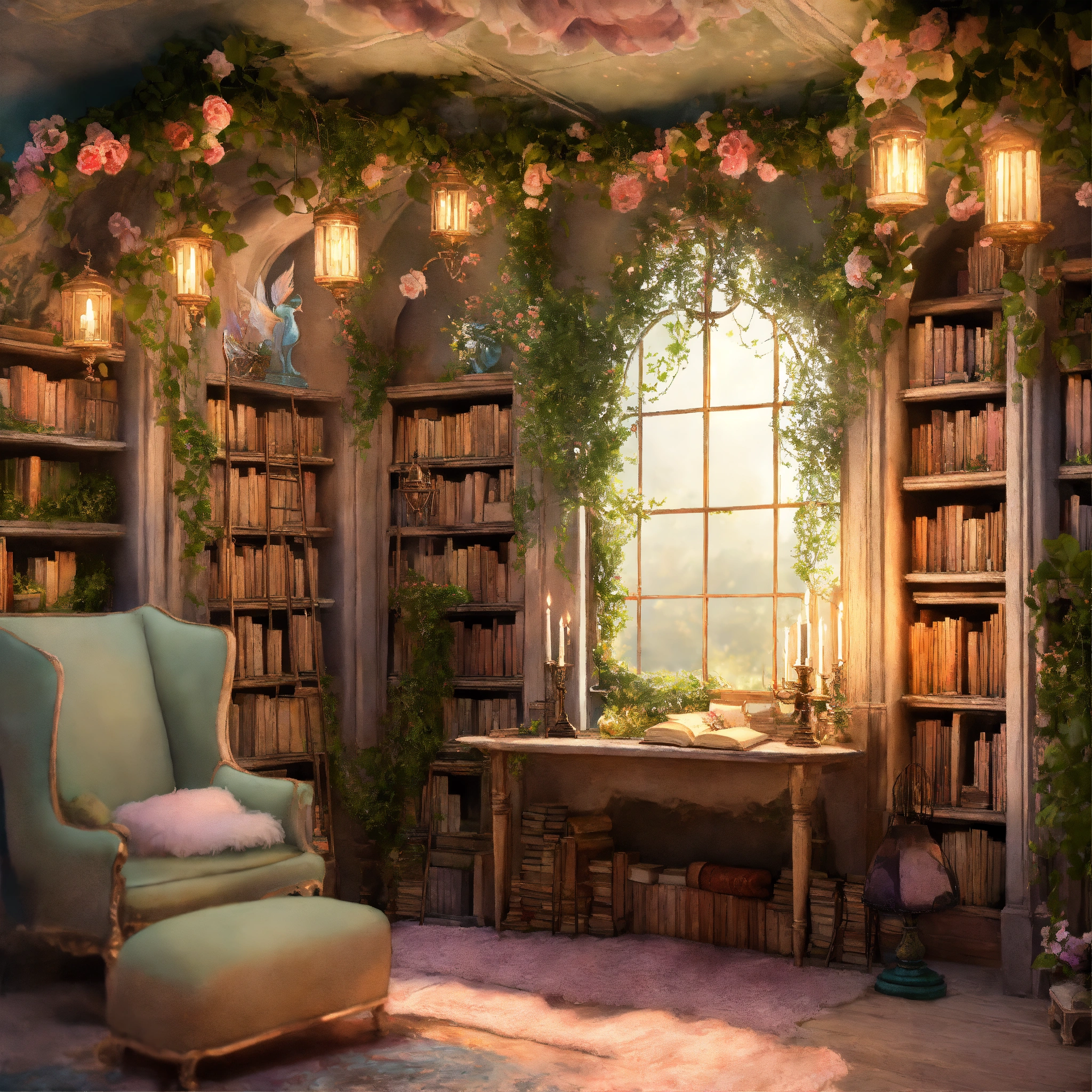 Shabby chic dreamy mist pastel junk journals the enchanted library describe a vast library that seems to extend endlessly, its shelves constructed from living vines, and filled with ancient, whispering books. floating candles and talking paintings adorn the walls. swirling magical fairytale abstract art style