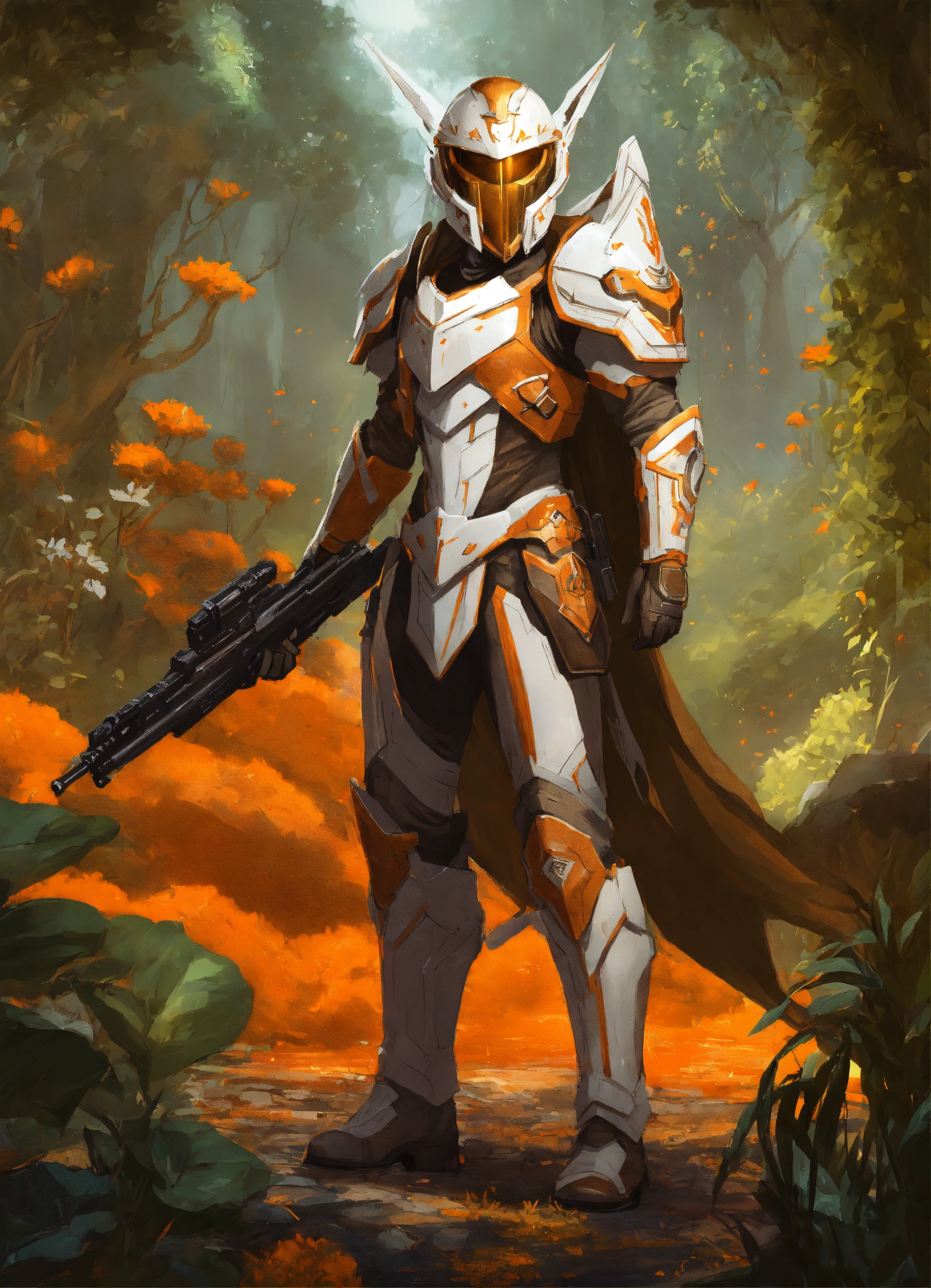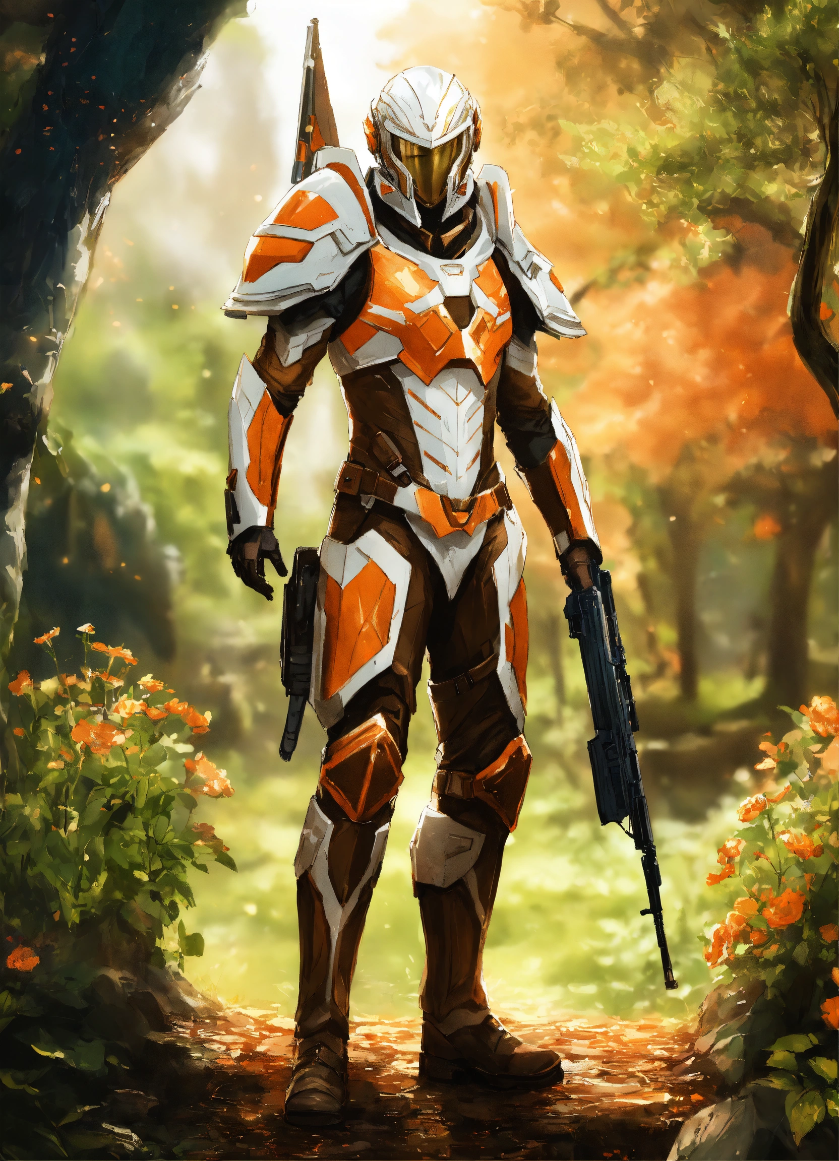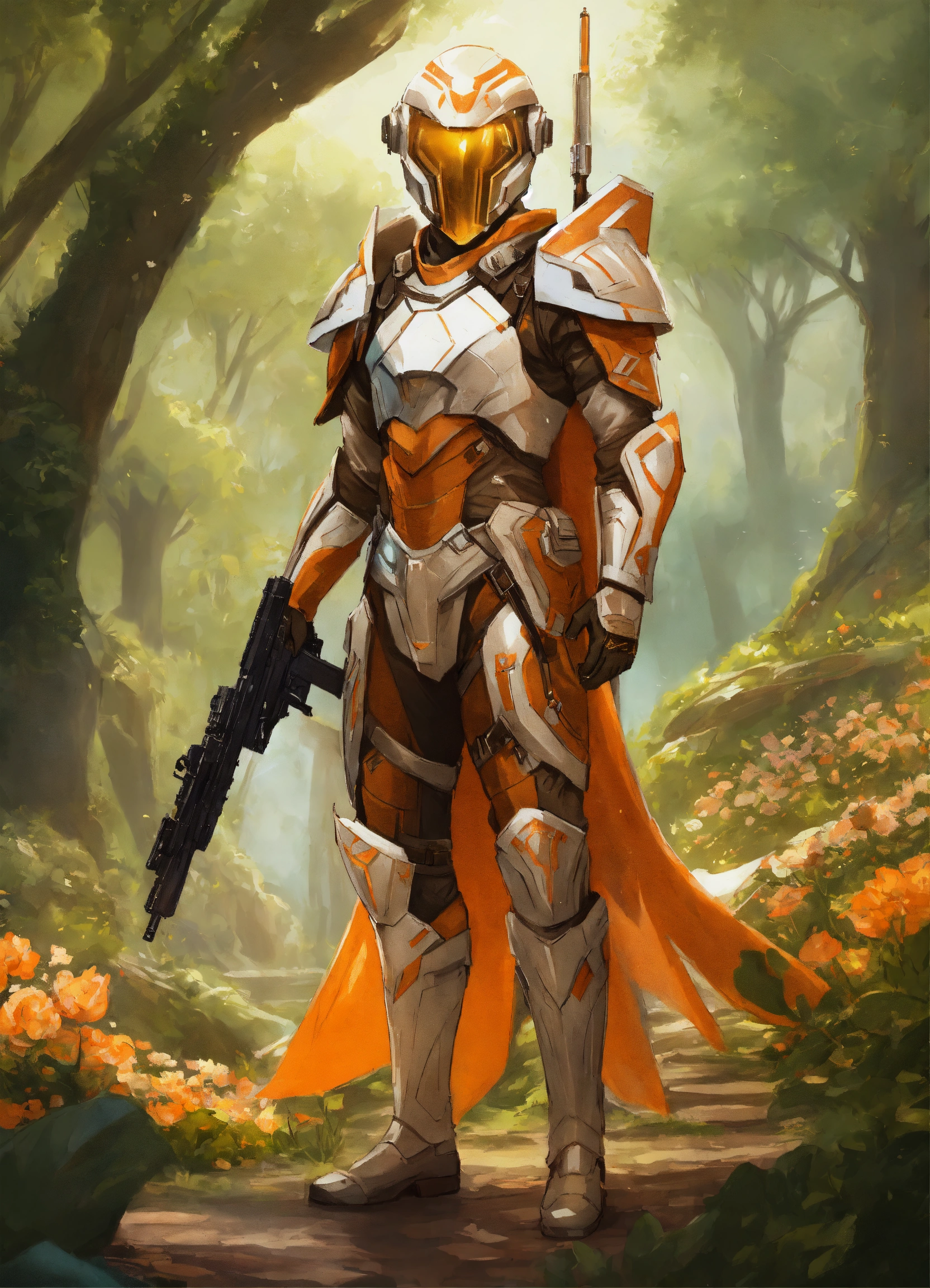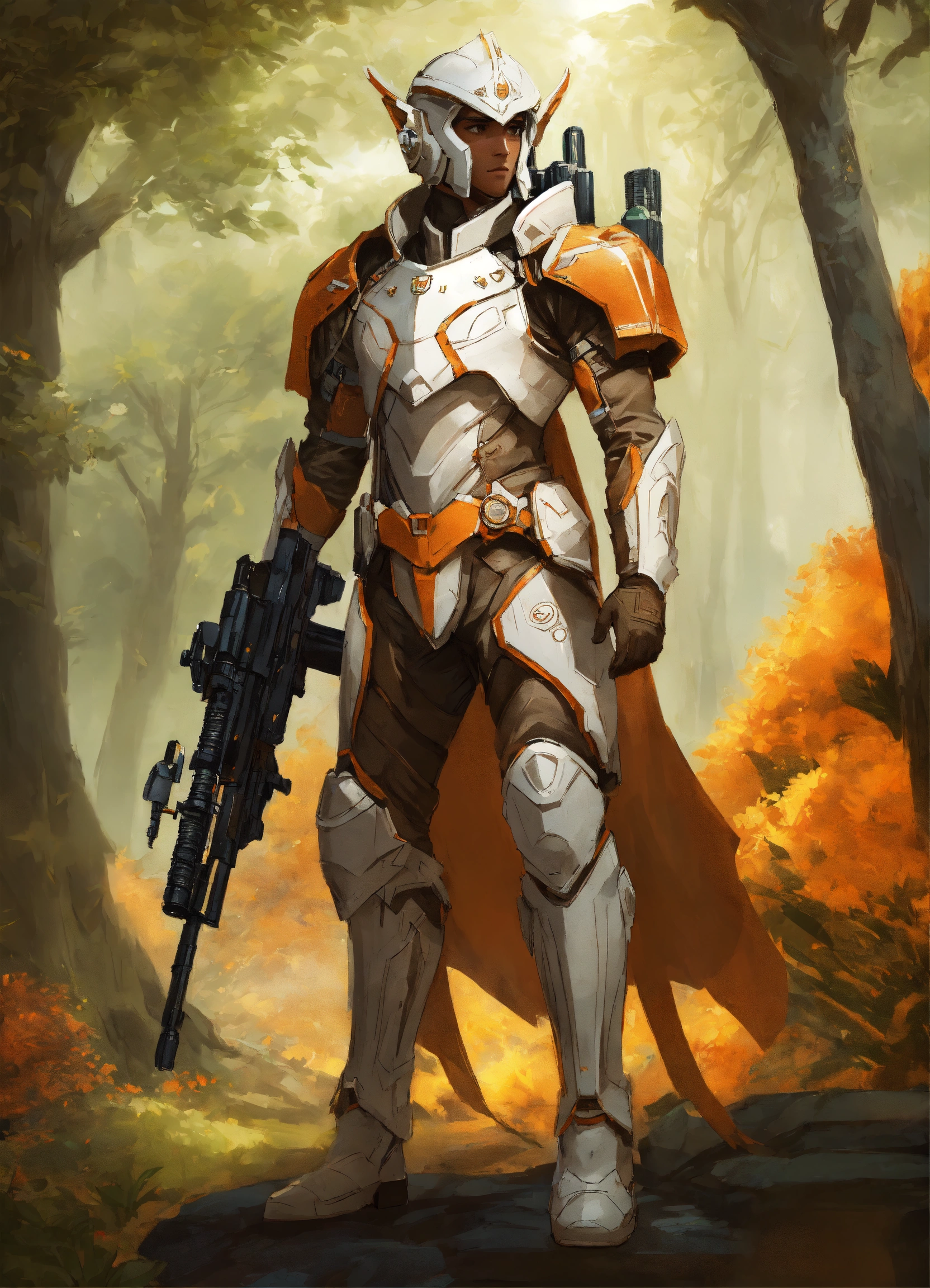 Epic drawing of a full body of a high elf sci fi soldier wearing sci fi armor, white and brown and orange sci fi armor and helmet, boots, male, holding a machine gun, standing in an elven garden