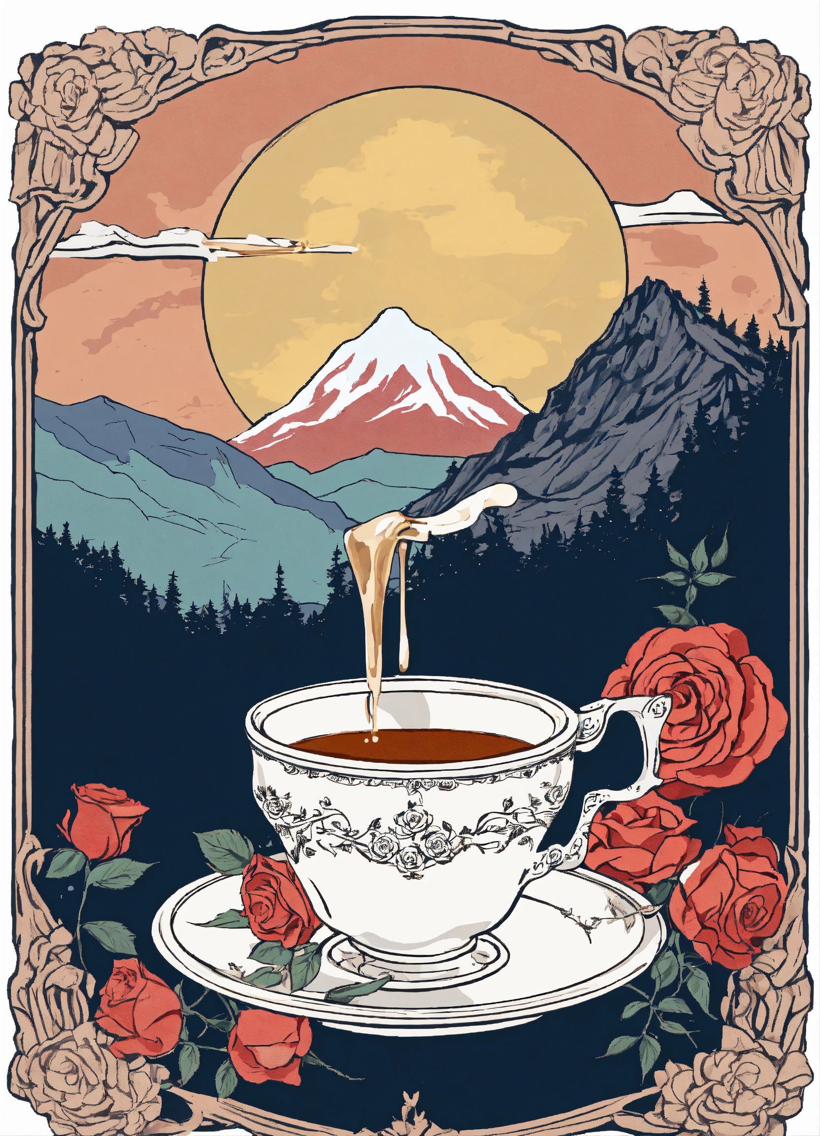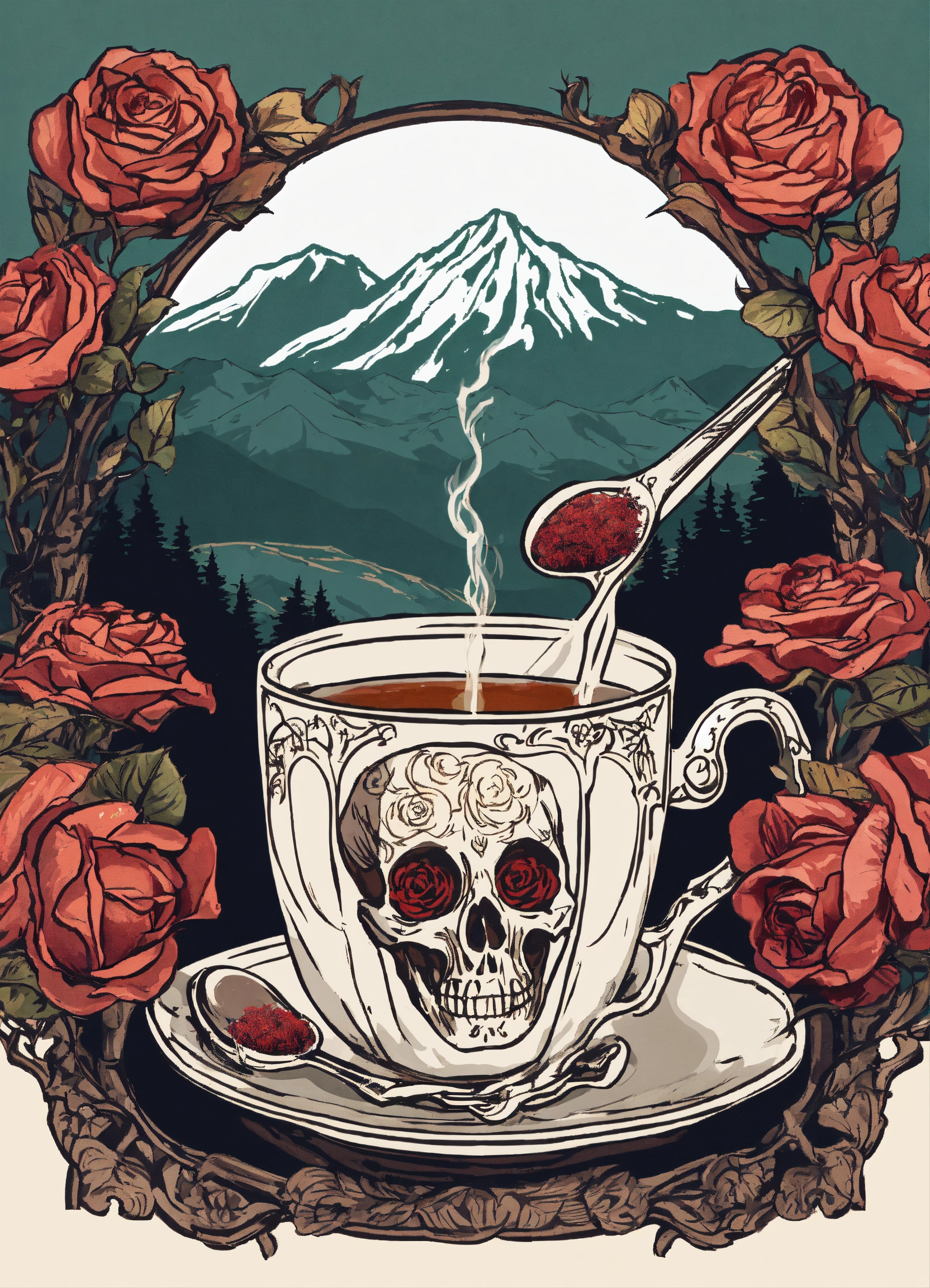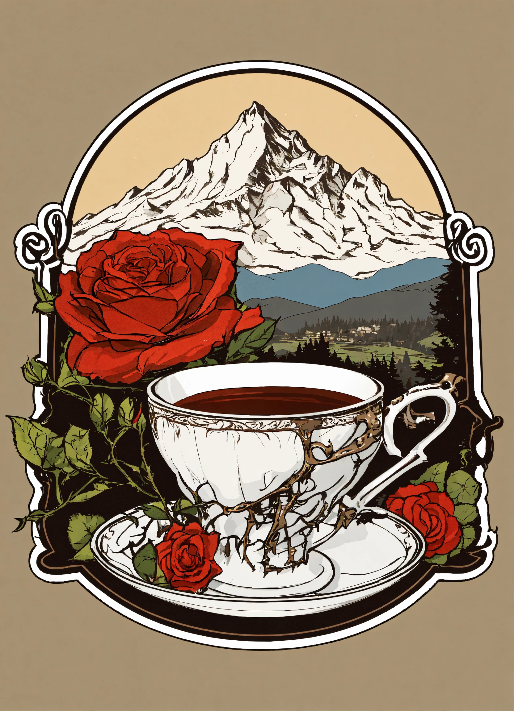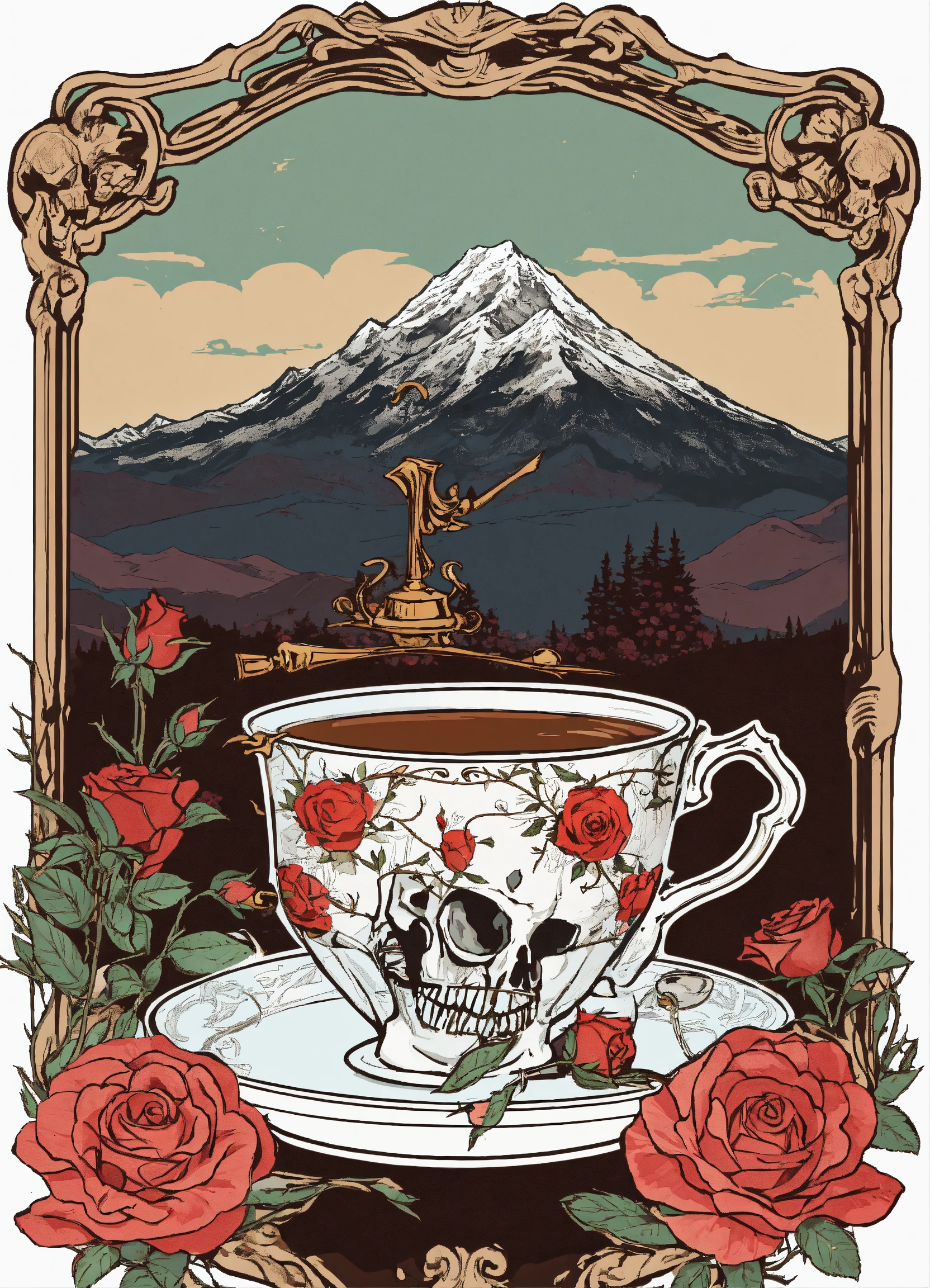 Sticker, skeleton hand holding a vintage tea cup, hot tea pouring from the cup, roses with thorns twisted around like a frame, three peak mountain in the background, skeleton hand holding the tea spoon, 2d illustration style, vector, contour, white background