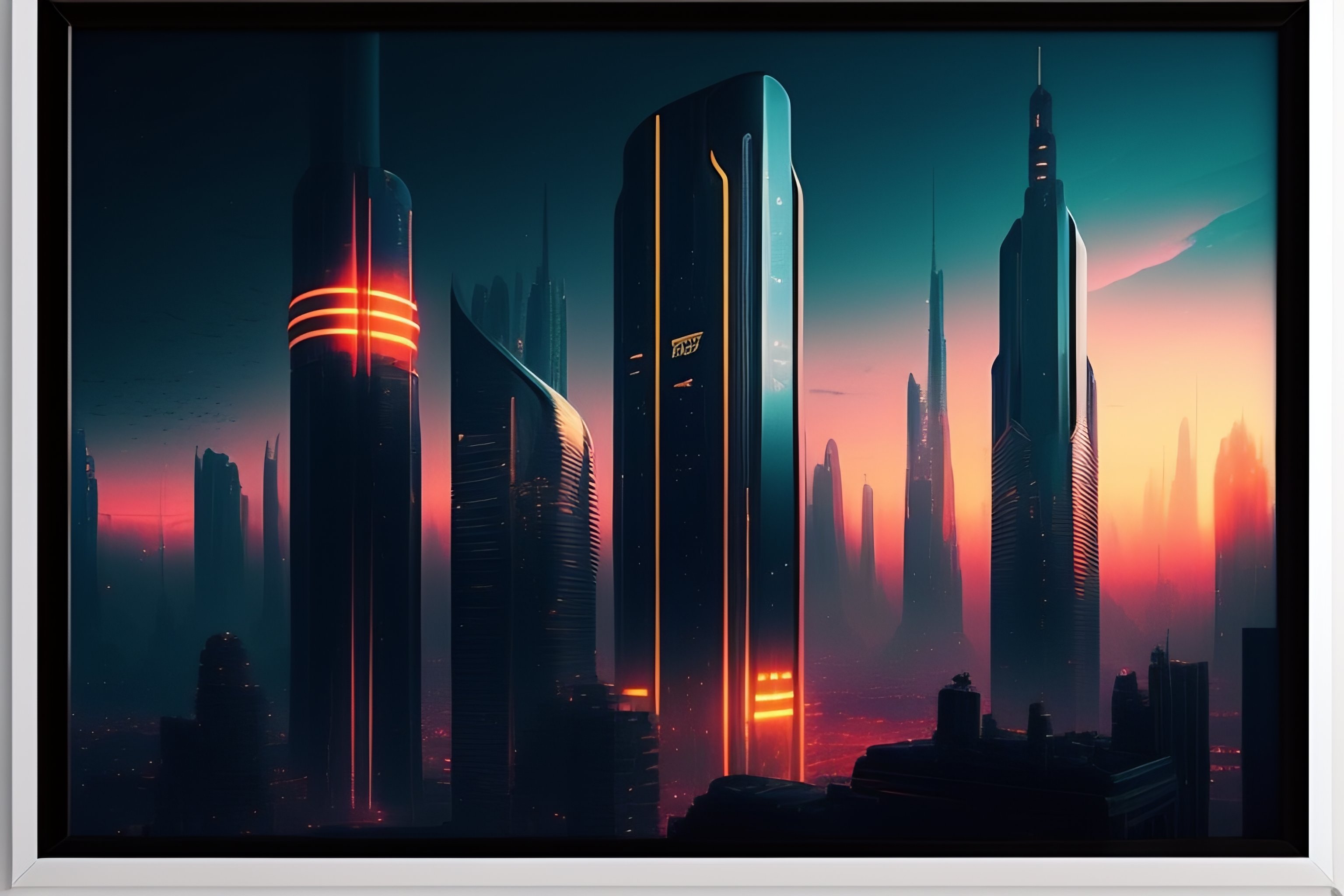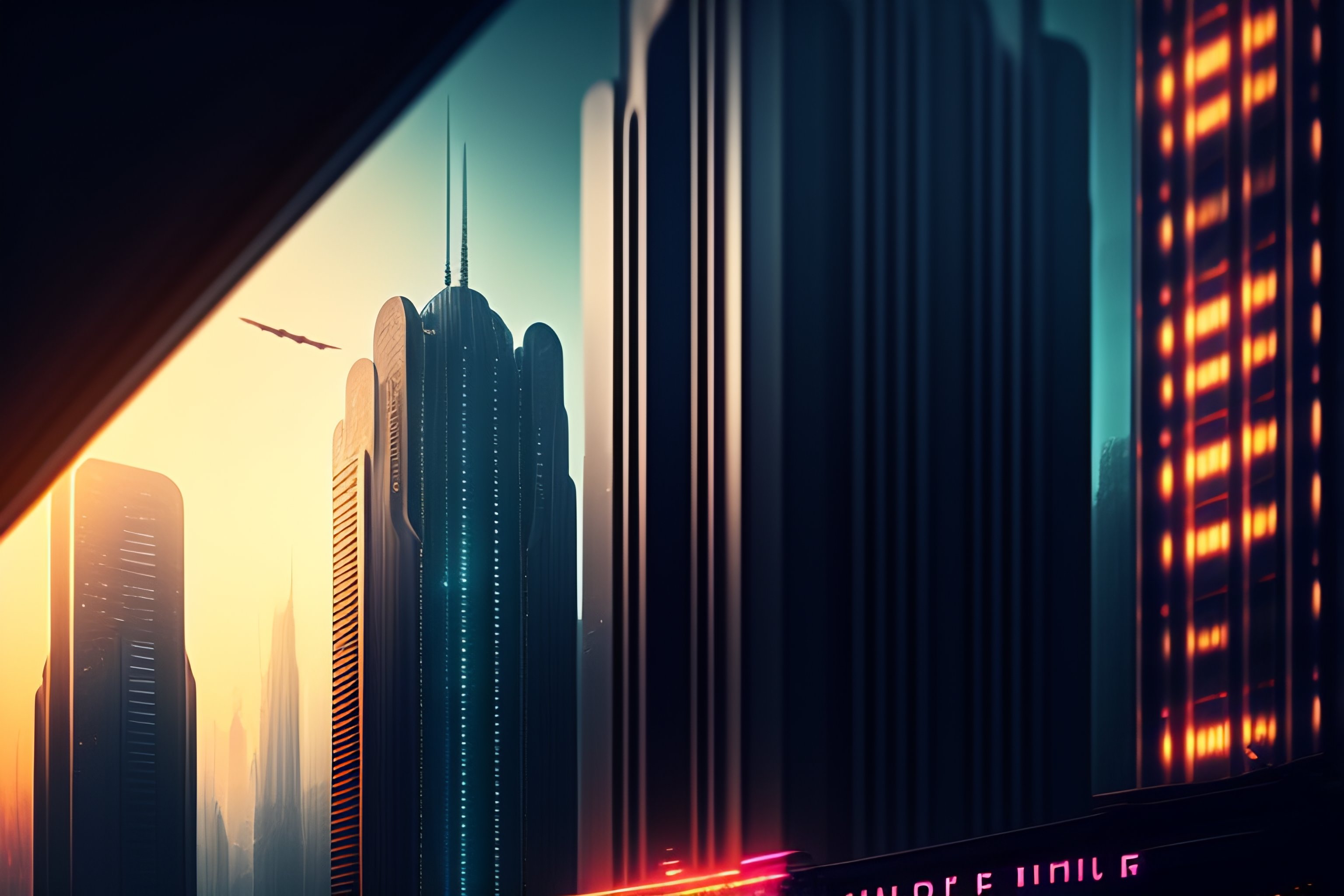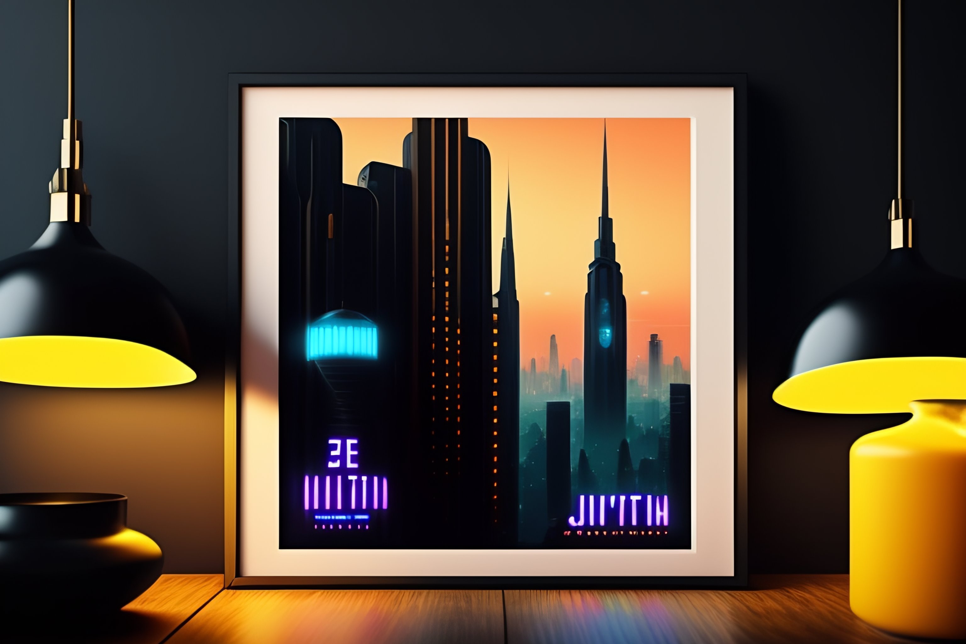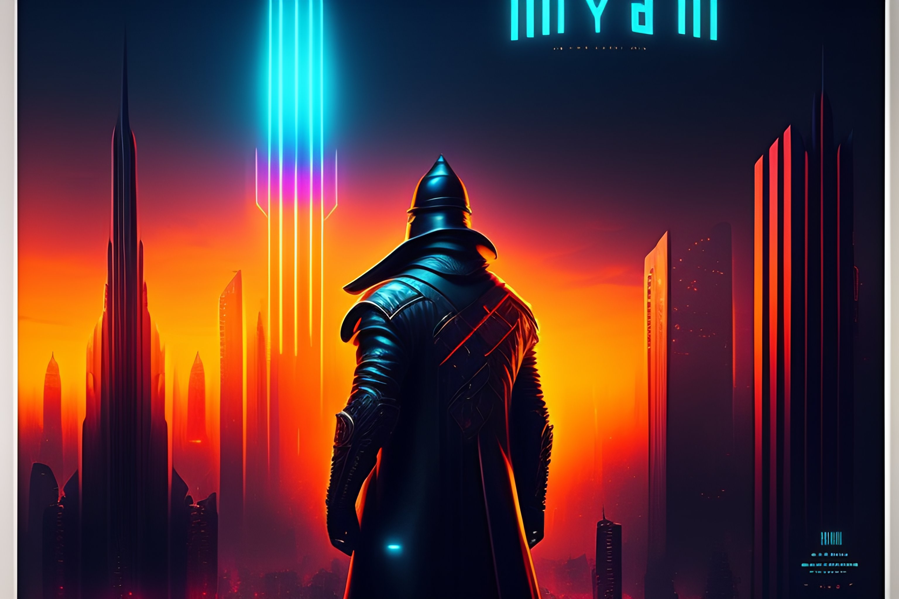 Futuristic vintage medium shot 1920's poster with cyberpunk city, black in color, with a cyberpunk city background, futuristic lighting, cinematic lighting, cozy lighting, 8k, cinematic poster vintage 1800s