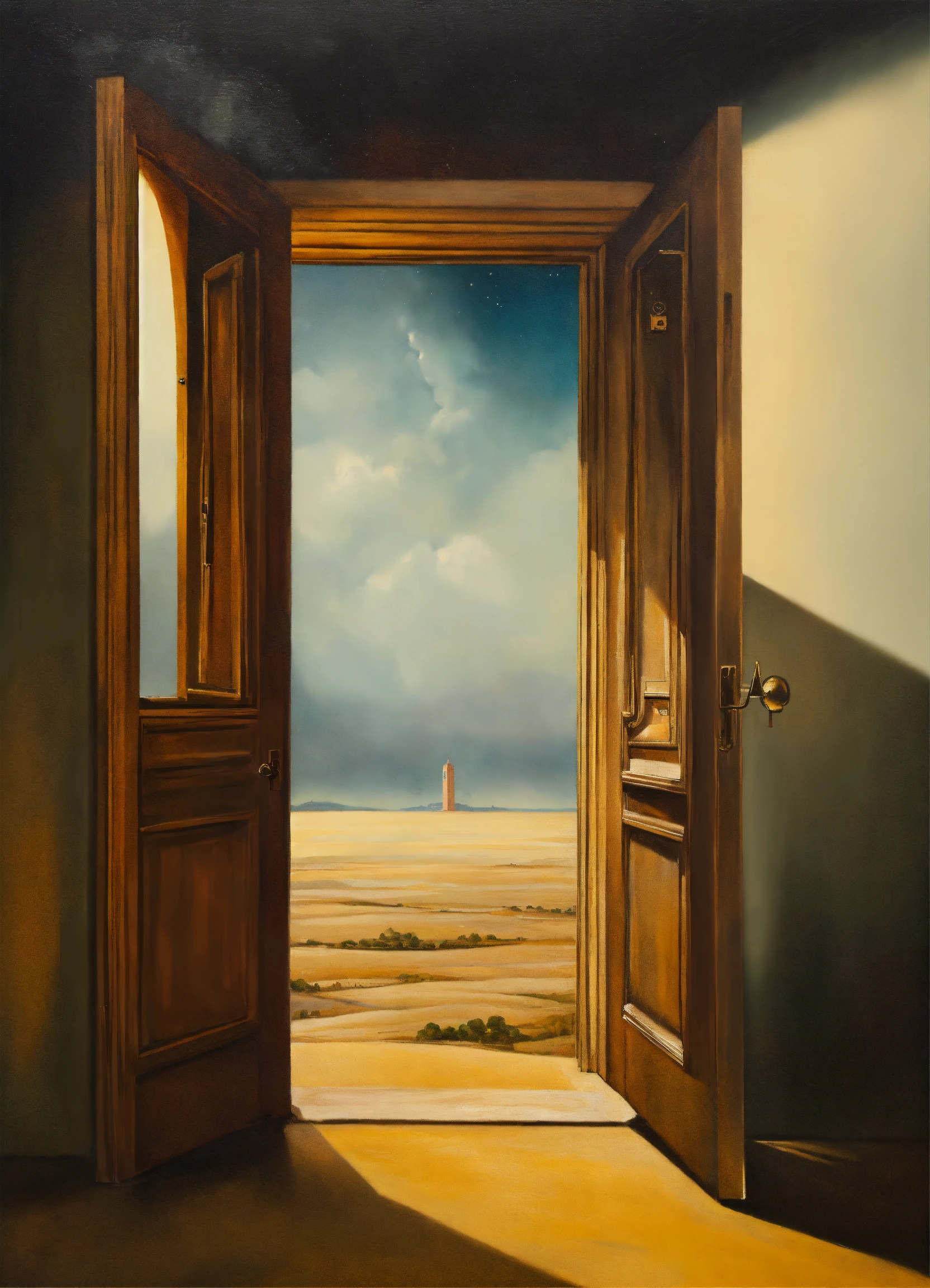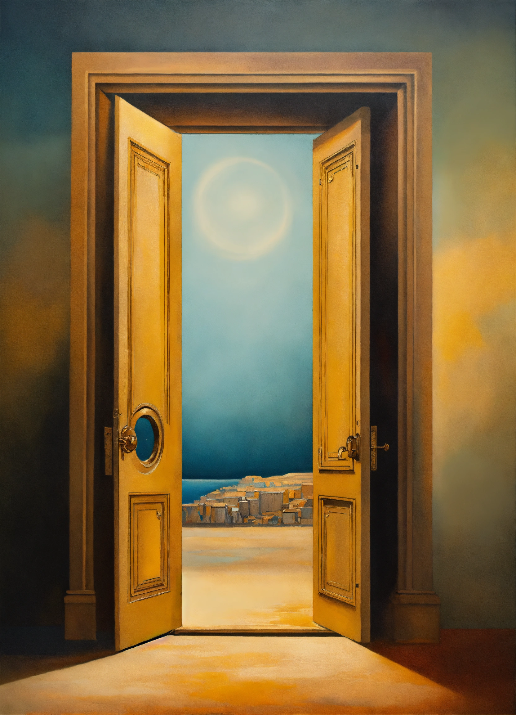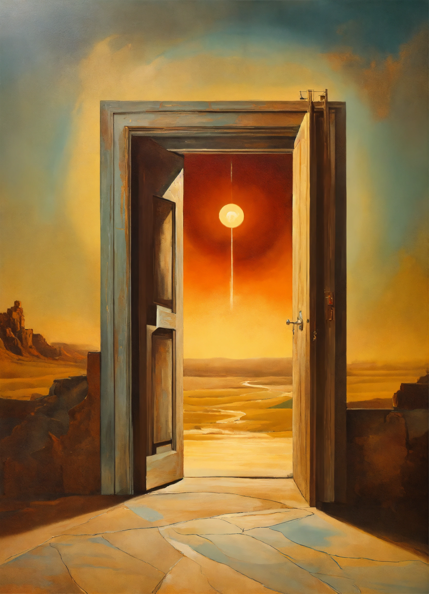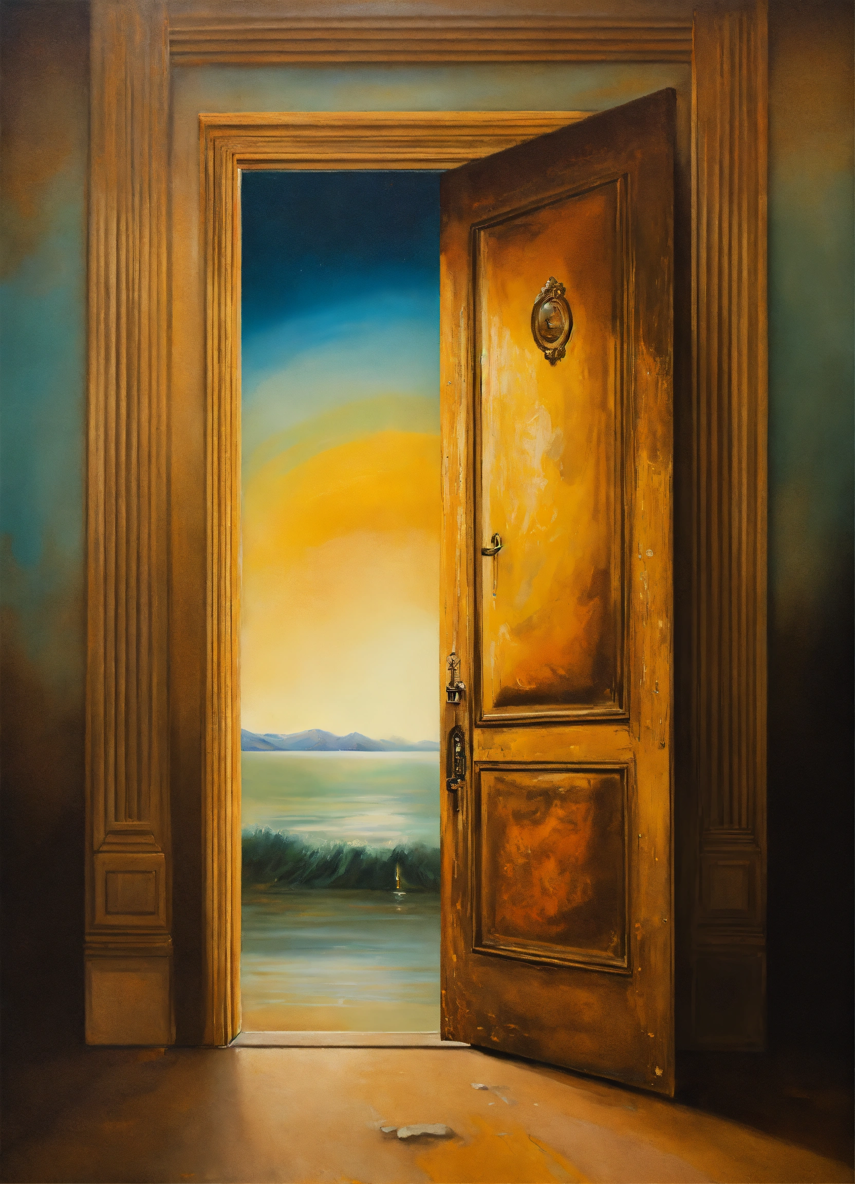 Minimalist, abstract and surreal oil painting of a big, old, majestic door open to a new world of self discovery in dali style and high resolution