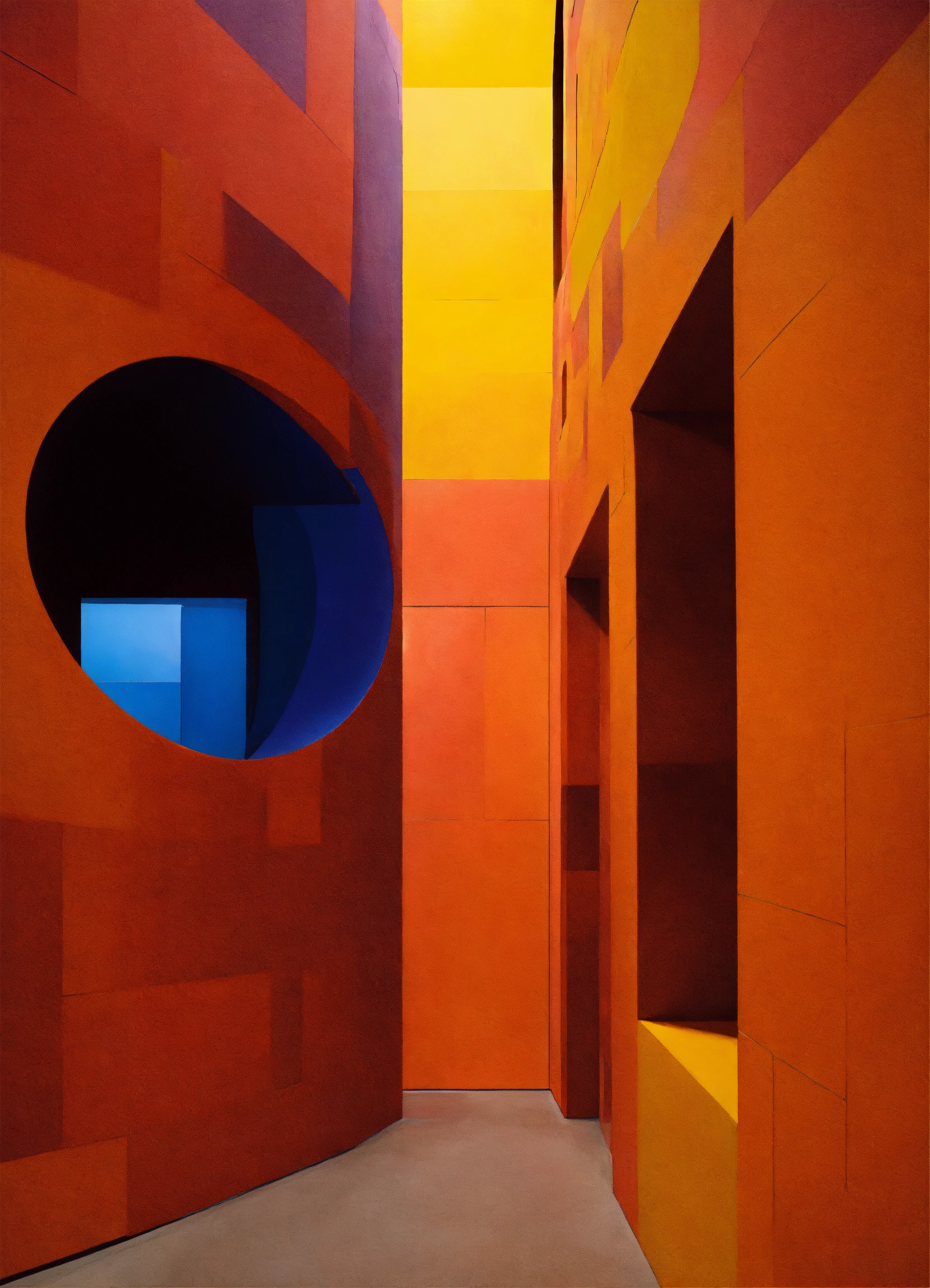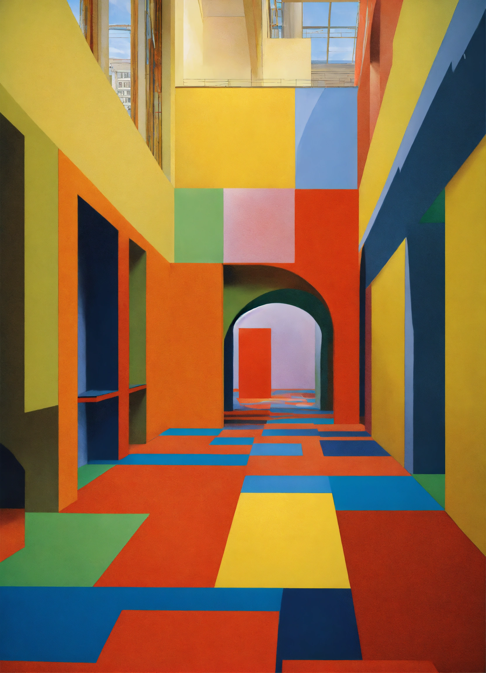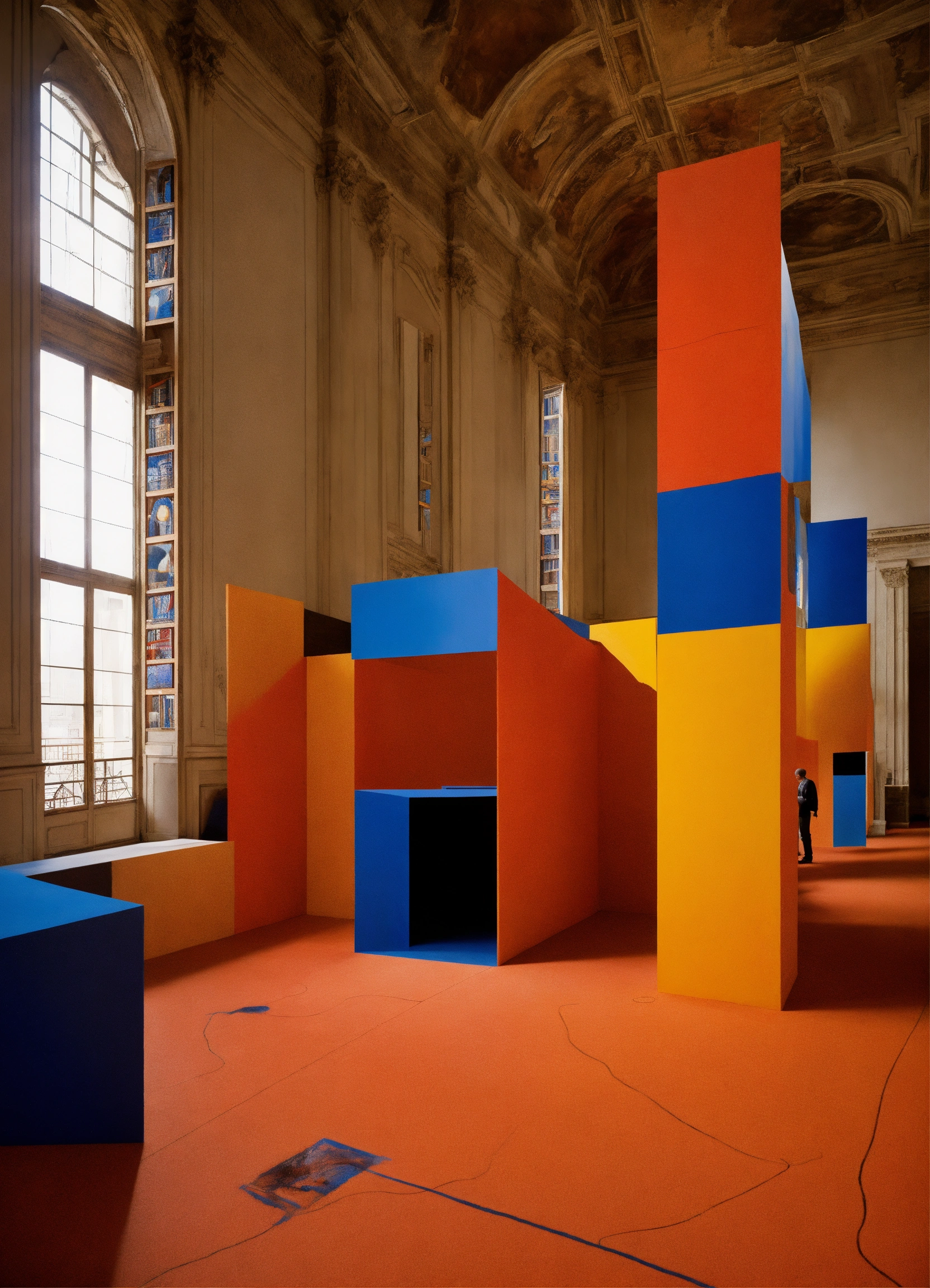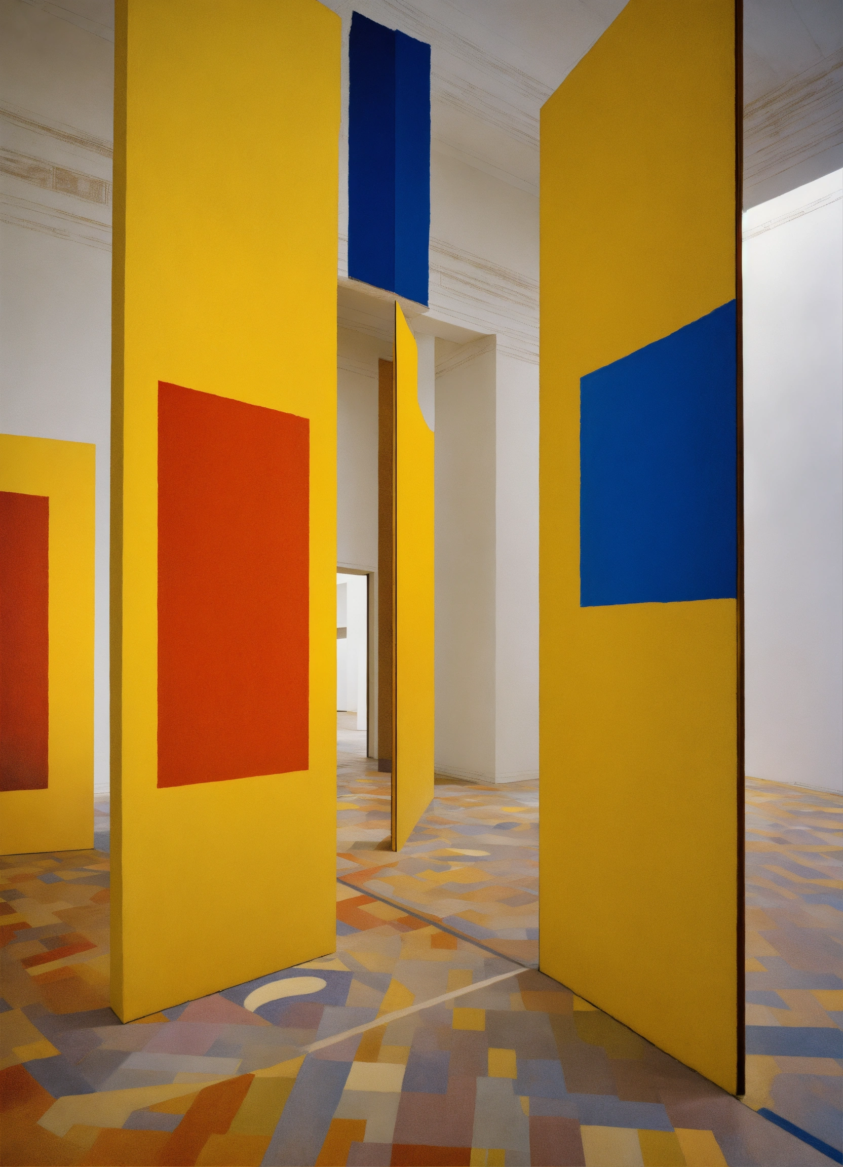 Painting with brush marks of a surreal futuristic anamorphosis by felice varini, georges rousse& peter zumthor