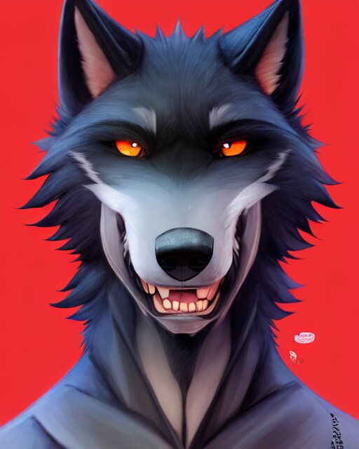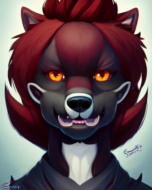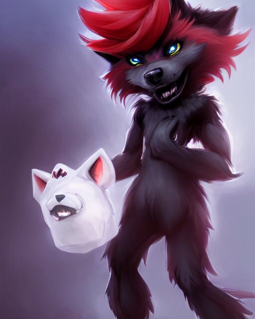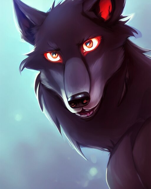 Character concept art of a black anthropomorphic furry wolf with red hair and blue eyes | | cute - fine - face, pretty face, key visual, realistic shaded perfect face, fine details by stanley artgerm lau, wlop, rossdraws, james jean, andrei riabovitchev, marc simonetti, and sakimichan, tranding on artstation