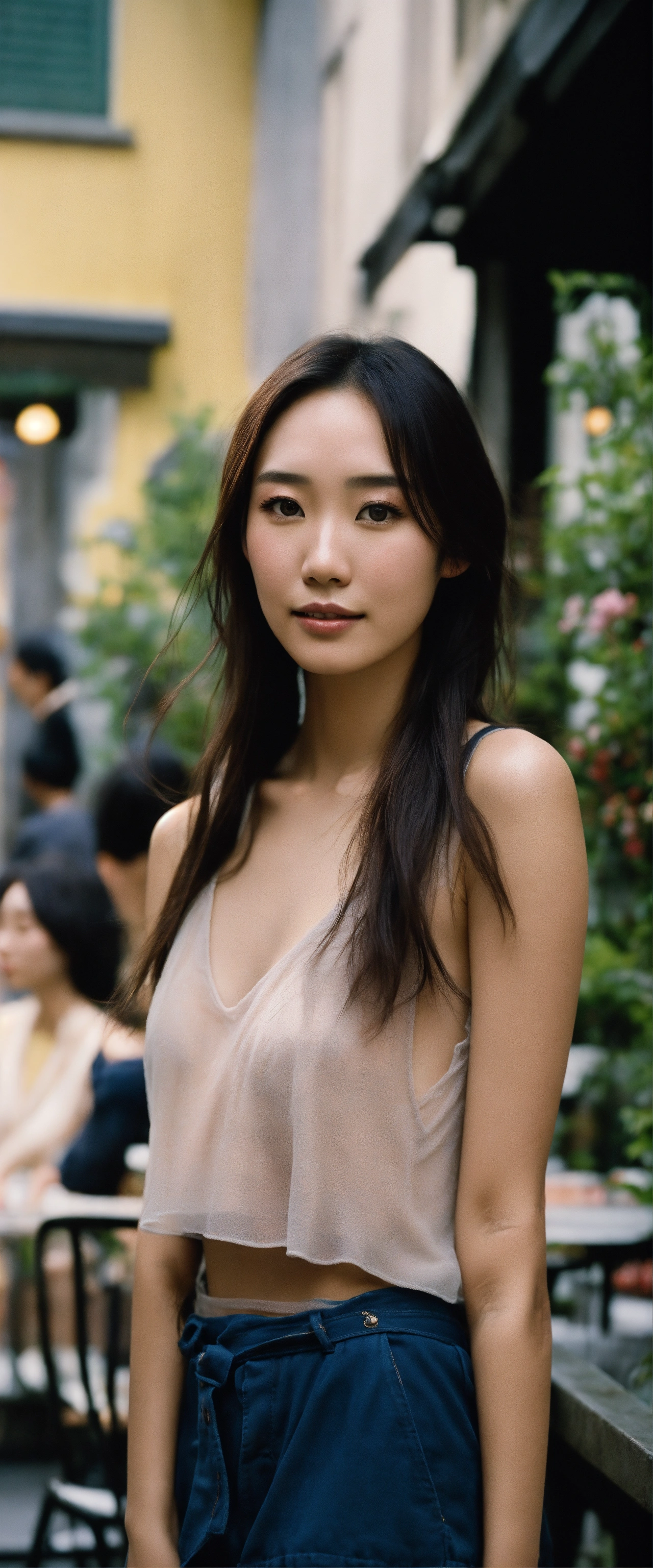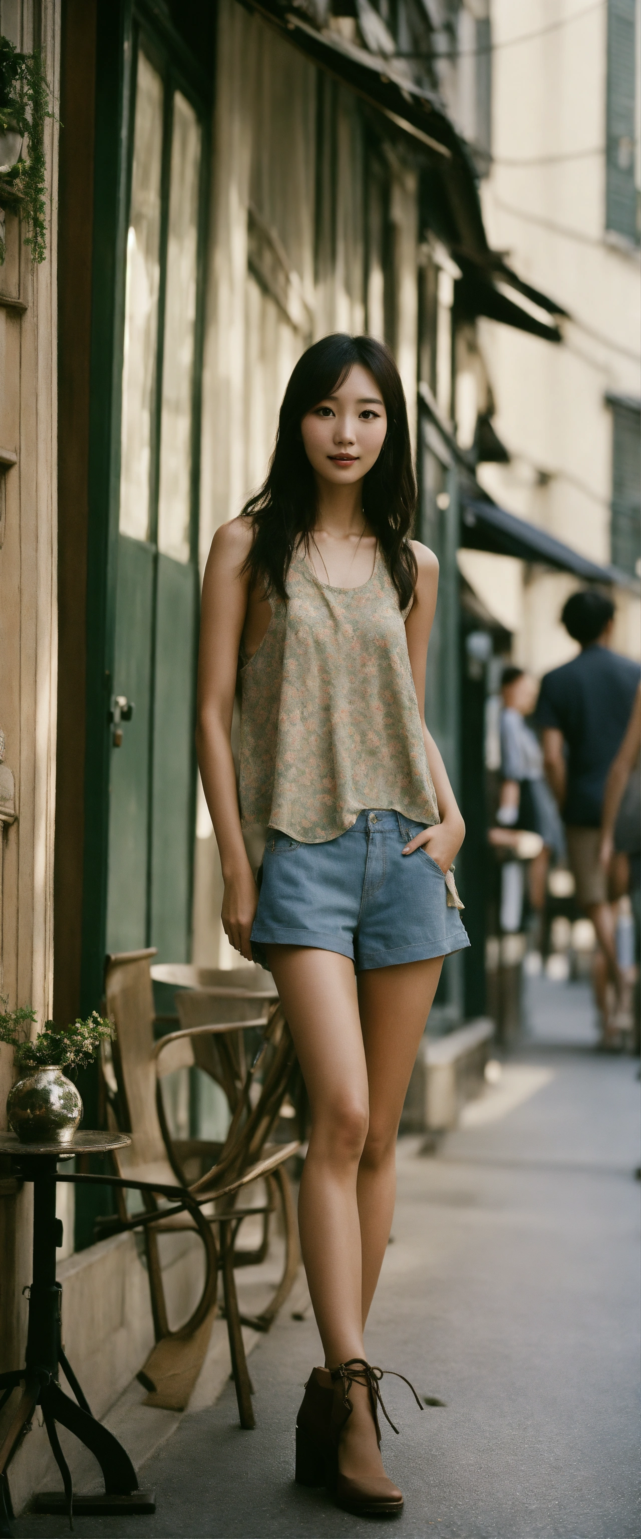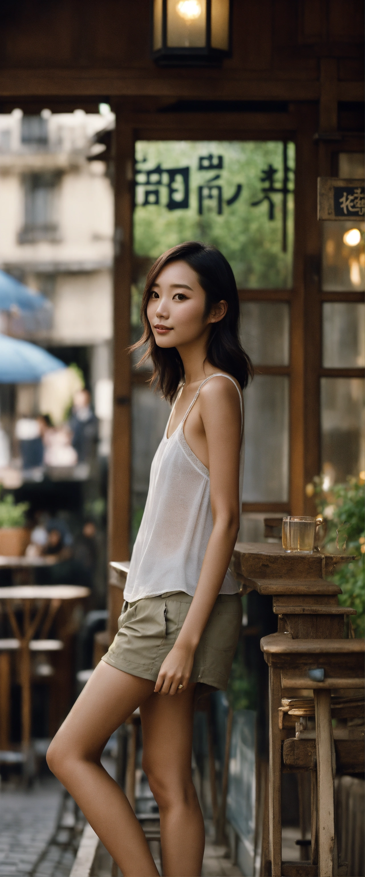Portrait of a beautiful japanese yui aragaki with long smooth hair, wearing shorts and a top tank, ethereal dreamy foggy, photoshoot by steve mccurry, editorial fashion magazine photoshoot, fashion poses, in front of parisian café terrace. kinfolk magazine. film grain. a soft smile