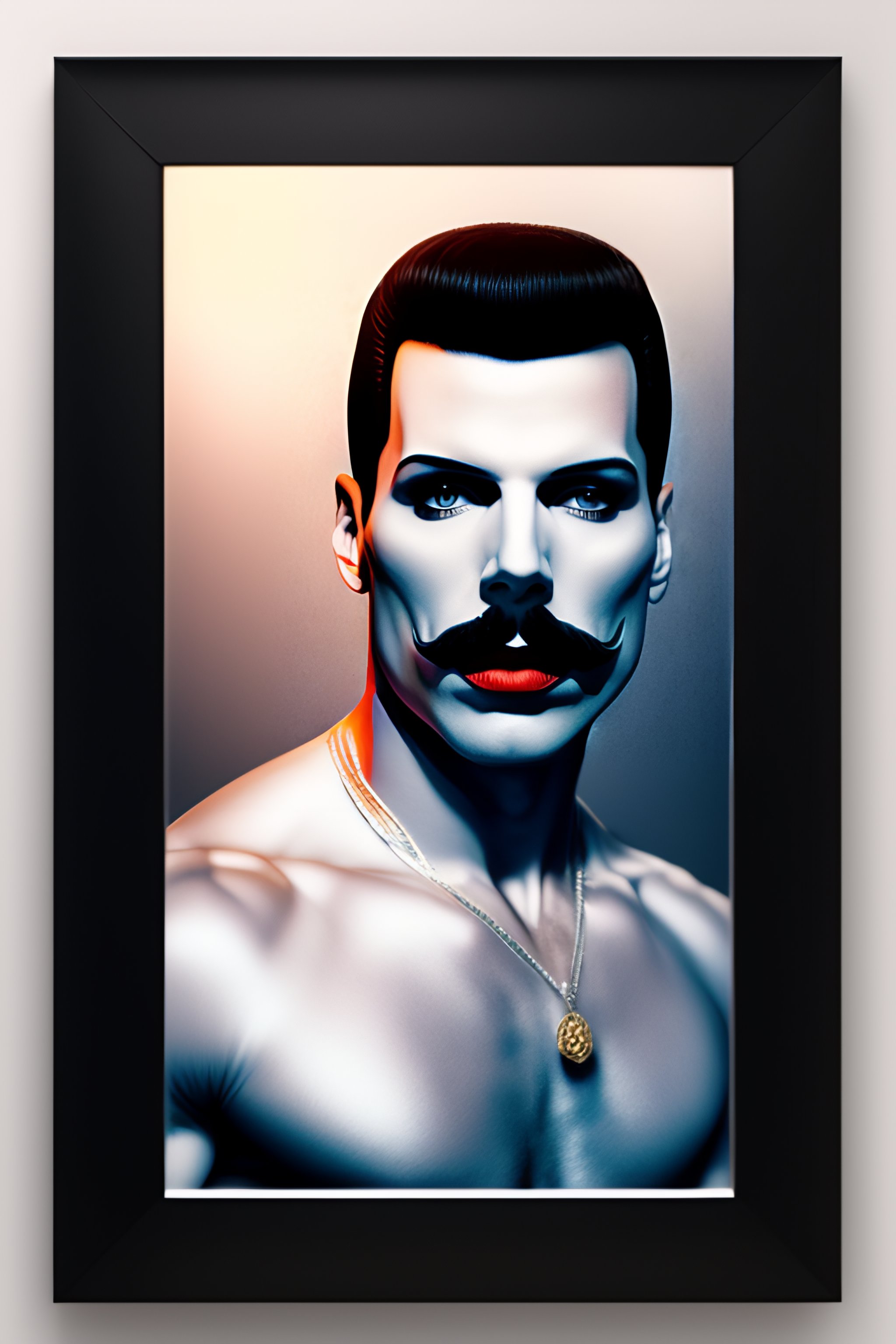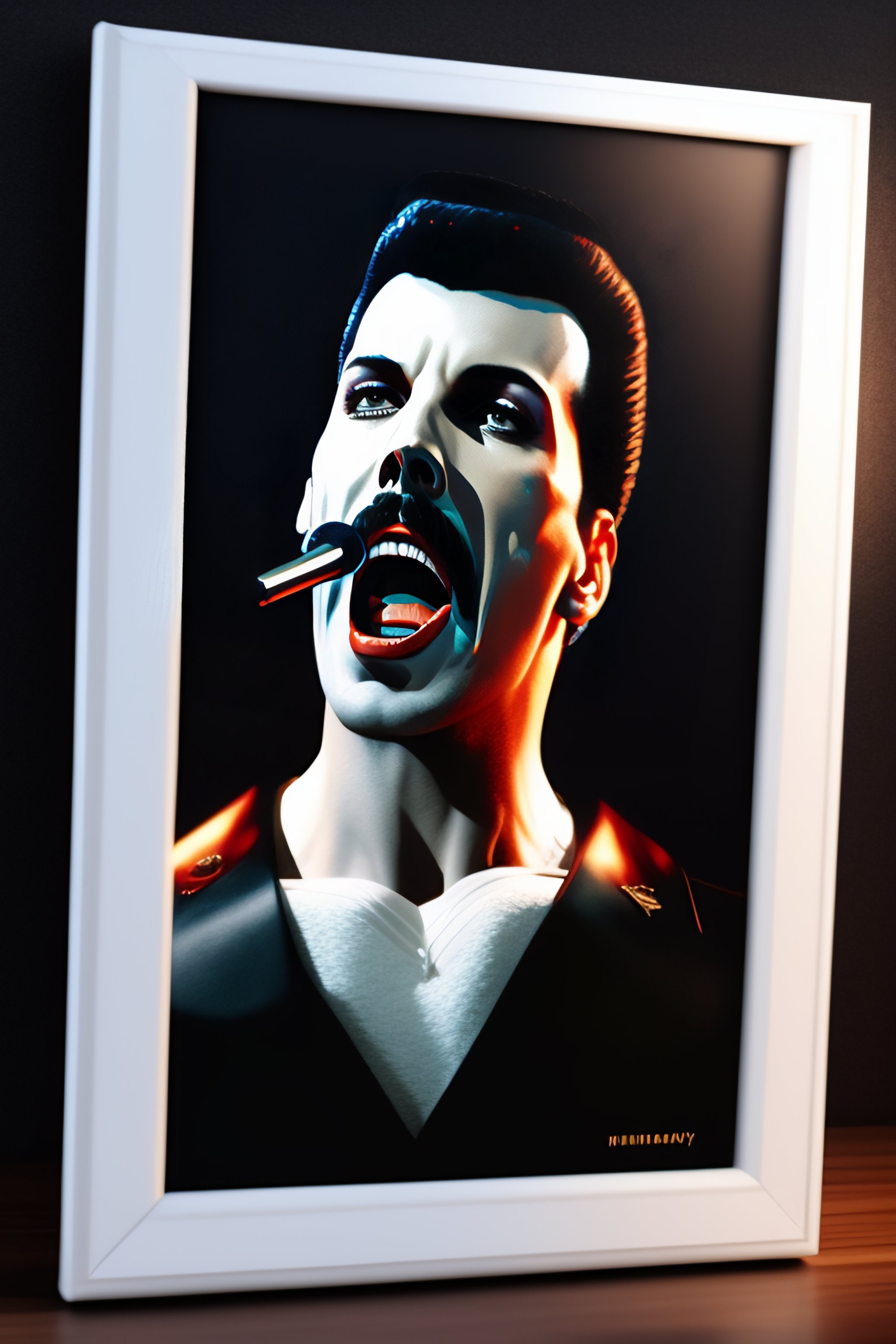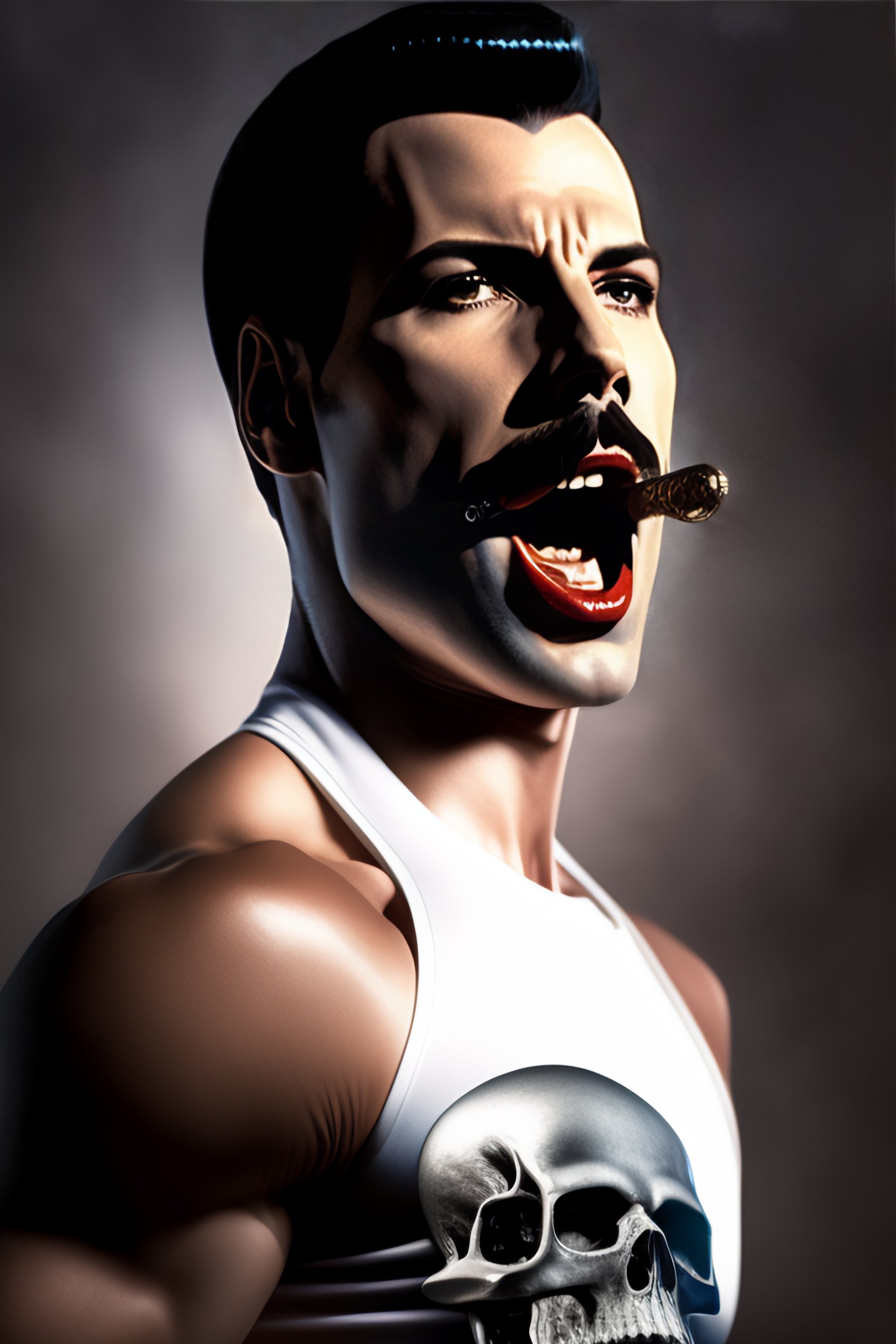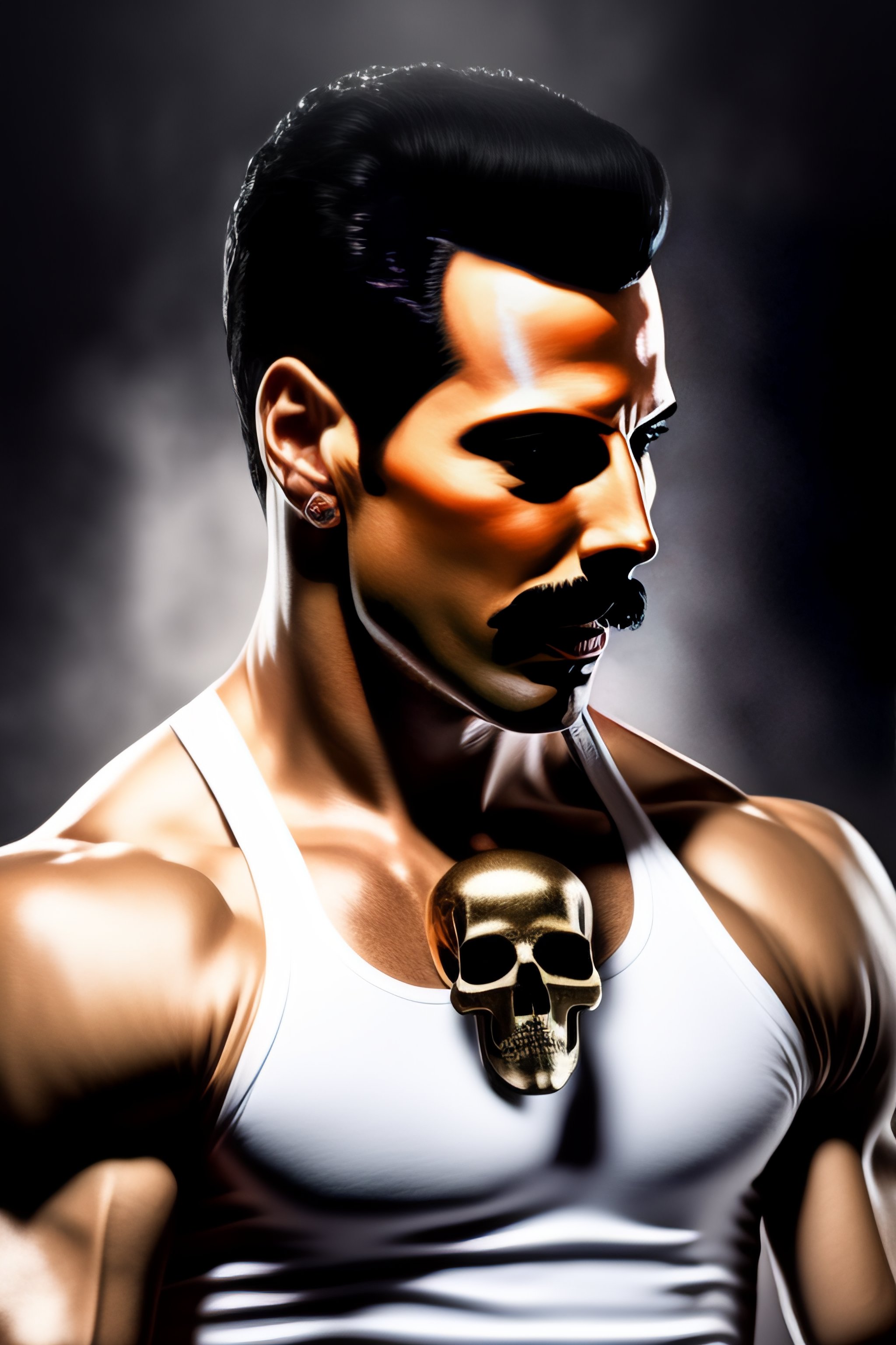 Freddy mercury in a realistic portrait of a skull face as freddy mercury singing, skull face, white tank top, 32k, realistic, award wining photo, rim lighting, detailed hair