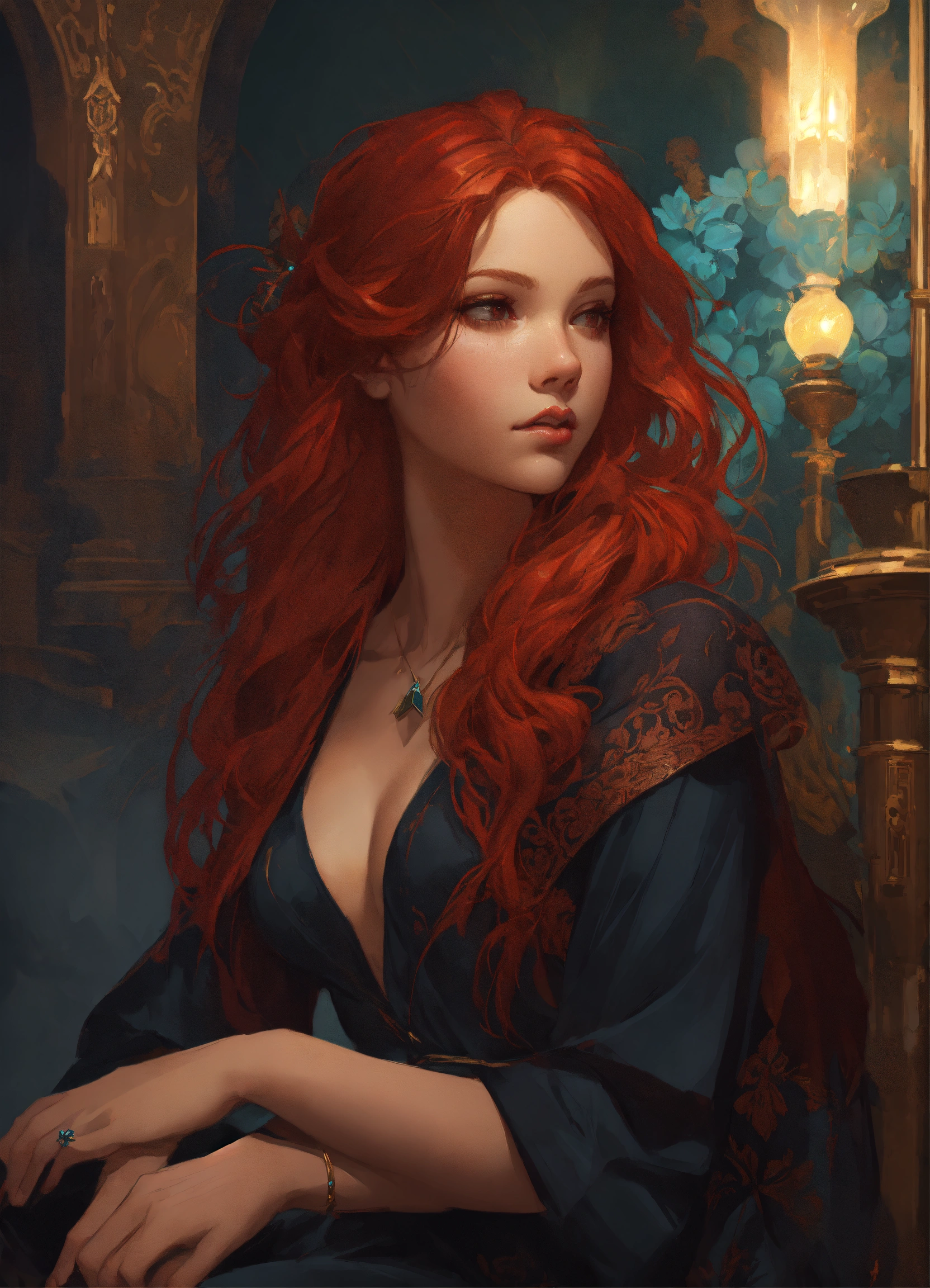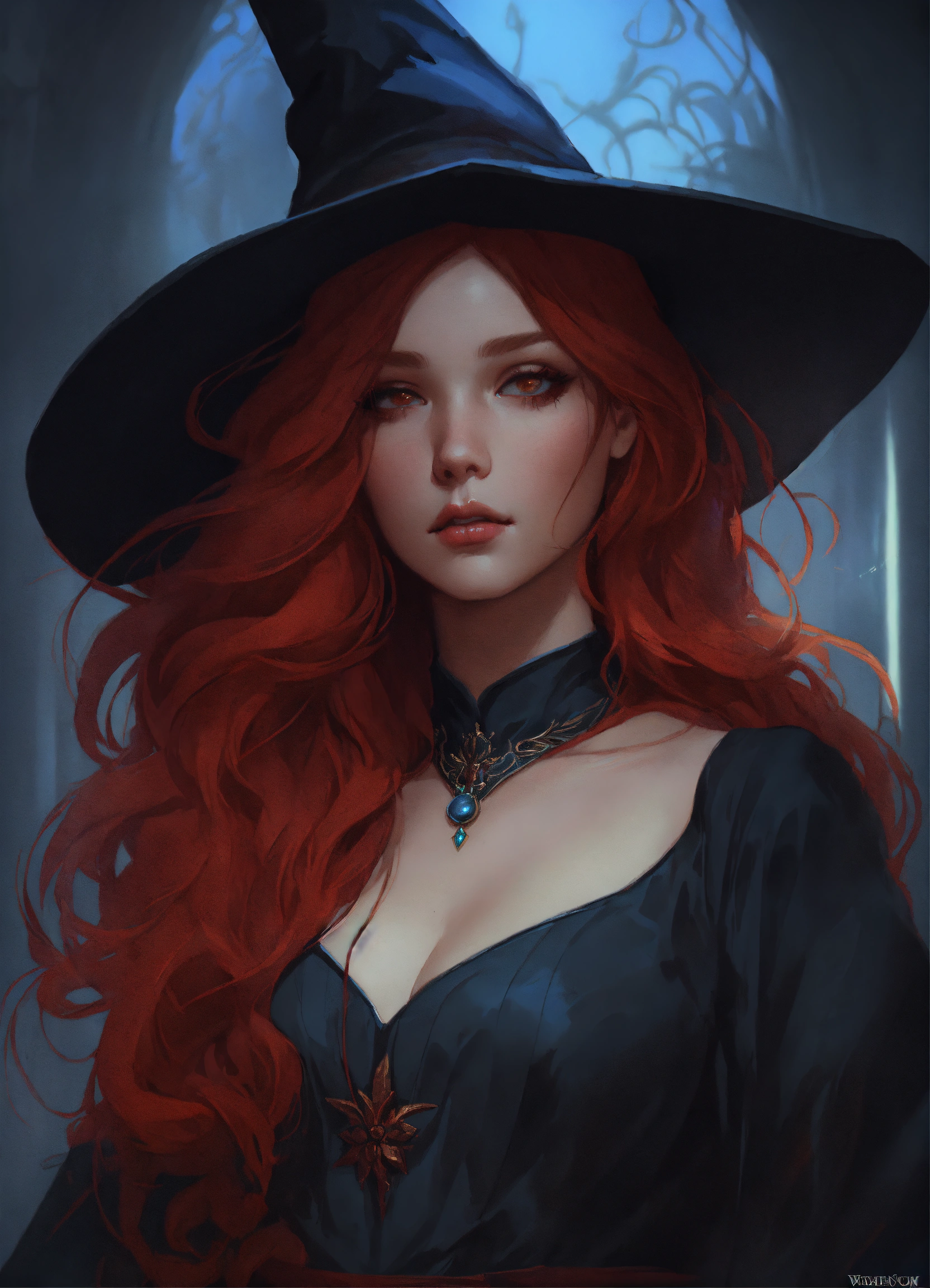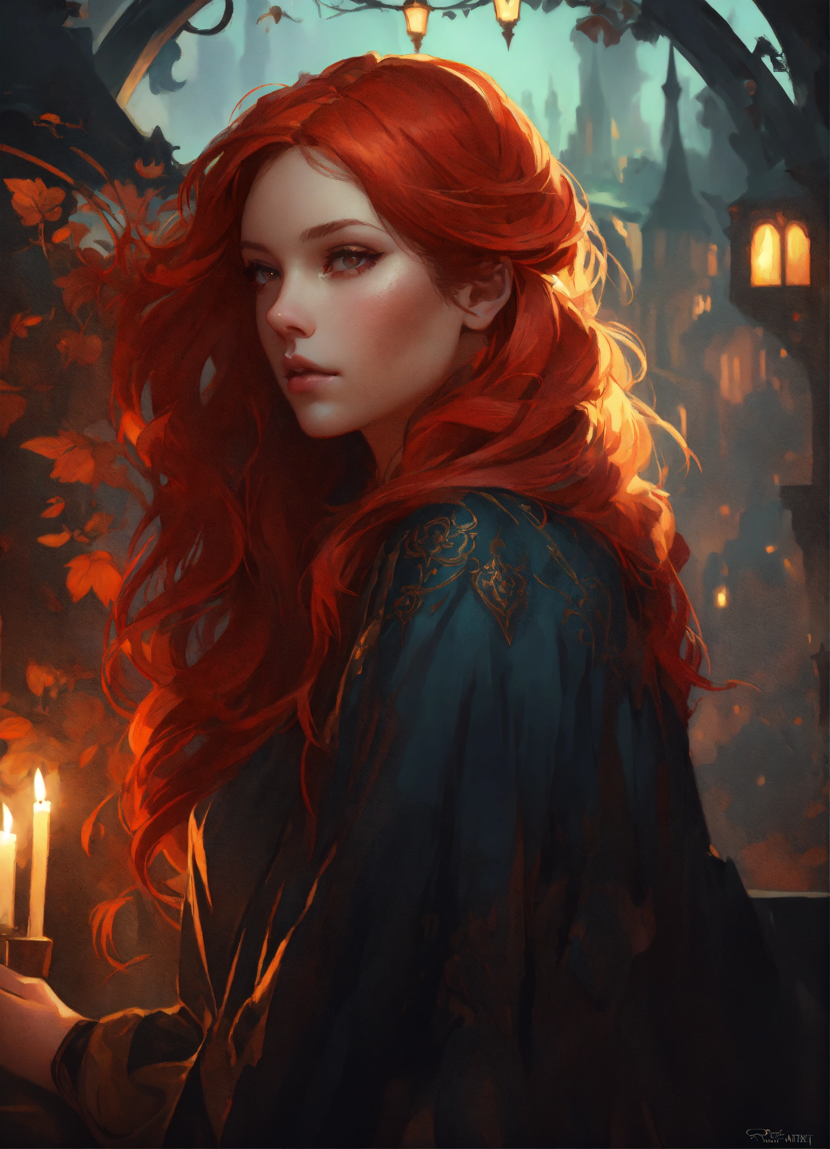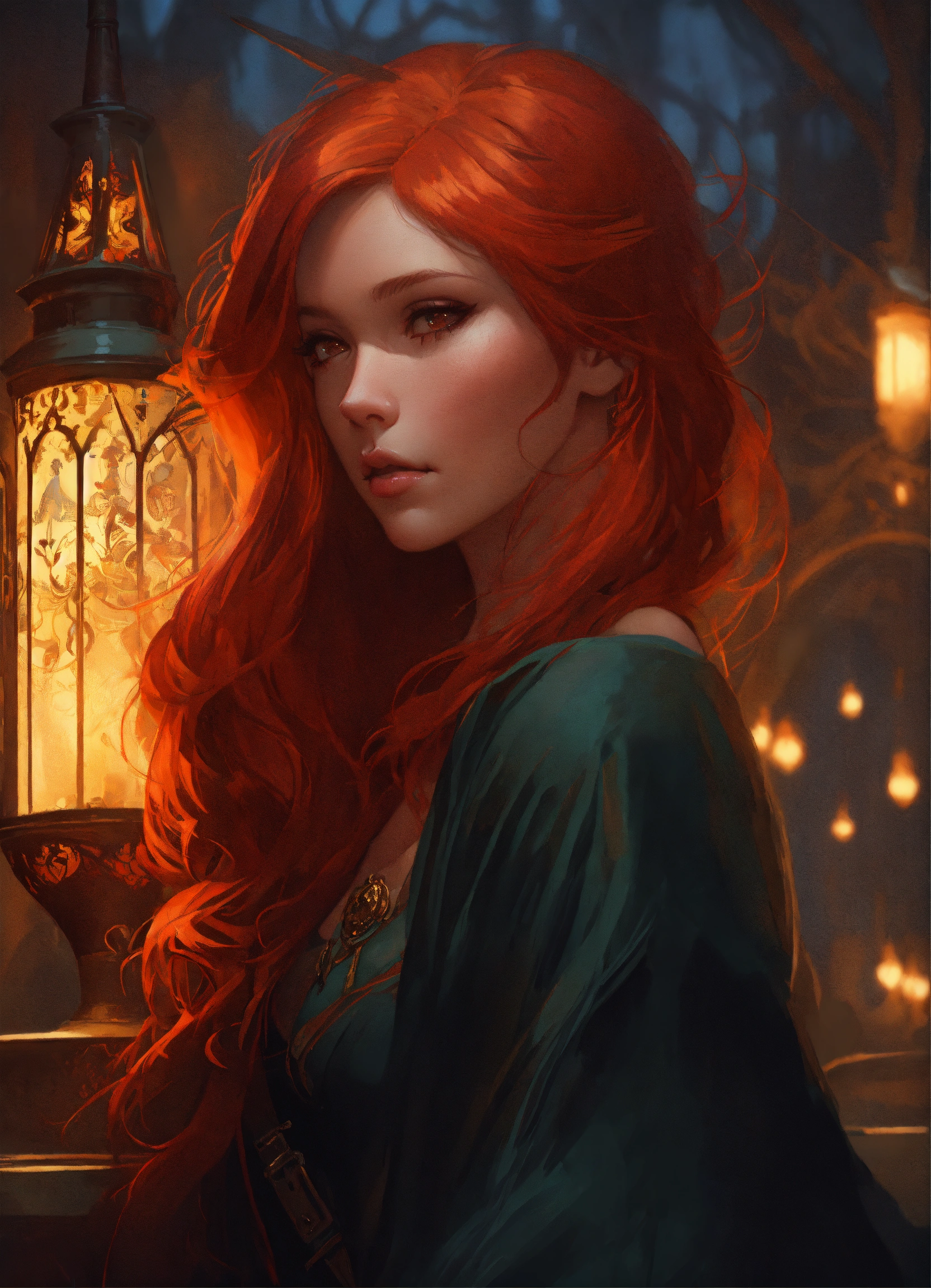 Beautiful, red hair, witch, long hair, dark pin-up style hair, dark light night, intricate, sharp focus, illustration, highly detailed, digital painting, concept art, matte, art by wlop and artgerm and greg rutkowski and alphonse mucha, masterpiece, dark clothes
