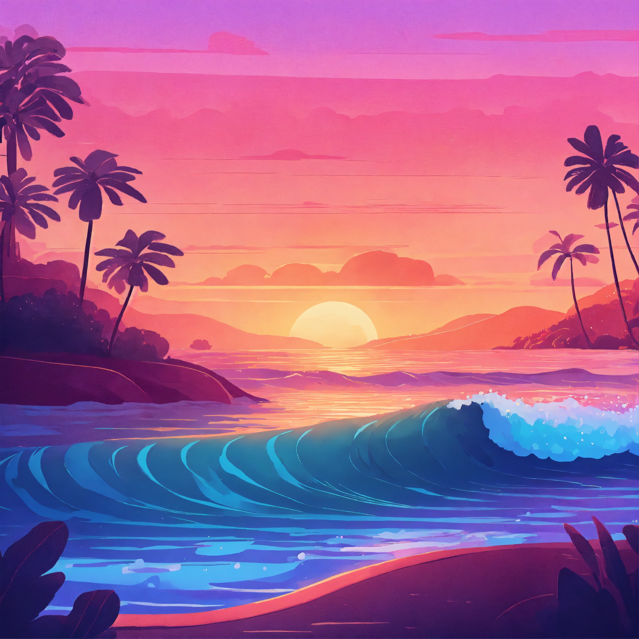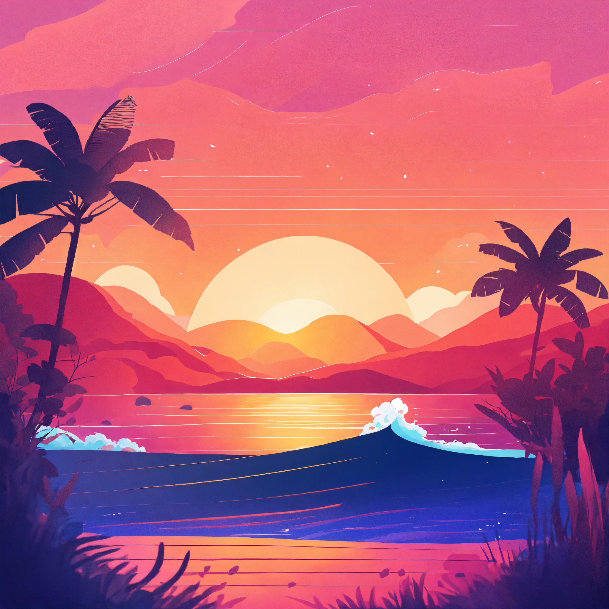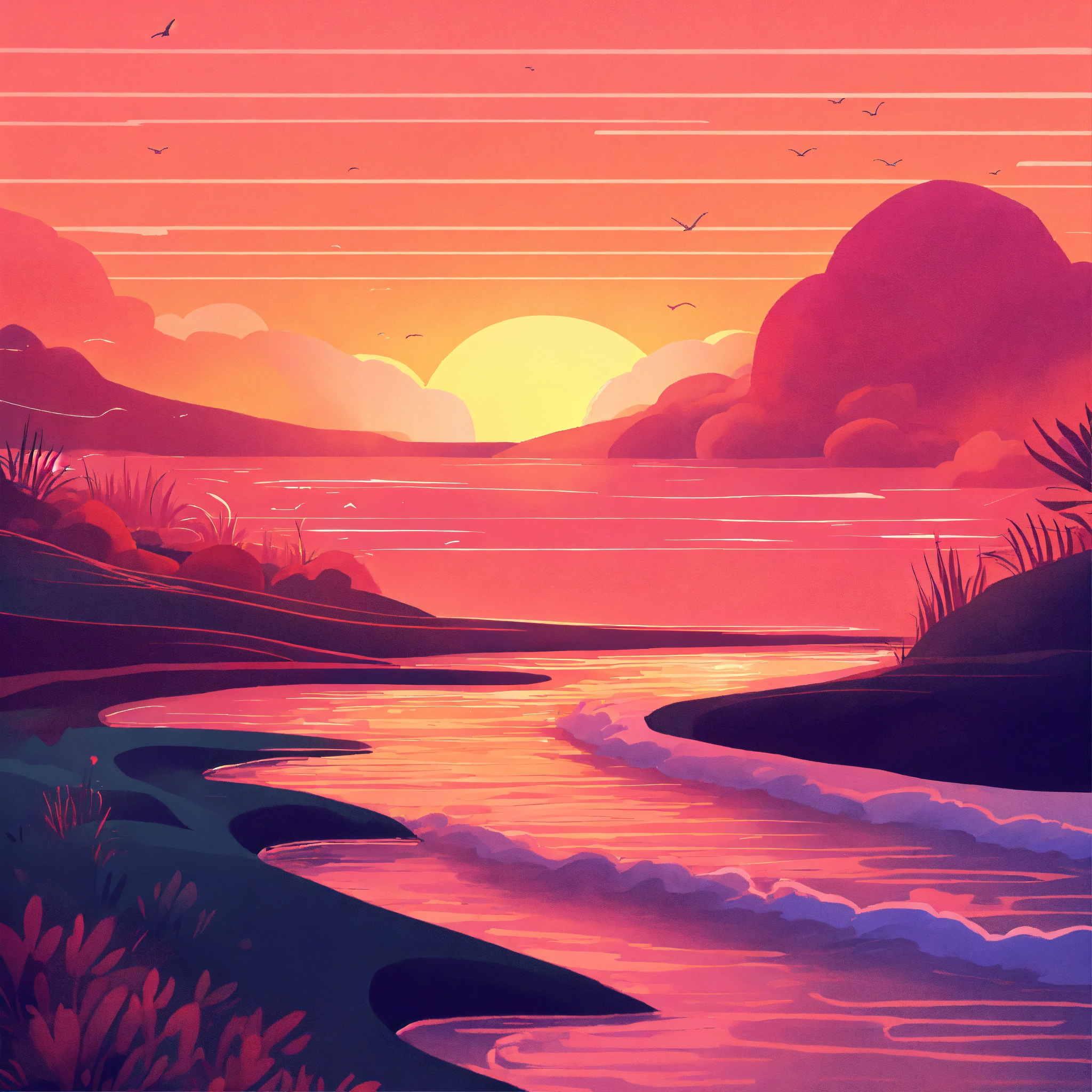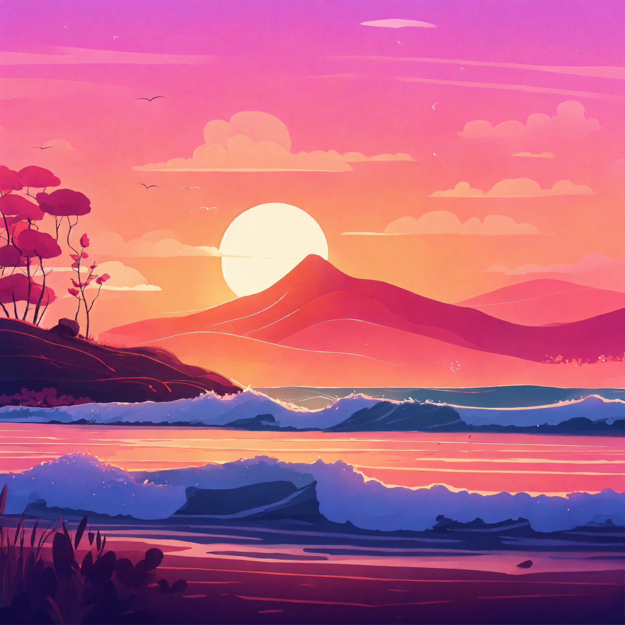 Sunset waves beautiful nature scene, cozy webpage background hero image for adorable platform modern minimalist illustration, lofi