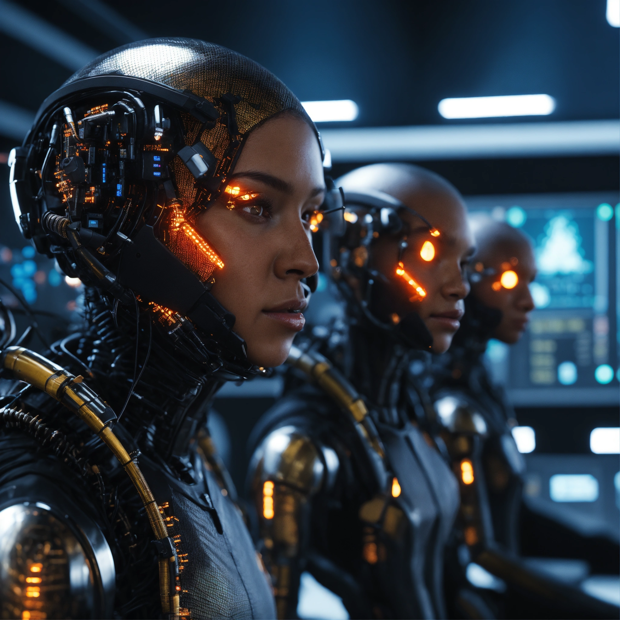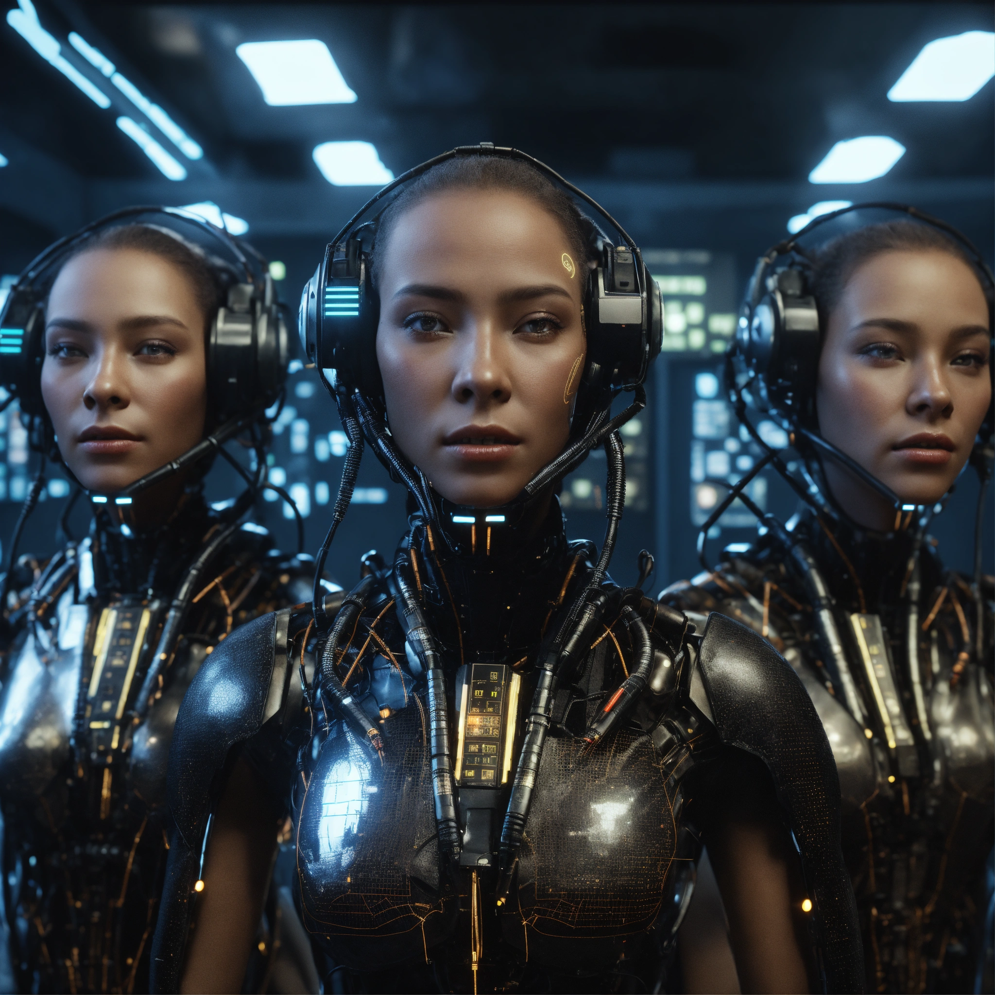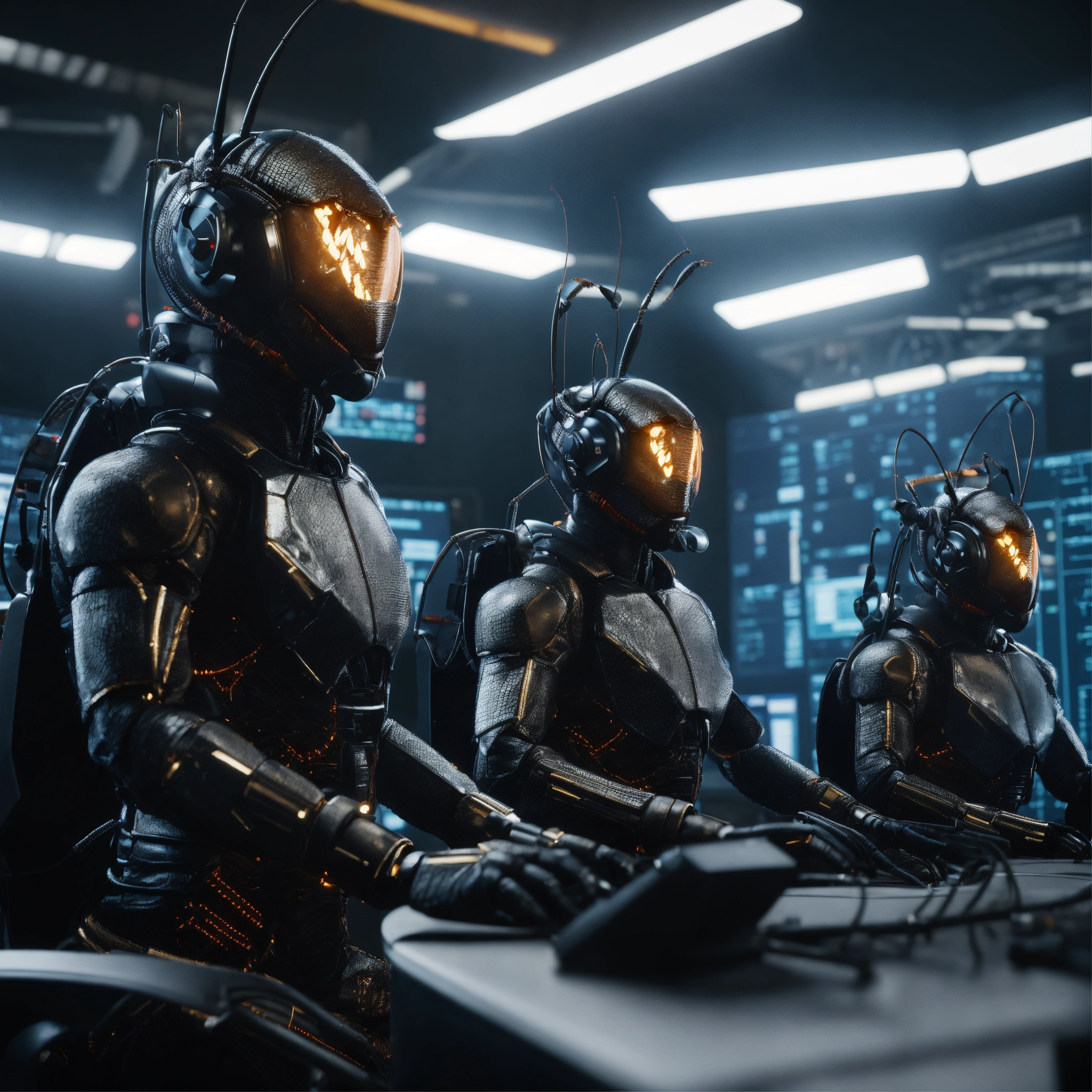 Group of 3 black cockroach faced humanoids with detailed circuit markings, morphing into a human face, in a hi tech control room, realistic, 8k, unreal engine
