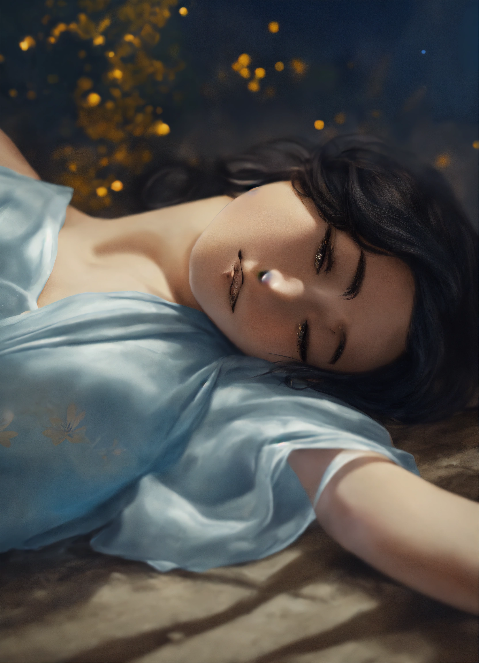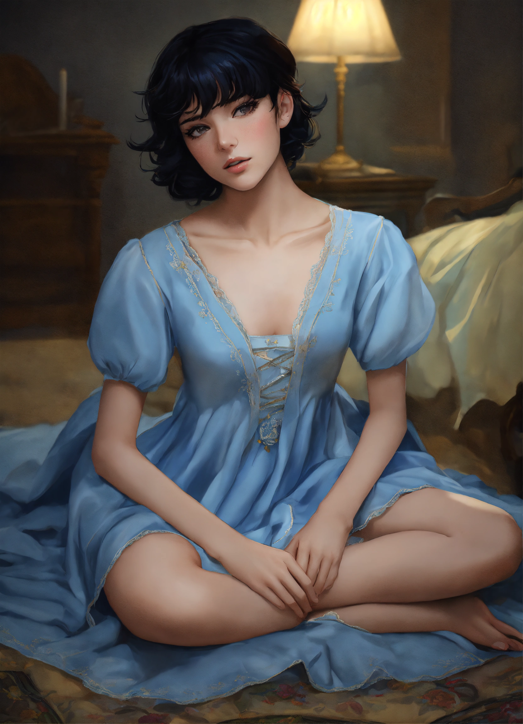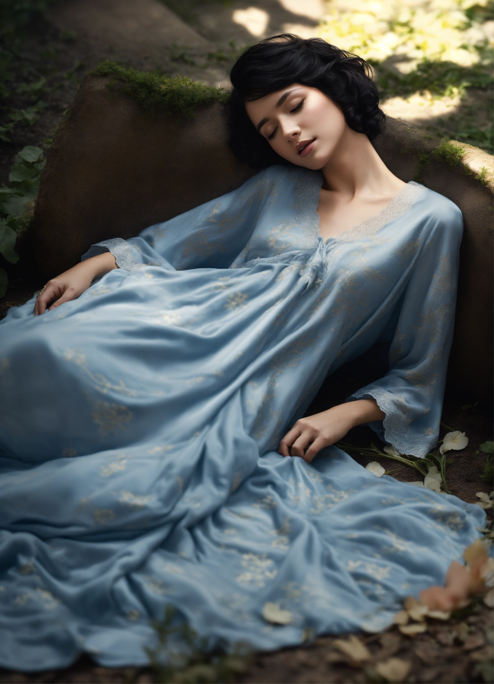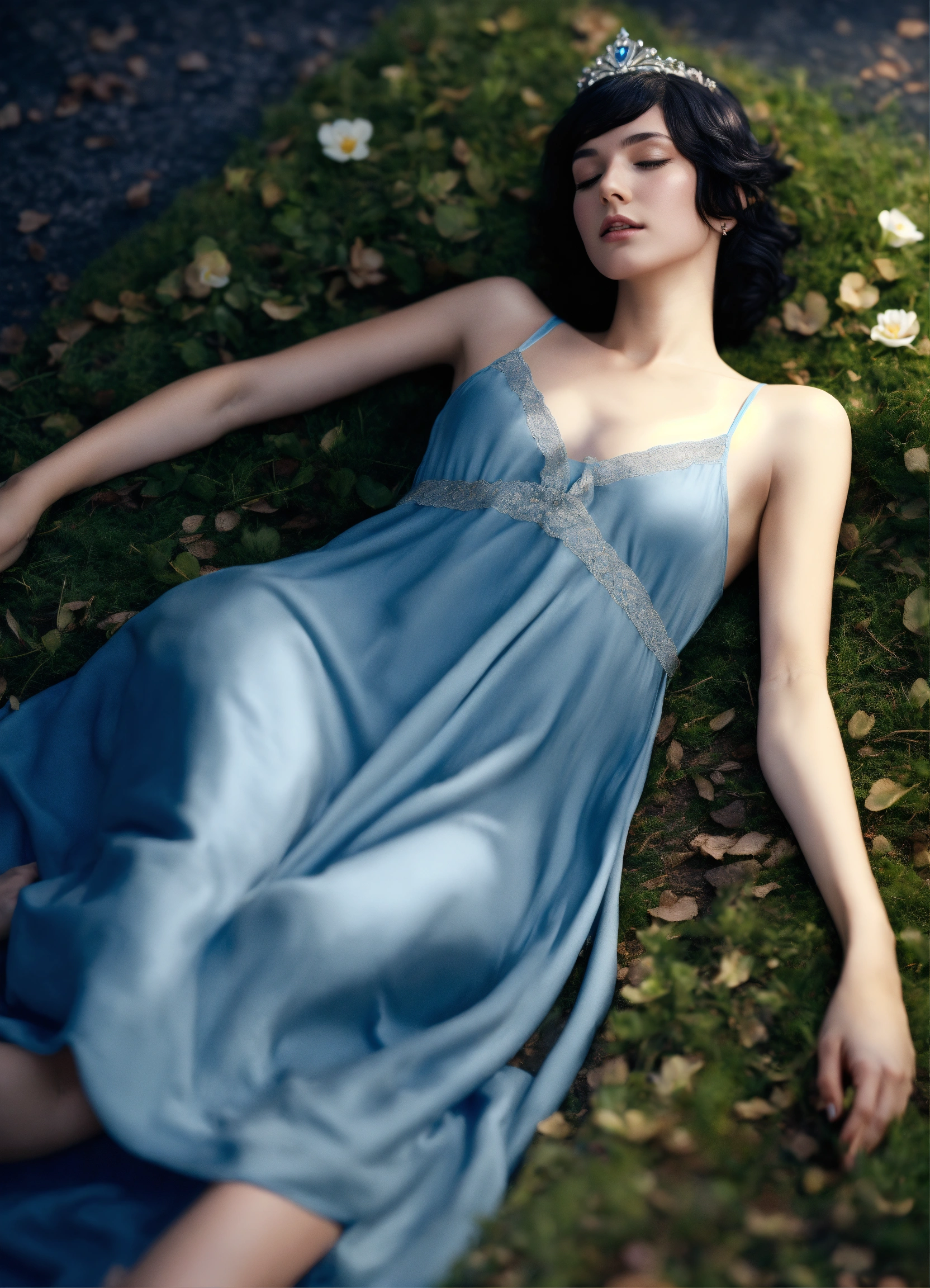 Photorealistic image of a slendar princess, lying down on the ground, wearing a soft blue nightgown, short dark hair
