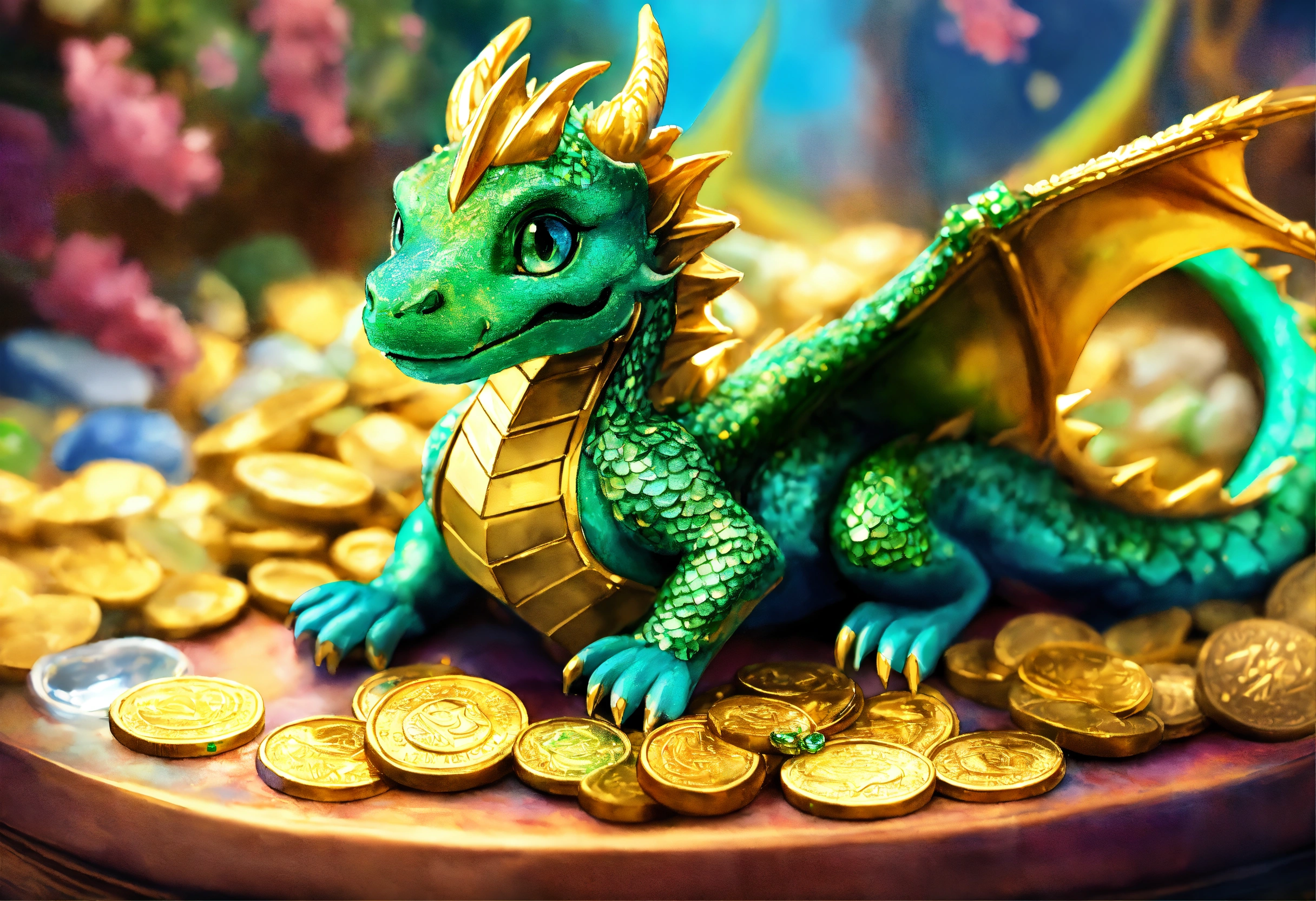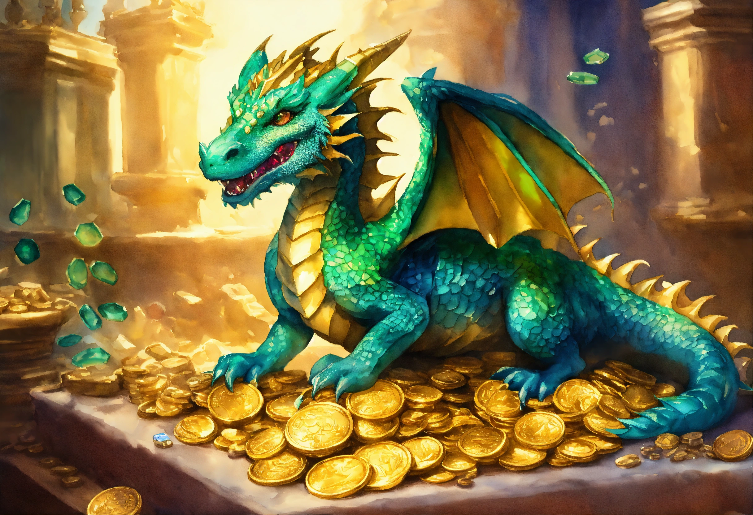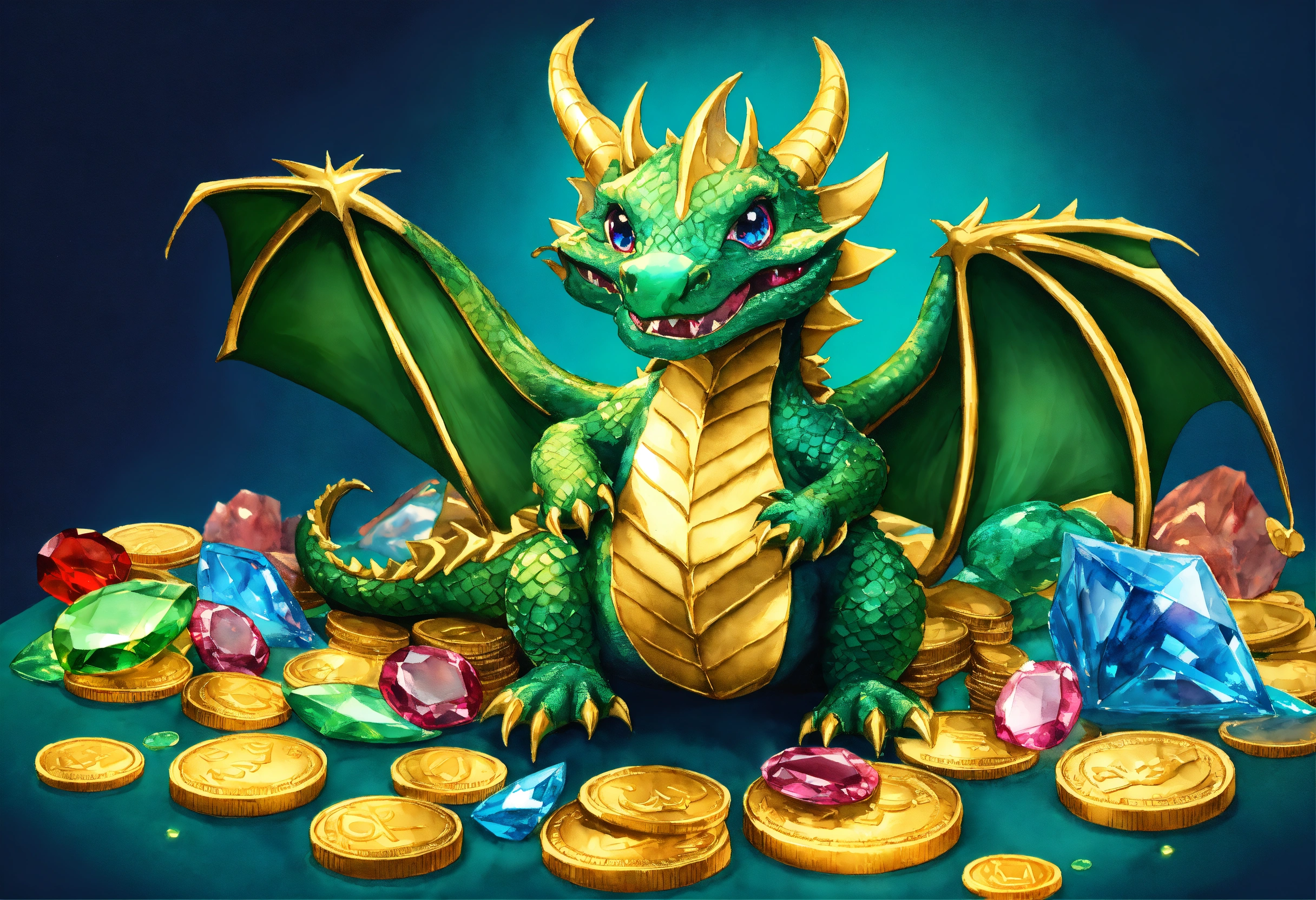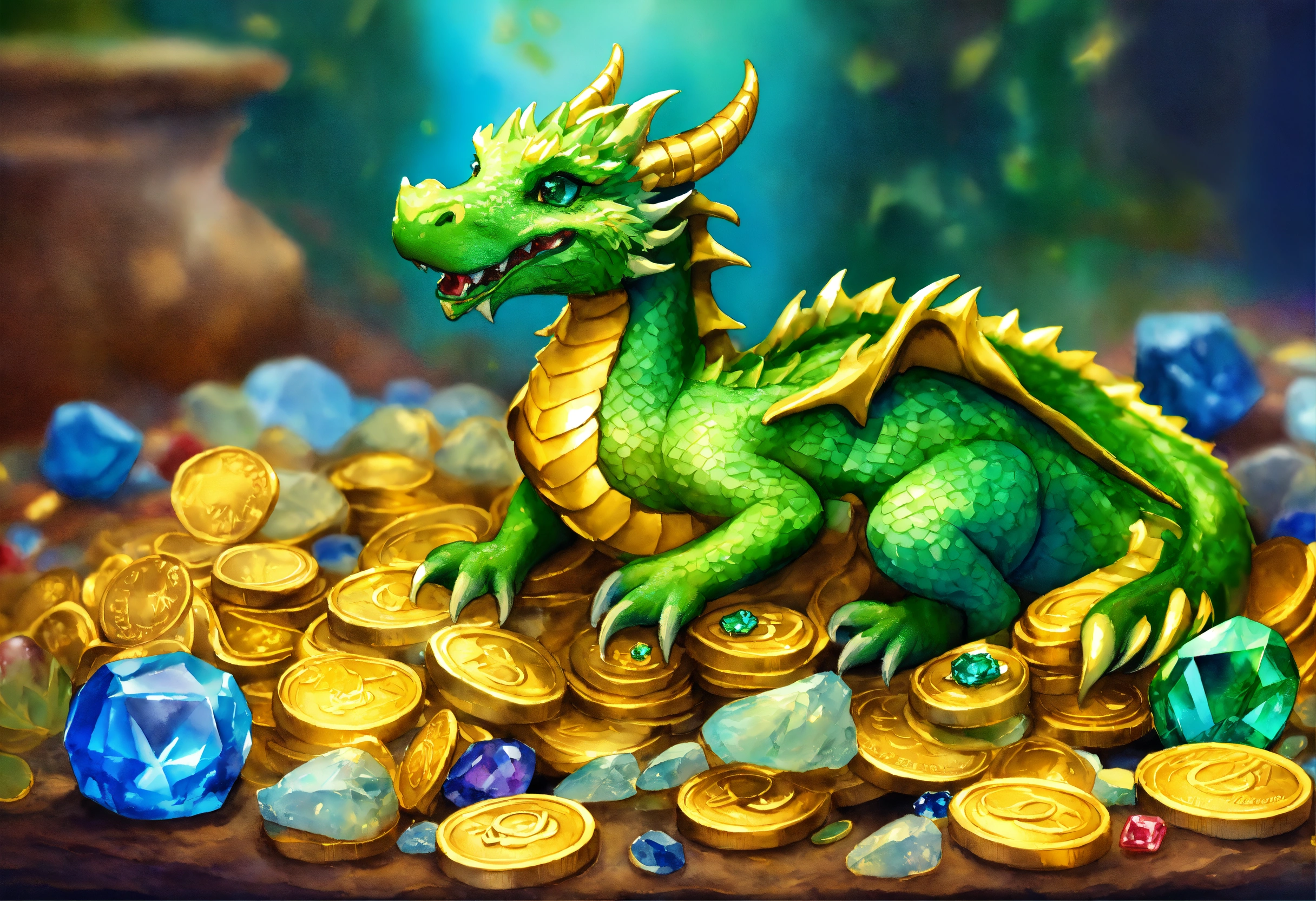 Cute, cute, smiling green and gold dragon sitting on treasures emeralds and gold coins and aquamarines and diamonds and rubies and sapphires, aquamarines and emeralds and gold coins scattered around, photorealistic drawing, watercolor painting, high detail, bright colors, saturated colors