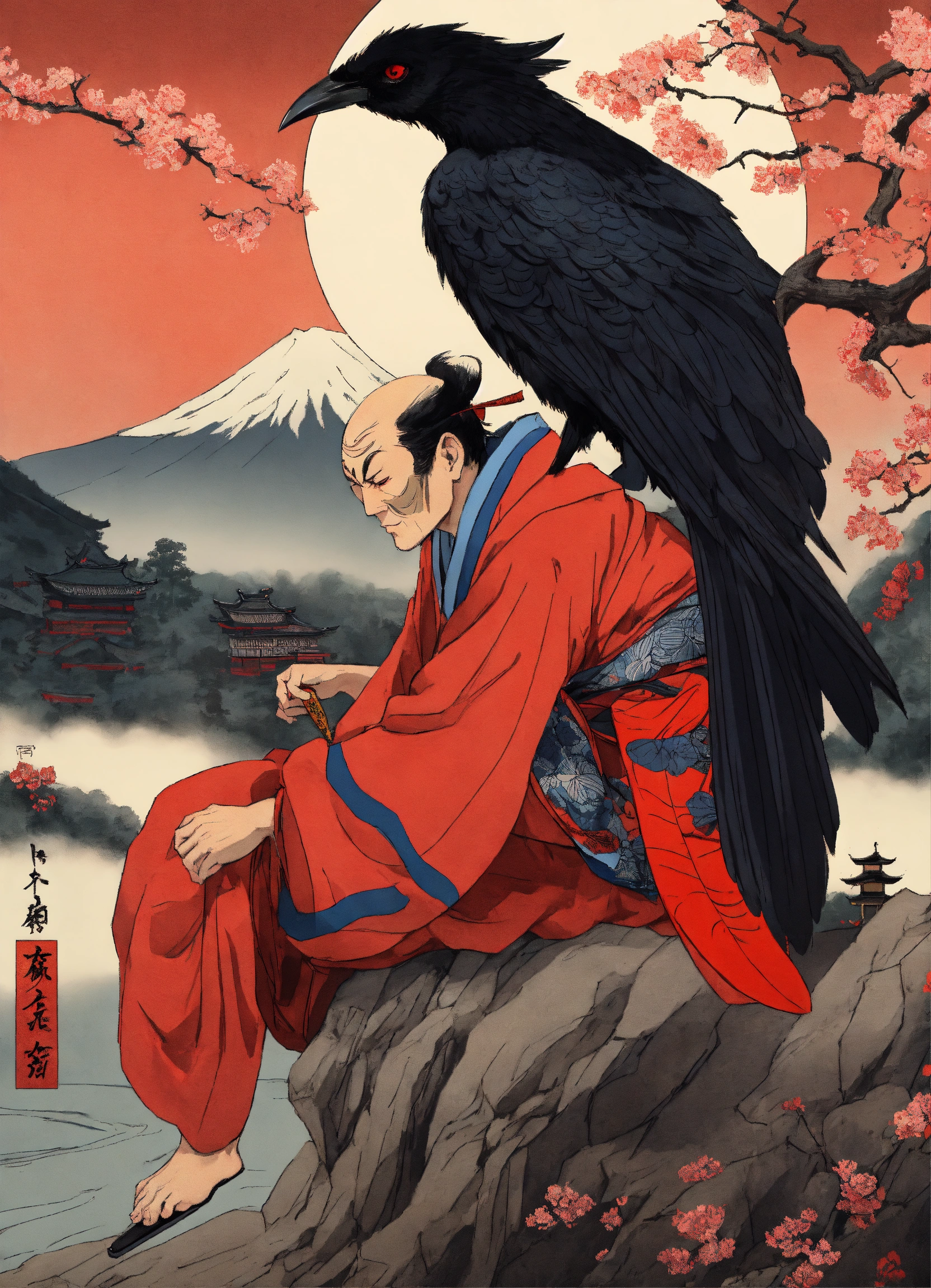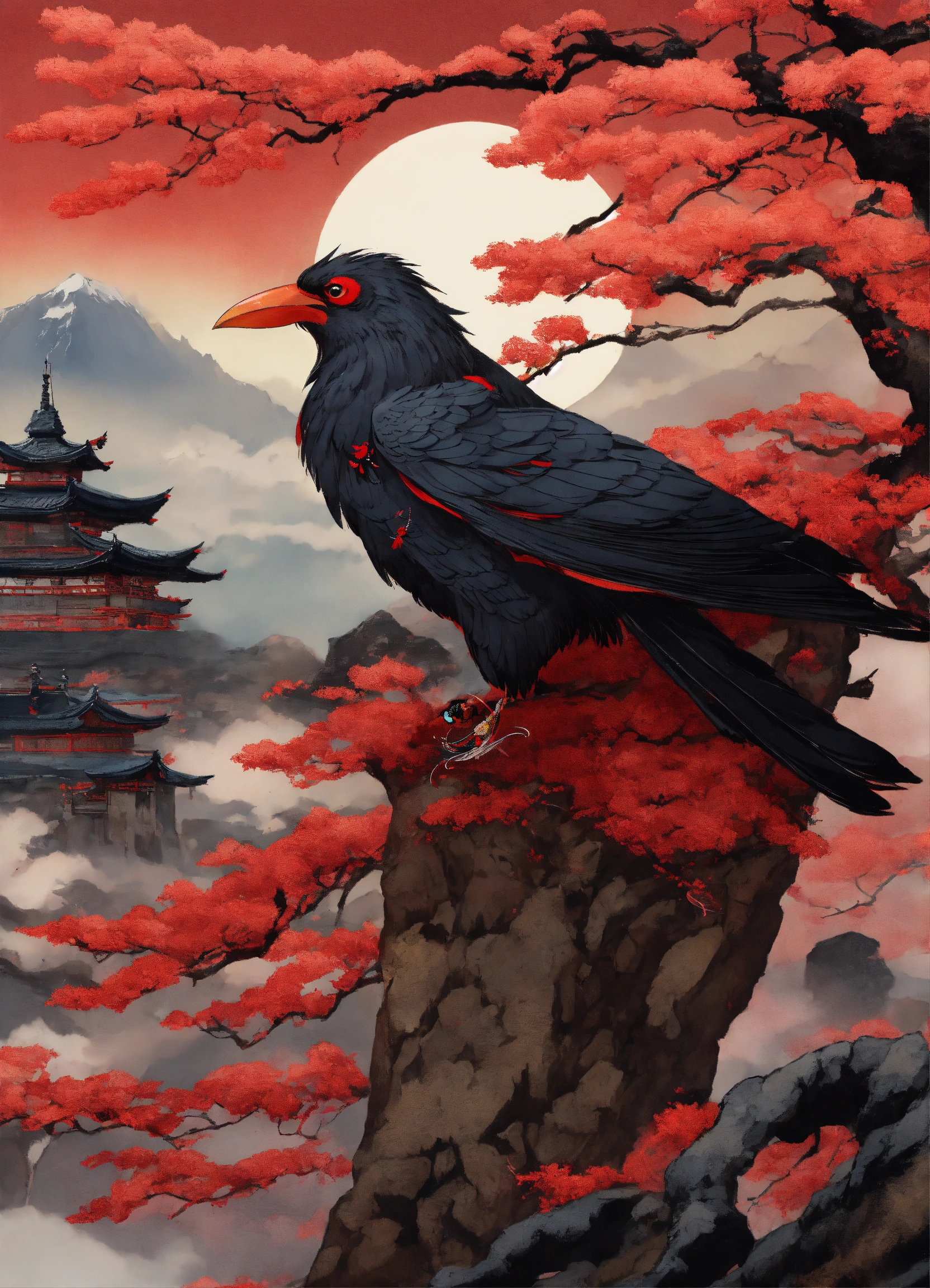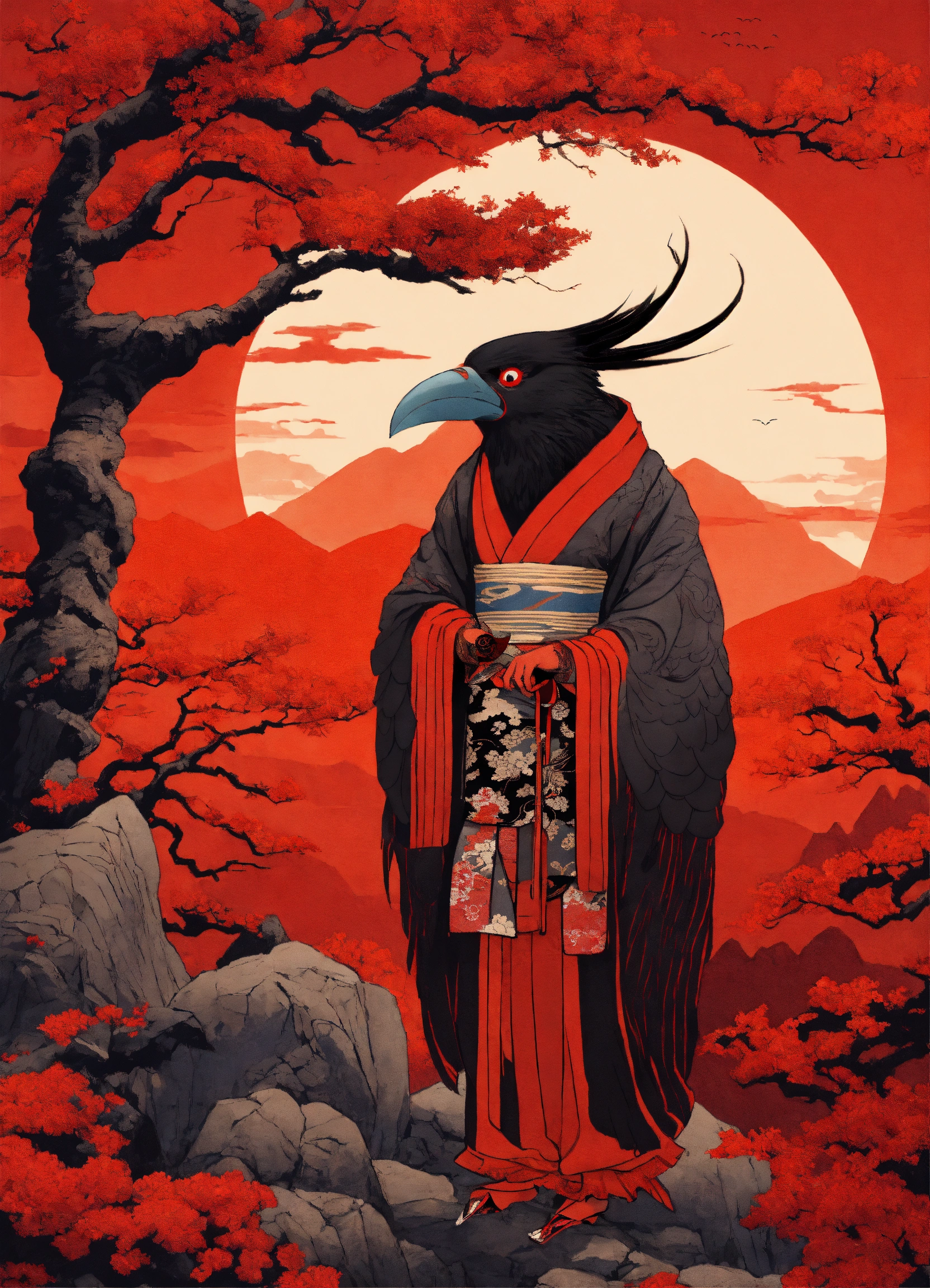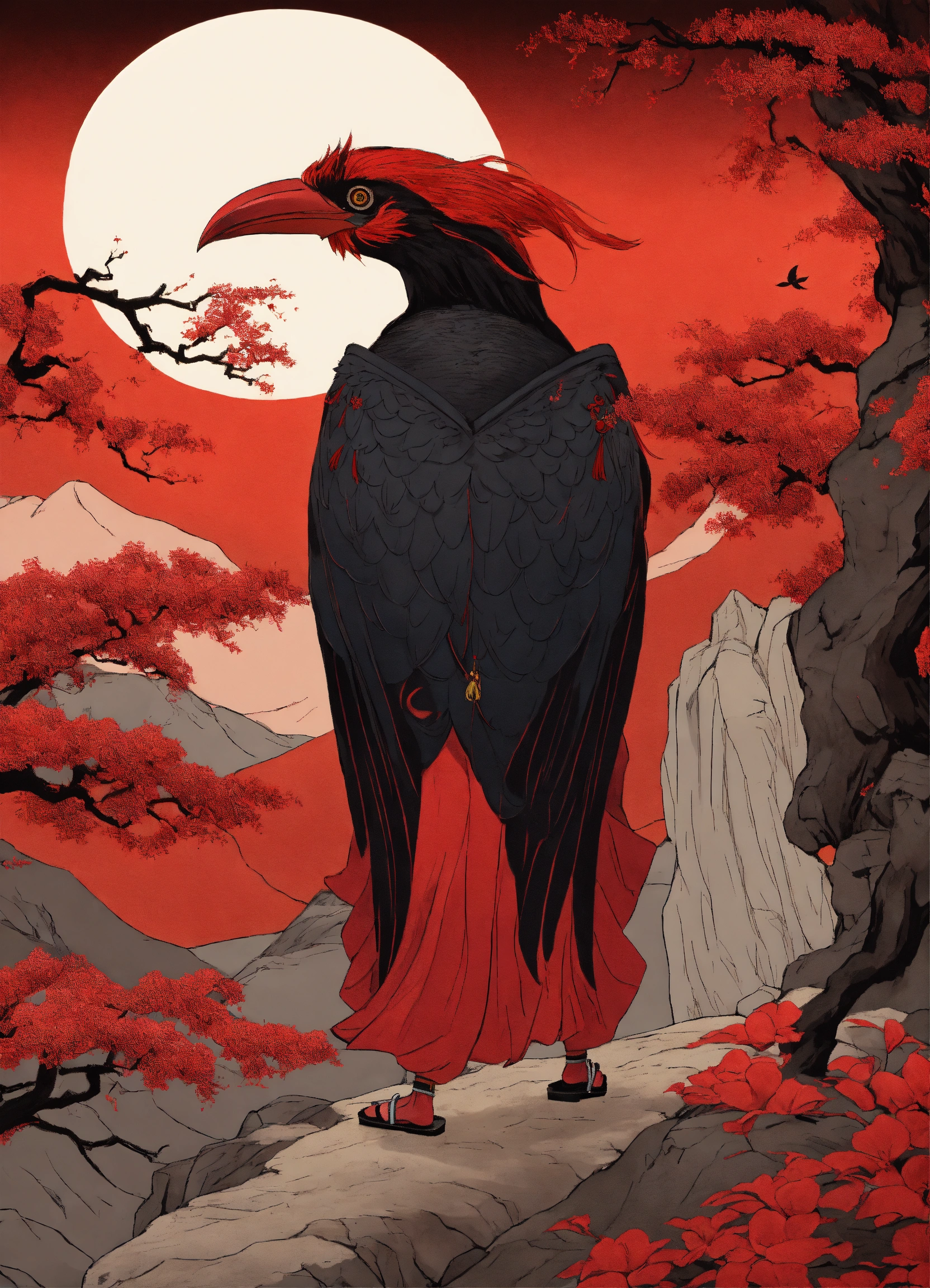 Tengu yokai un long nez rouge et des ailes noir de corbeau qui sort du dos, visage de gobelin rouge ecarlate avec un kimono noir et des geta a ses pieds mystérieux avec paysage de la montagne