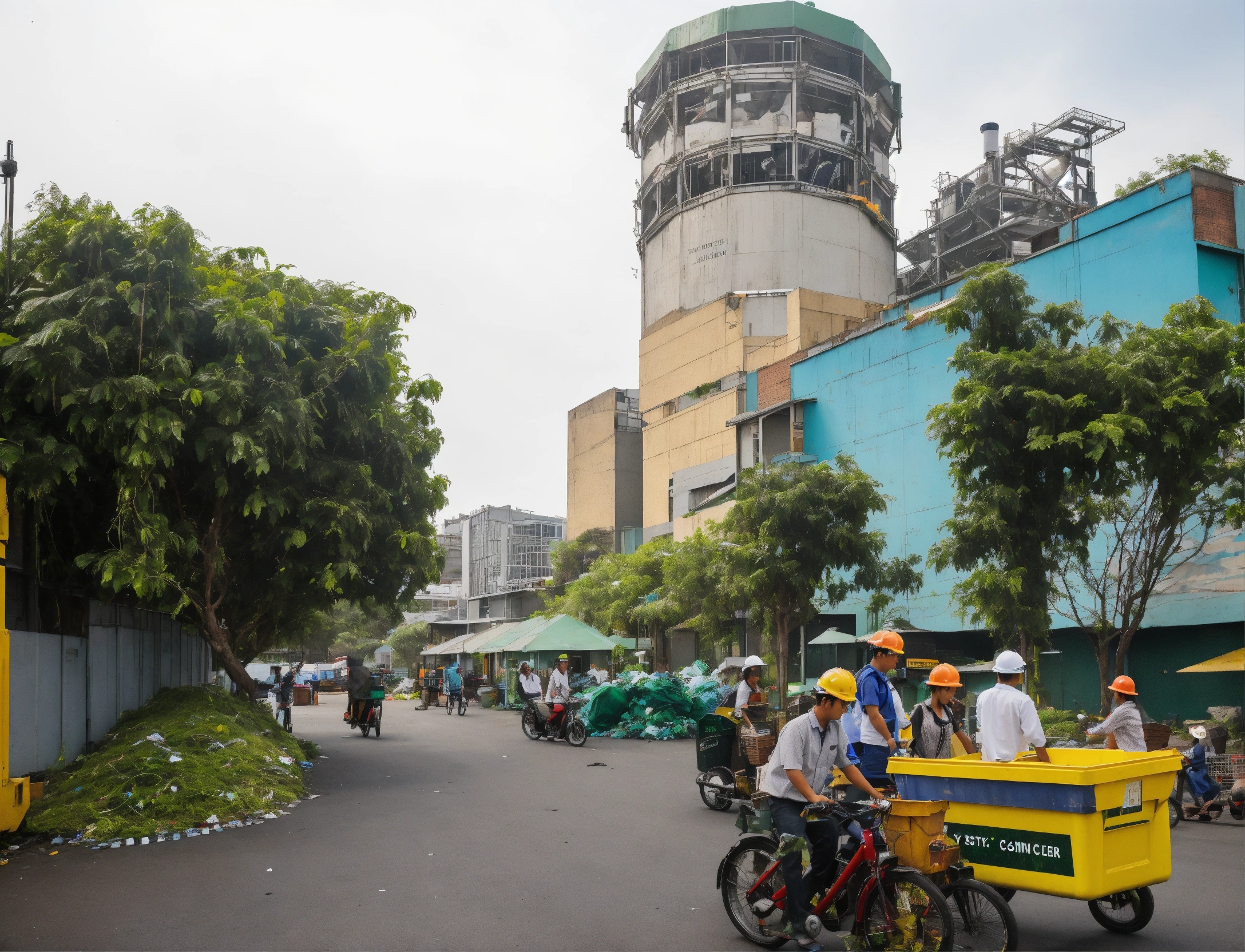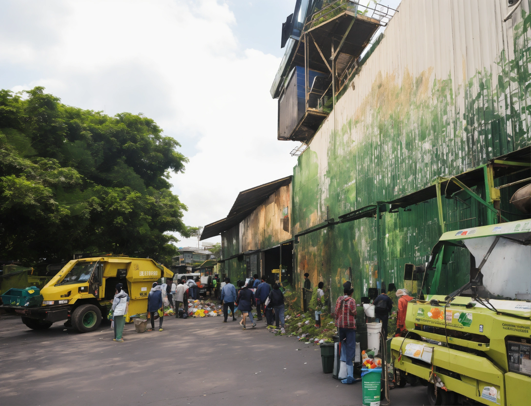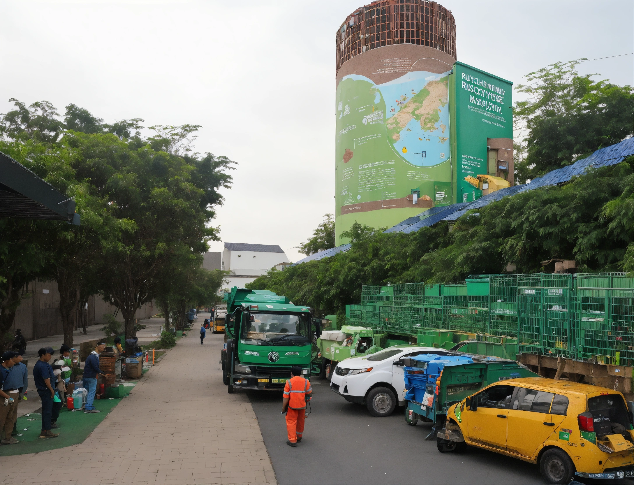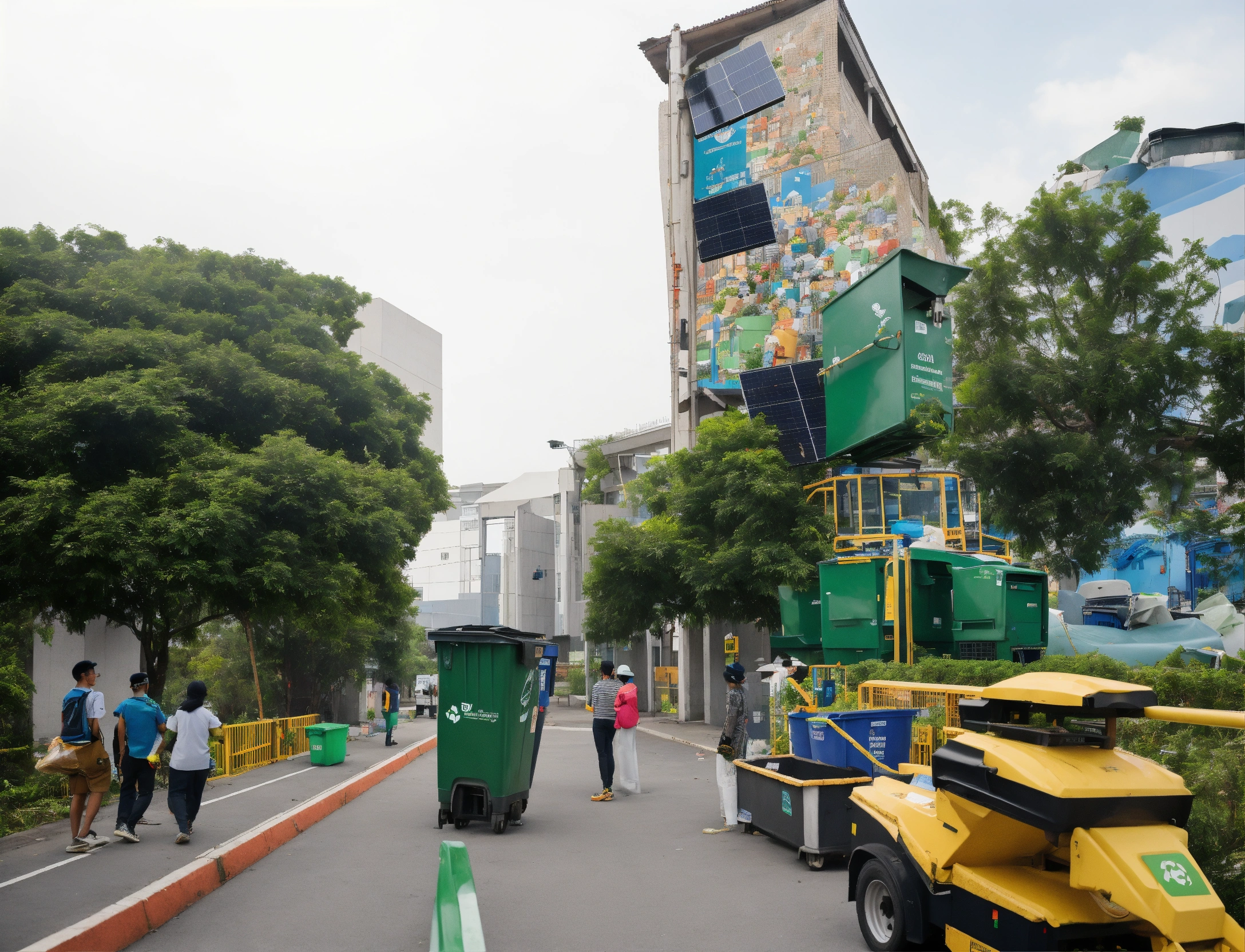 "create an illustration of surabaya's advanced waste management system, where sustainability meets technology. picture a state-of-the-art recycling facility that stands at the edge of the city, with solar panels on its roof and green spaces around it. the facility is bustling with activity, as eco-friendly garbage trucks deliver sorted waste. residents participate in a city-wide composting program, with community compost bins available in every neighborhood. public spaces are equipped with smart waste bins that automatically separate recyclables from non-recyclables and compact the waste to reduce volume. the rivers are clean, with floating barriers to catch debris before it can affect marine life. murals on the walls of the recycling center depict the city's commitment to reducing landfill waste, and educational kiosks provide information on how to live a zero-waste lifestyle.