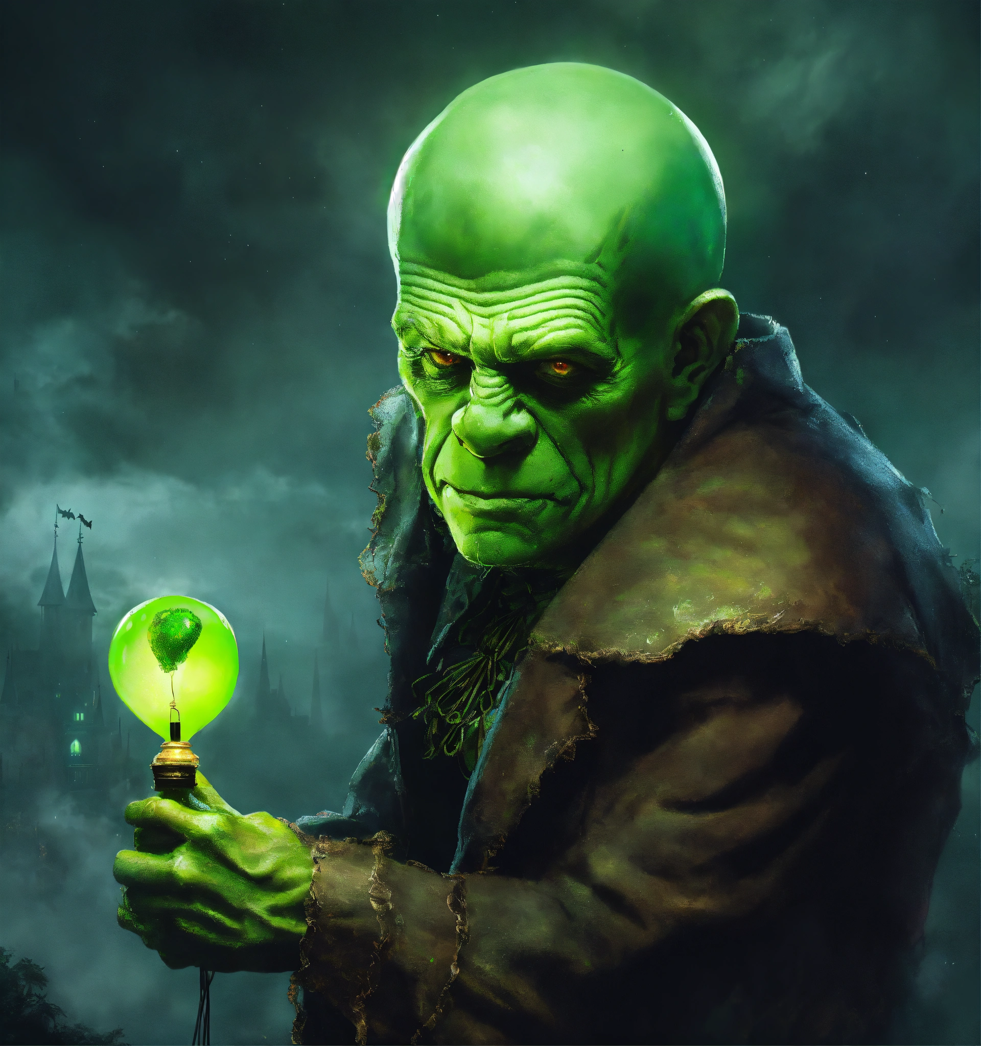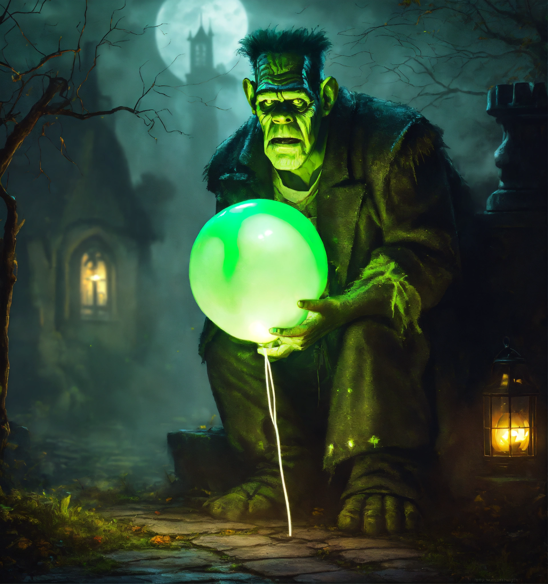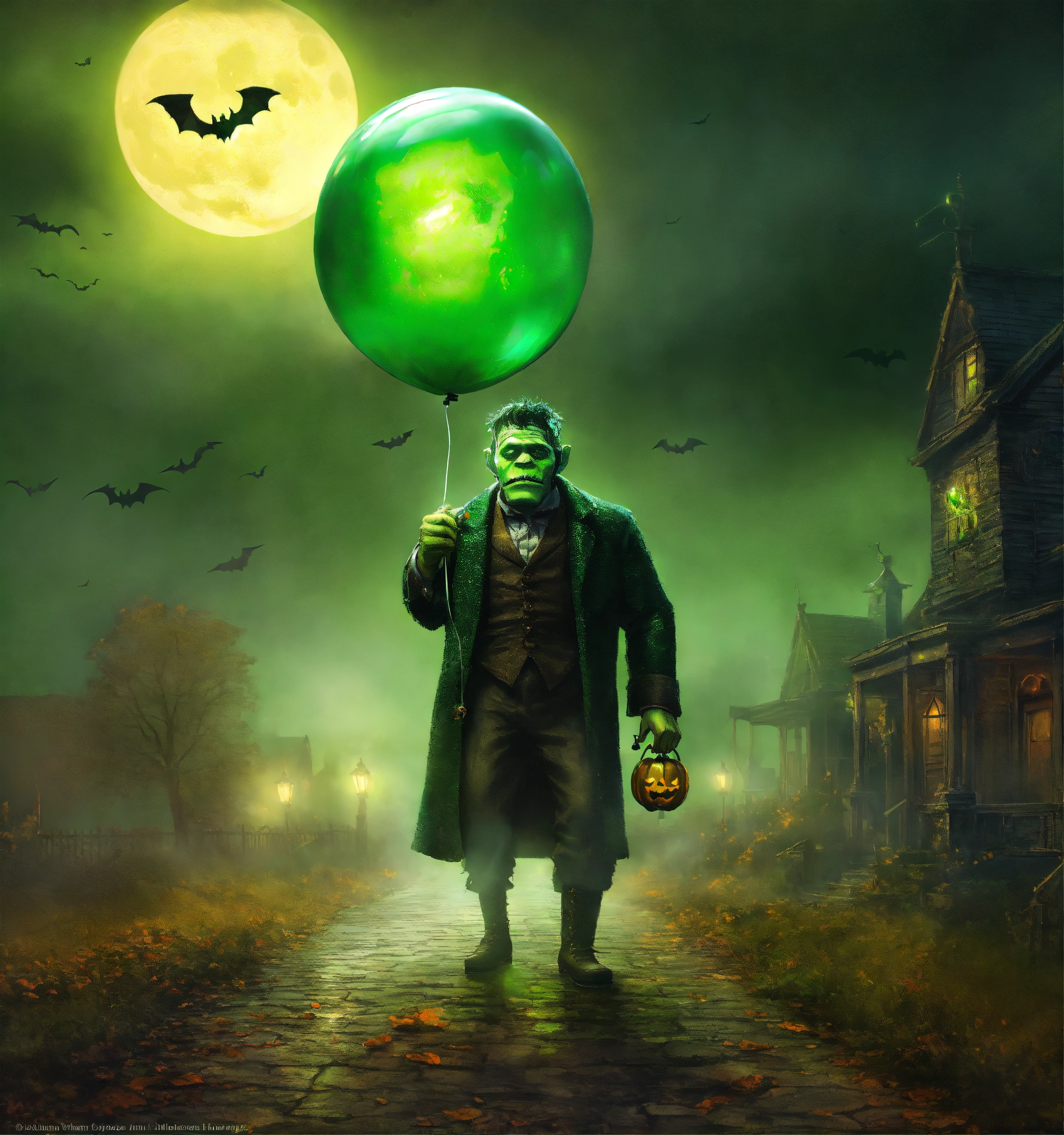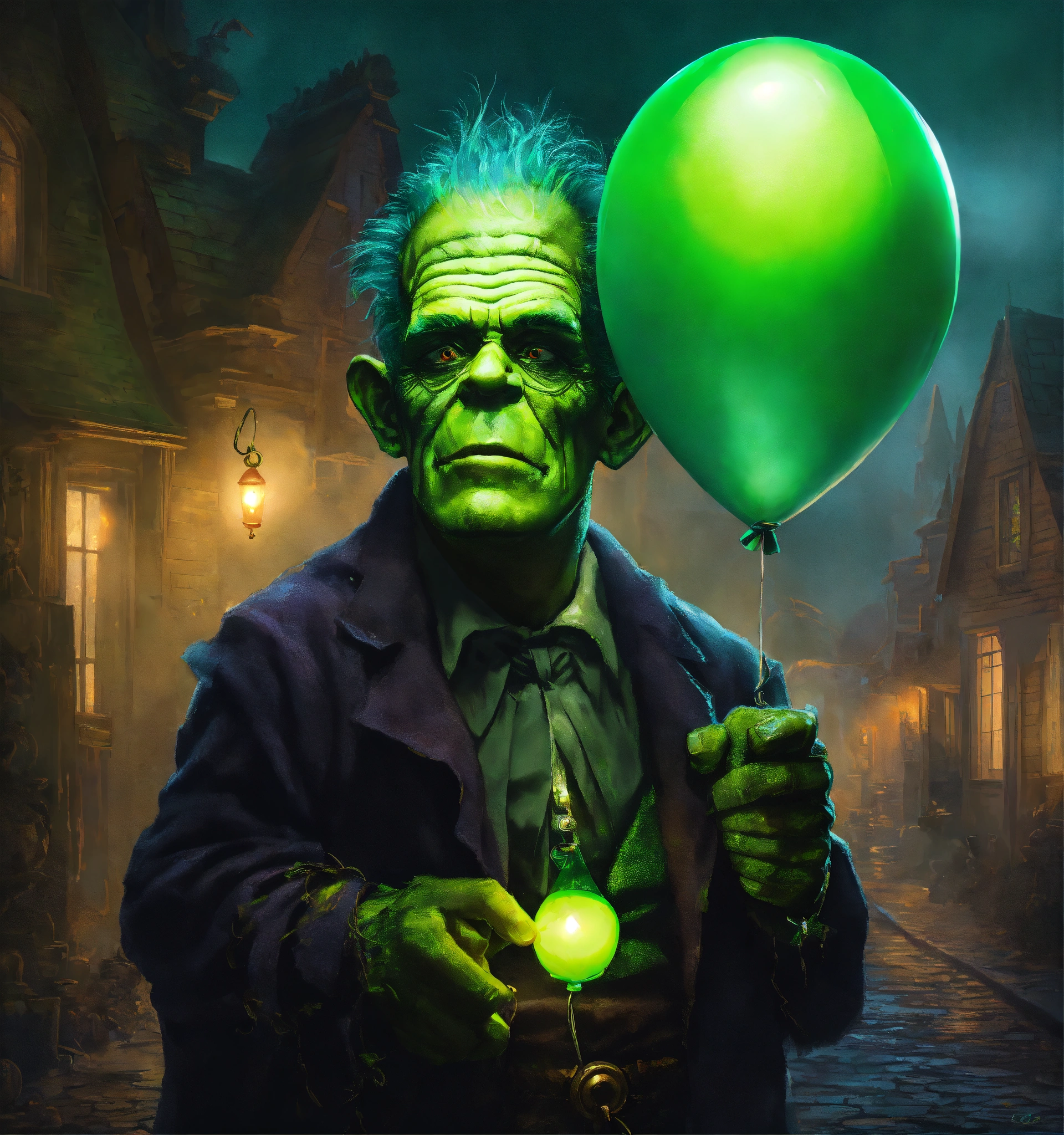 A very ugly frankenstein holding a green luminous balloon, halloween spooky fantasy, hyperdetailed, mist, thomas kinkade style