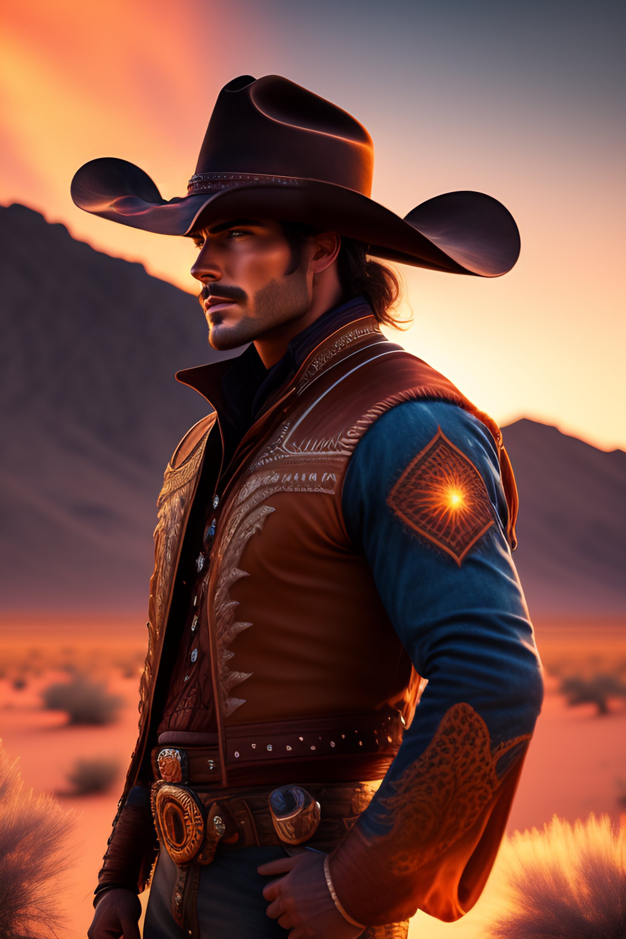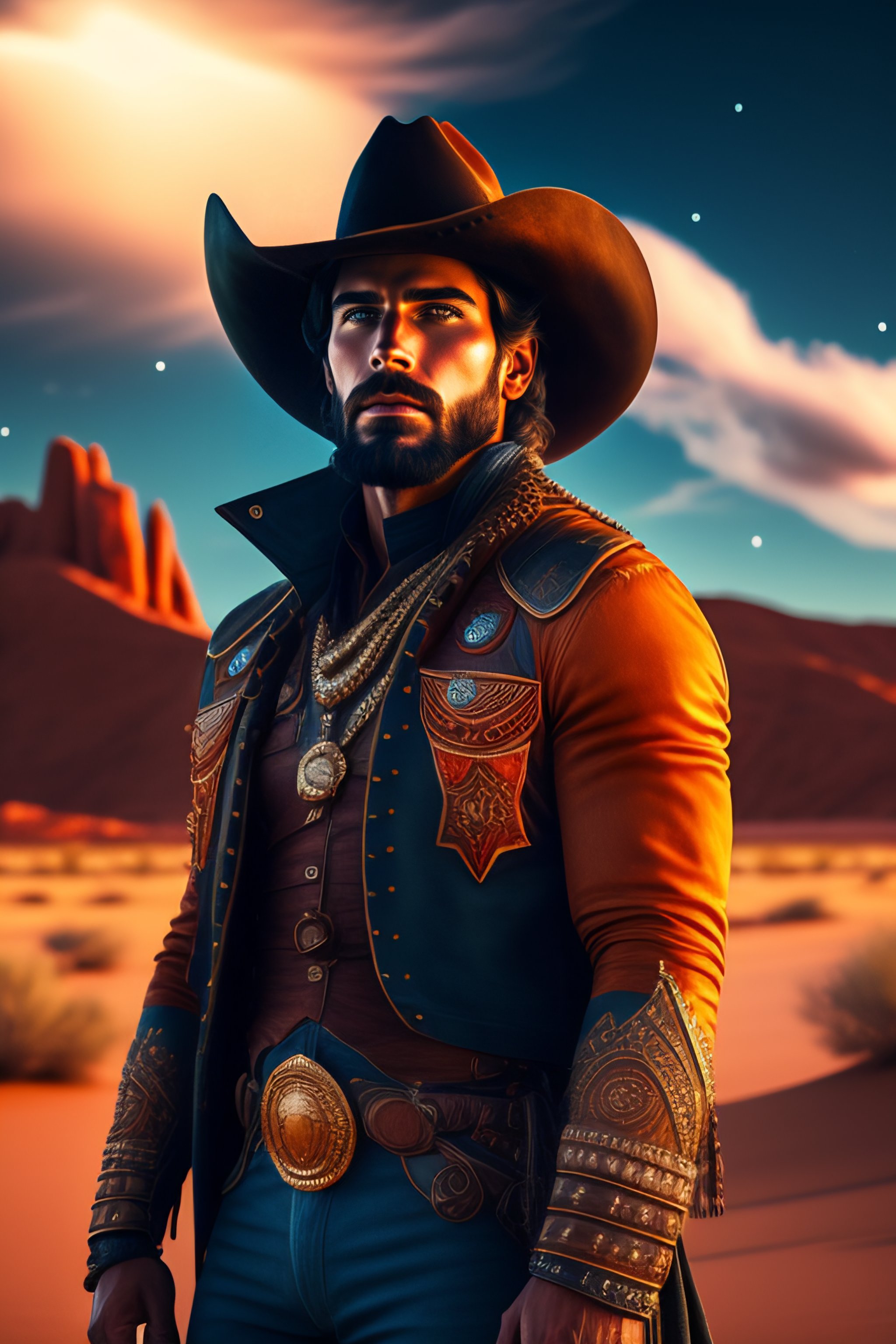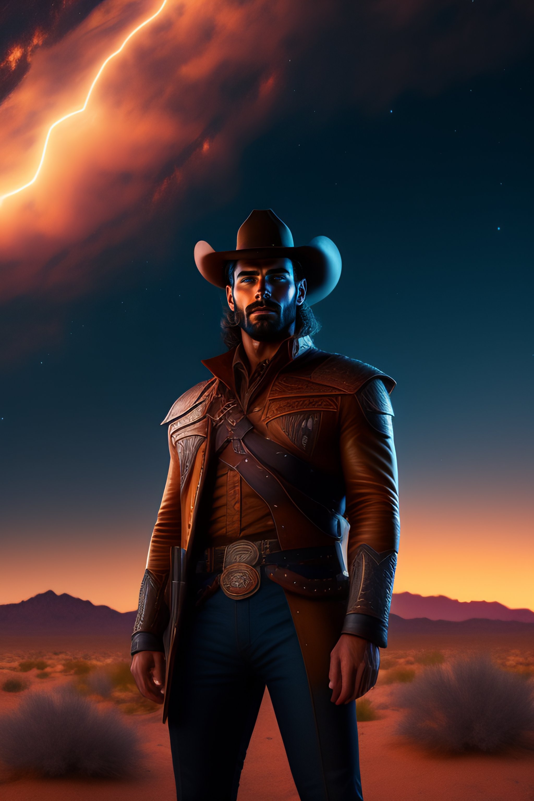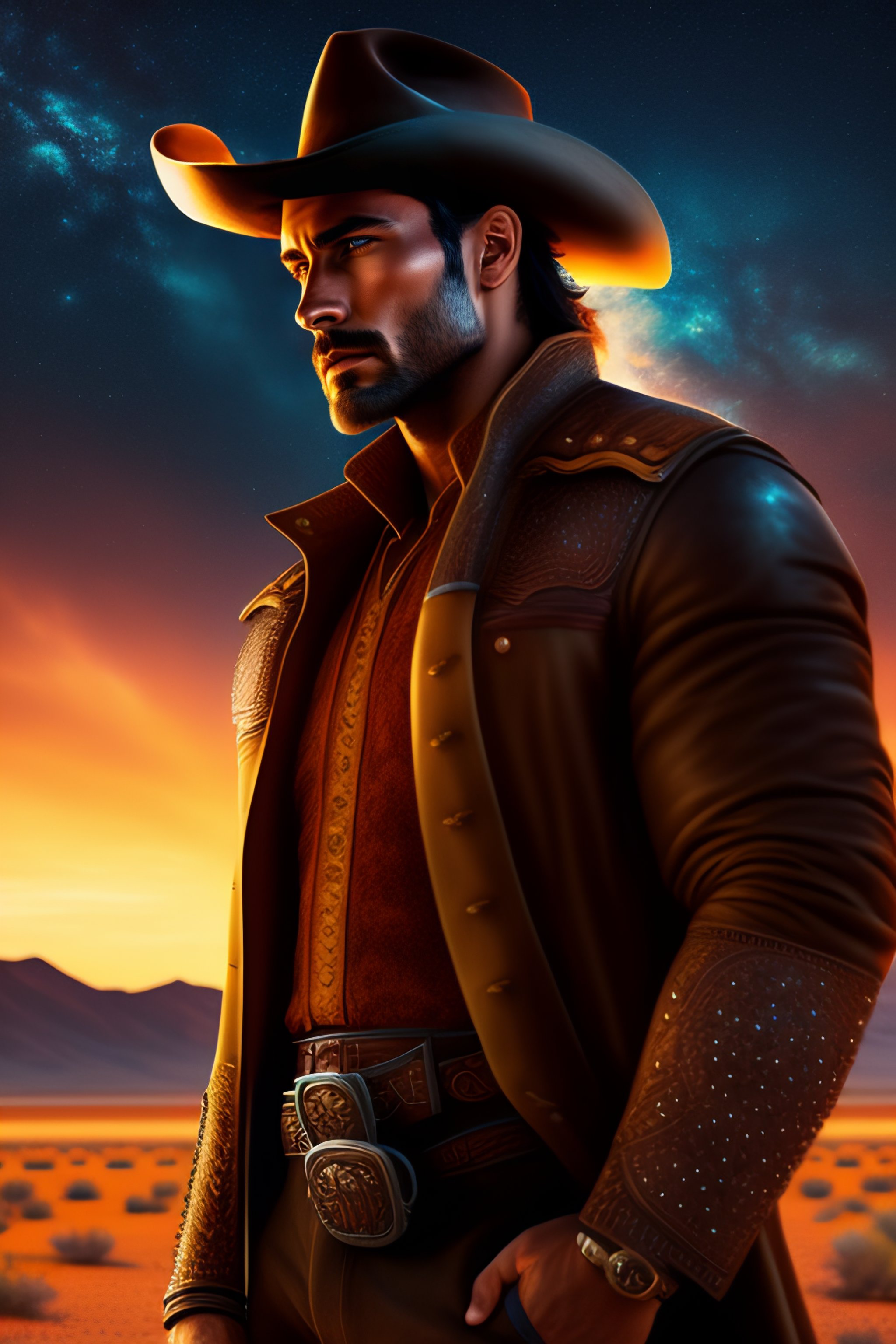 Full body portrait of a handsome rugged cowboy, desert mountains background, gorgeous night sky, hyperdetailed, cinematic lightning, intricate detail, deep complementary colors, 8k resolution trending on artstation, facial symmetry