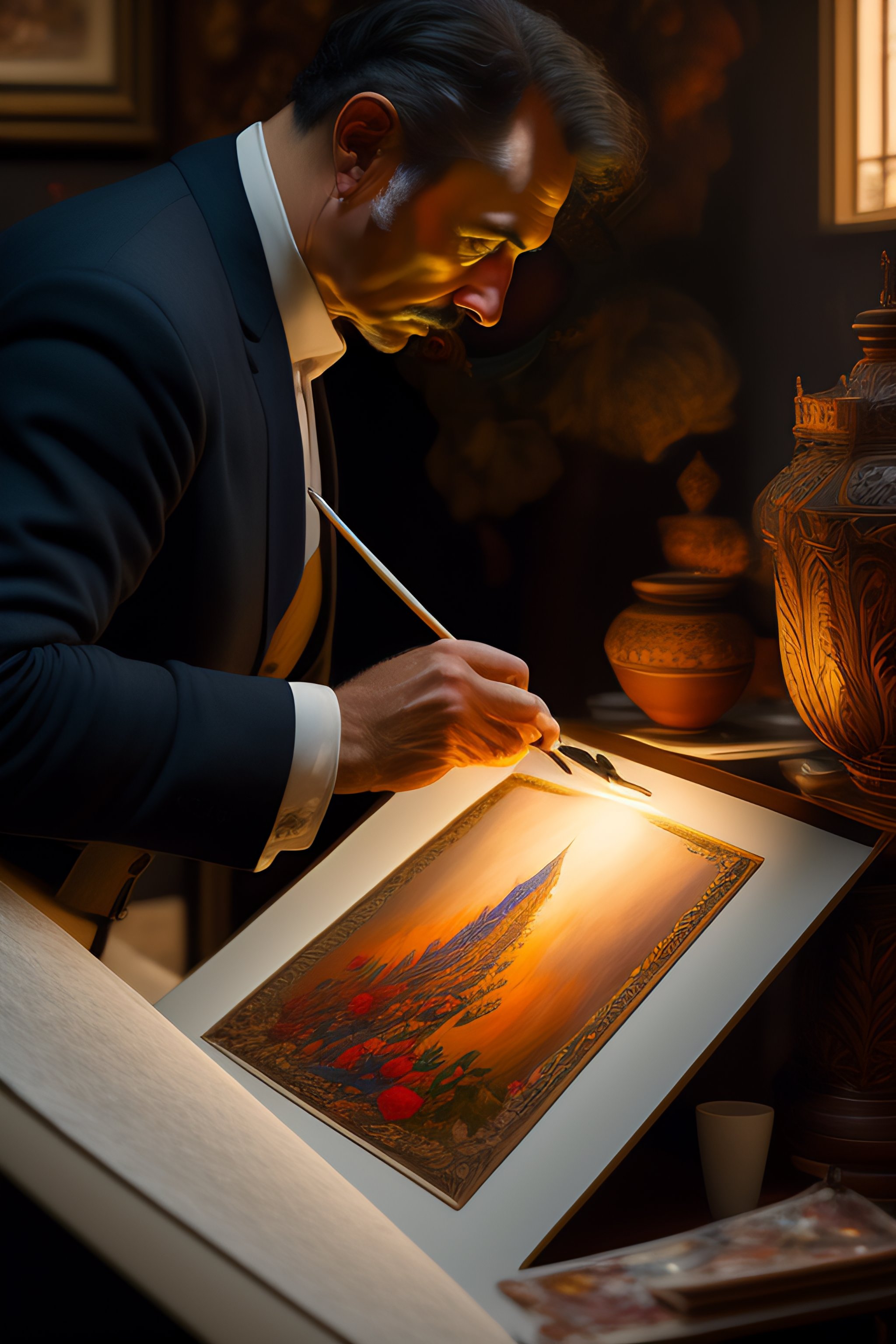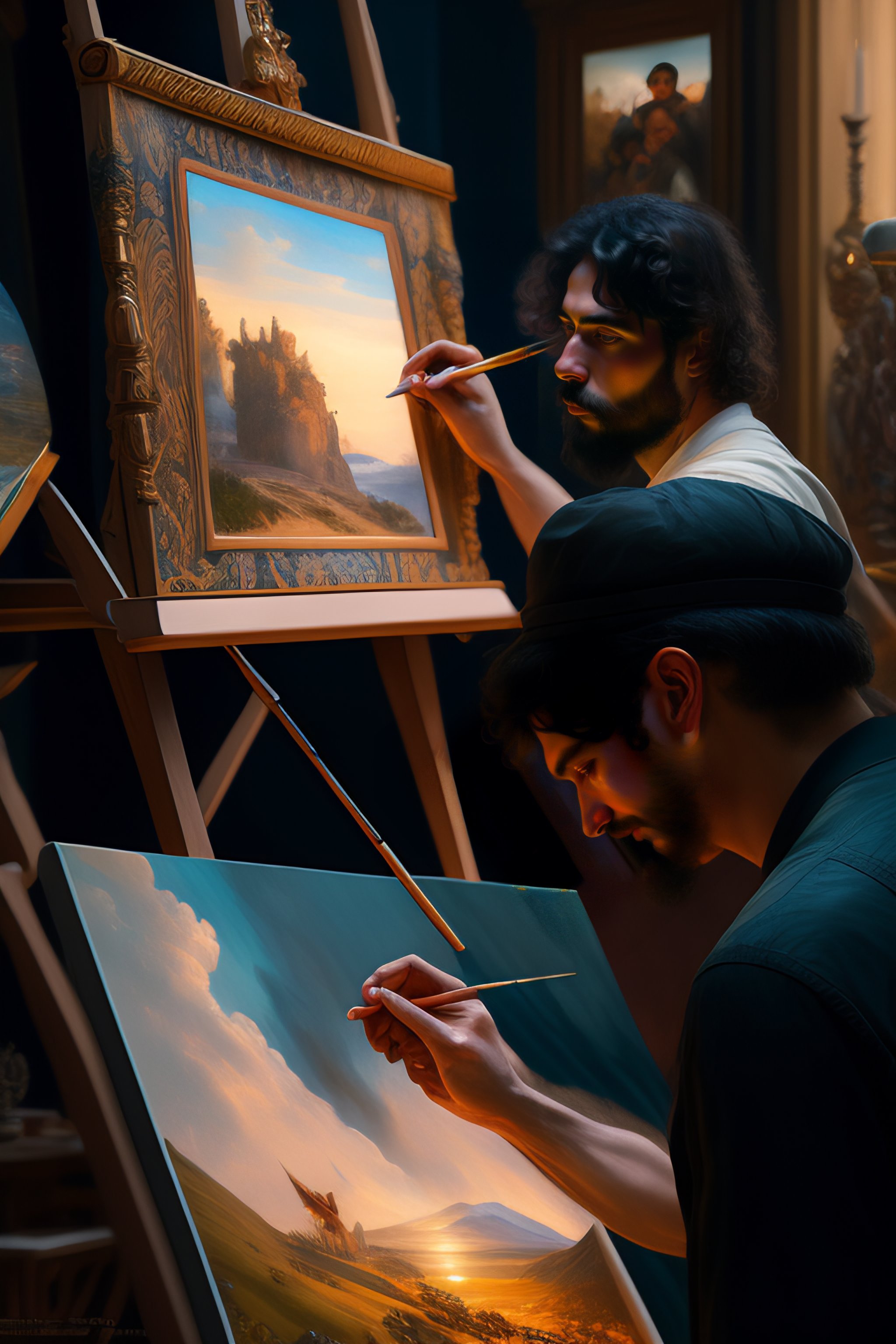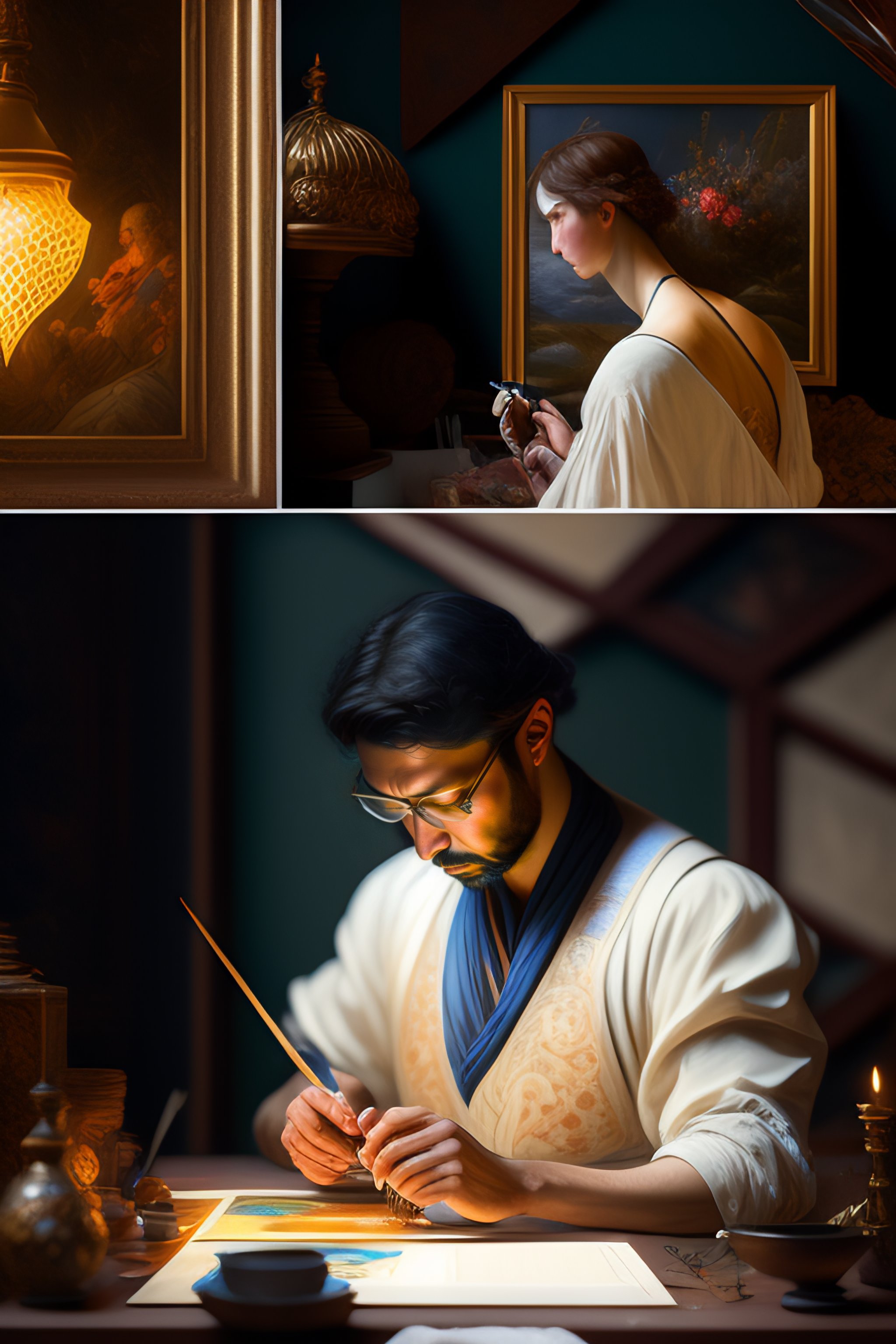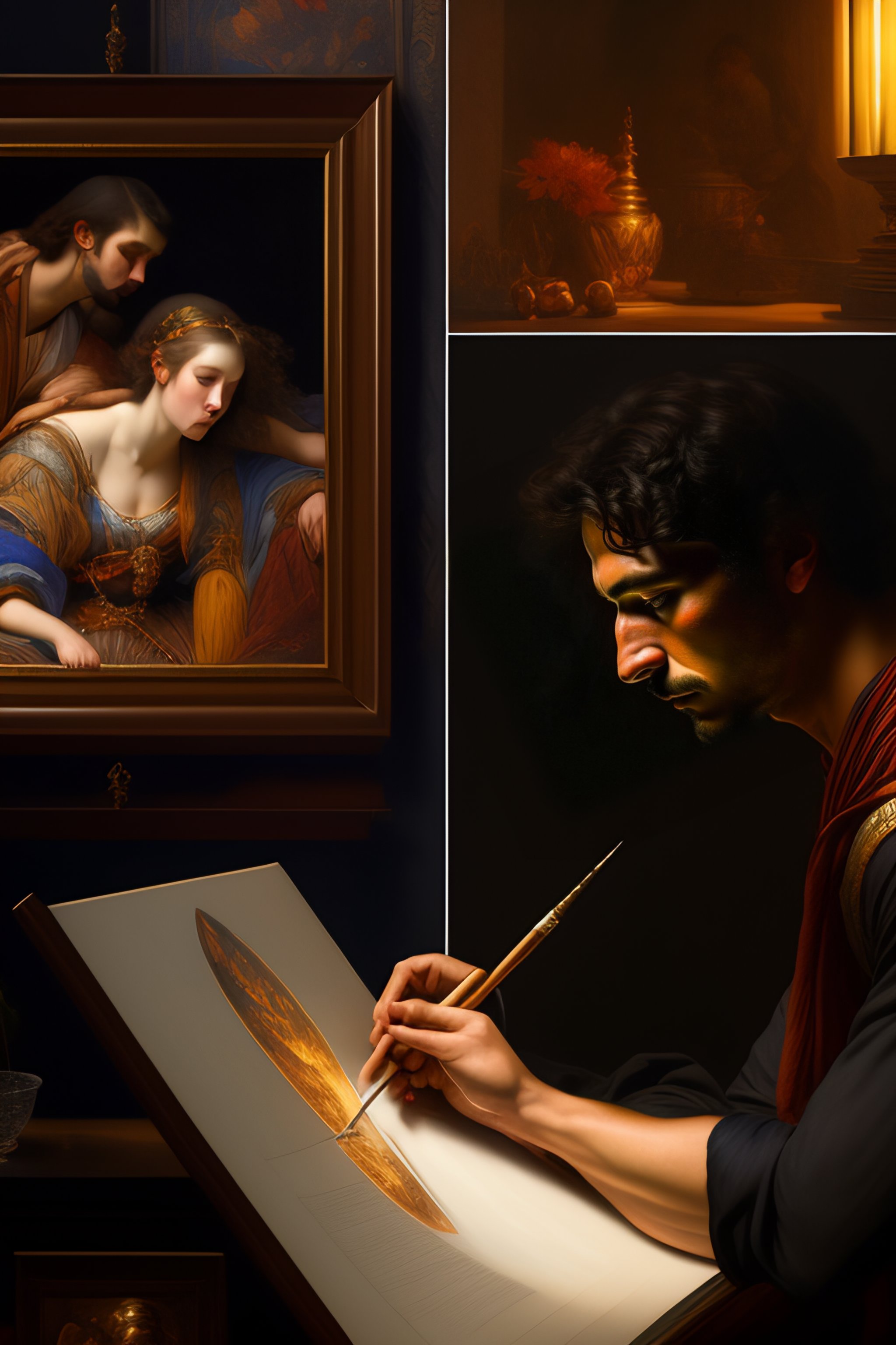 An artist in his studio painting a collage, by edgar maxence and caravaggio and michael whelan and delacroix style, artistic, intricate drawing, cinematic lighting, hyper realistic, extremely detailed, establishing shot, 8 k resolution, dramatic lighting
