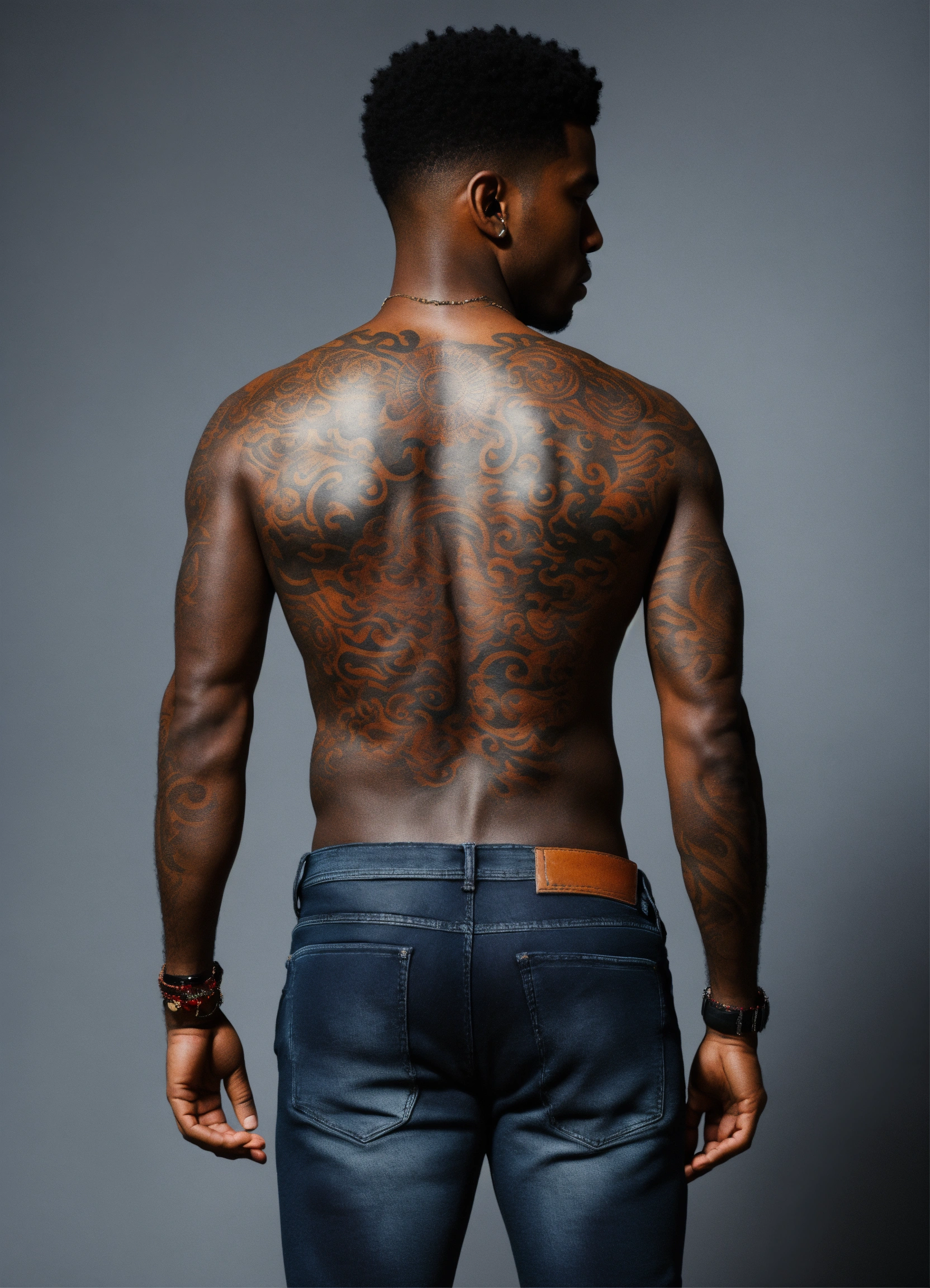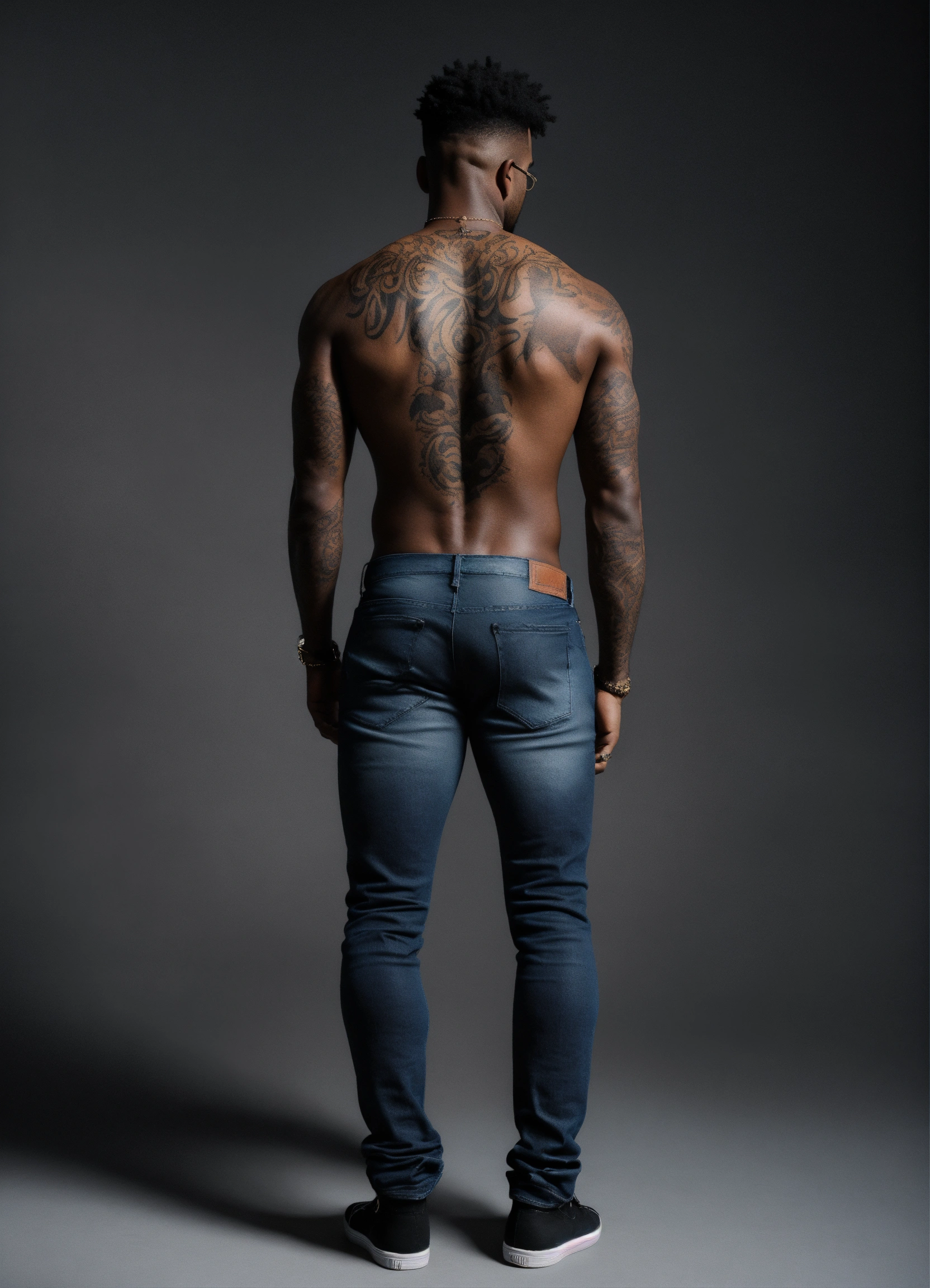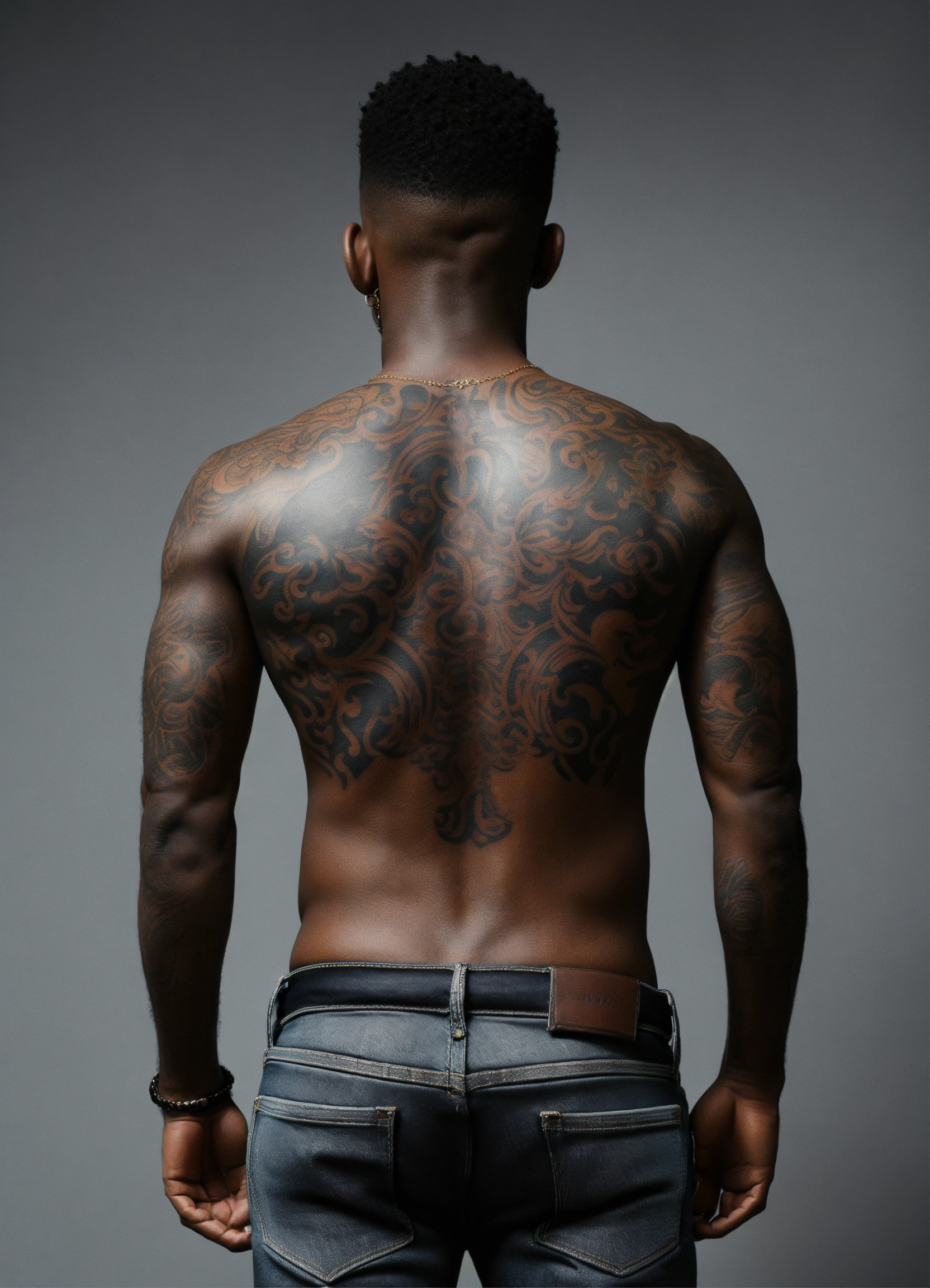 Black male, standing with back to the camera, tattoos on back, arms, dark jeans, black shoes, arms loose at sides, feet shoulder width apart, gray background