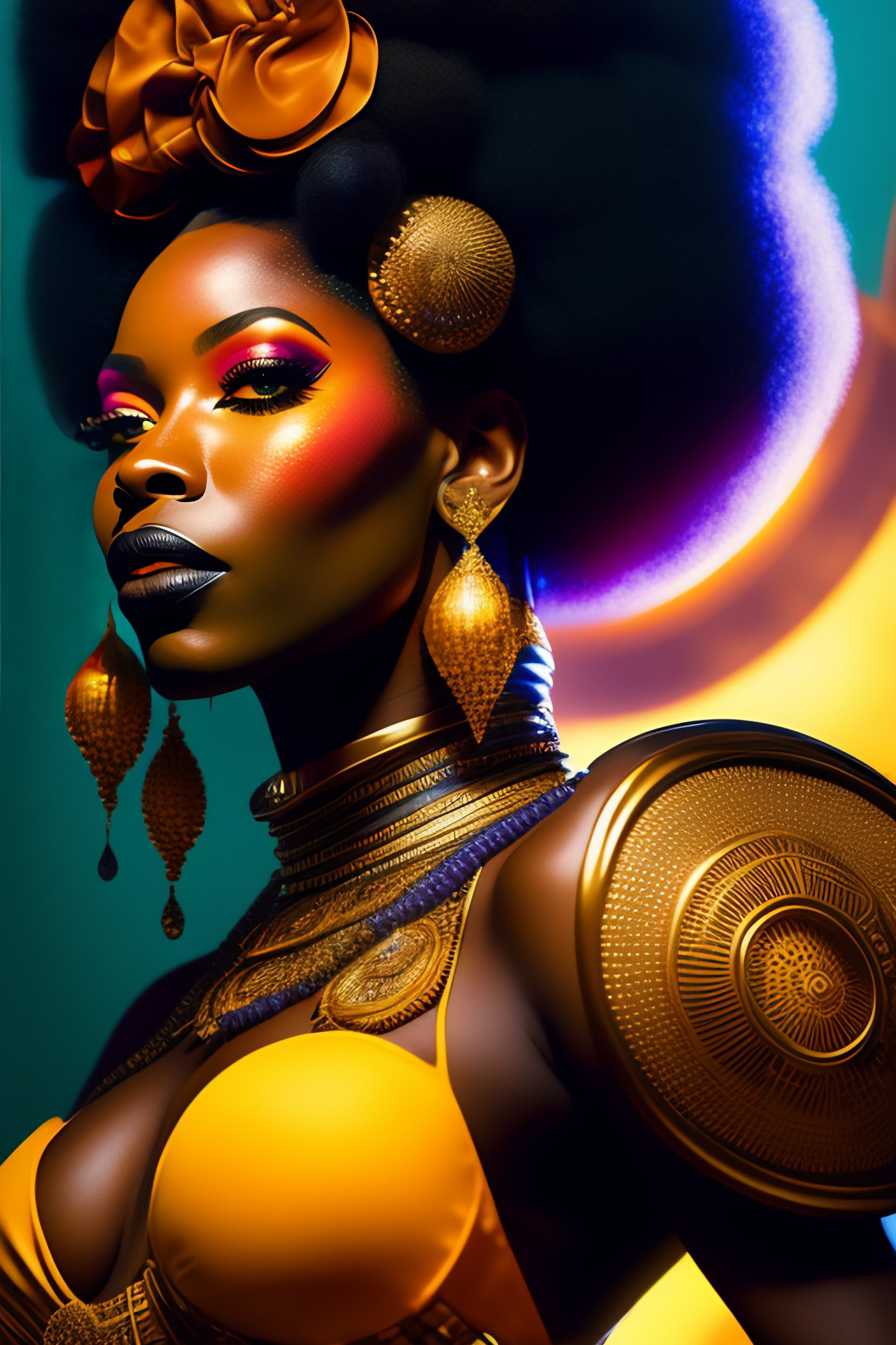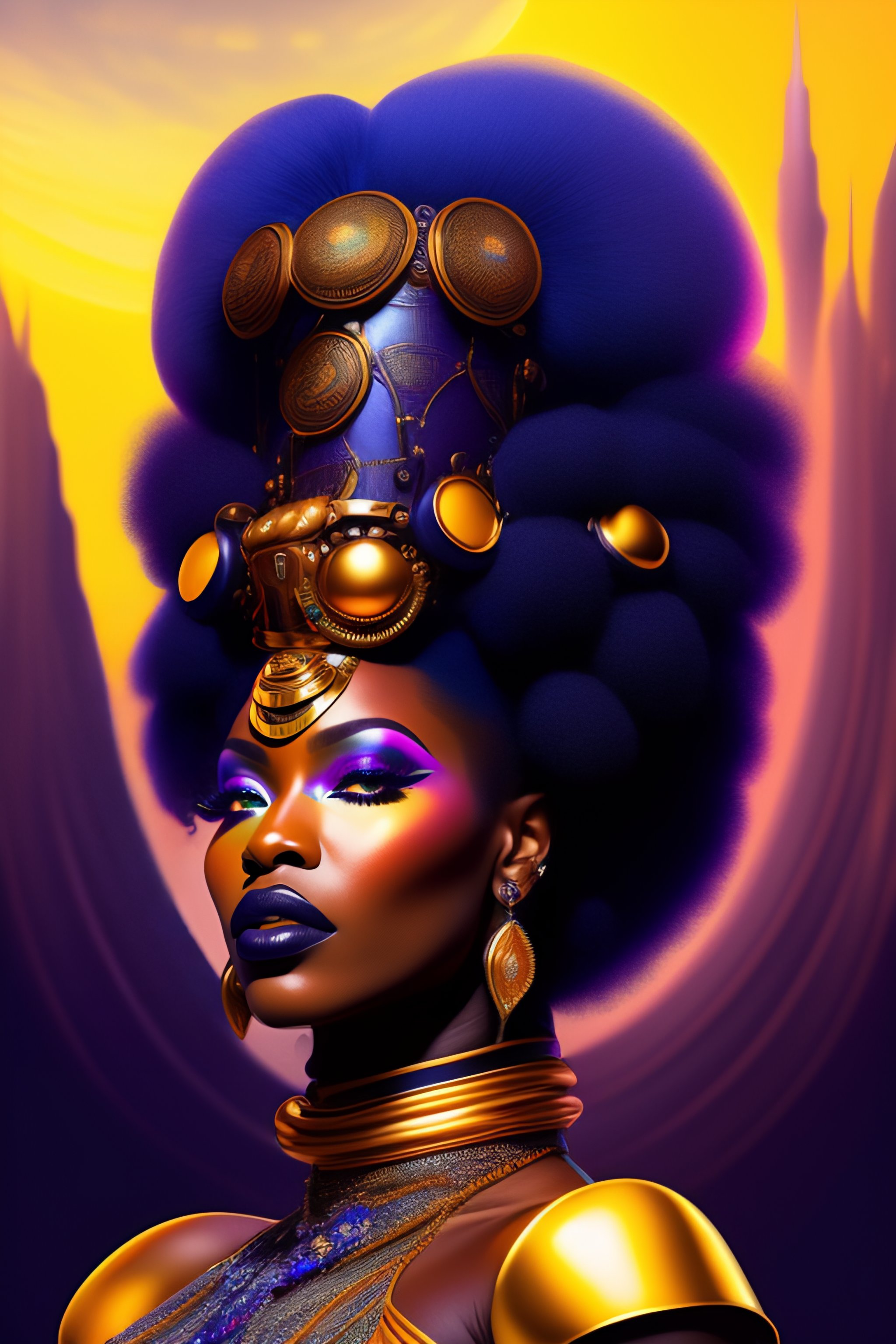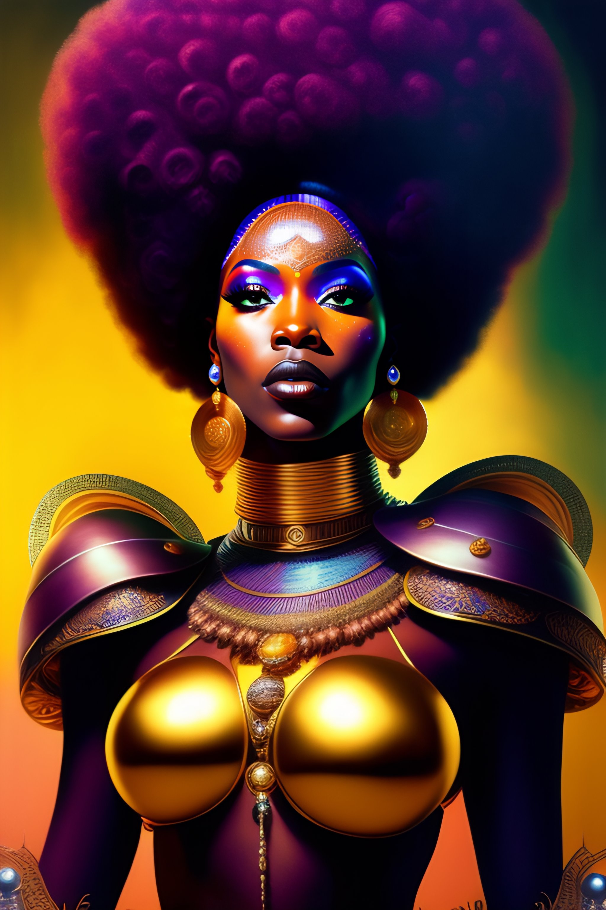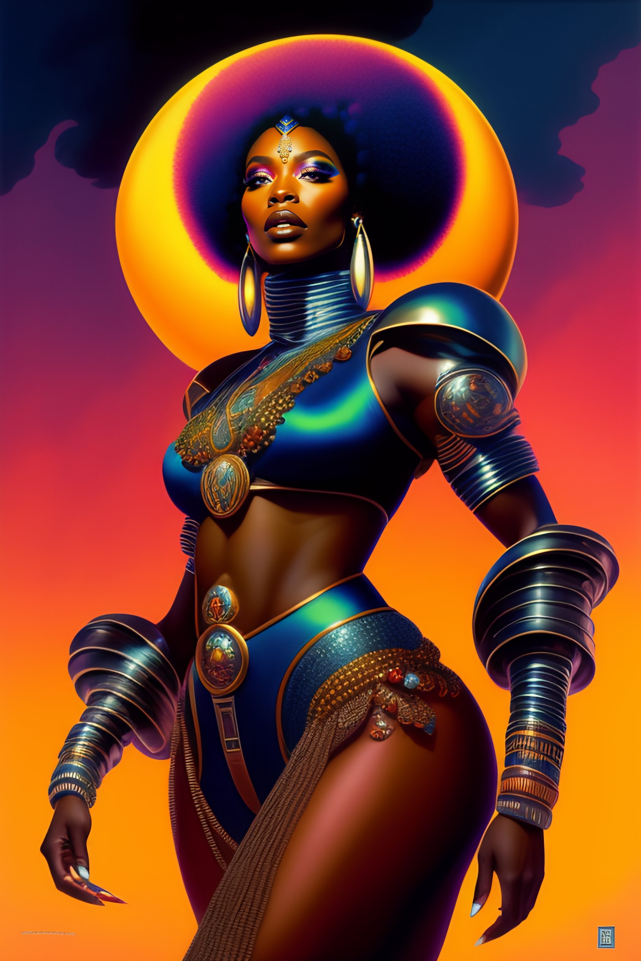 An afro-futurist african cyborg chanteuse performs in a futuristic 1970s funk band, character portrait, portrait, close up, concept art, intricate details, highly detailed, ornate, soft light, vintage sci - fi poster, in the style of chris foss, rodger dean, moebius, michael whelan, and gustave dore