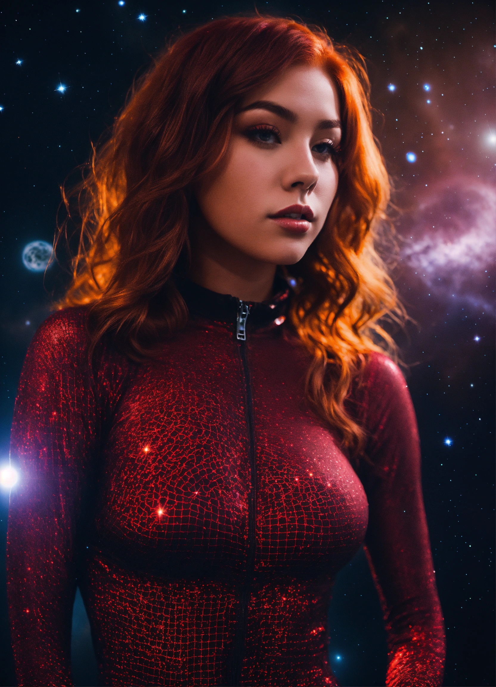 A real photo of a 23 year old girl with dark red hair, she is wearing a spandex fishnet catsuit, in the sky we see the galaxy