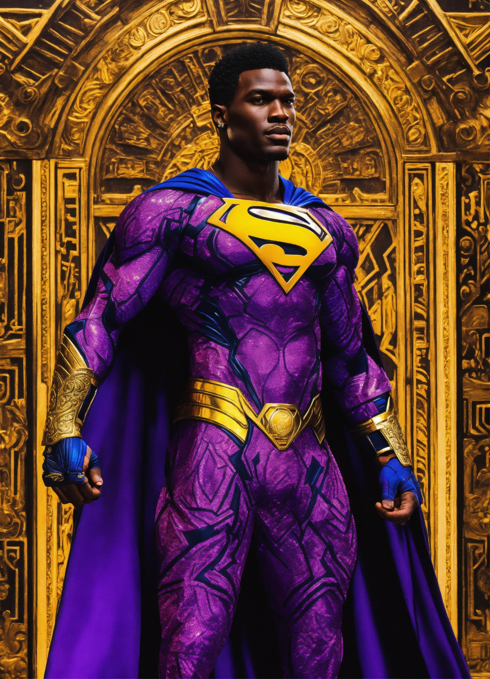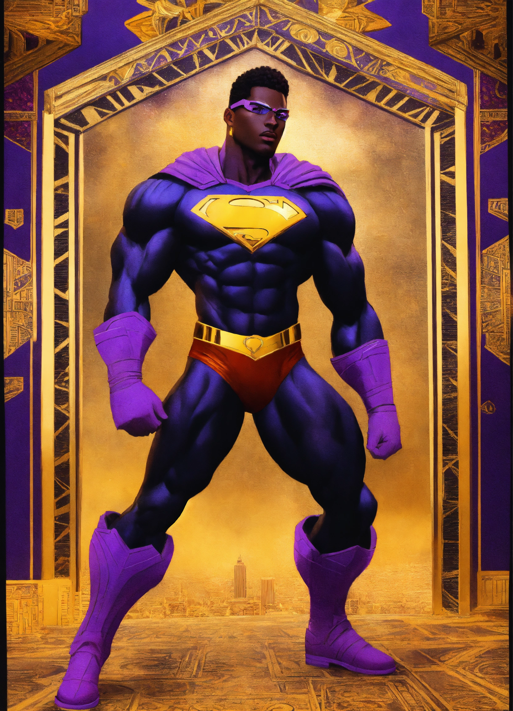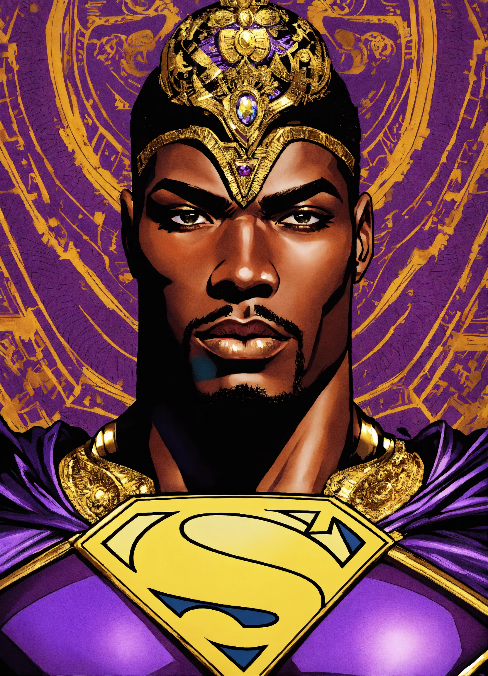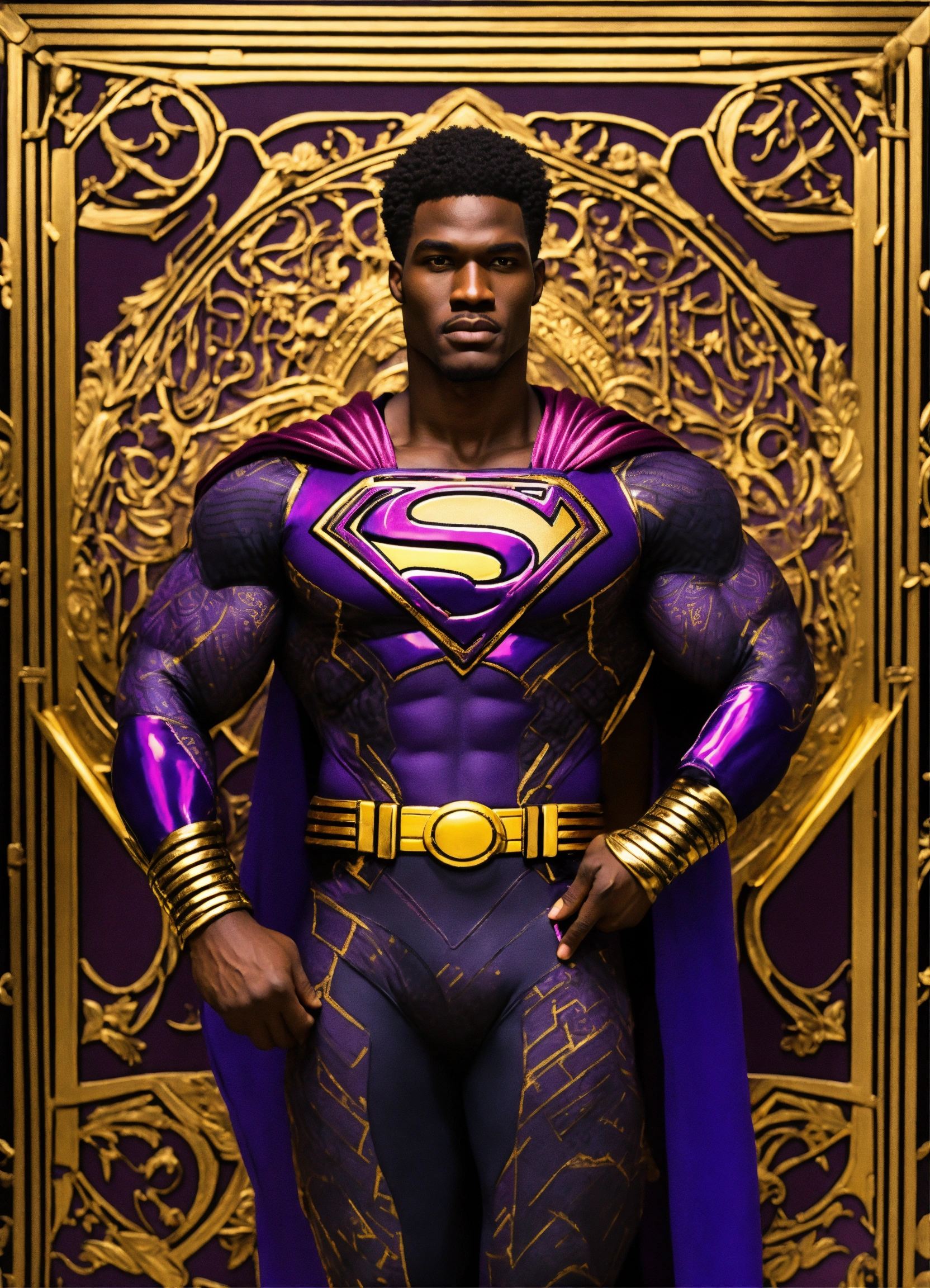 Ultra-detailed purple black & gold ornate super-advanced african superman