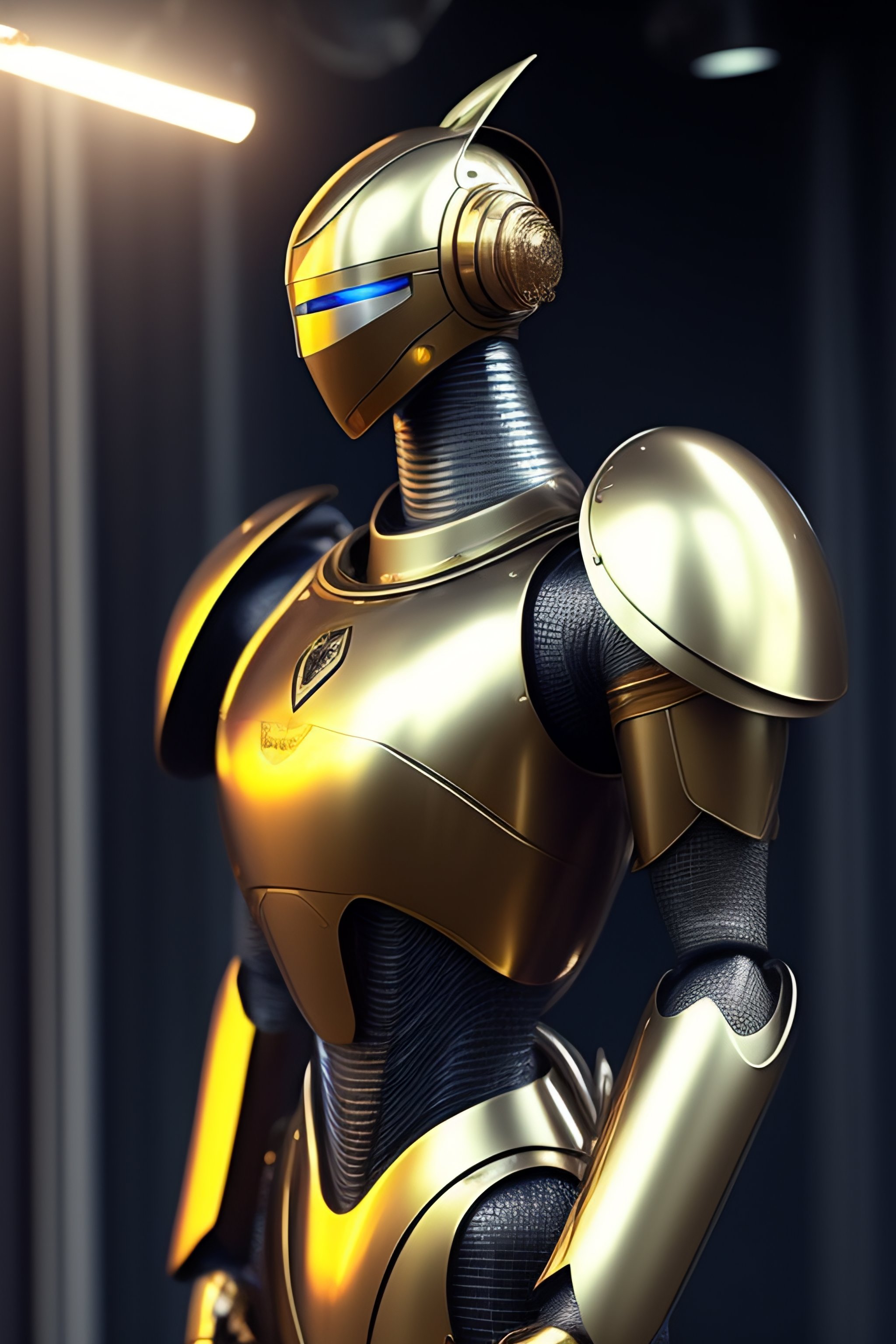 An male humanoid robot investigator with sleek, body off dull metal, with advanced technology and mechanical features, retractable tools, and a machet for fight, all of which give them a highly advanced and otherworldly appearance in the fantasy setting.