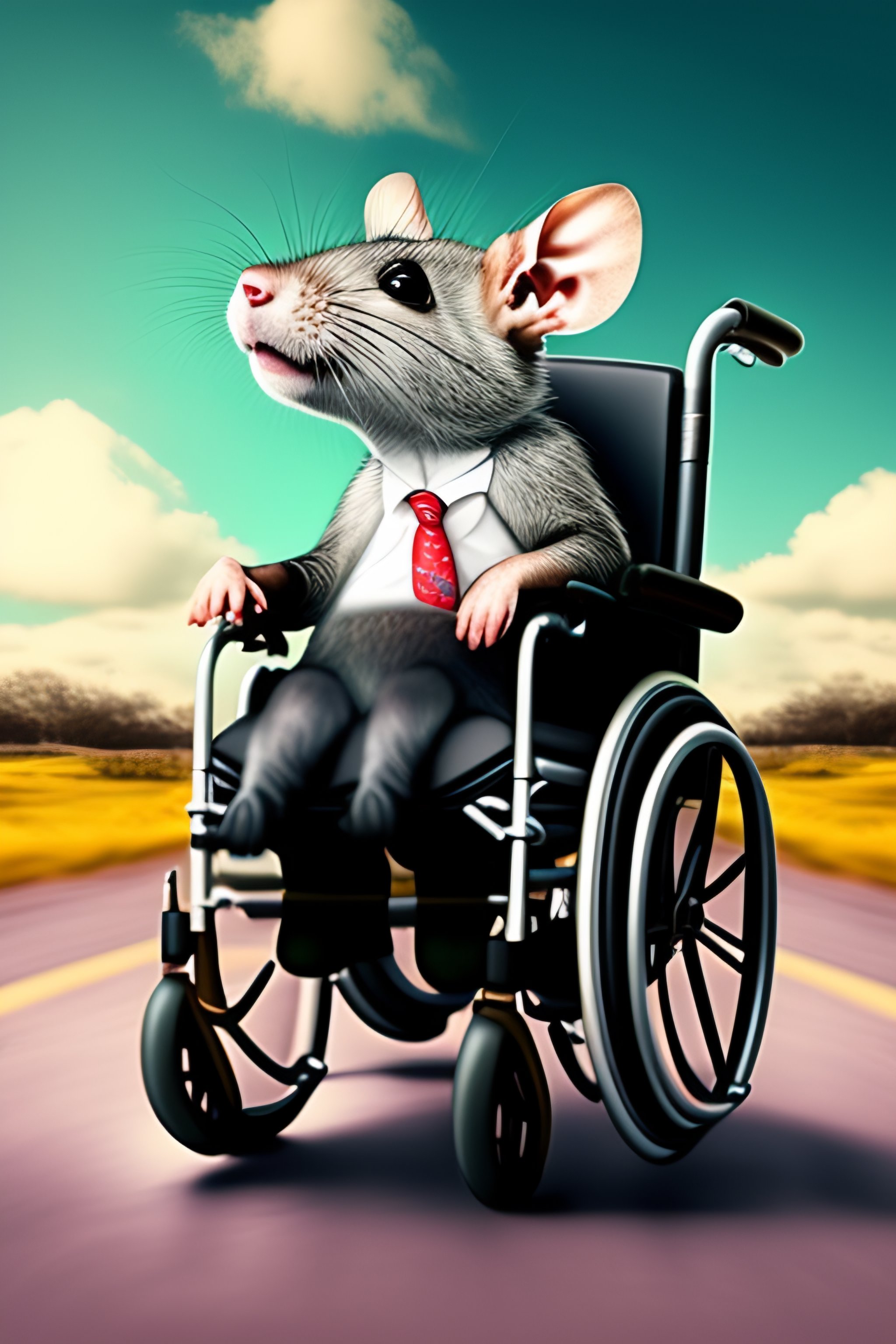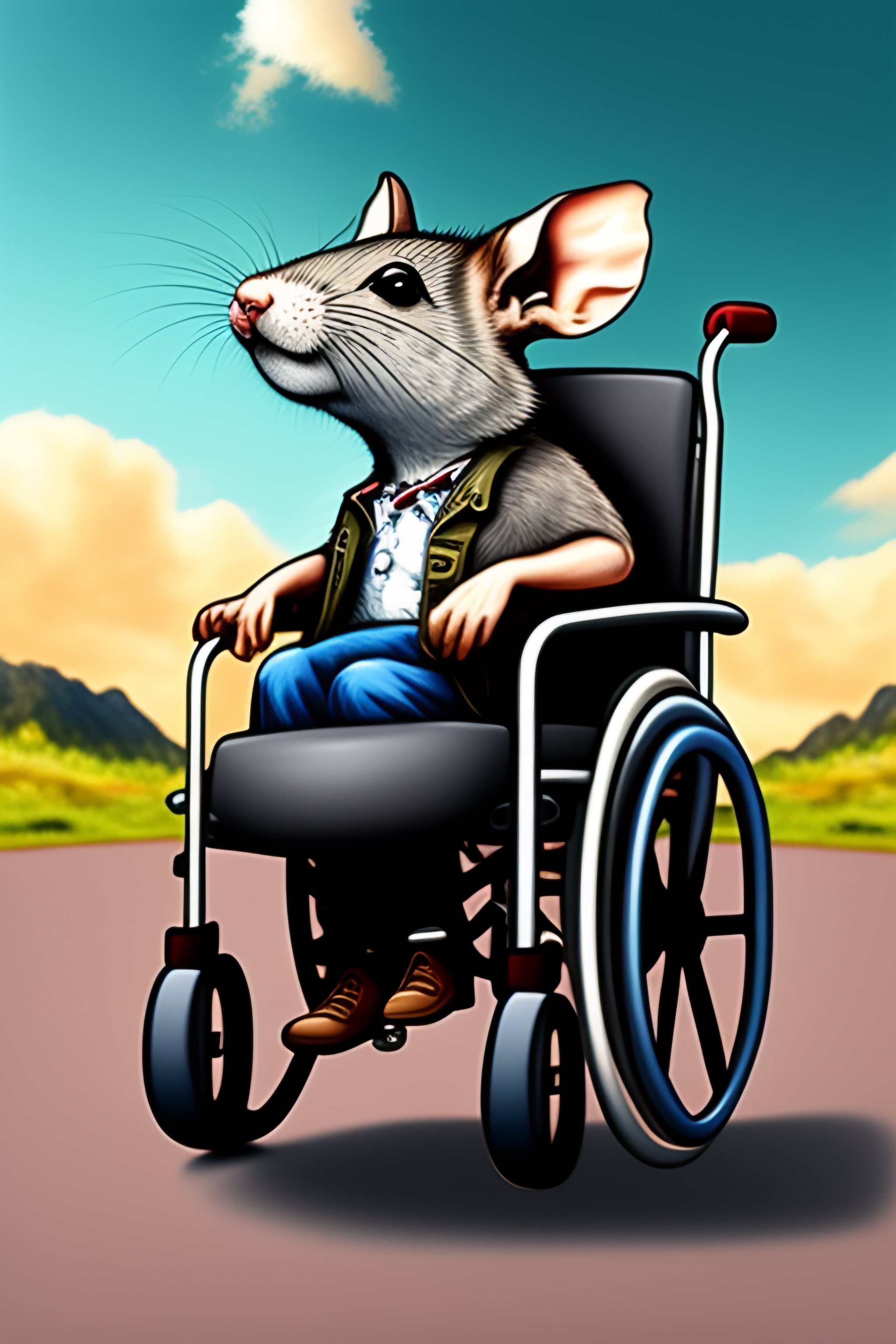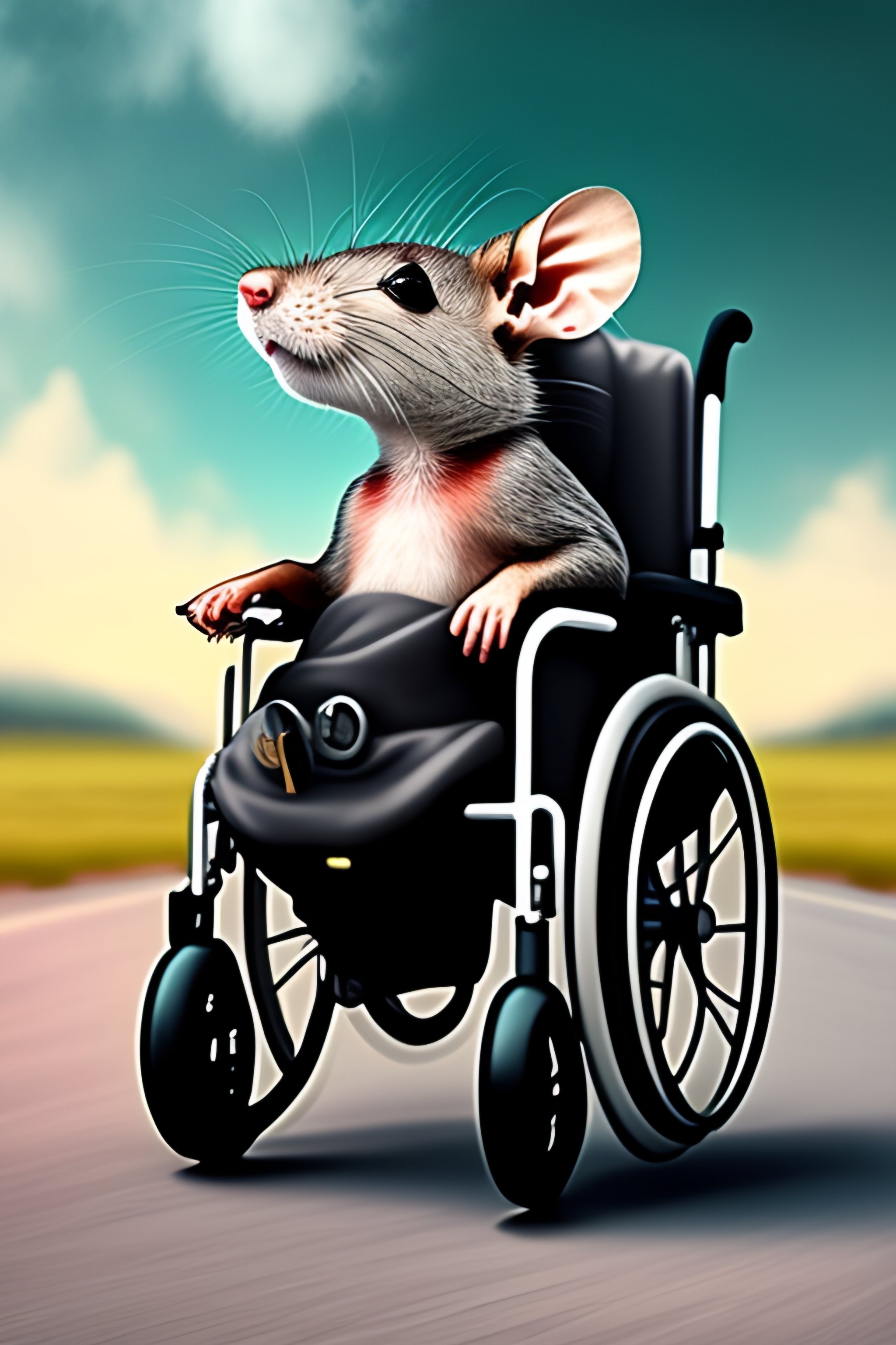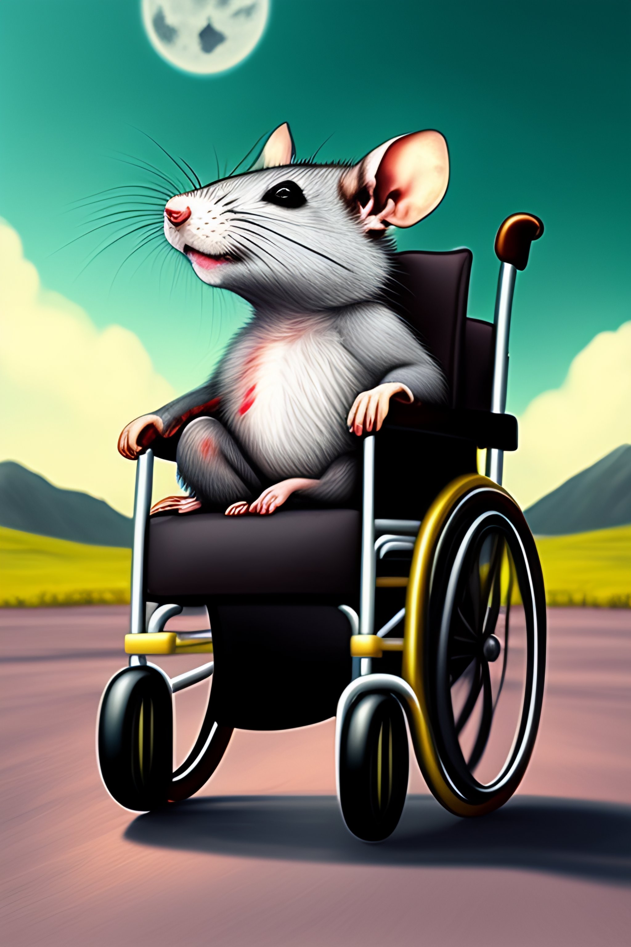 A grey rat riding a wheelchair escaping from zombies