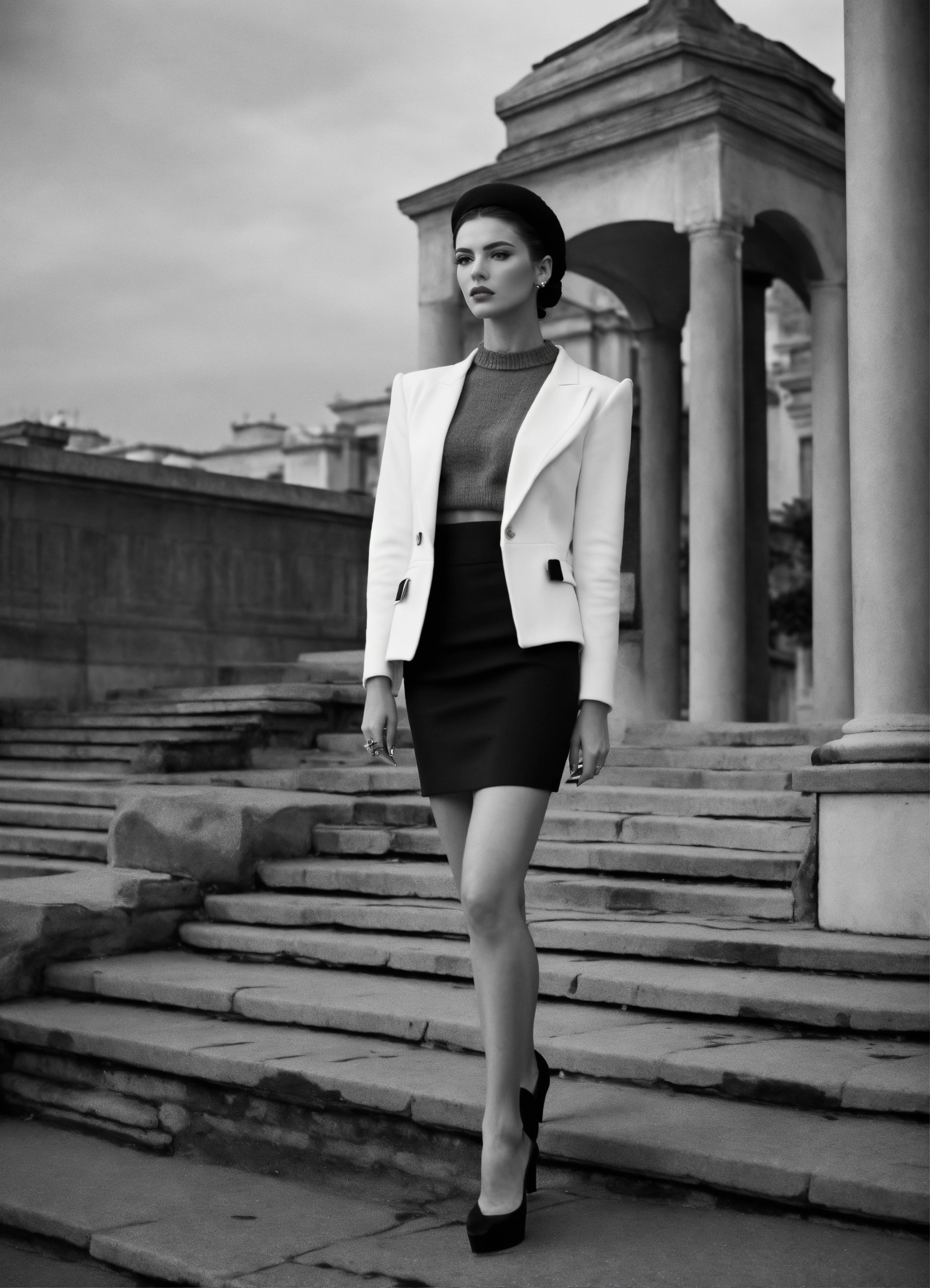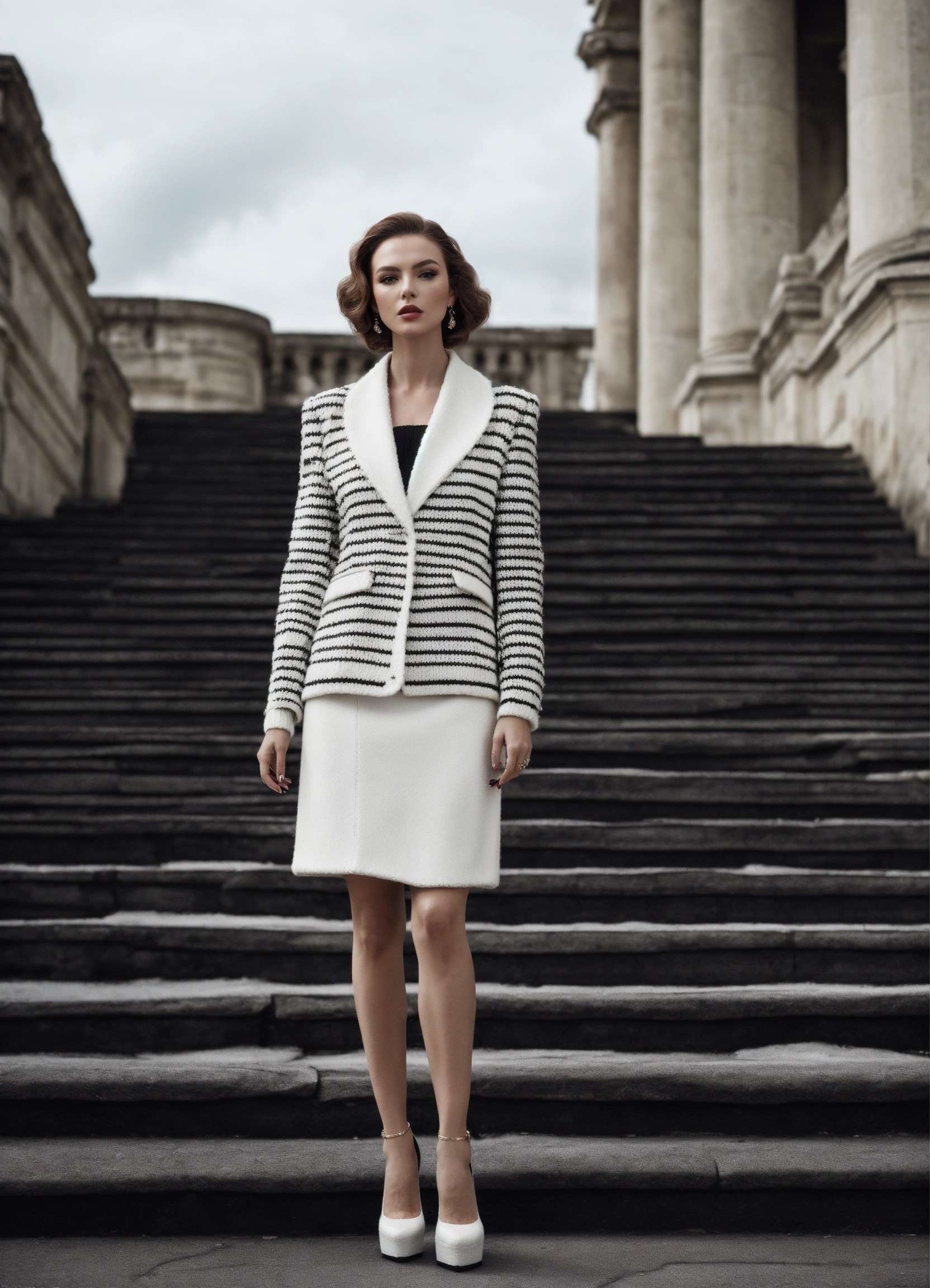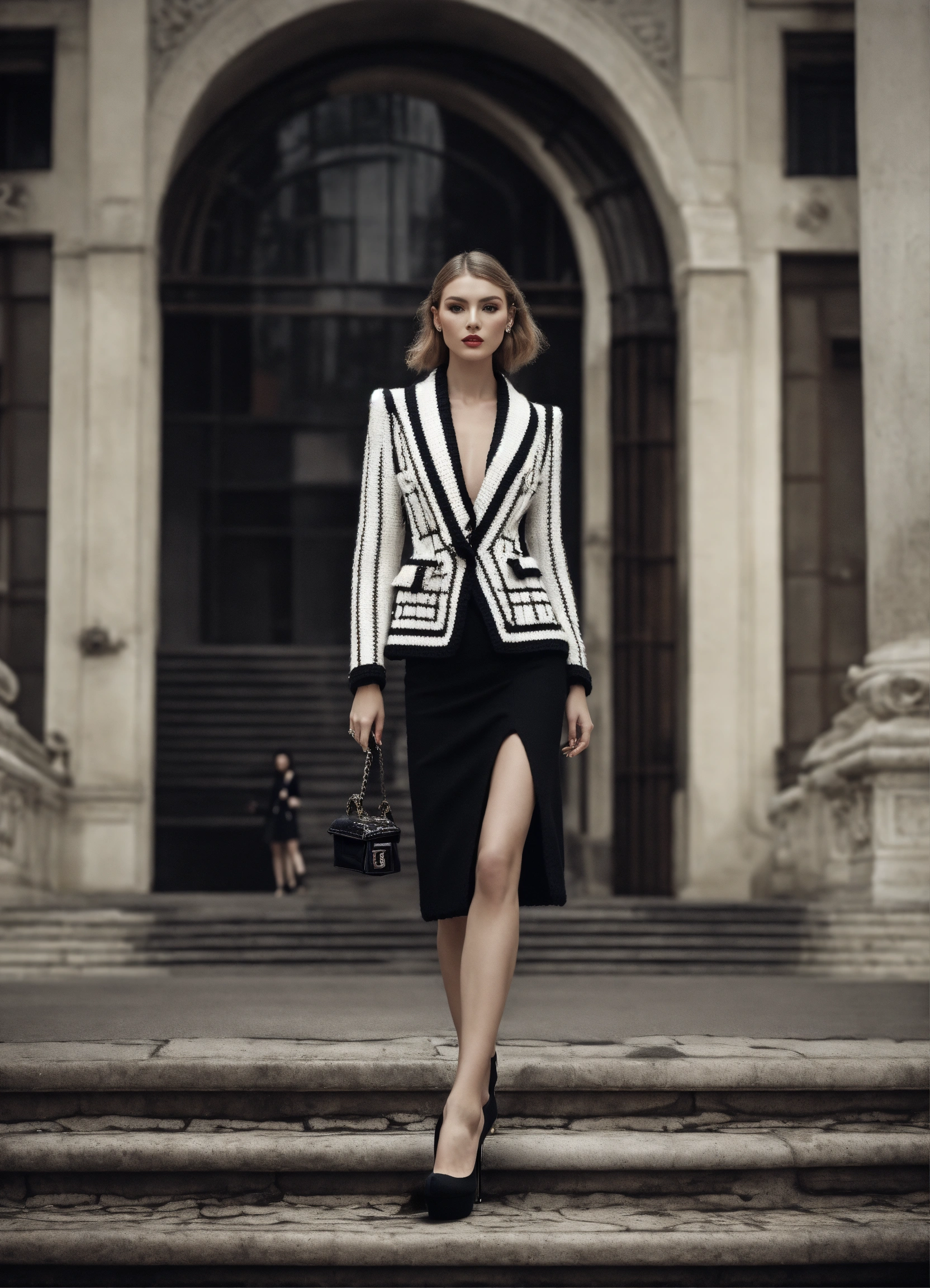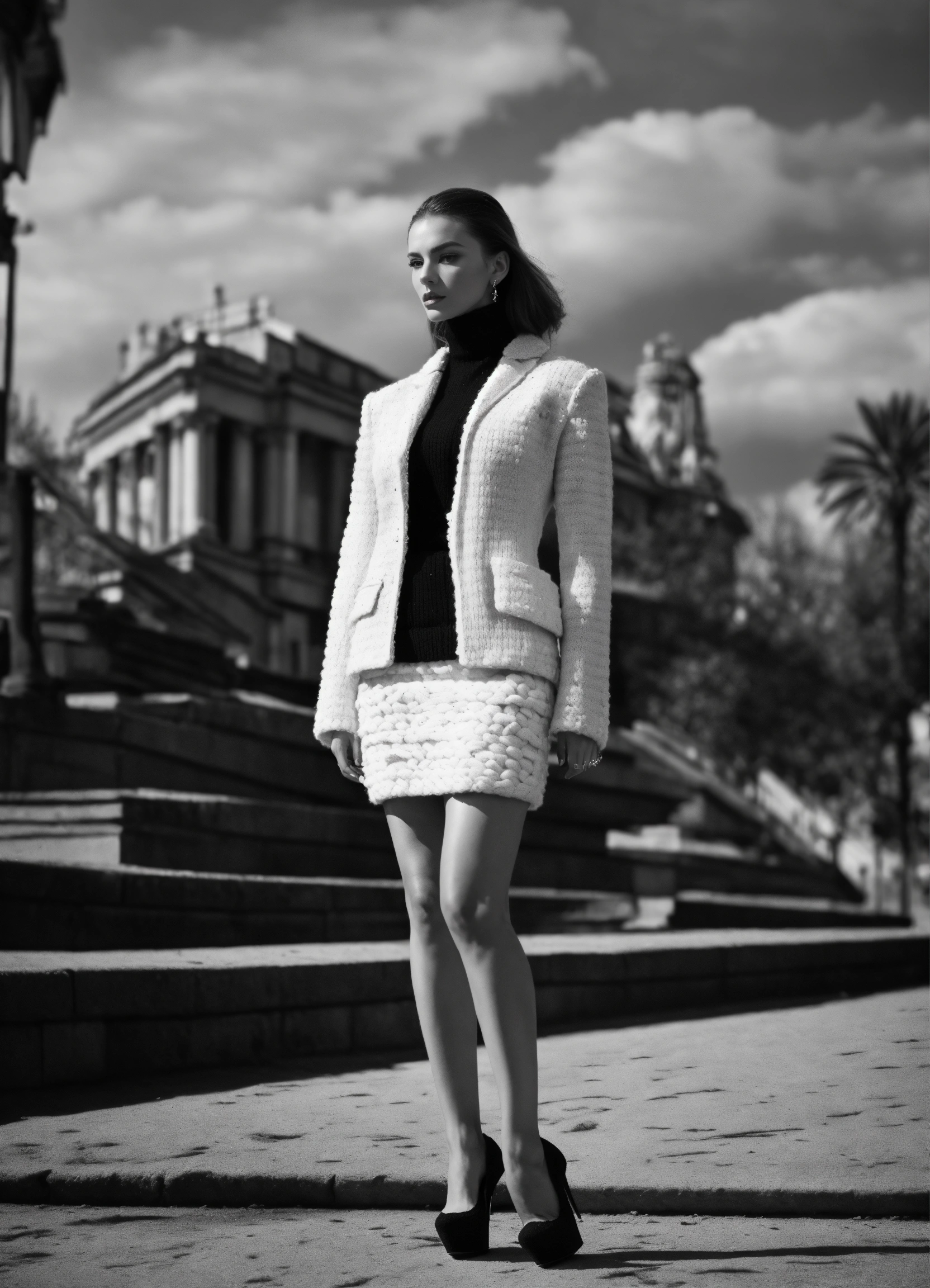 Portrait of haute couture beautiful russian fashion model editorial, structured outfit, platform high heeled stiletto shoes, iso 400, surrealistic, 8k, full frame, landscape, architecture, wearing a black and white knitted short structured blazer jacket with wide structured shoulders and matching skirt outfit chanel style, federico fellini movie scene