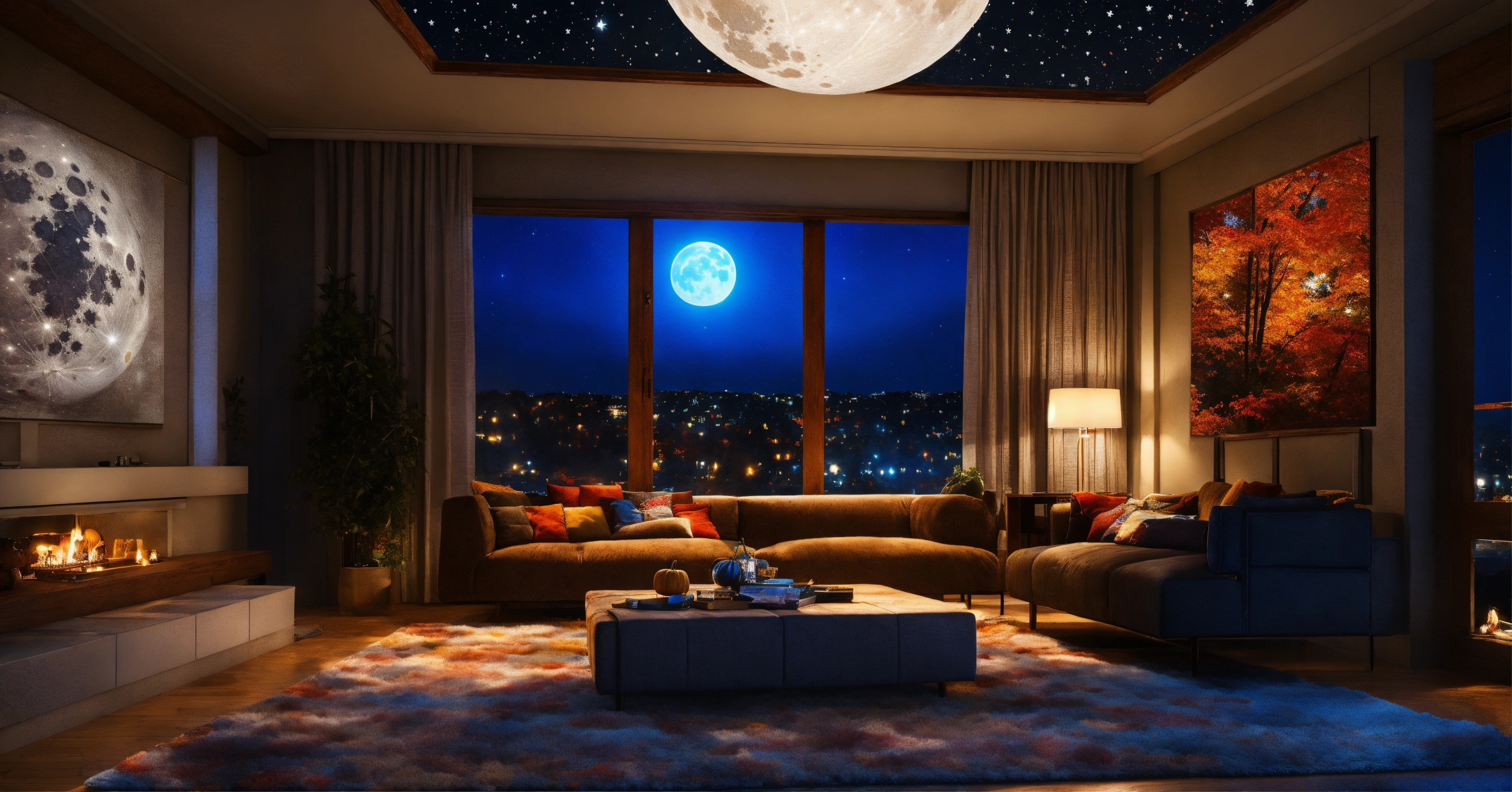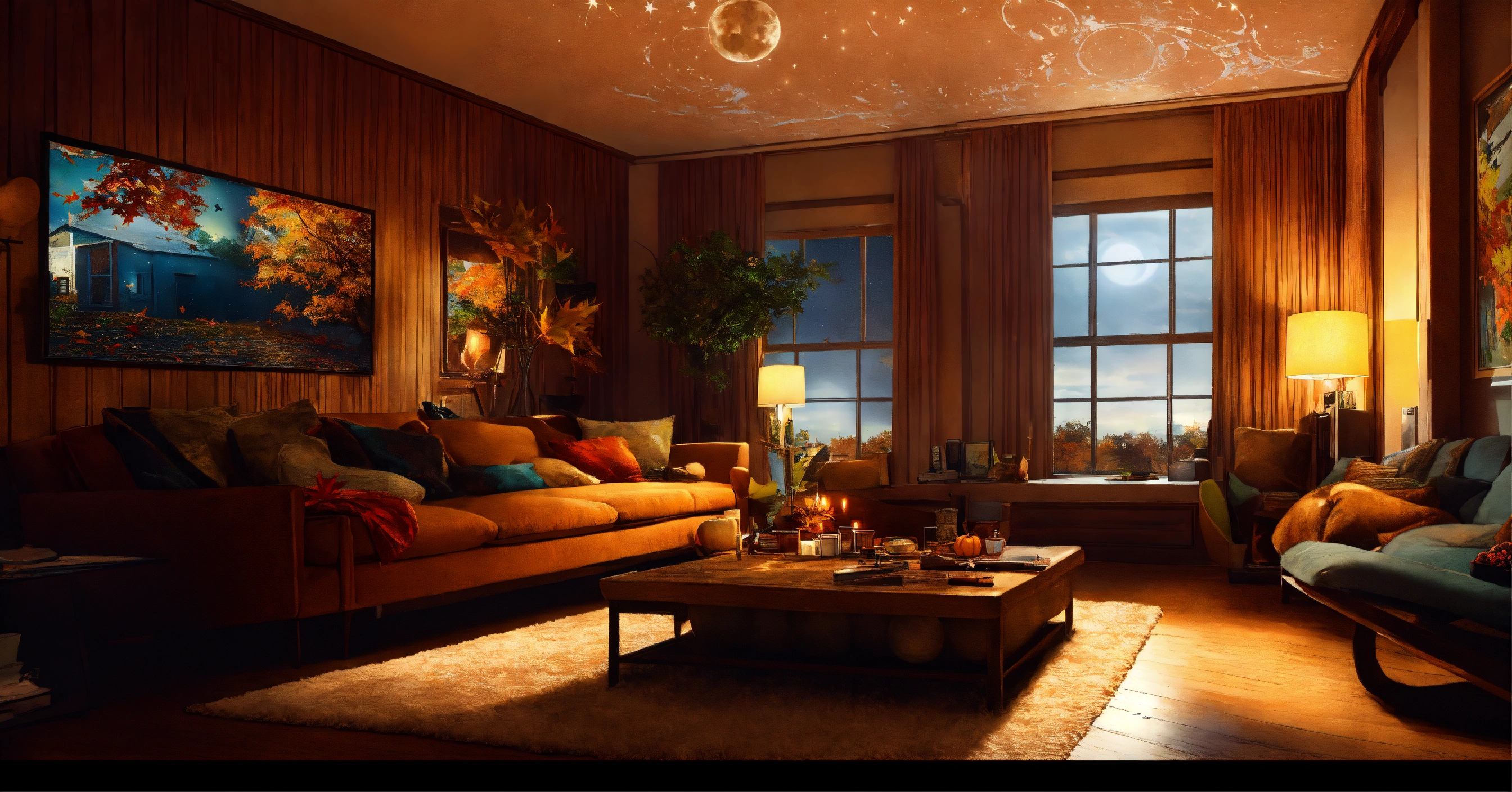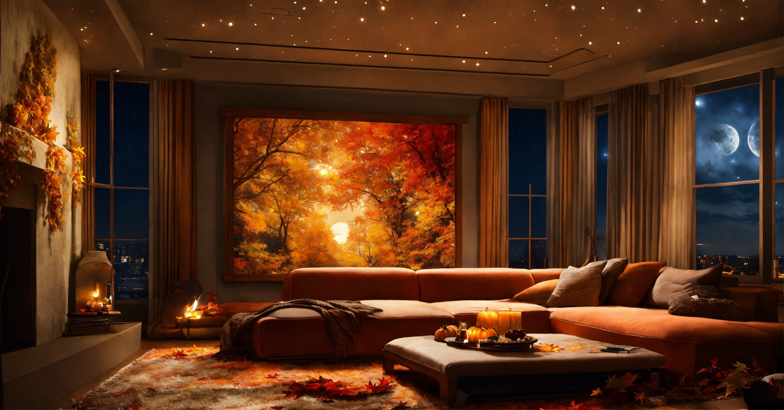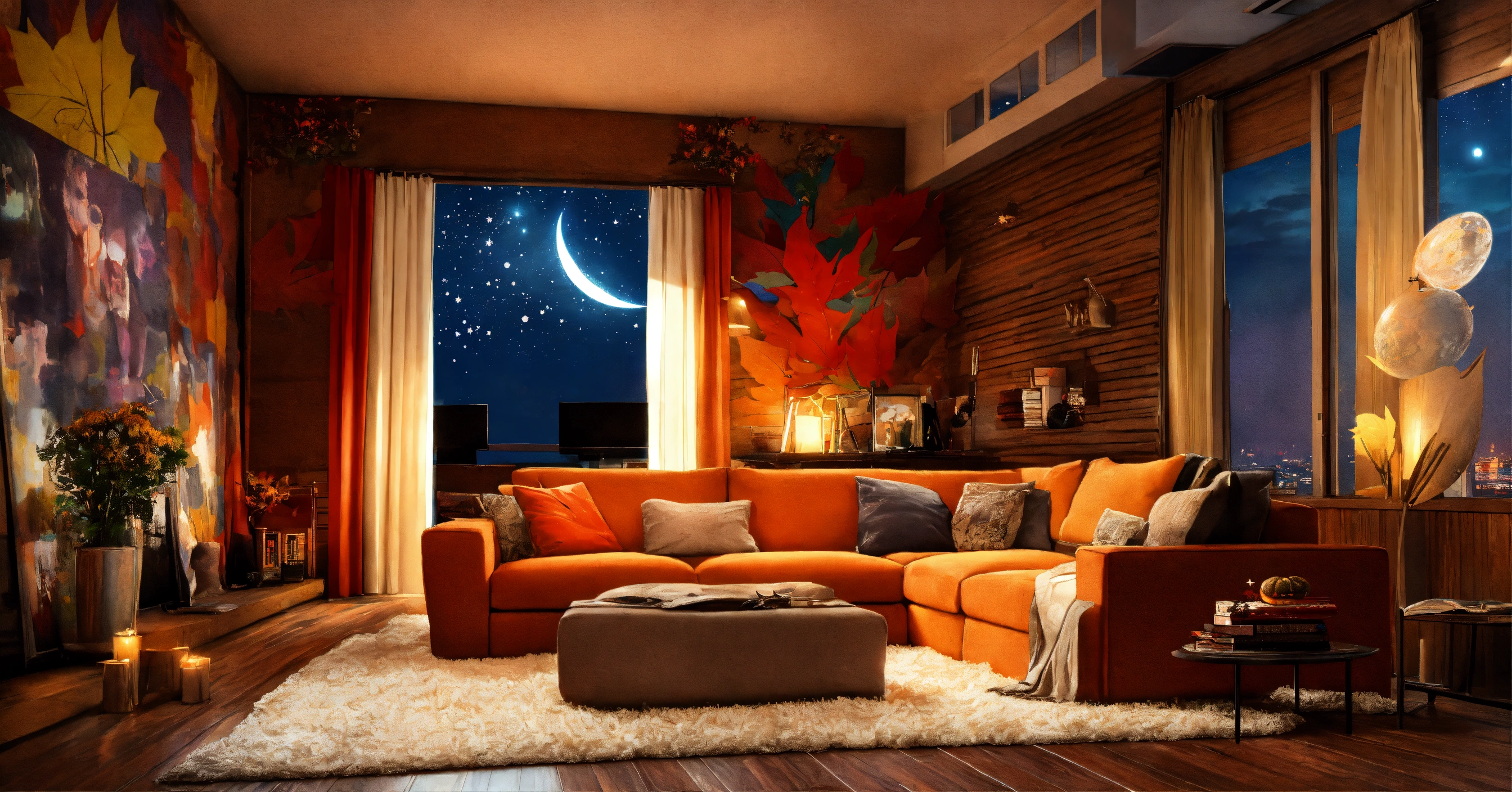 Living room fall leaves, night window, fluffy rug, grafitti fall pics living room big couch dark wood, stars moon, sky ceiling