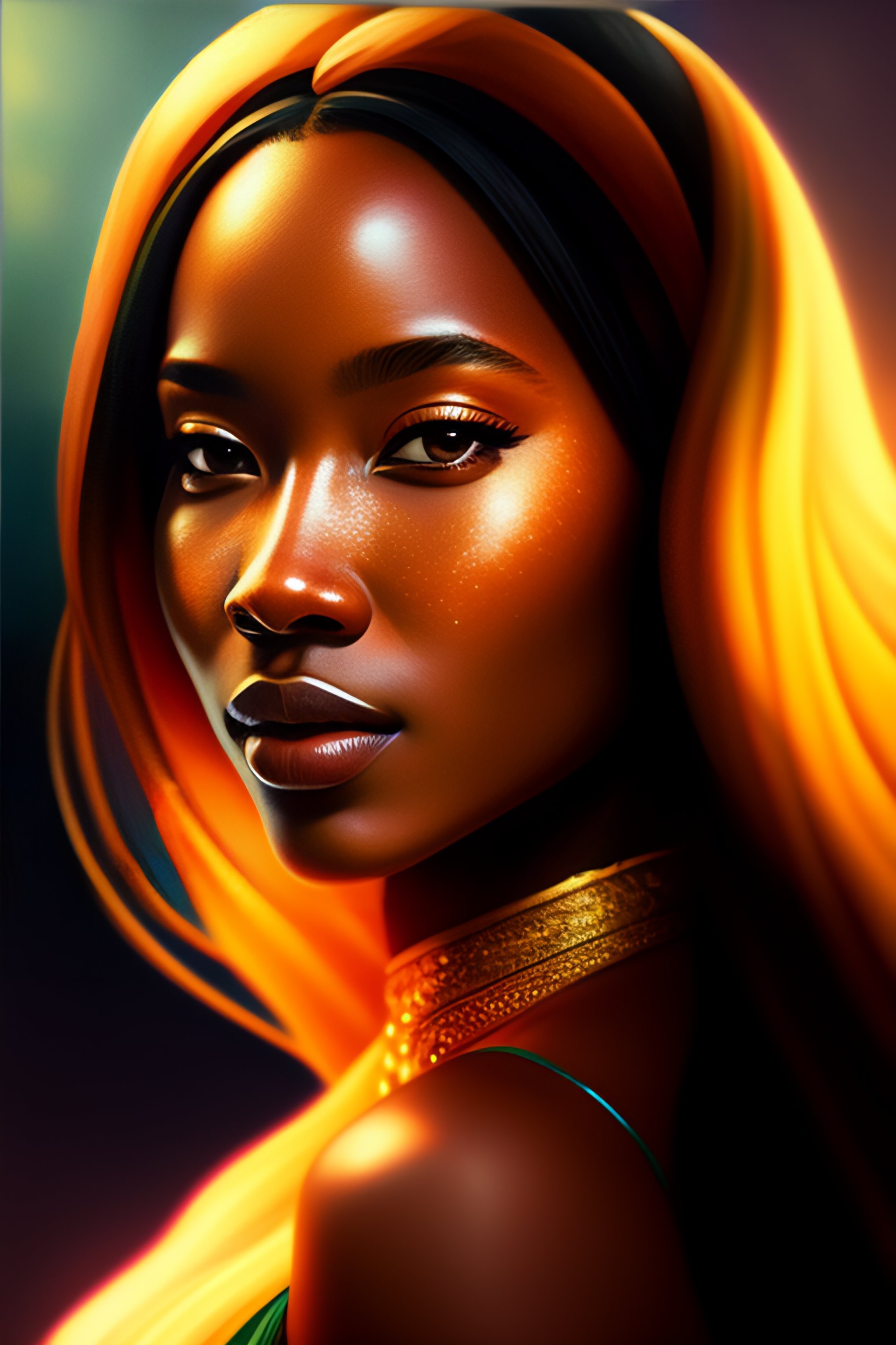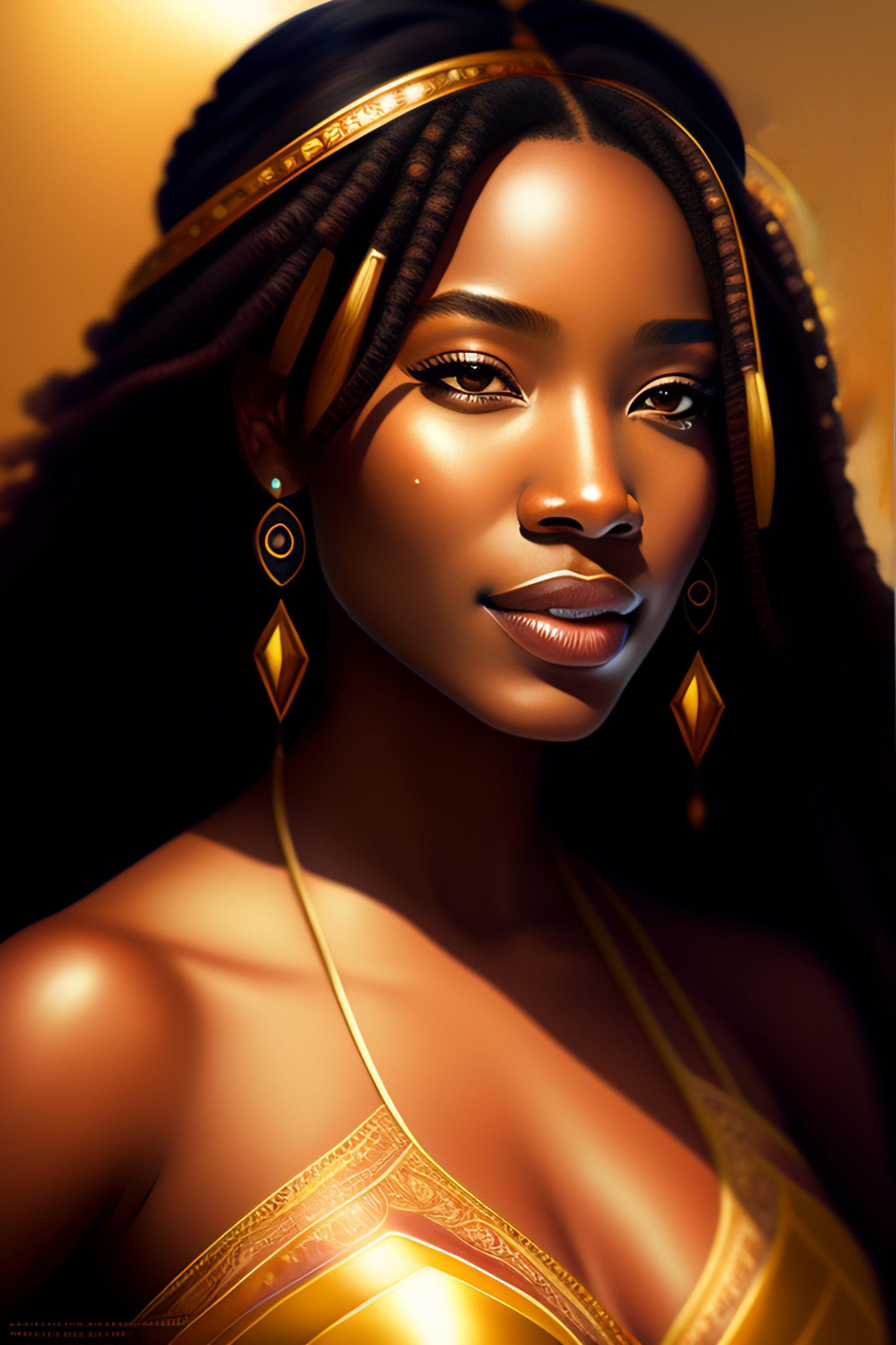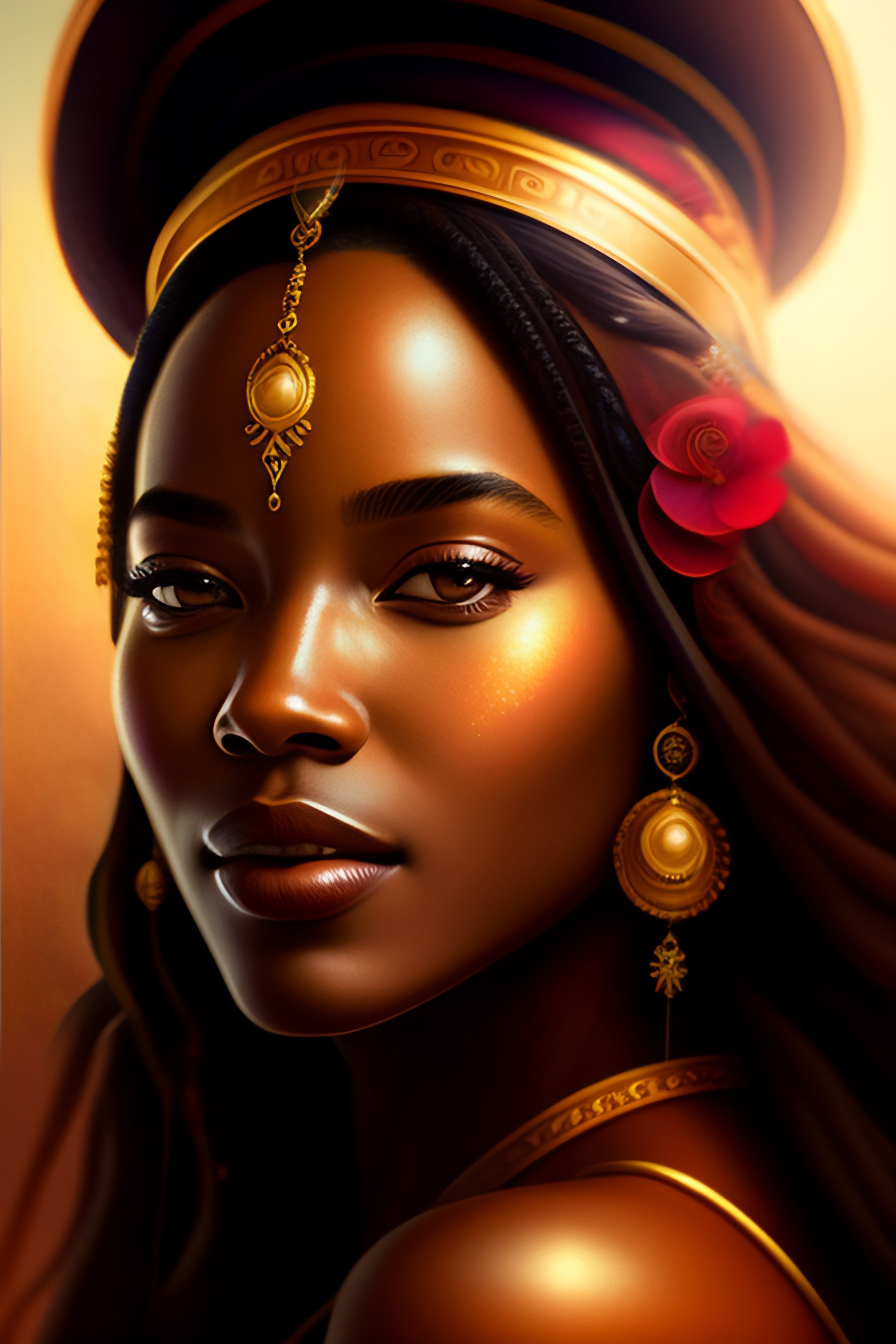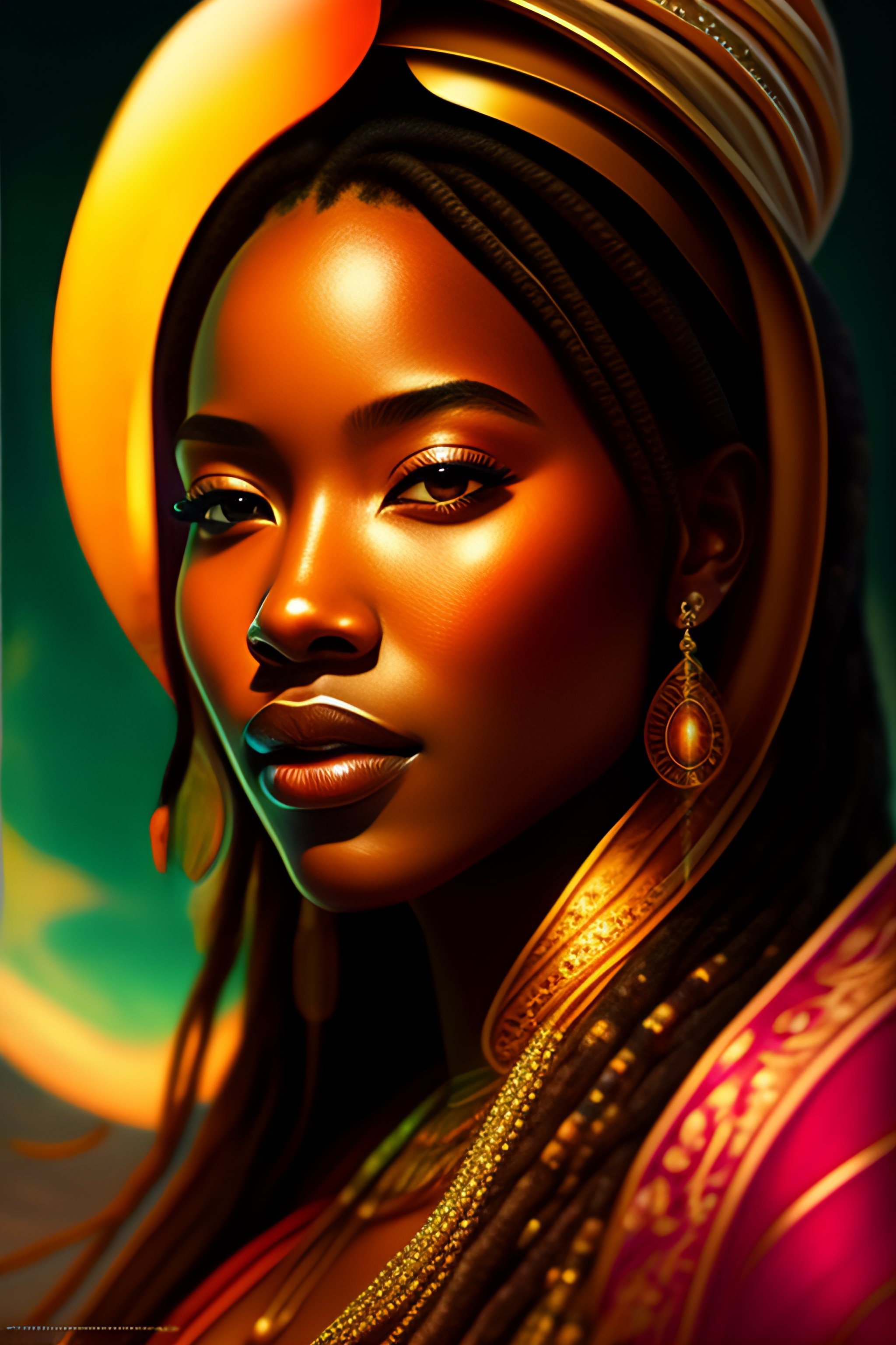 Beautiful portrait of an attractive jamaican rasta princess, beautiful princess, round shaped face, glowing glass skin, sparkling hazel green eyes, highlighted chestnut brown long straight hair, adorned in intricate golden jewelry, confident half smile, face painting, dramatic lighting, intricate, wild, exotic beauty, highly detailed, digital painting, artstation, concept art, smooth, sharp focus, illustration, art by artgerm and greg rutkowski and alphonse mucha, footage from space camera