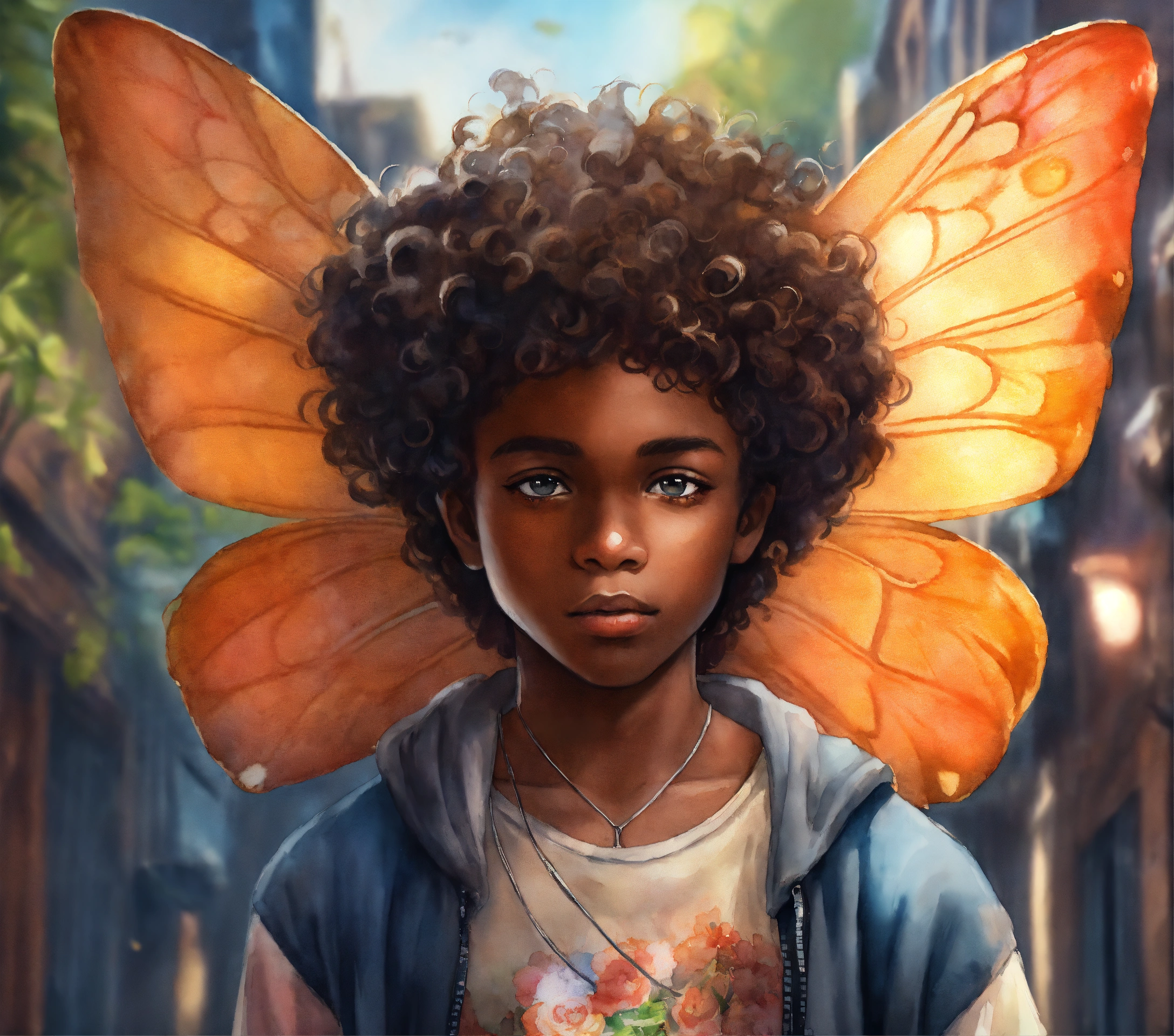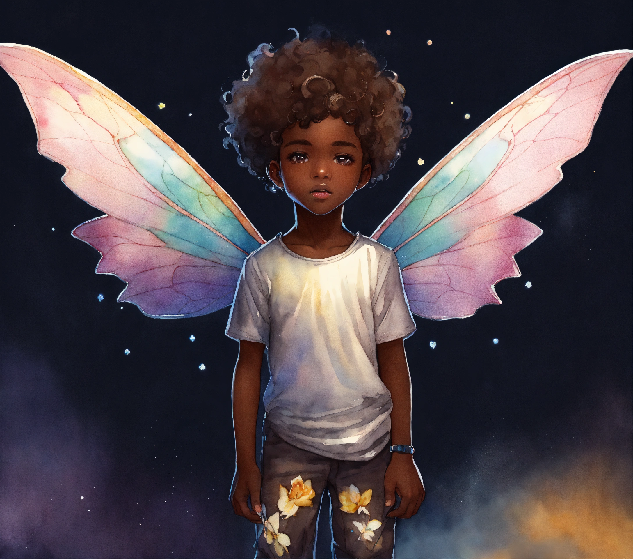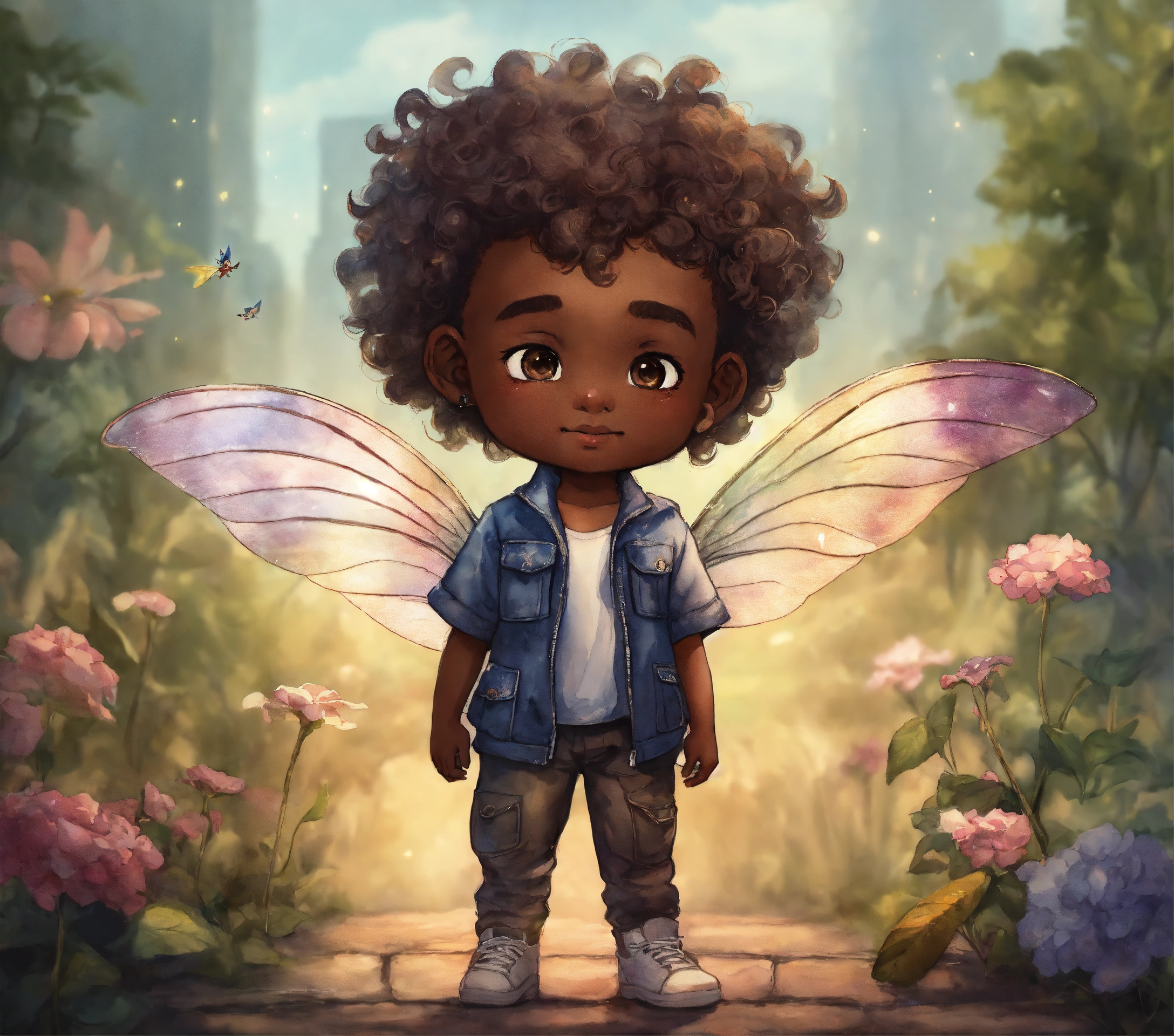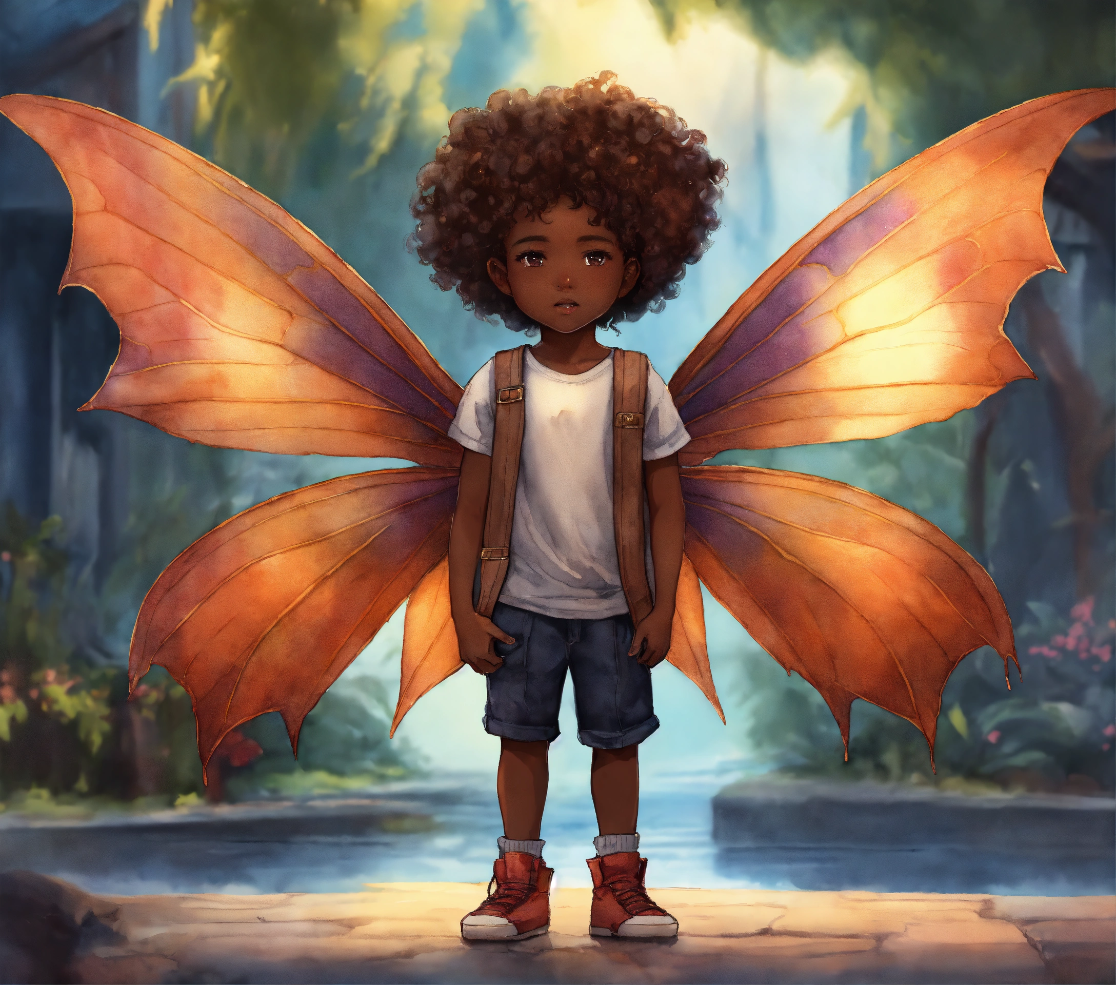 Dark dark complexion bantu boy, realistic healthy glossy well defined wavy hair texture, full body shot, rule of thirds centered subject placement, storybook, dreamlike, cartoon, illustration, watercolor, fairy punk, fairywings, urban fairy