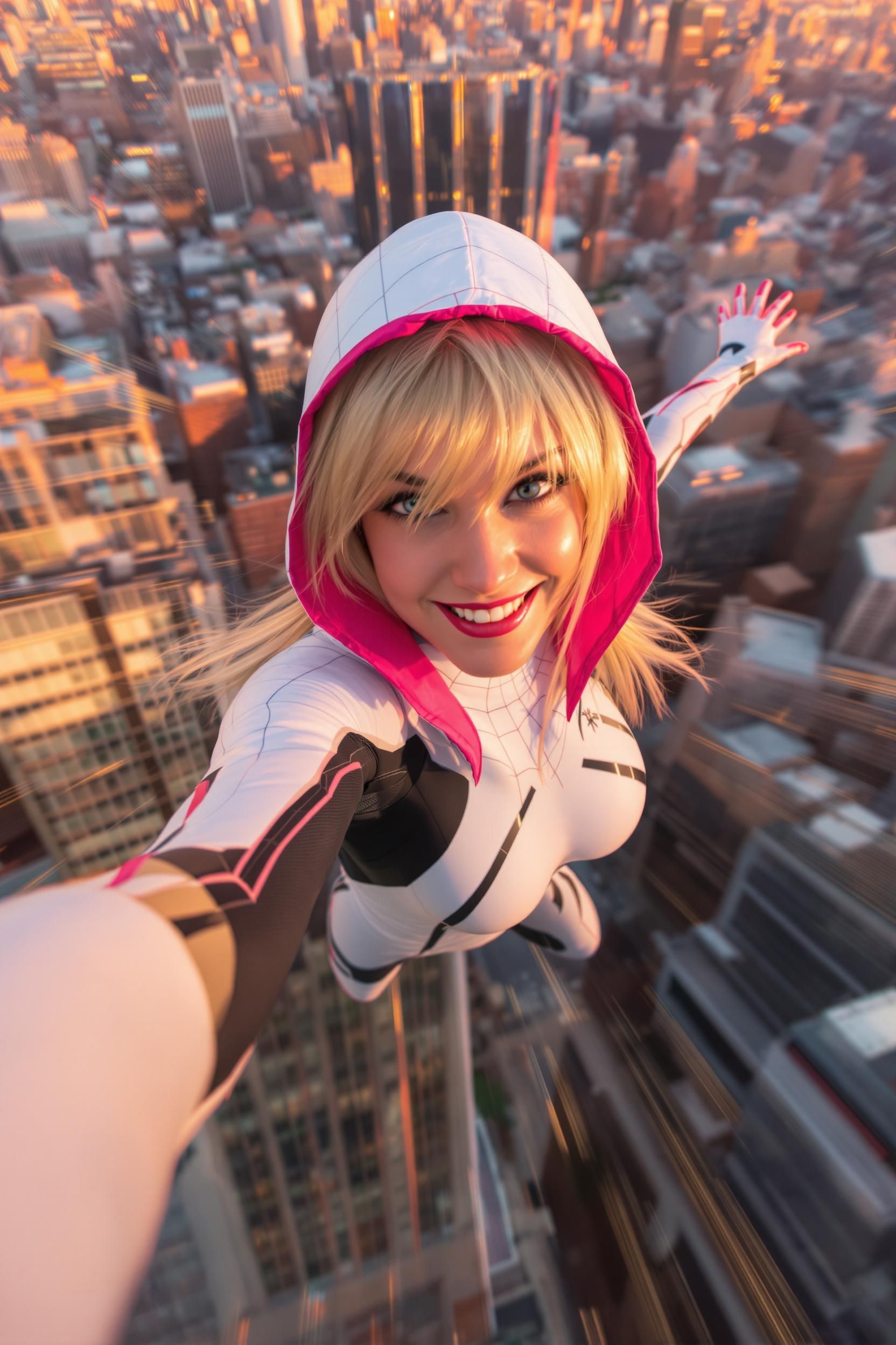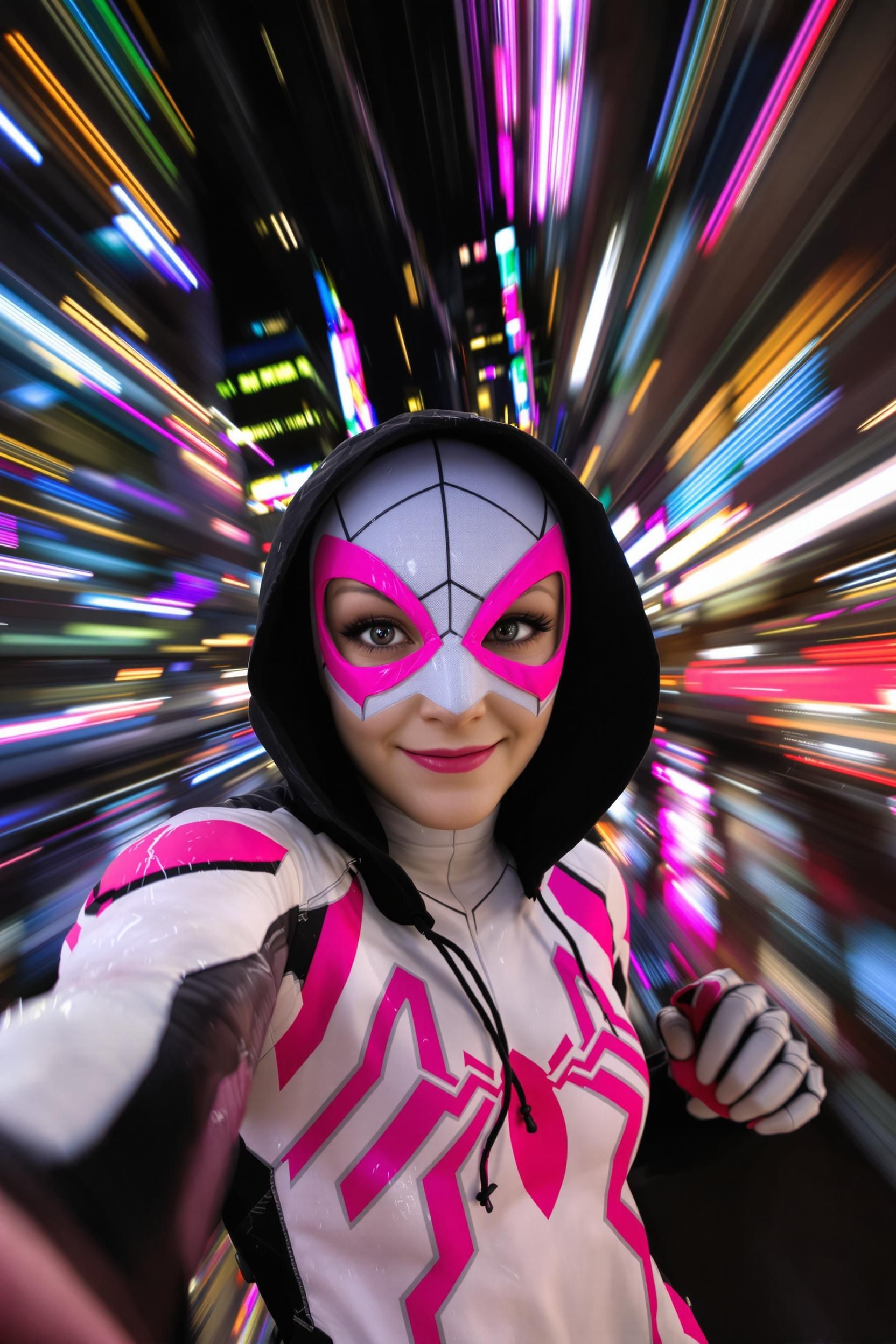 Spider-gwen taking a selfie while swinging through nyc, extreme motion blur, pretty face, beautiful shot