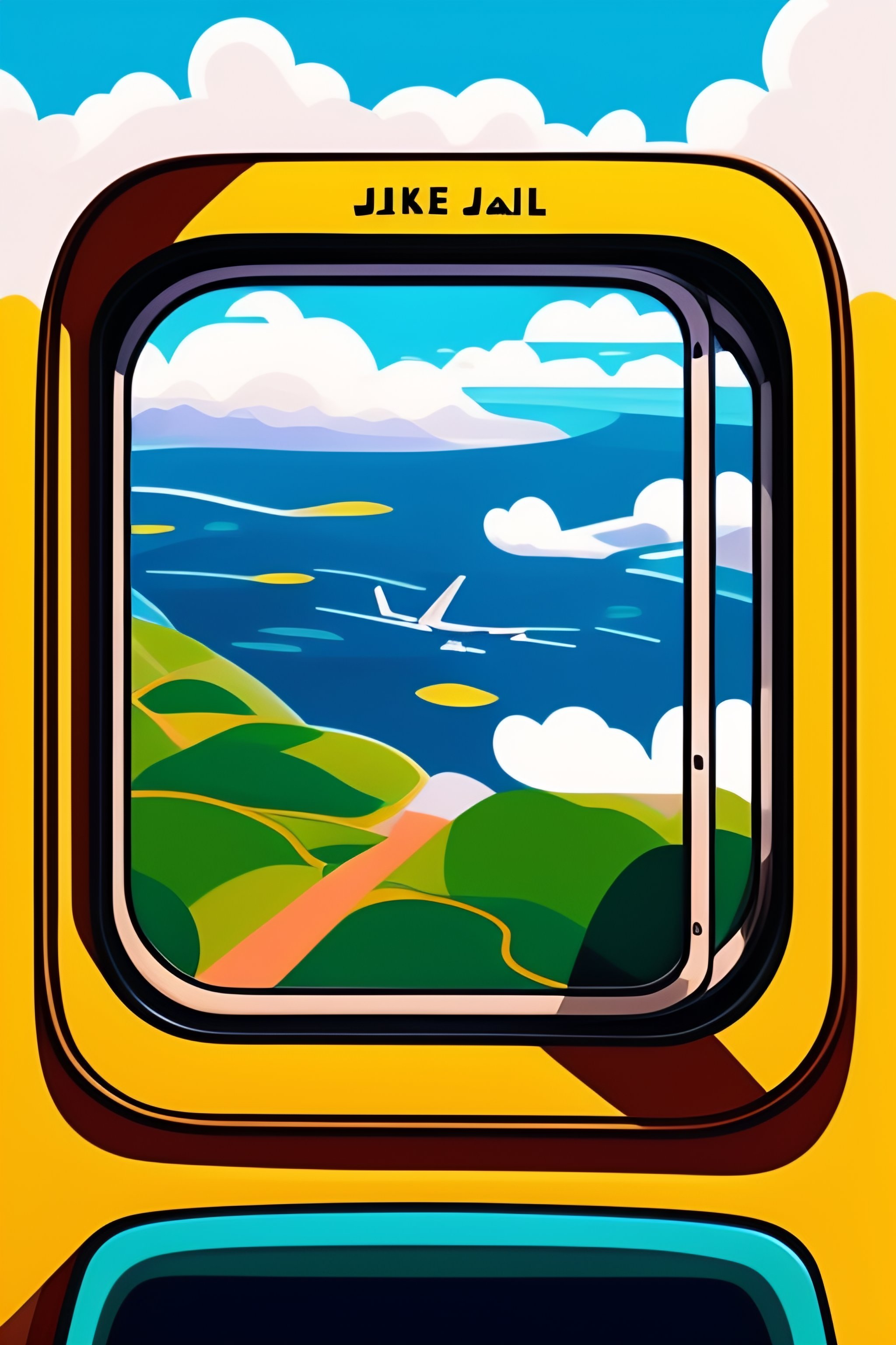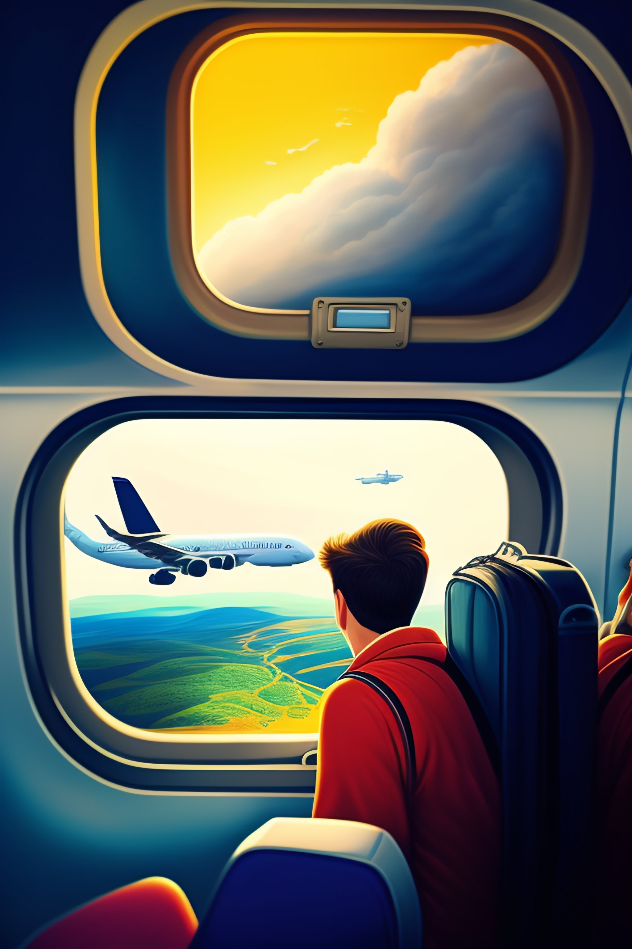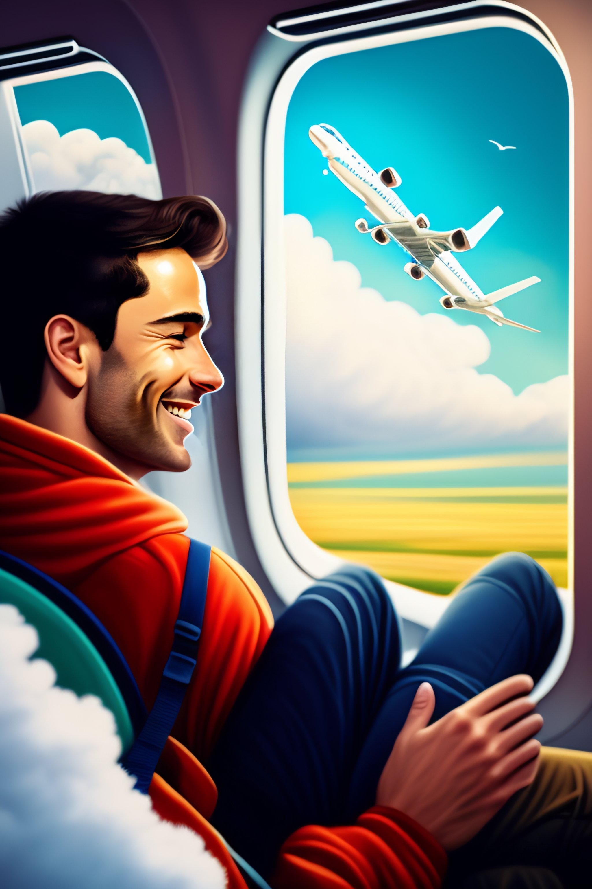 The panel could show jake sitting on an airplane with an excited expression on his face. he could have his passport and suitcase next to him and be looking out the airplane window down below, where clouds and the landscape can be seen. at the bottom of the panel, there could be a caption that reads "jake travels by plane to spain" and a small flag of spain next to it. around jake, there could be small details showing the atmosphere of the airplane, such as coffee cups or travel magazines. this panel shows jake excited for his trip to spain and ready to explore this beautiful country.