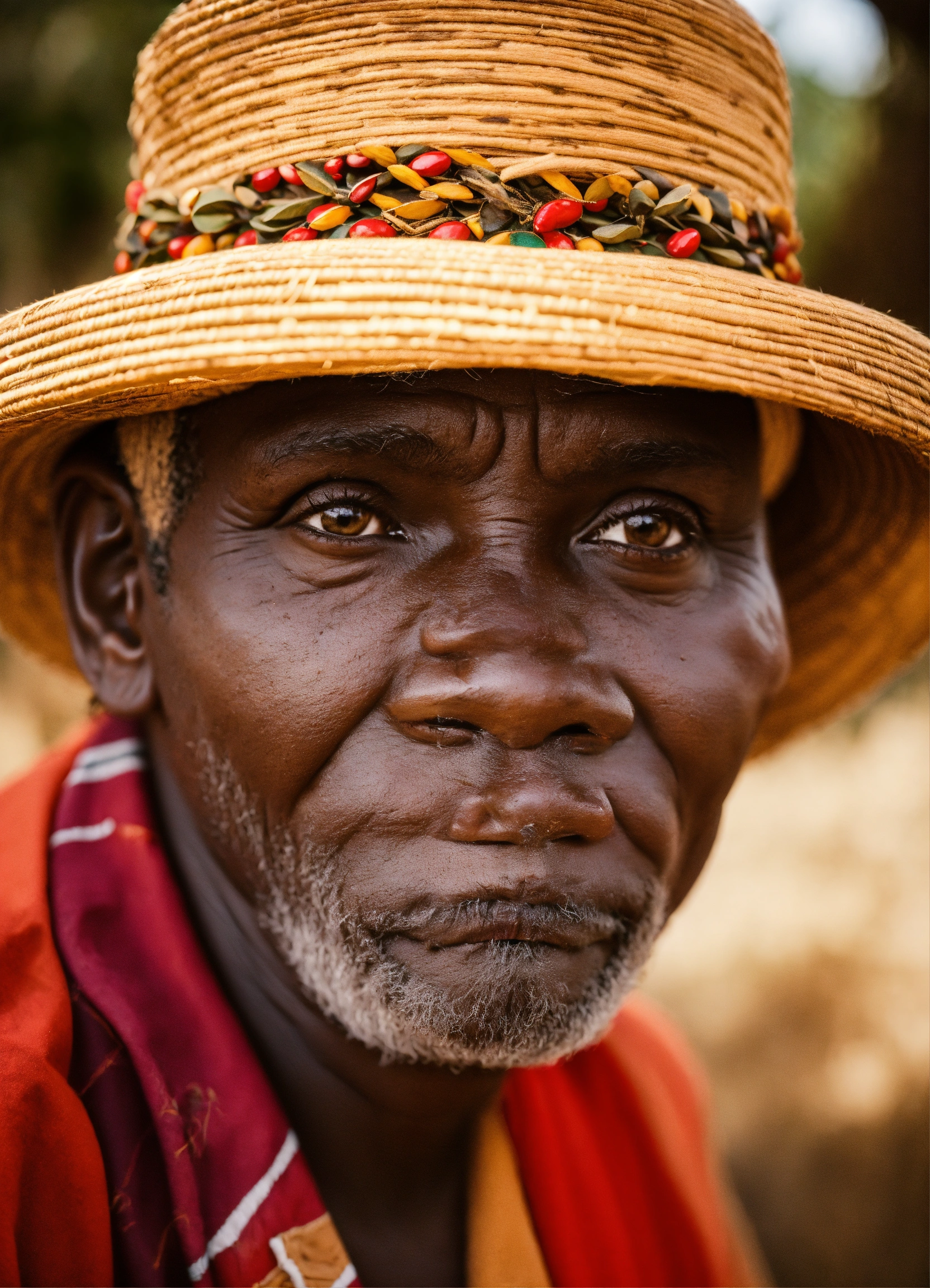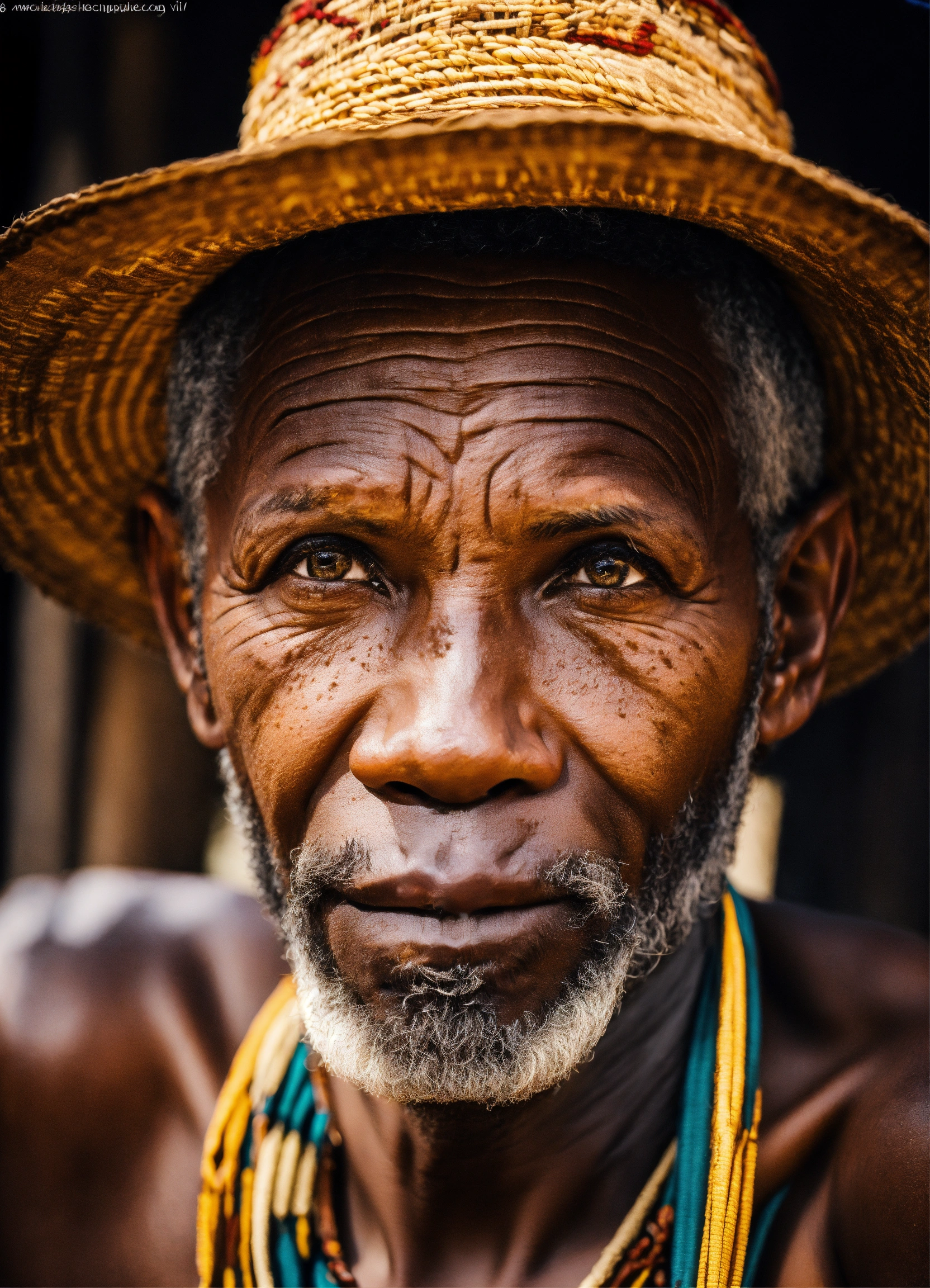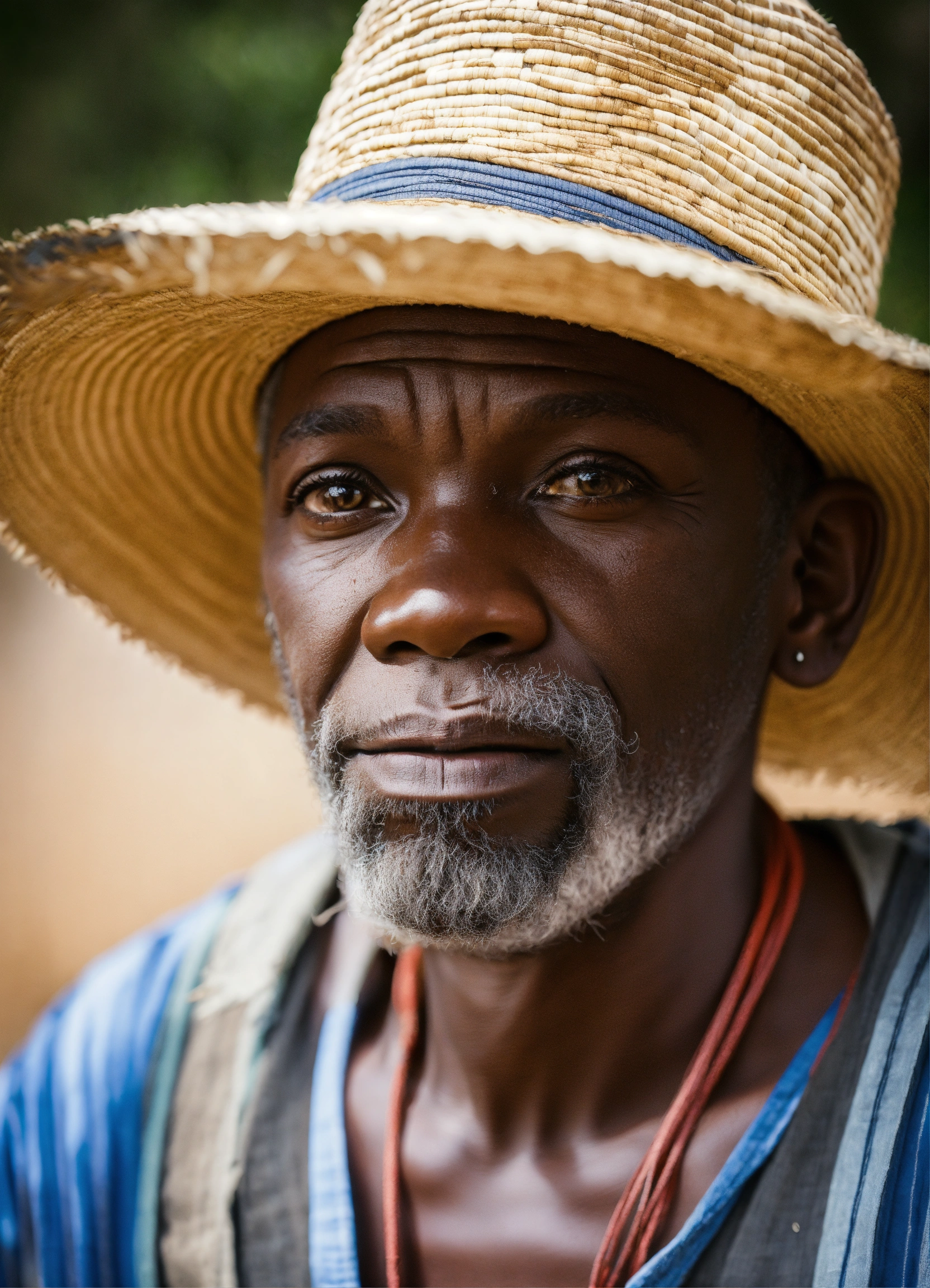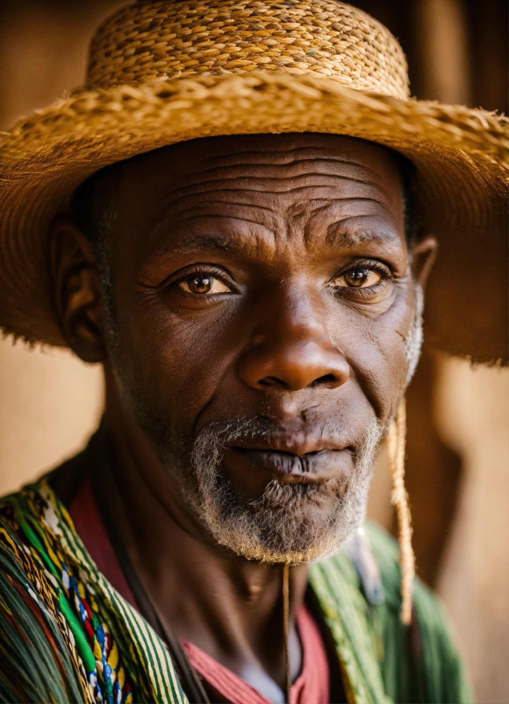 Visage vieux homme africain cicatrice pa la vie avec chapeau de paille