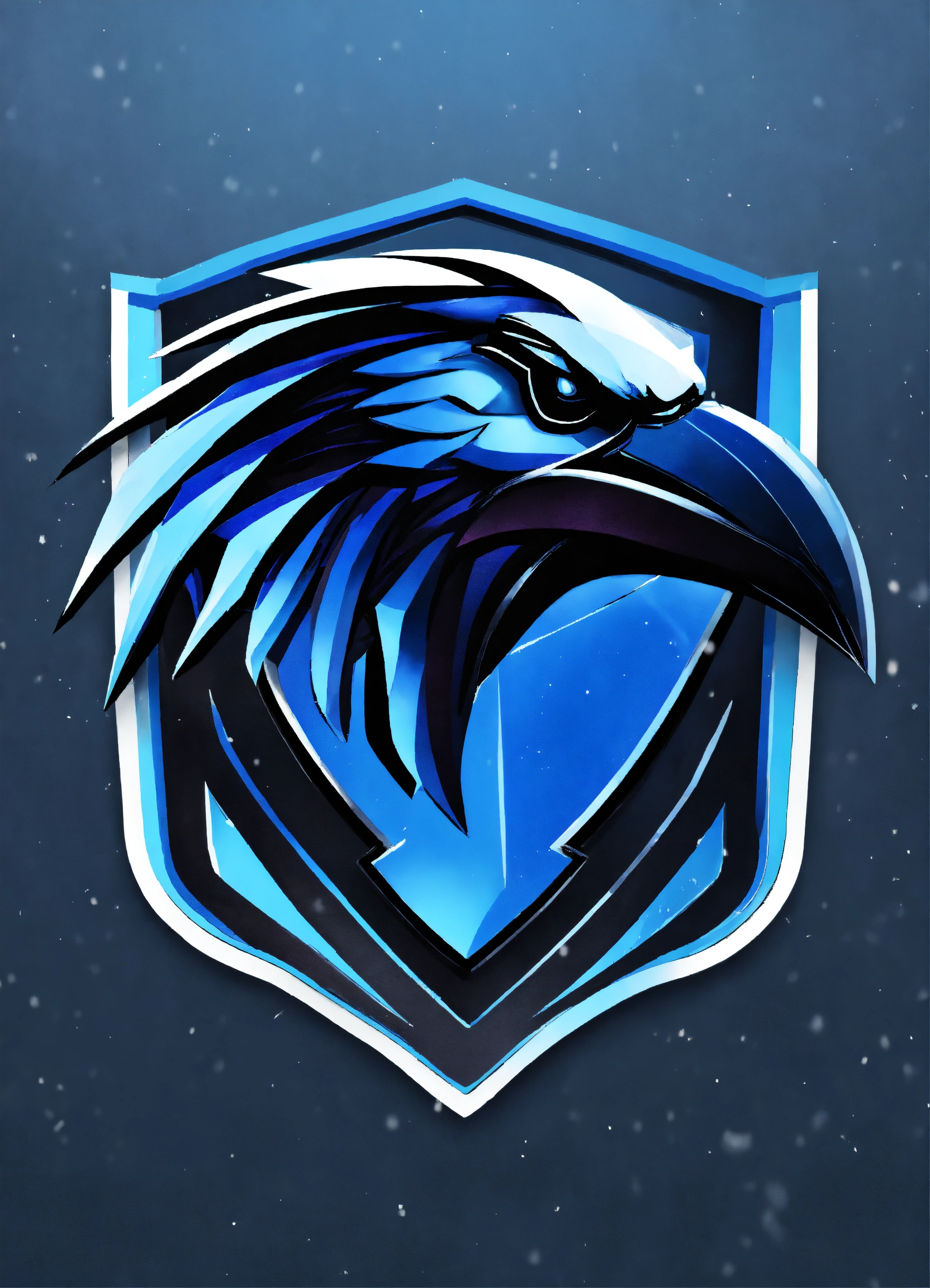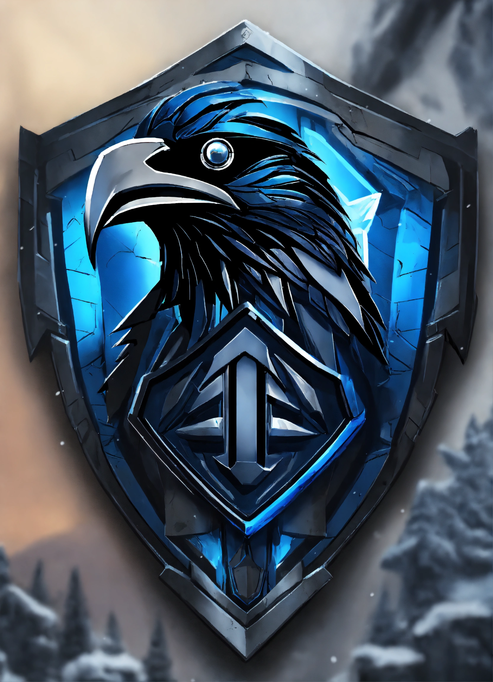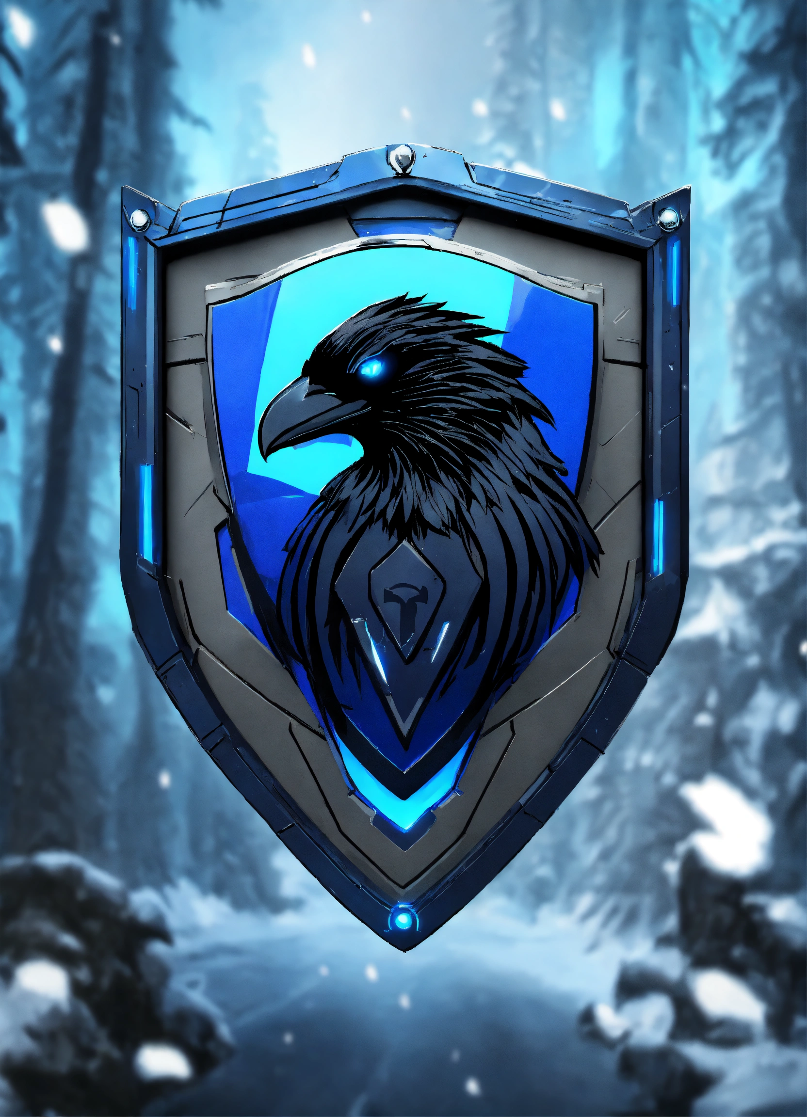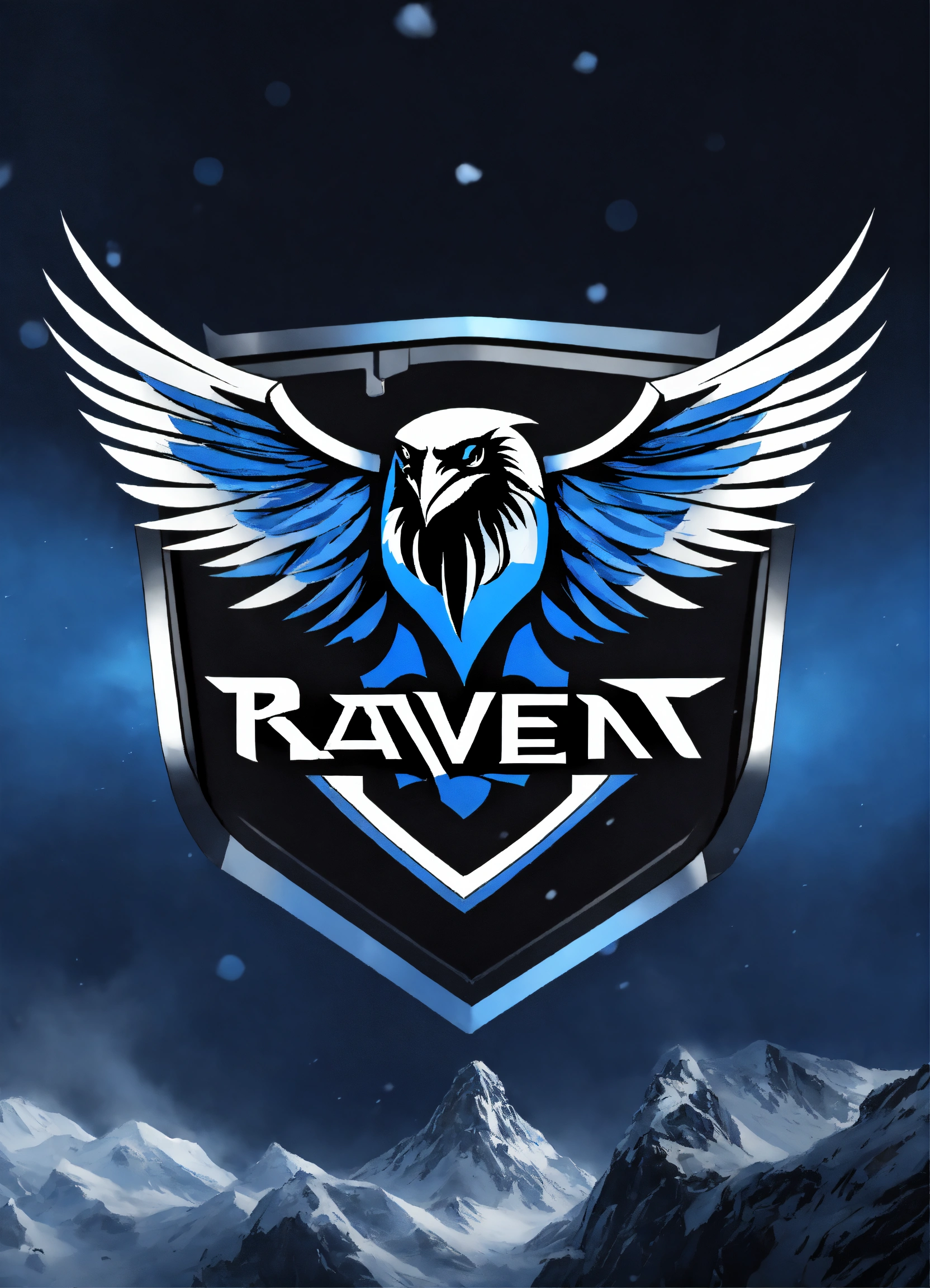 Angry, savage raven logo, snow style, futuristic logo, metal logo, futuristic shield, caption "ravens", black and blue color