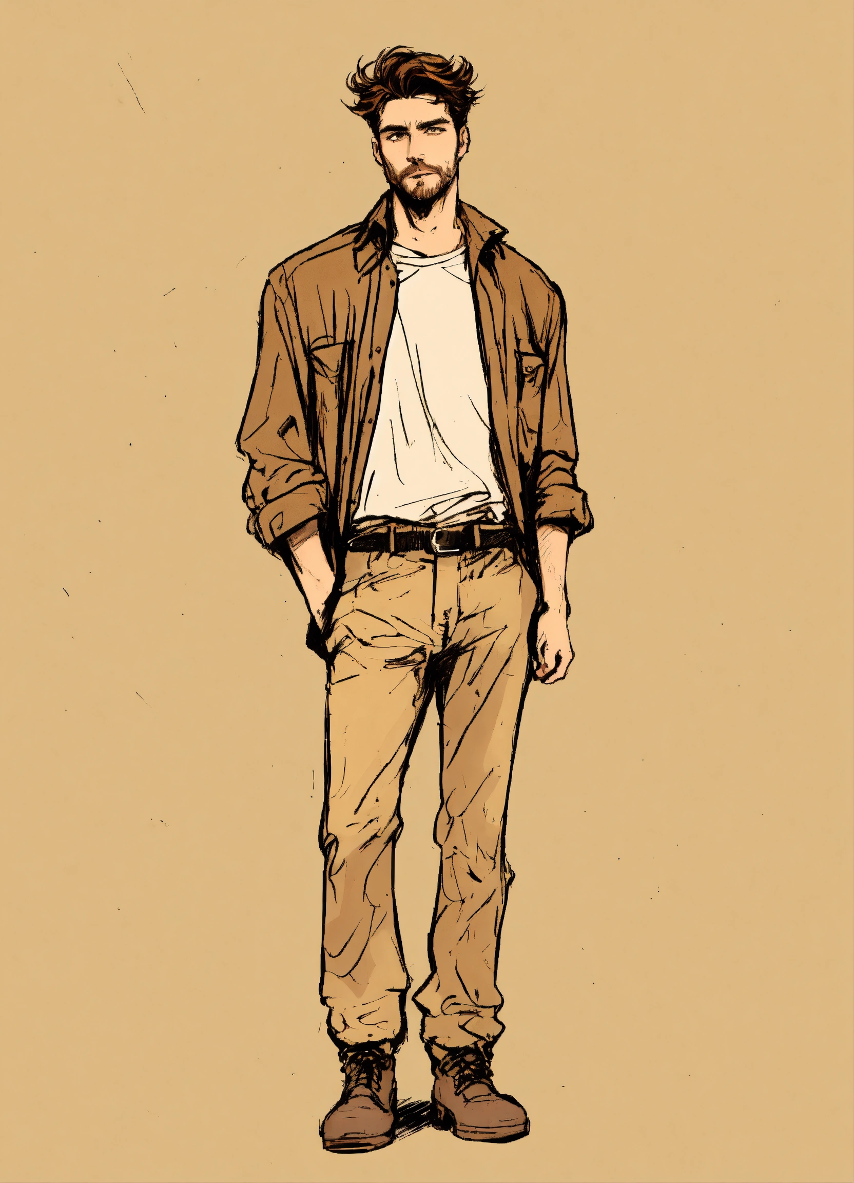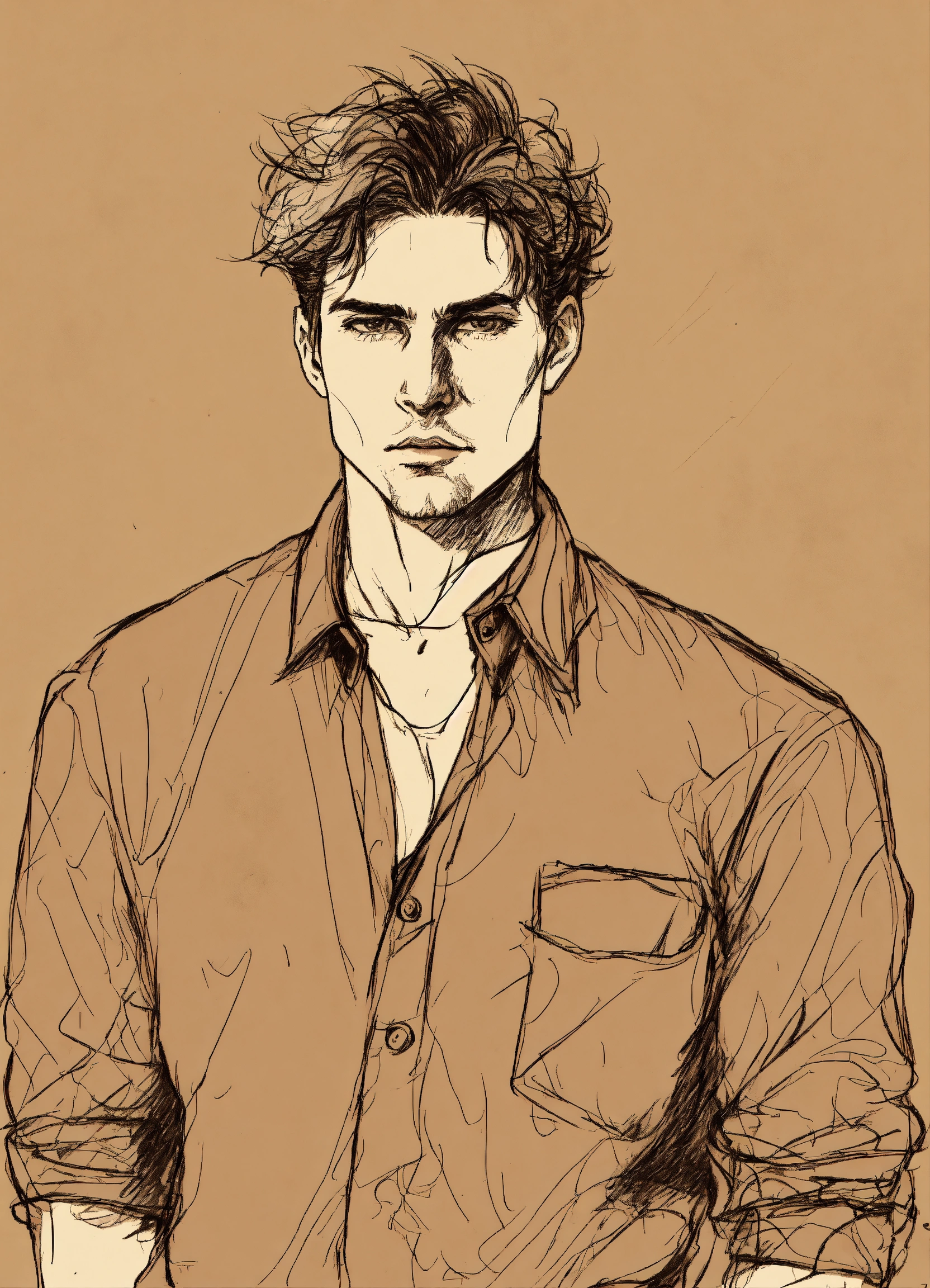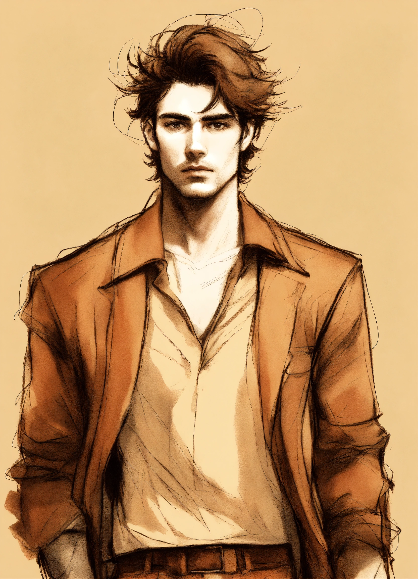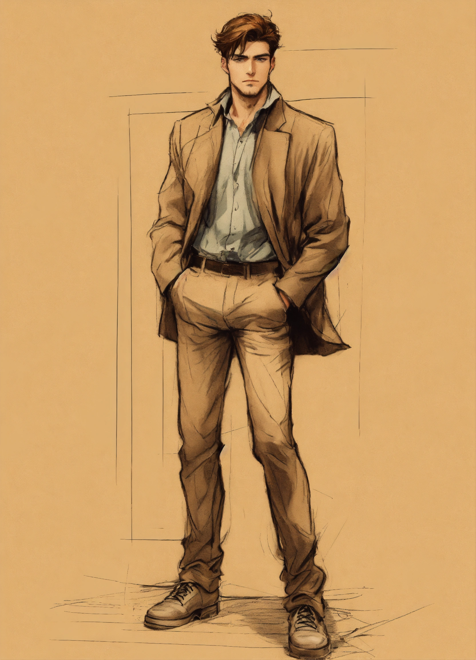 Chaotic sketch of a brown haired handsome man, standing straight, with a blank expression, full body, vintage 90's