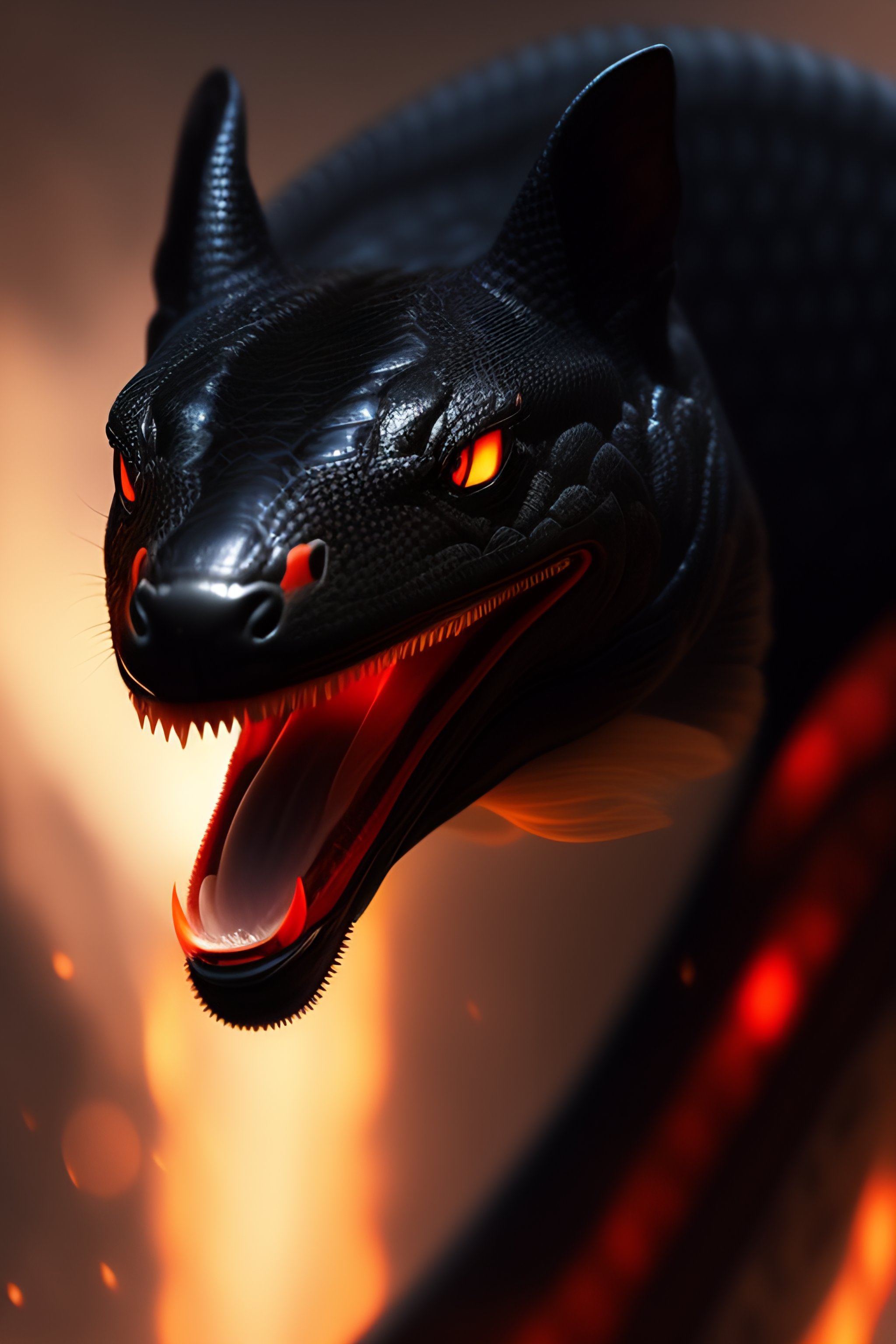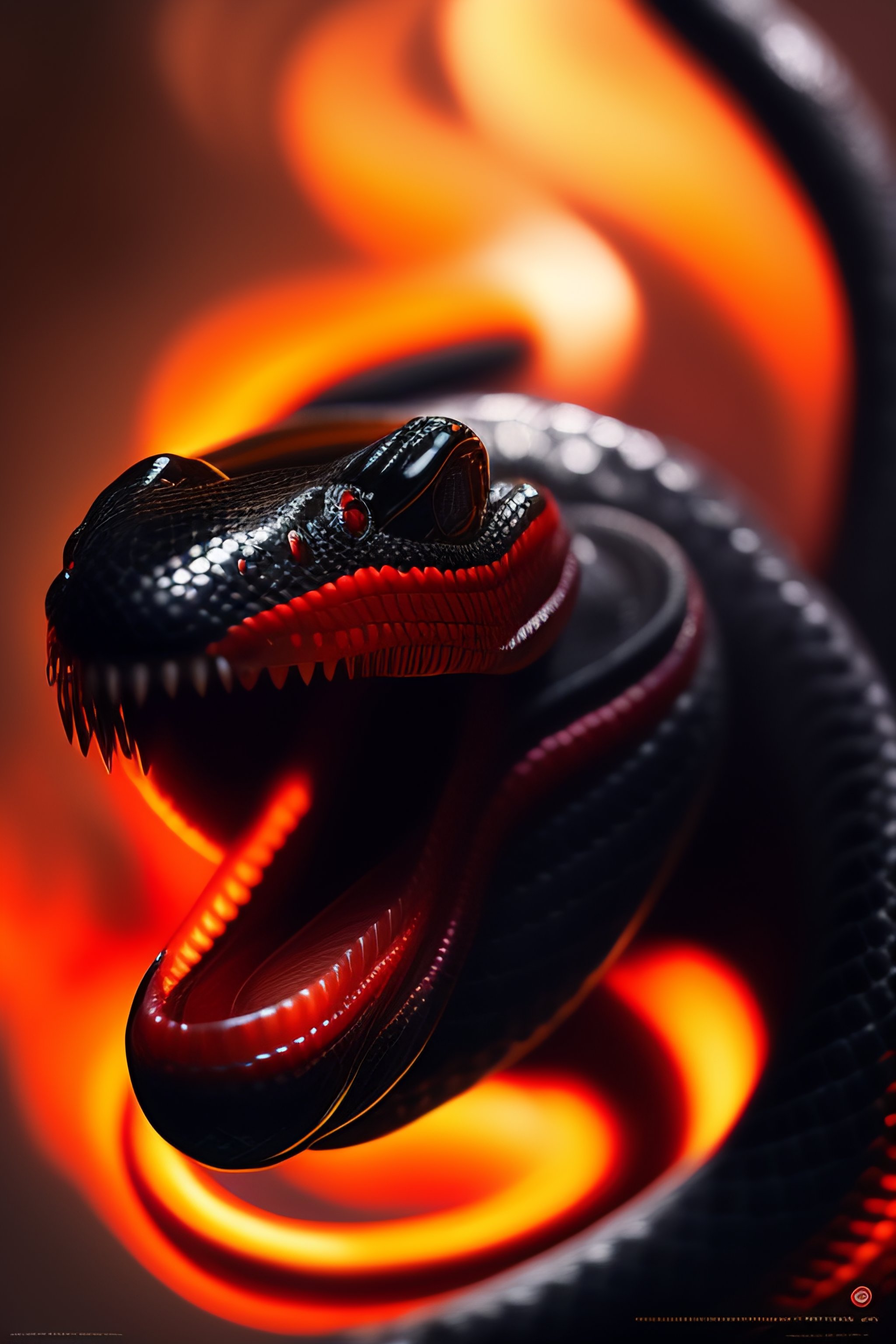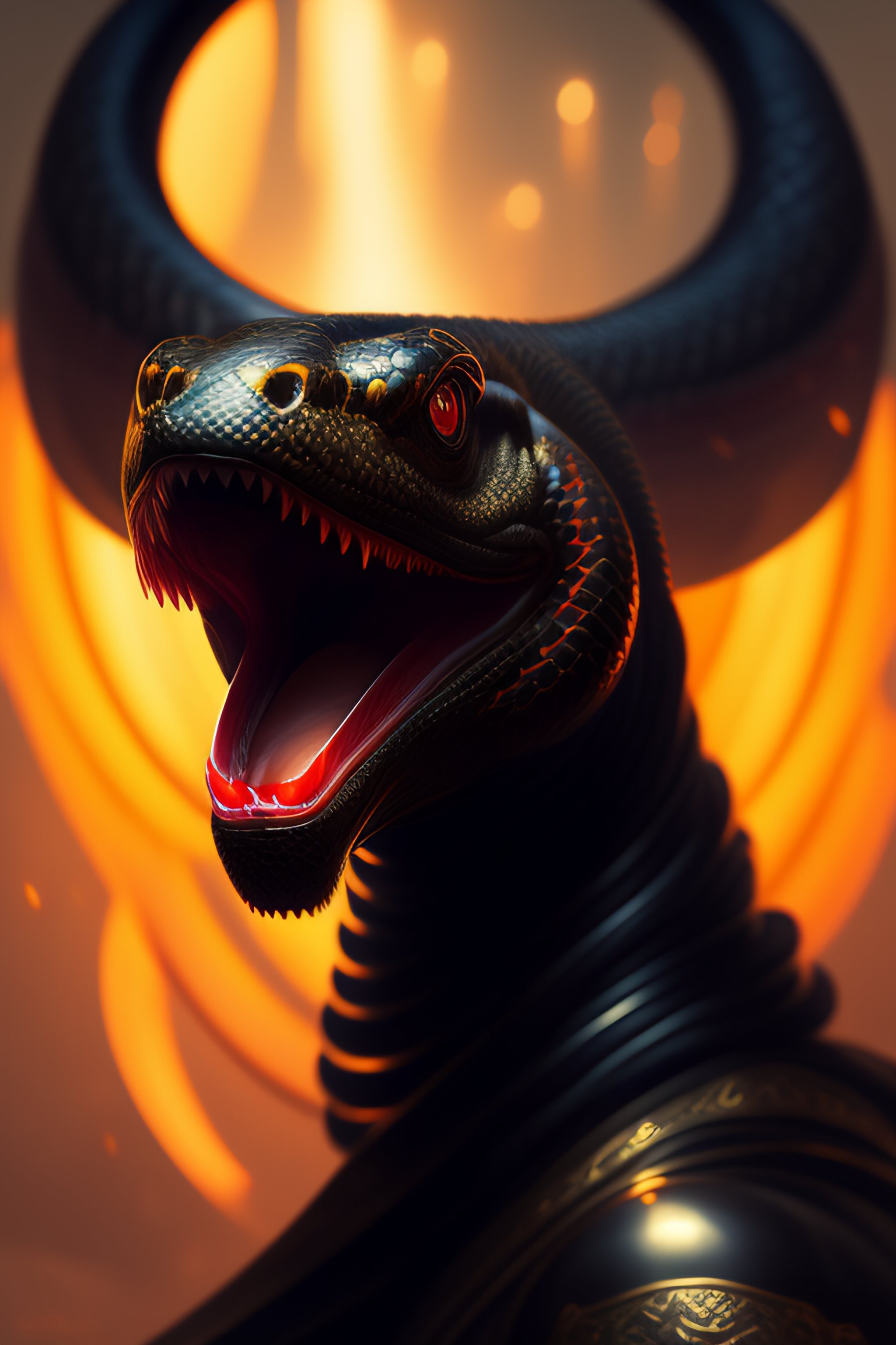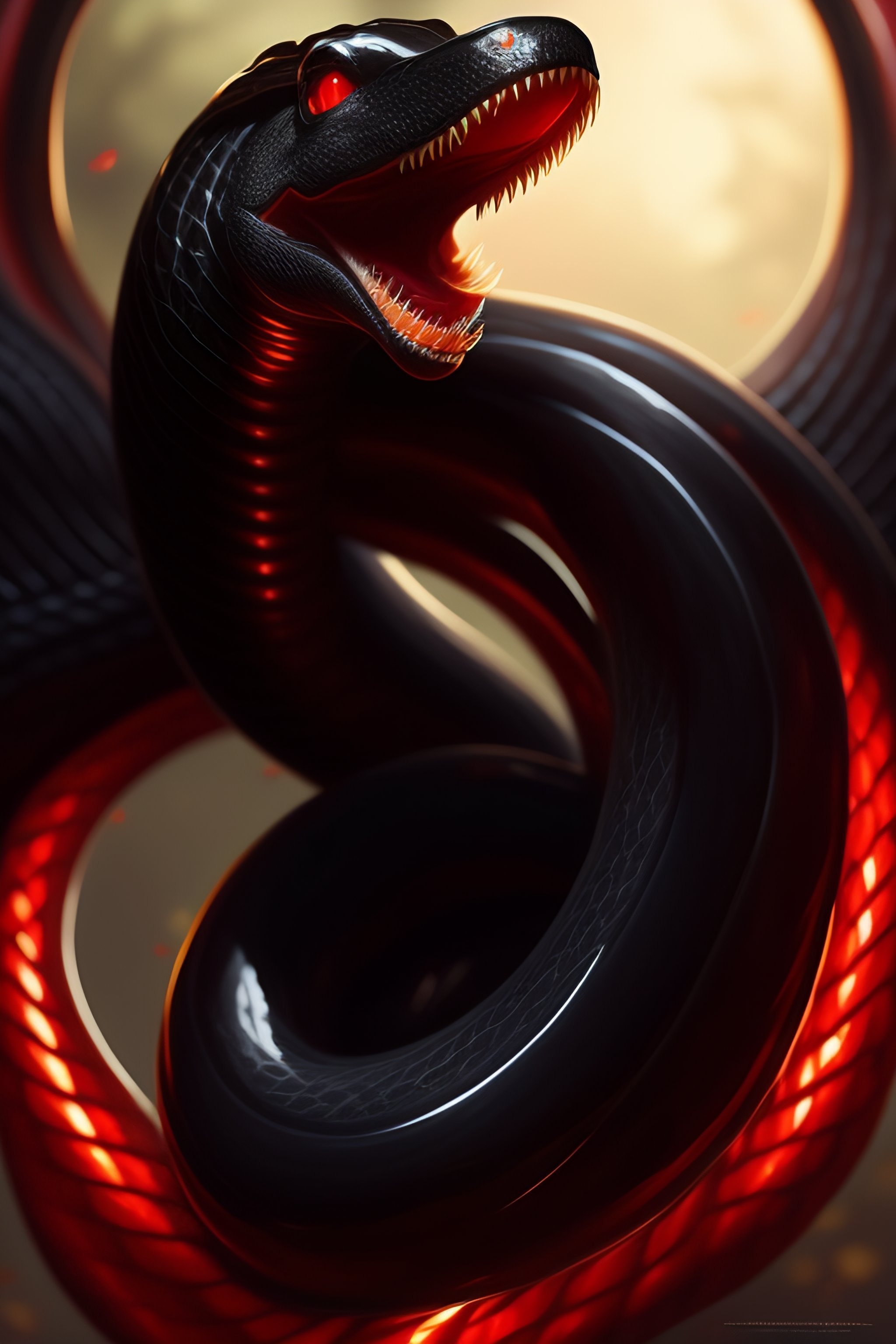 Black colored snake!, red snake eyes, toothy mouth with fangs, coiled body, threatening posture before attack, elegant pose, atmospheric lighting, cinematic composition, detail, art by greg rutkowski and alphonse mucha