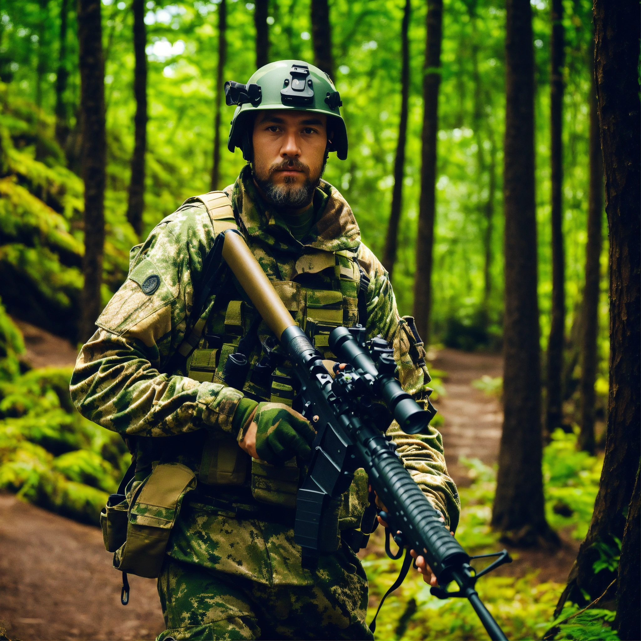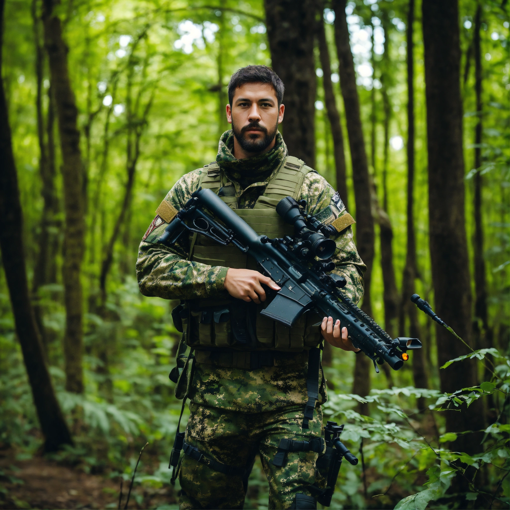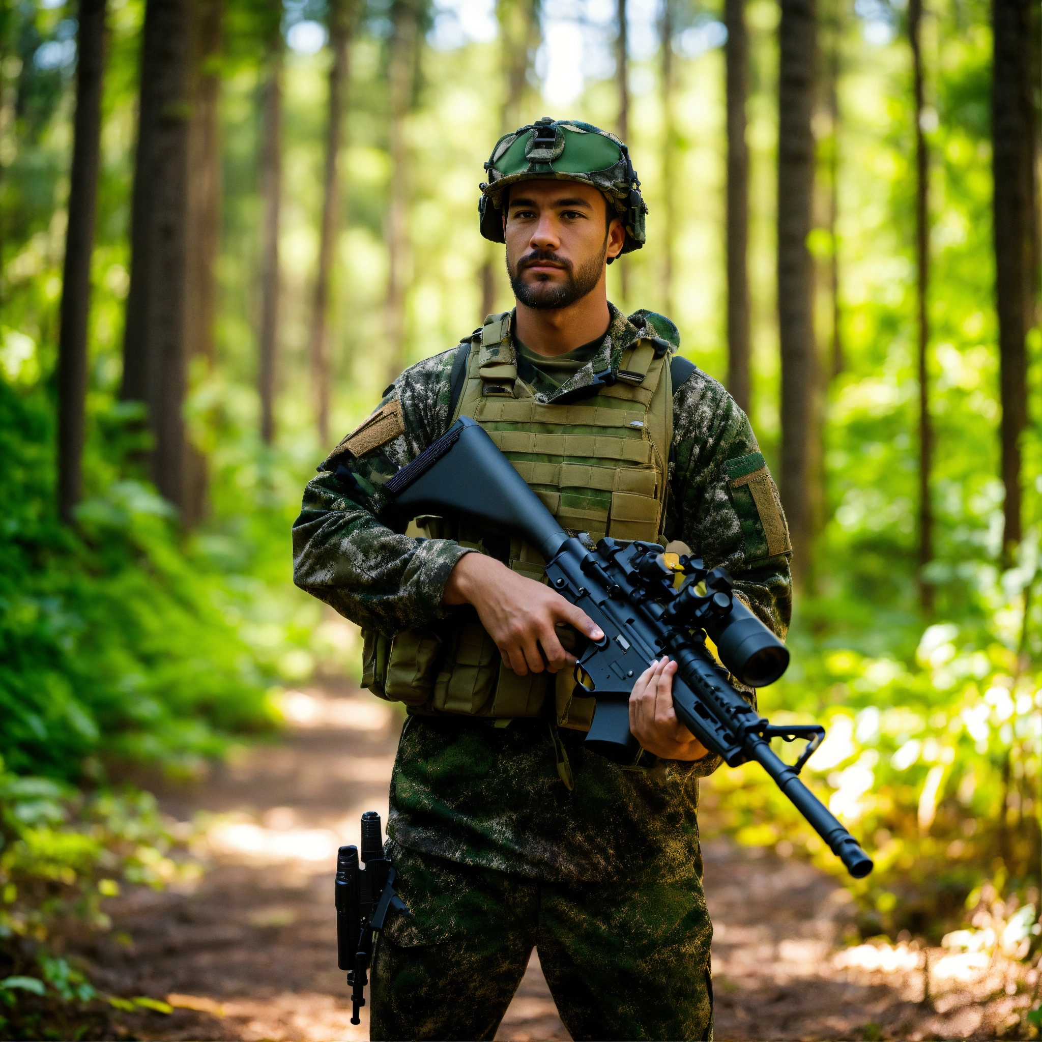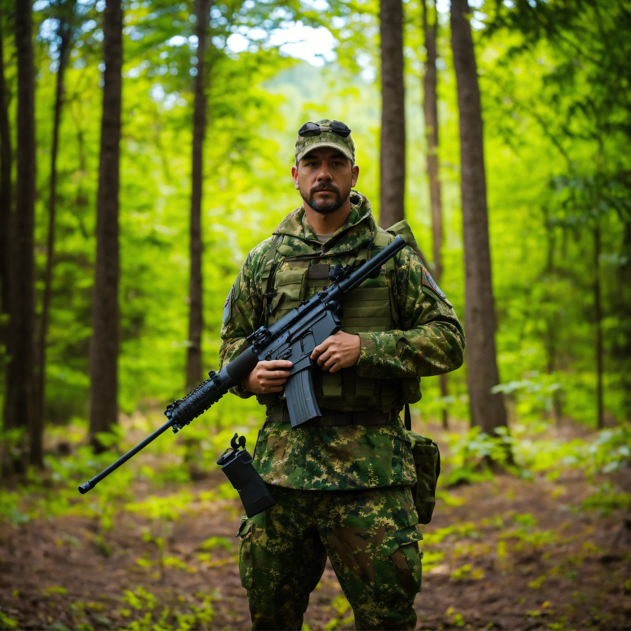 A photo of a man holding a rifle, the man is wearing camouflage clothing and is standing in a forest, the background is a beautiful green forest
