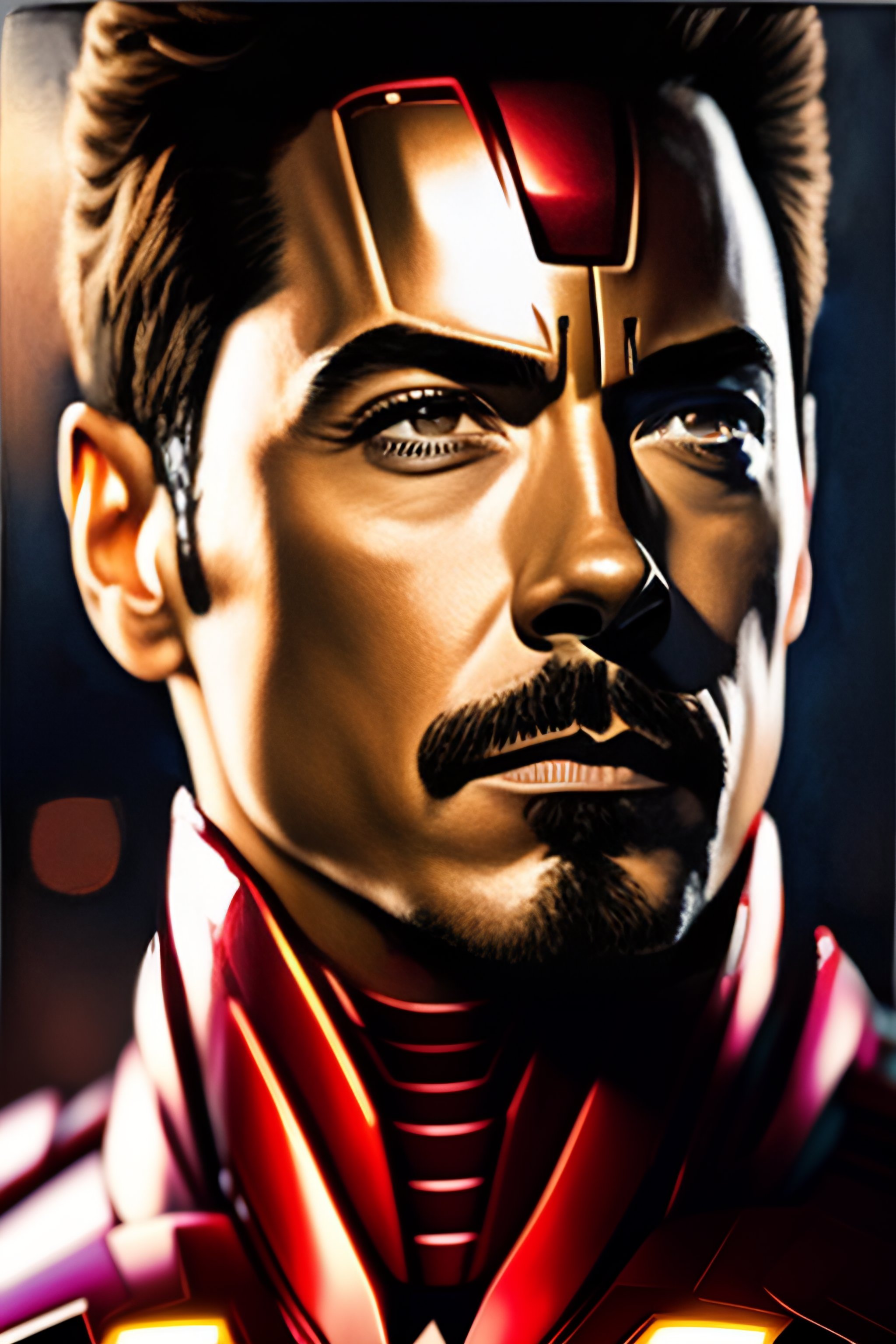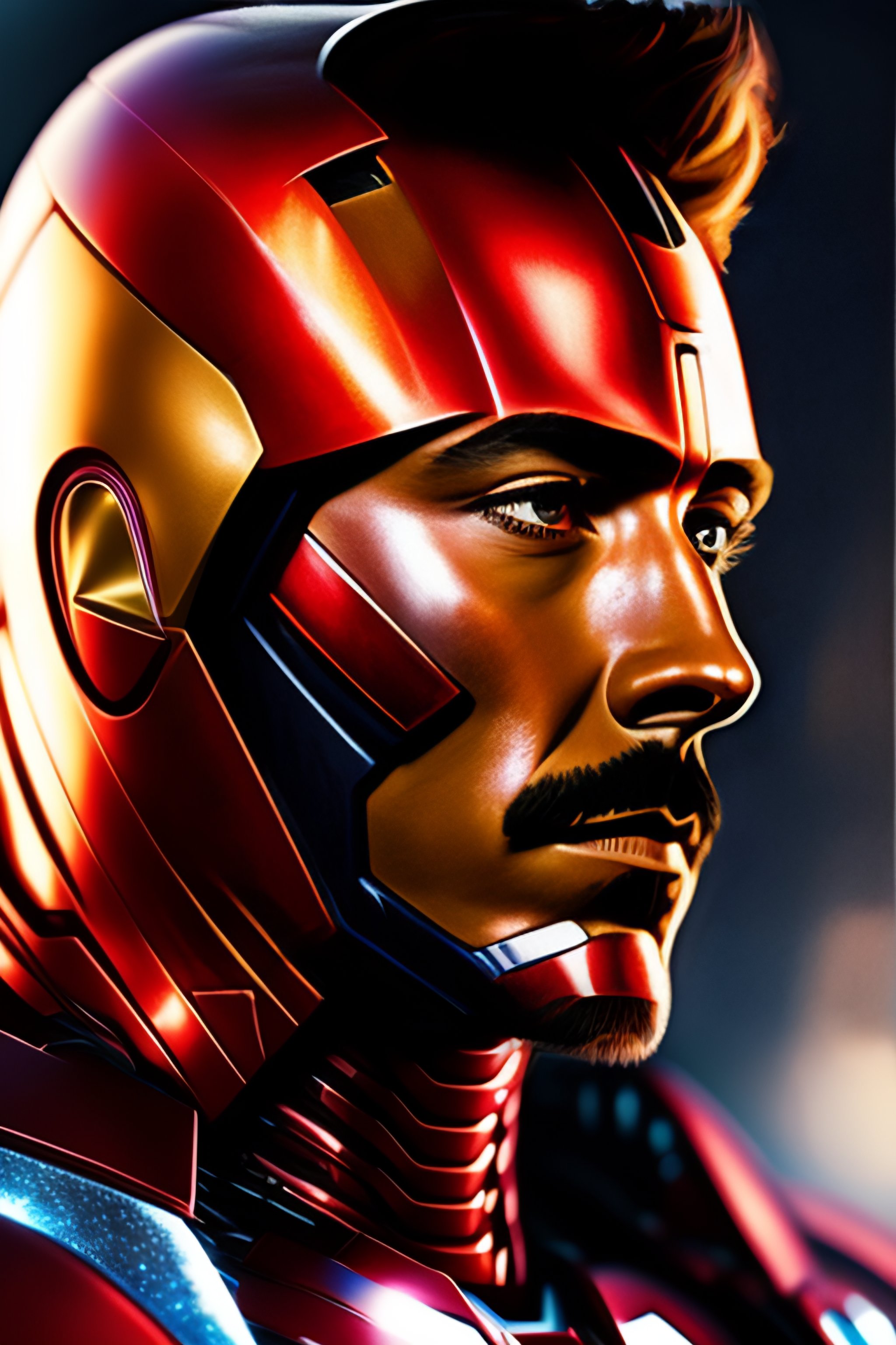A close-up portrait of ironman, right half of face is ironman, left half of face is tony stark, background is rock and roll, cinematic lighting, --ar 2:3