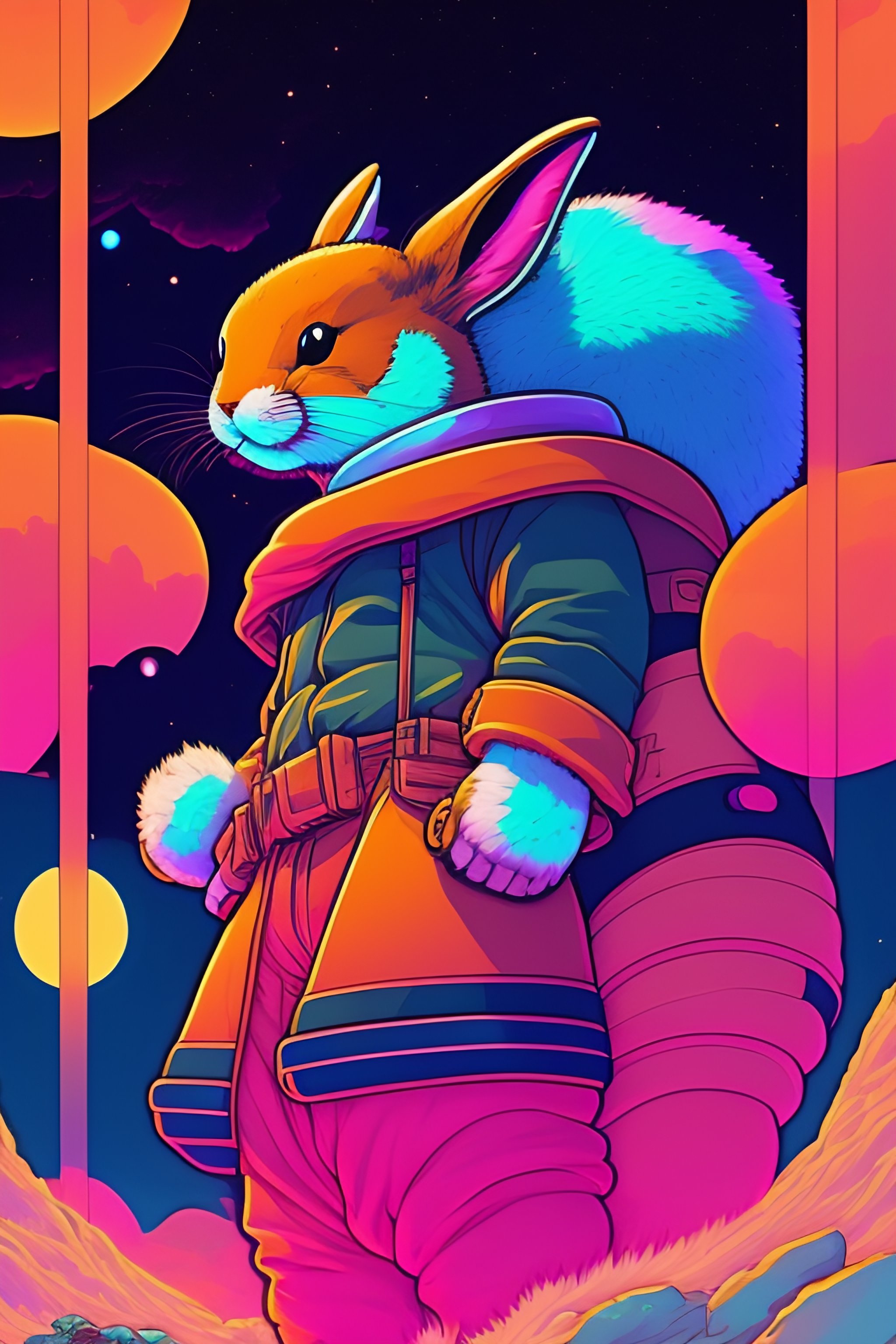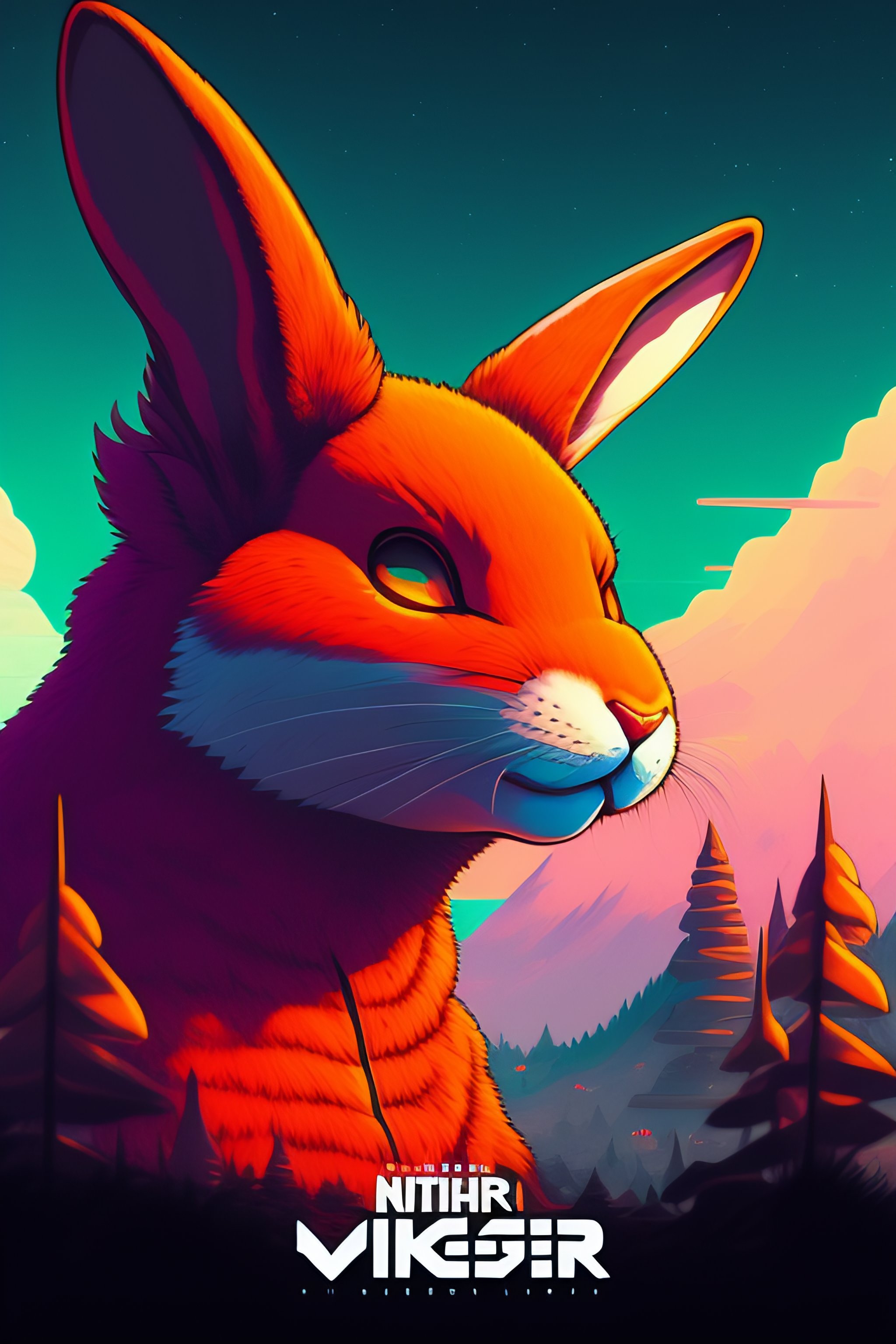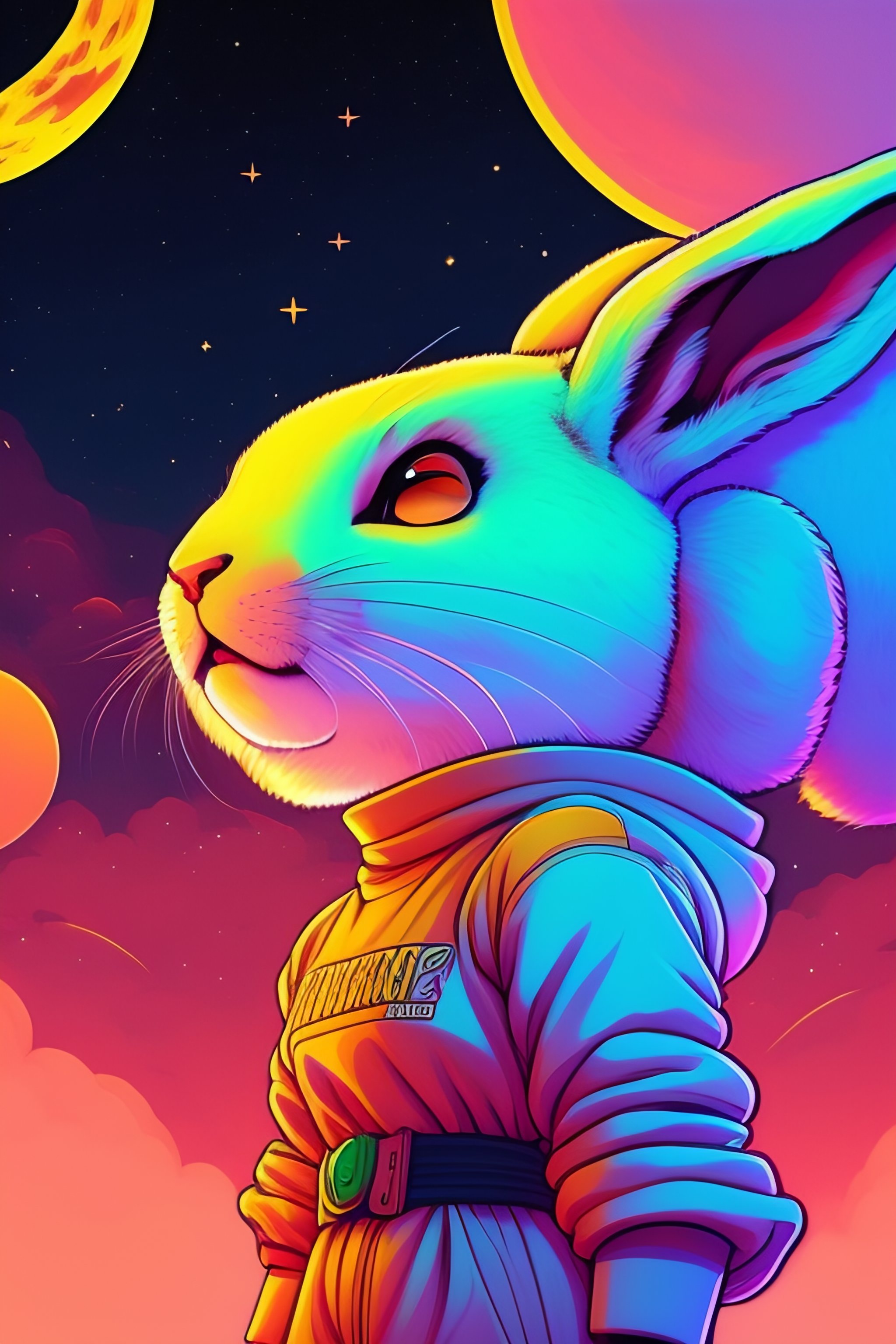 Photo of a huge savage bunny monster in the space, style of laurie greasley, studio ghibli, akira toriyama, james gilleard, genshin impact, trending pixiv fanbox, acrylic palette knife, 4k, vibrant colors, devinart, trending on artstation, low details