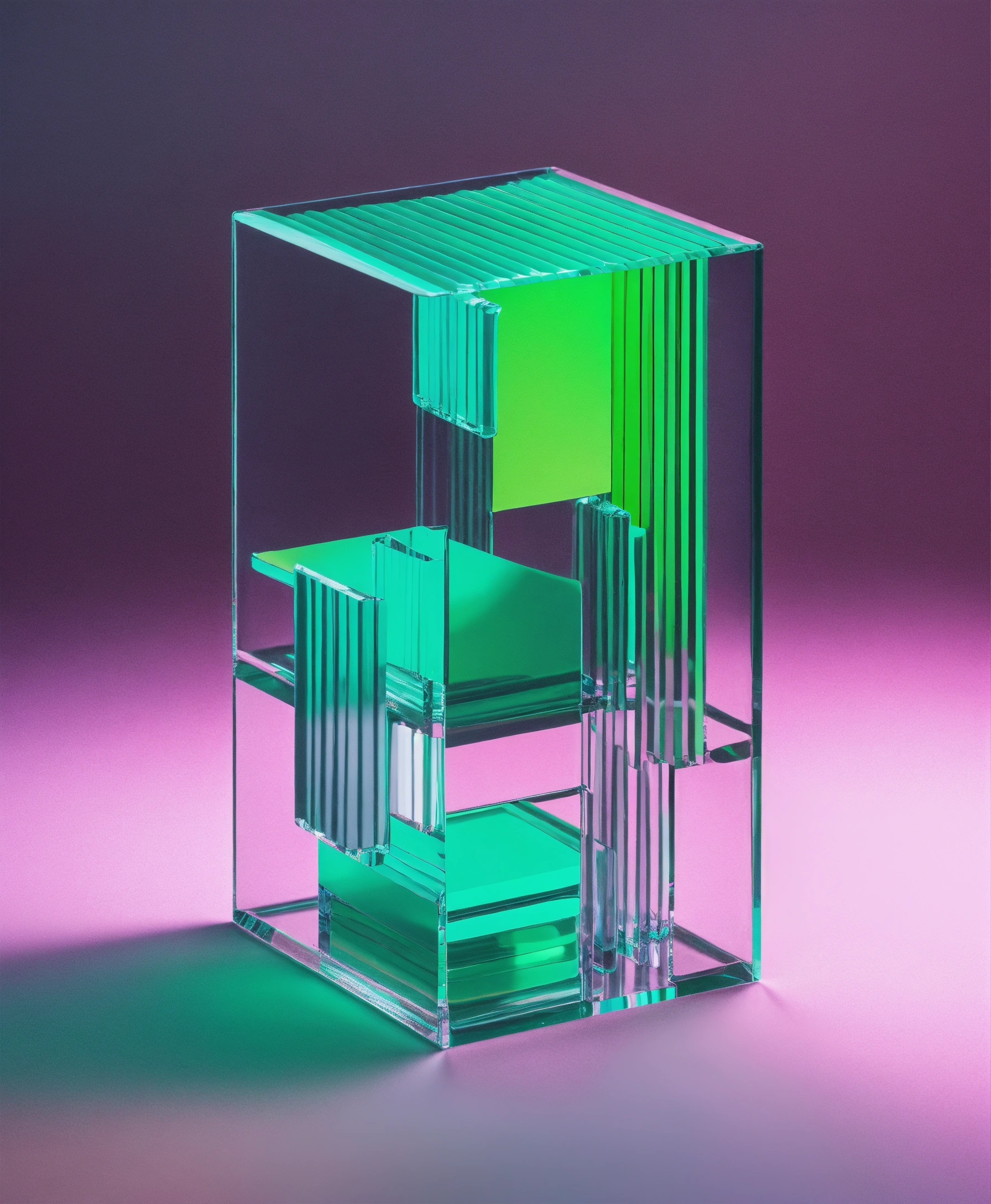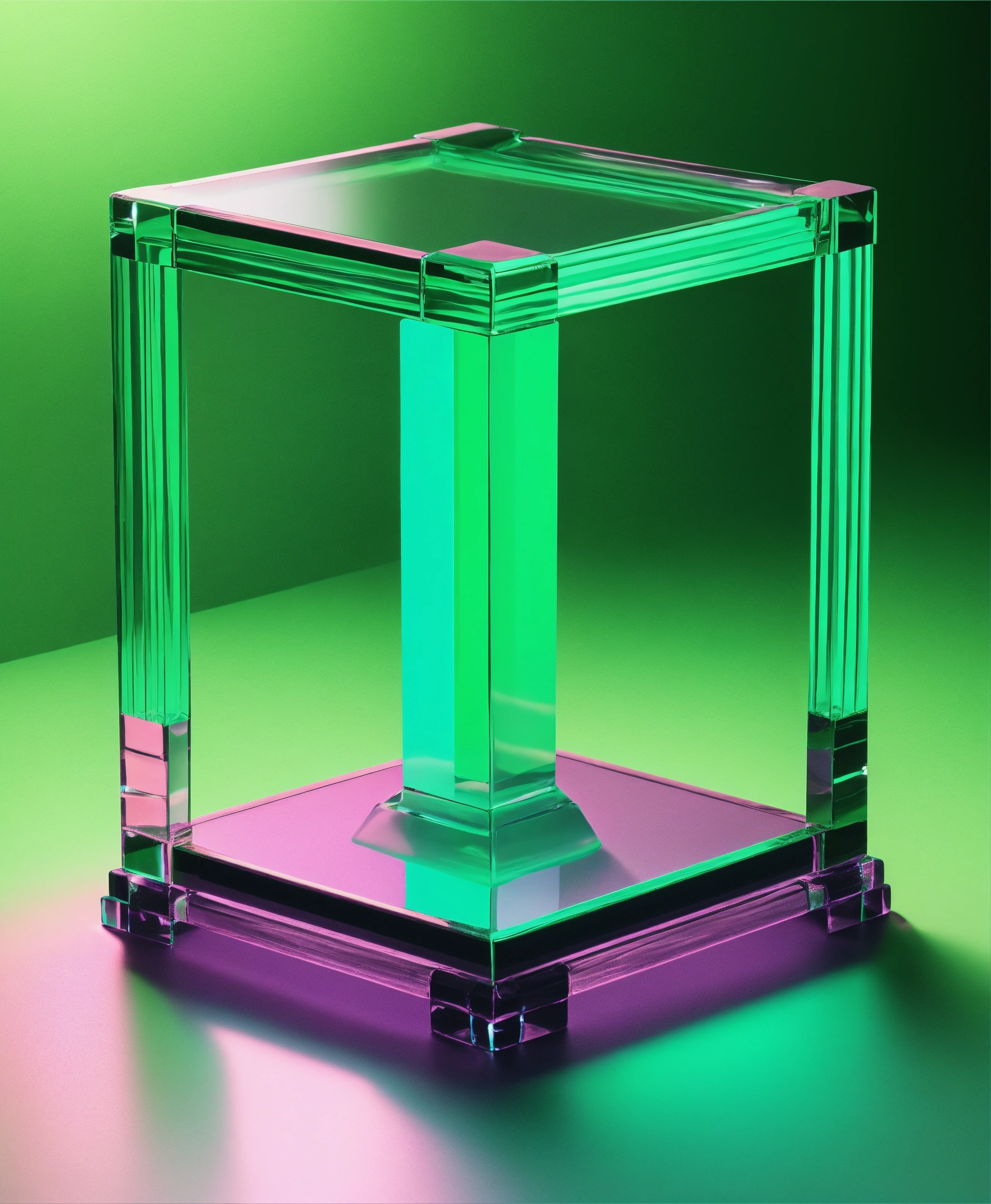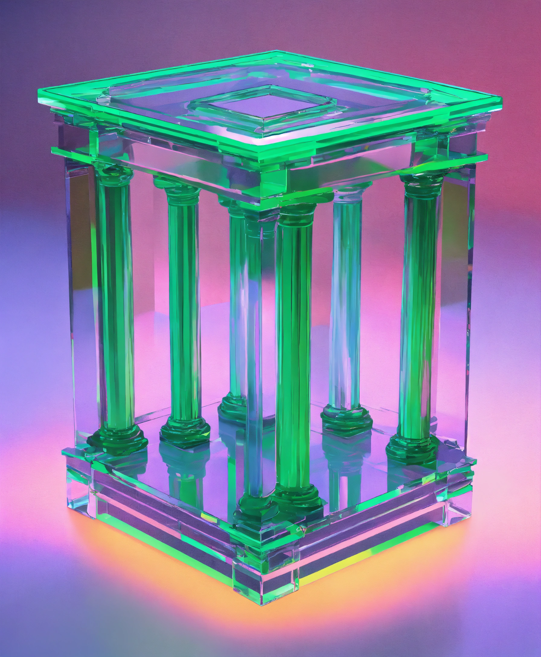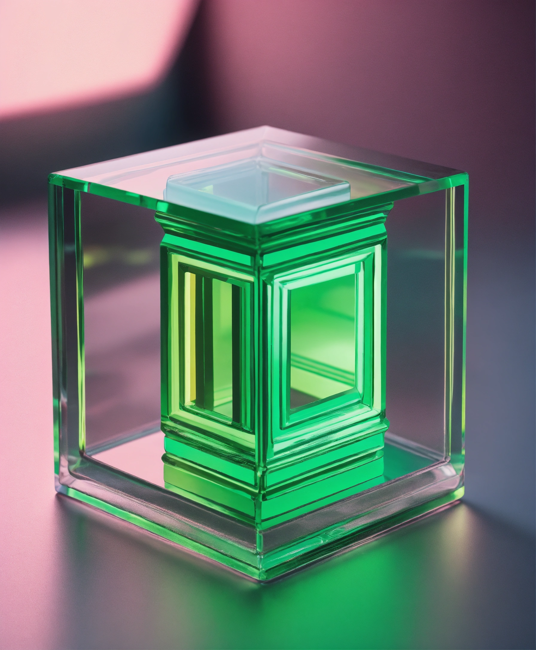 Isometric clear glass cube, stacked sophisticated green roman columns, studio photography, some neon green accent color, 4k, iridescent! muted color background! realistic!