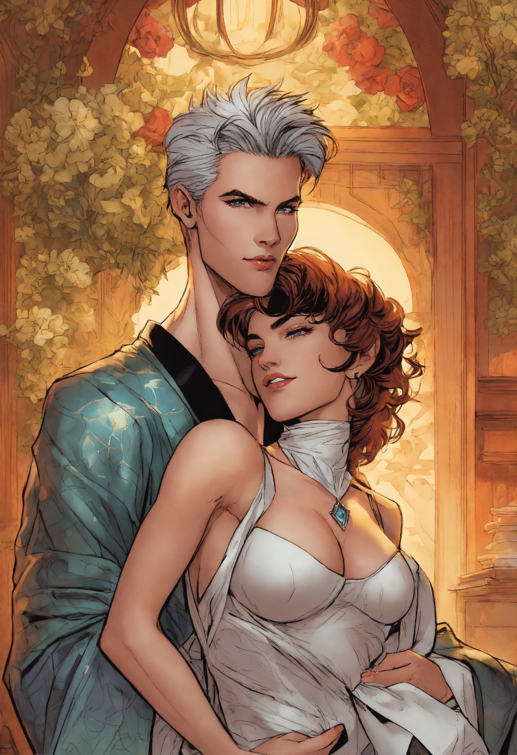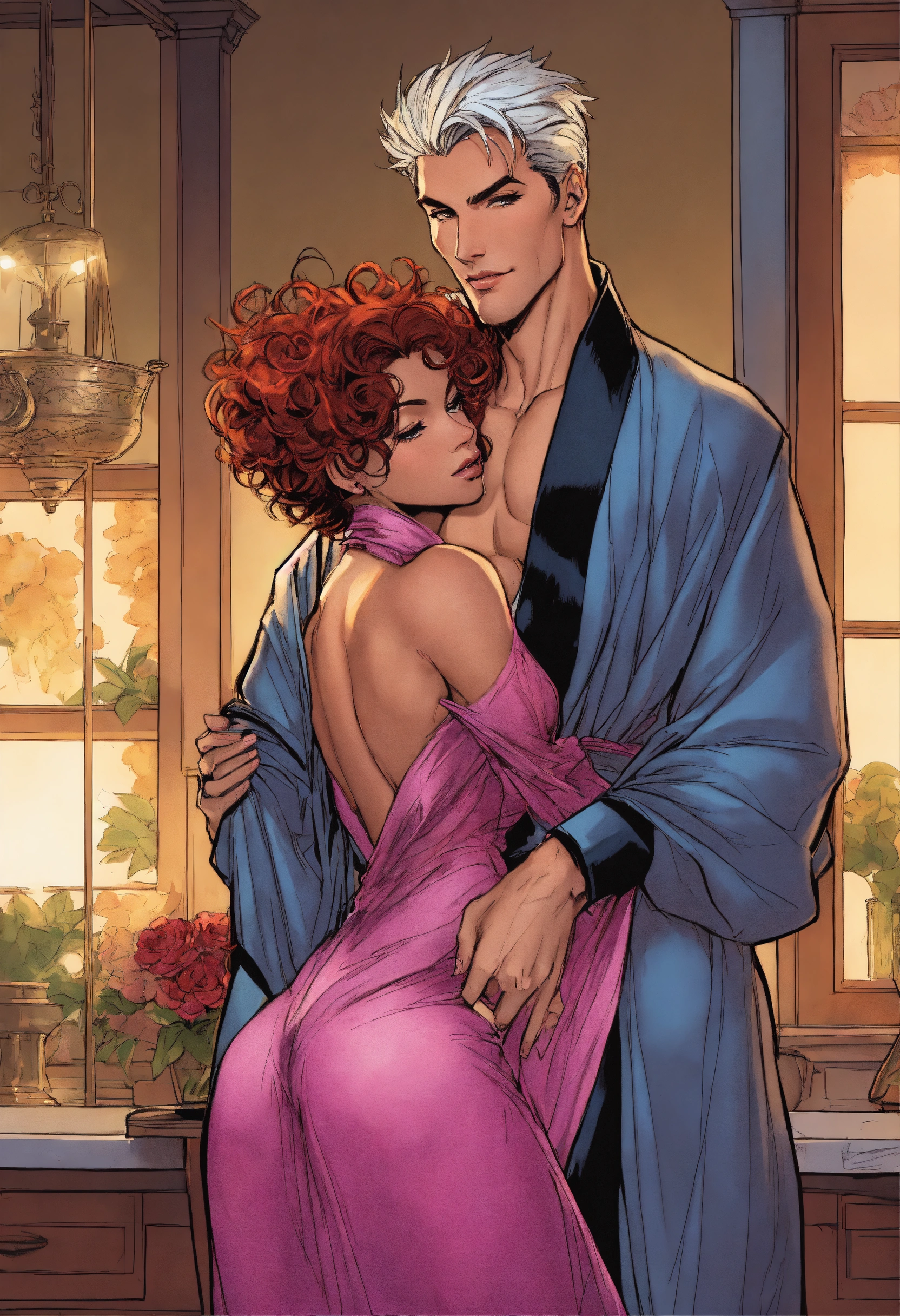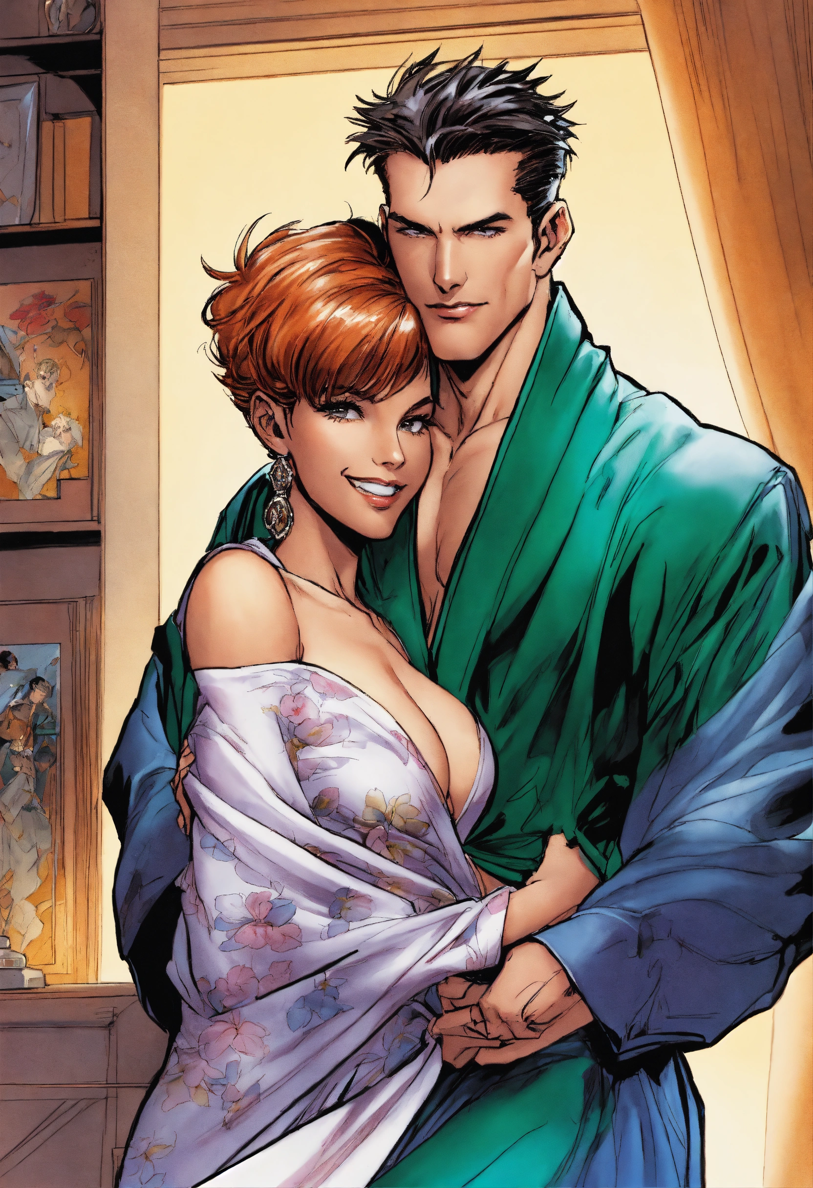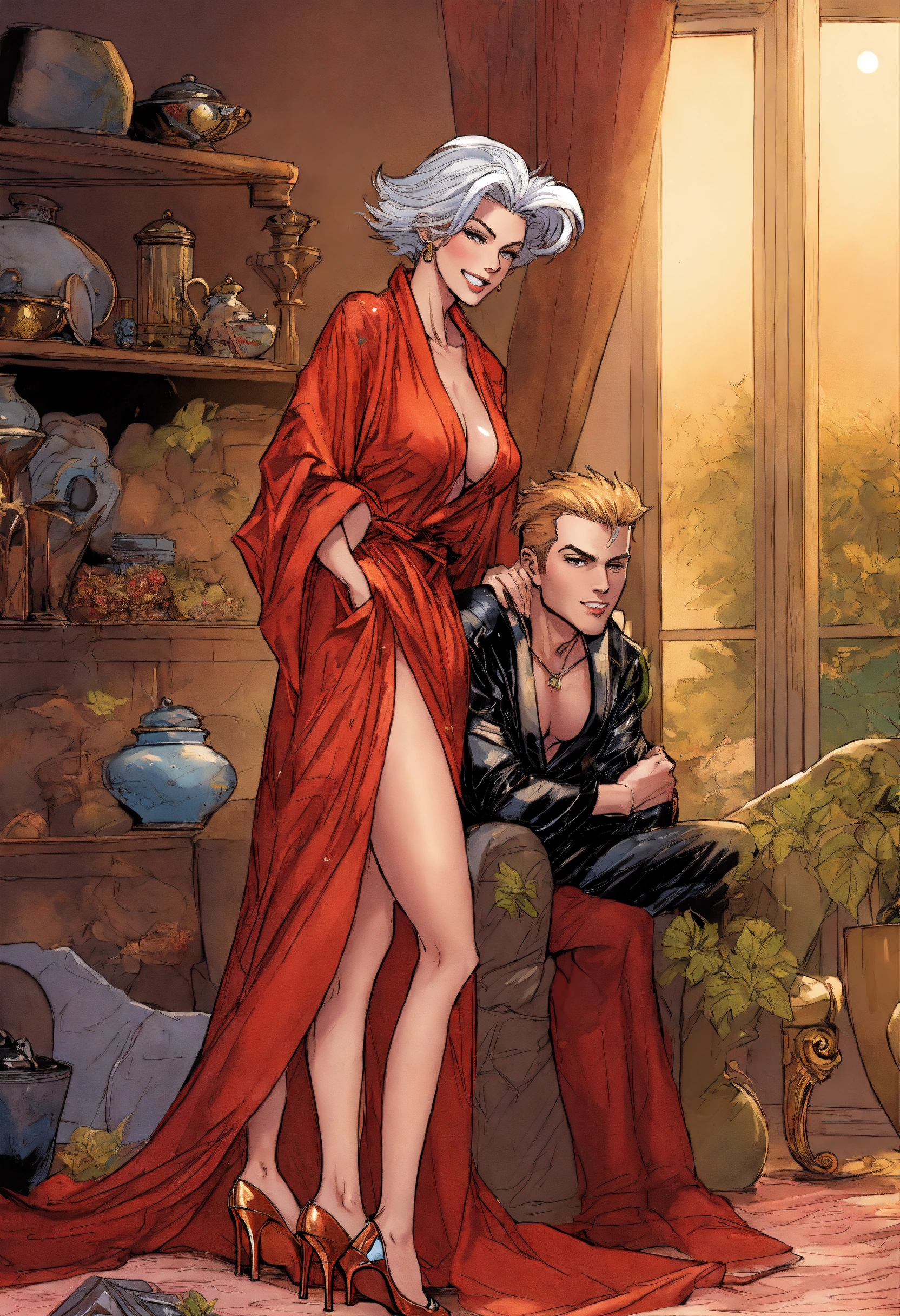 Older angela from spawn, as an elegant housewife, wearing a sheer silk robe and high heels, hugged from behind by her handsome son, art by j. scott campbell, art by todd mcfarlane, pixie cut, modern setting